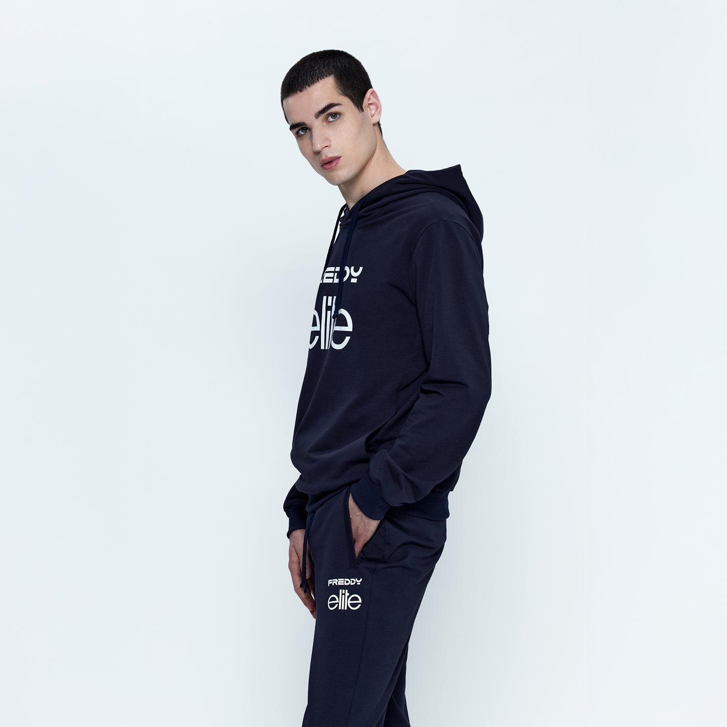 L’anima urbana di ELITE prende forma in tre capi dal carattere deciso. Felpa con cappuccio, t-shirt raglan e joggers in cotone stretch si vestono di blu profondo e si accendono con il logo ELITE in off white, forte e riconoscibile. Design funzionale, fit contemporaneo e dettagli iconici per un look casual che parla la lingua dello streetwear internazionale. Firmato FREDDY x ELITE.