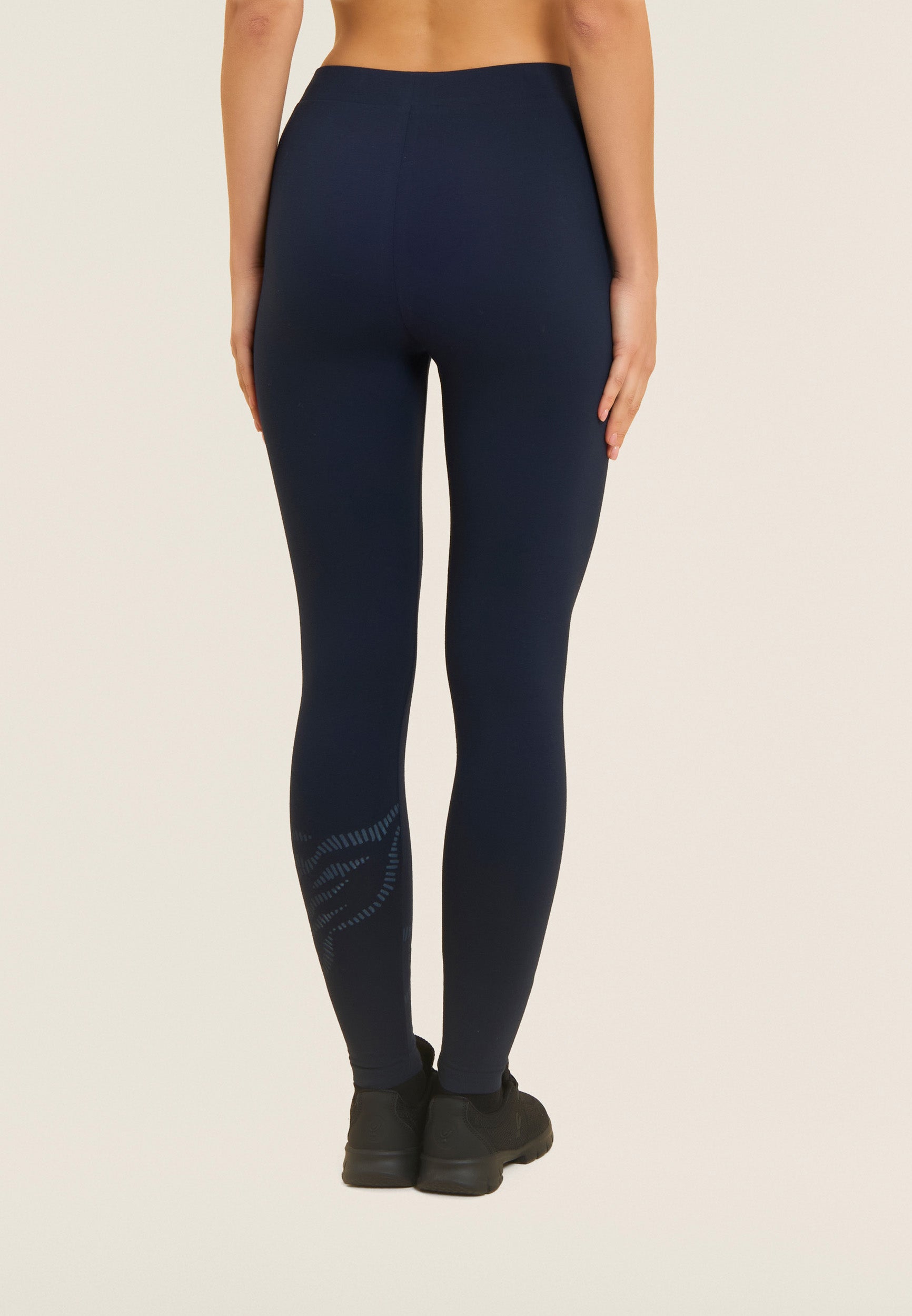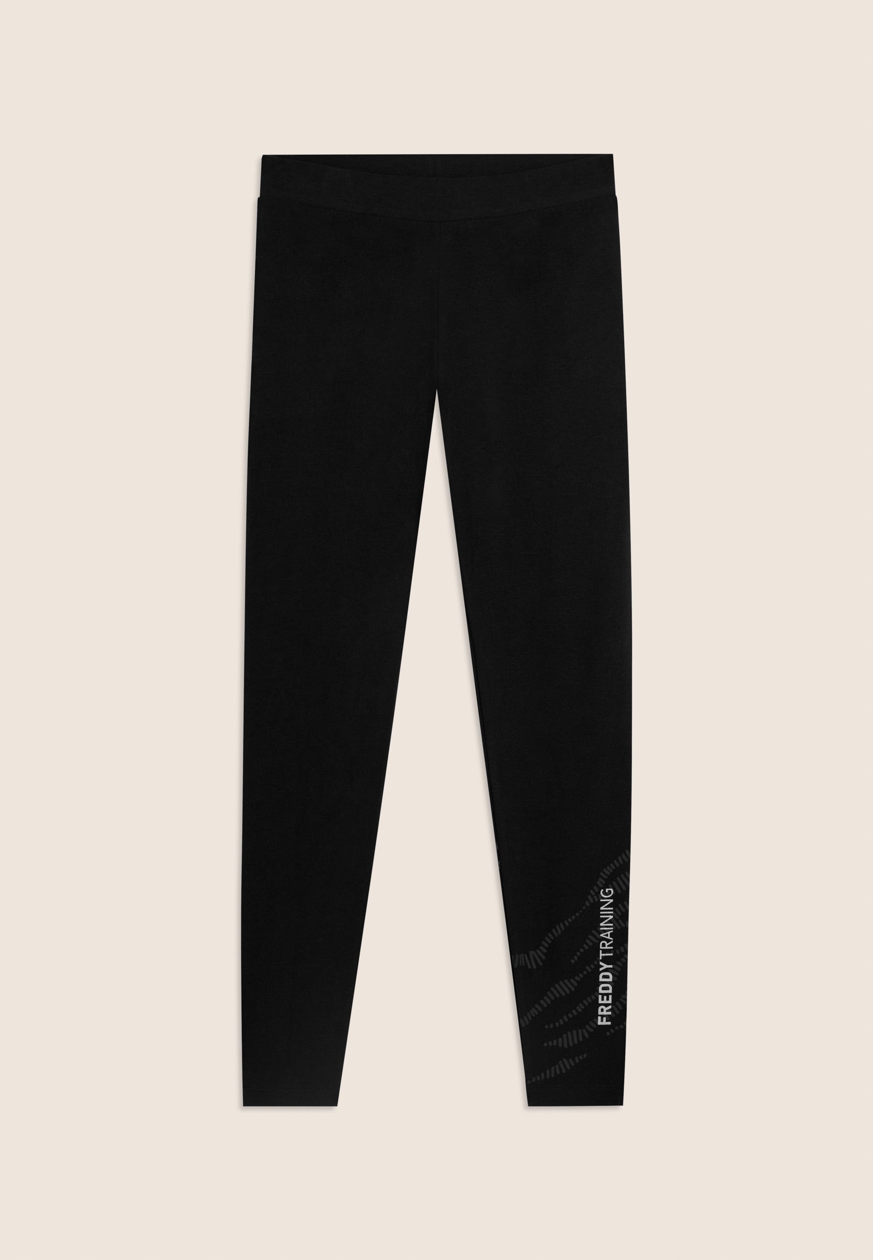 7/8-Leggings mit normalem Taillenbund und enger Passform, ideal für leichte Aktivitäten und Freizeit. Das FREDDY-Logo ist in weißem Glitzer auf das linke Beinende gedruckt, eingebettet in ein wellenförmiges Grafikmuster. Sie sind aus schwerem, dehnbarem Baumwolljersey gefertigt und machen deine Bewegungen perfekt mit.