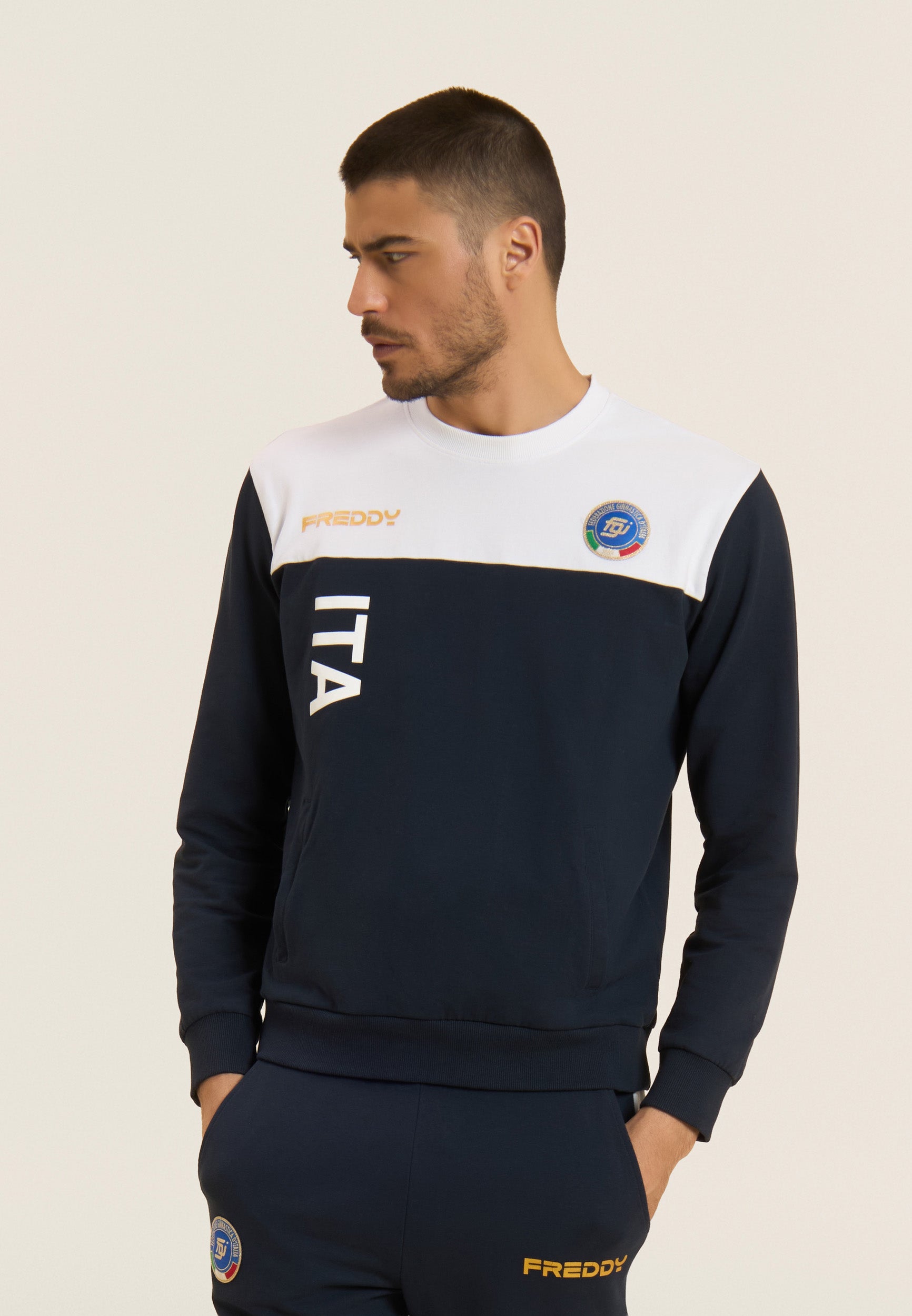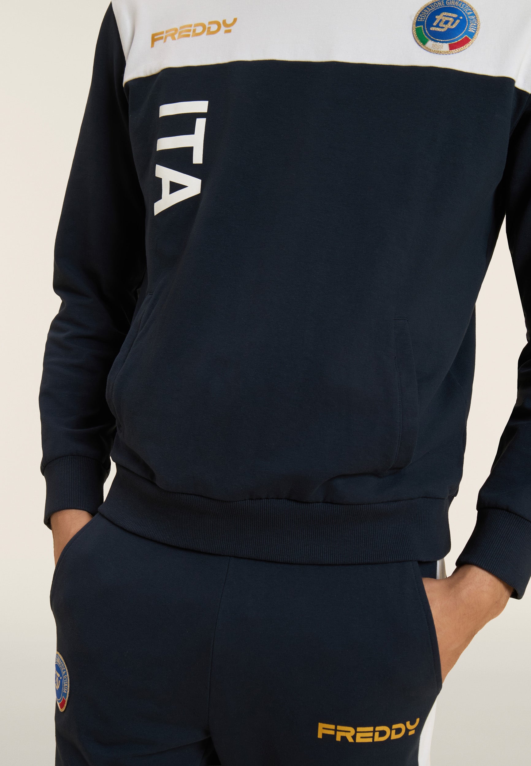 Eleganza sportiva e spirito di squadra si incontrano in questa tuta replica ufficiale della Federazione Ginnastica d’Italia firmata Freddy.