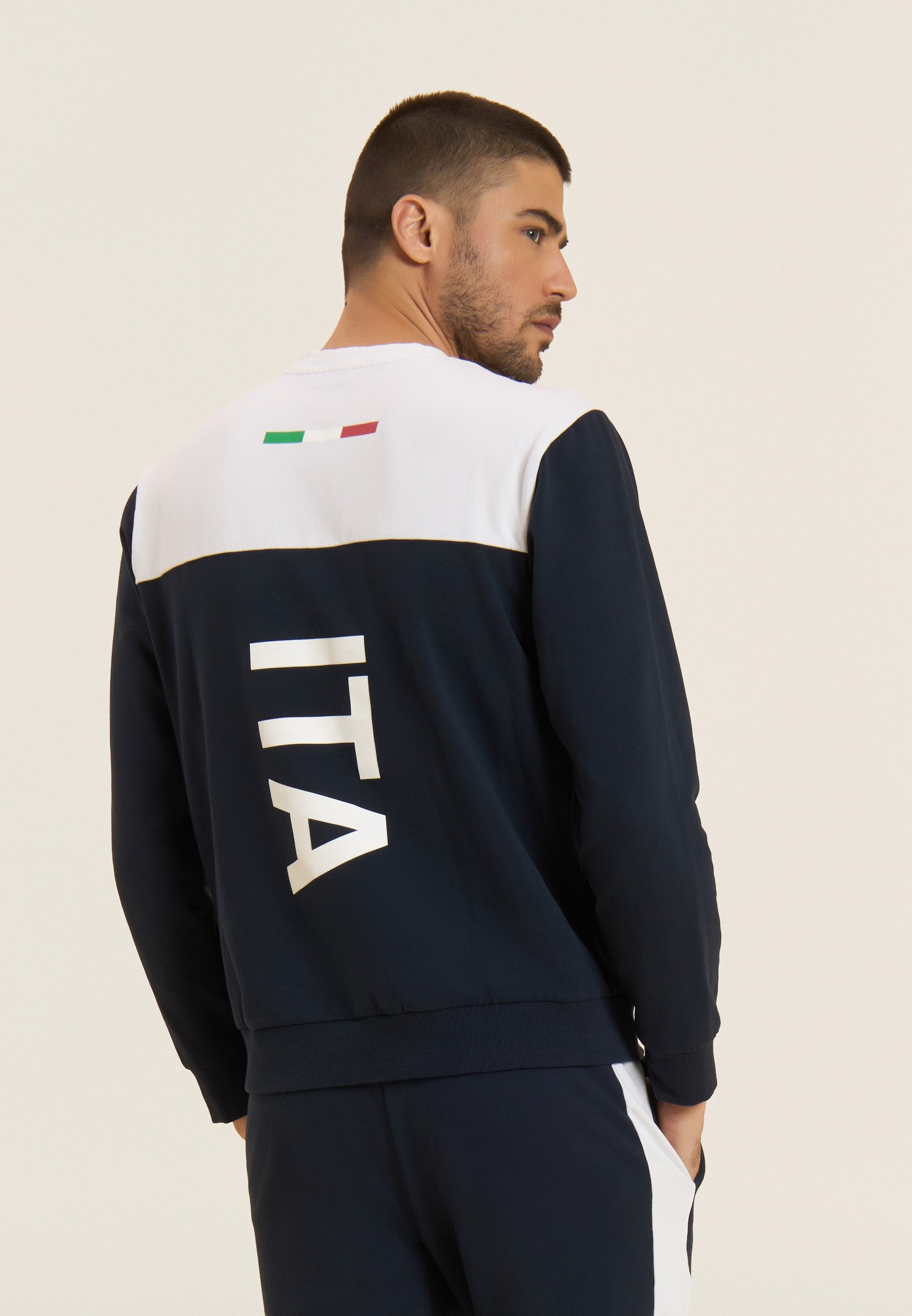 Il modello si distingue per il design colour block blu con inserti bianchi su spalle e lati delle gambe, realizzato in calda e confortevole felpa brushed elasticizzata, ideale per garantire isolamento termico e morbidezza. La felpa con scollo a girocollo e il pantalone coordinato con fondo a polsino offrono una vestibilità regular impeccabile, studiata per assicurare la massima libertà di movimento in ogni occasione.