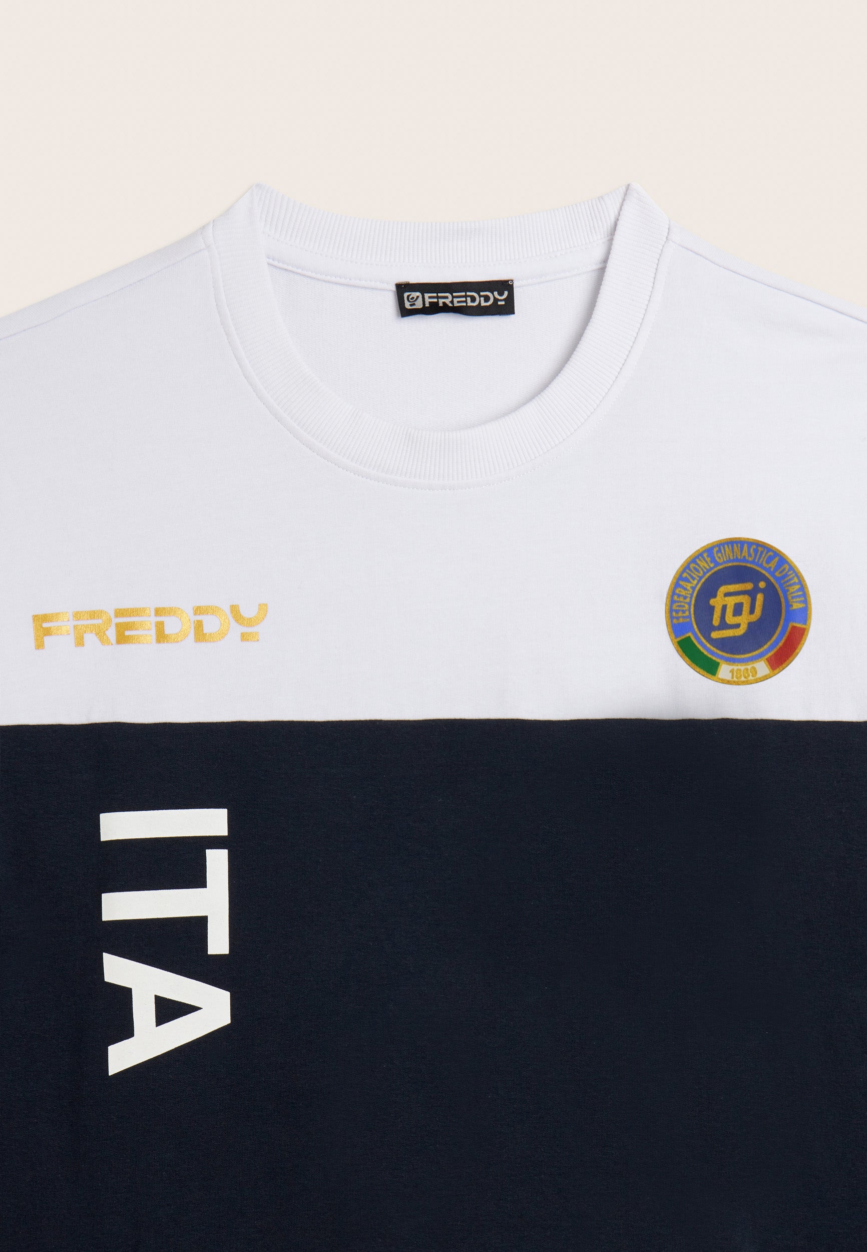 Le grafiche tricolore tra le scapole e sul fondo gamba, unite alla maxi stampa ITA e ai loghi ufficiali, celebrano l’eccellenza della ginnastica italiana con dettagli tecnici di alta qualità e uno stile inconfondibile.