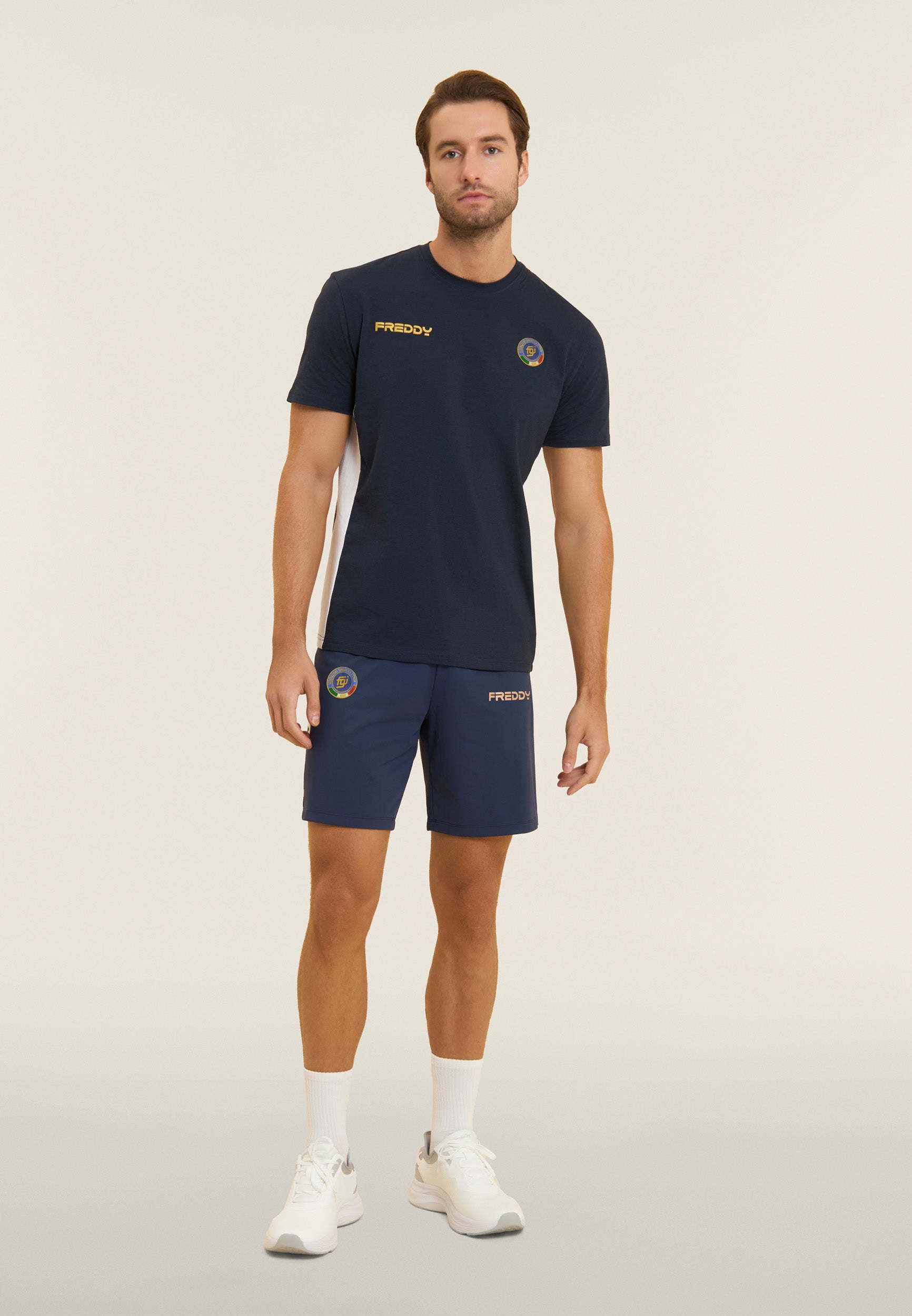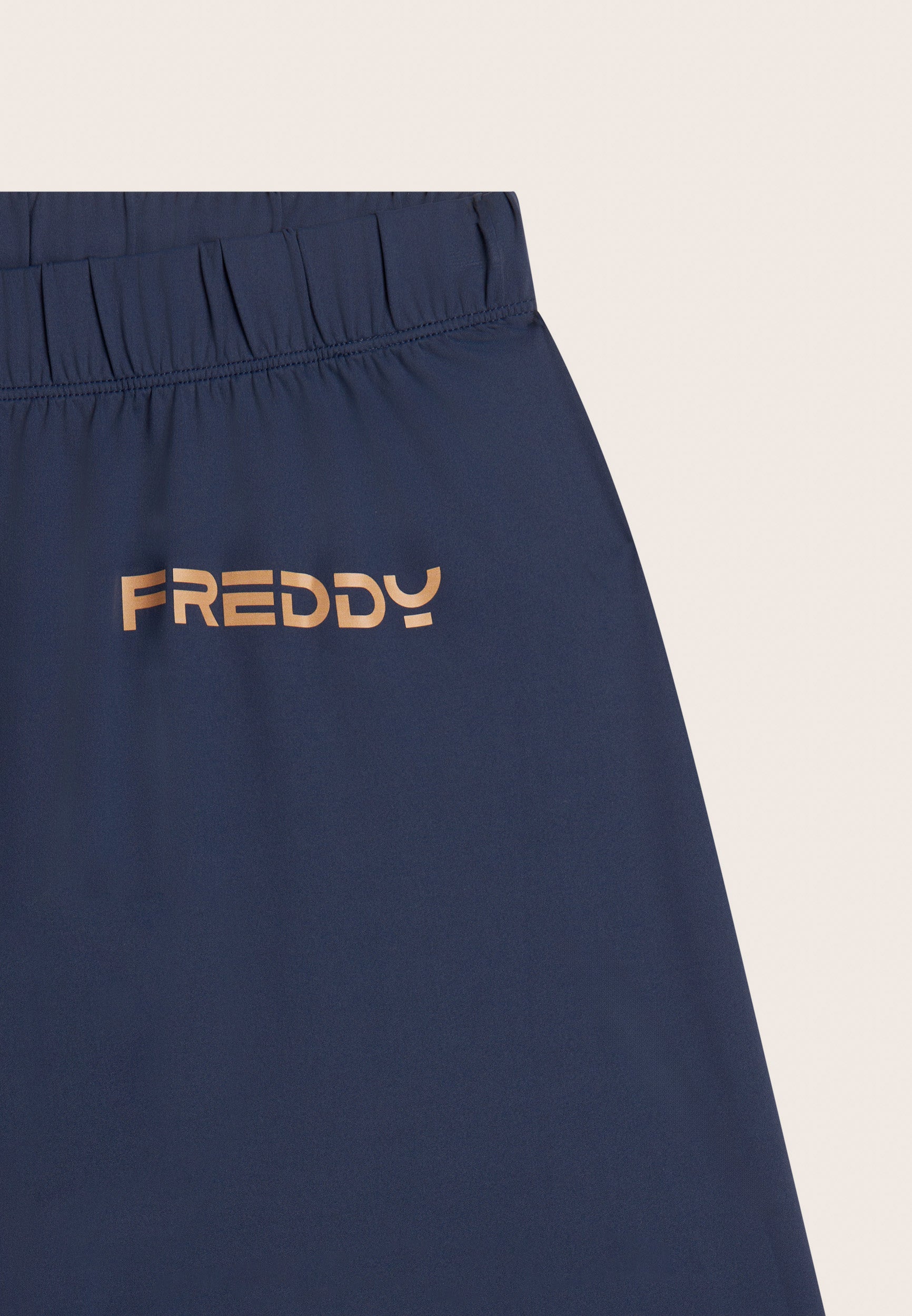 La forte identità nazionale è sottolineata dalla maxi stampa ITA sulla coscia destra, dai loghi Freddy e FGI sui fianchi e dalla grafica tricolore sul fondo gamba, offrendo un look professionale e dinamico.