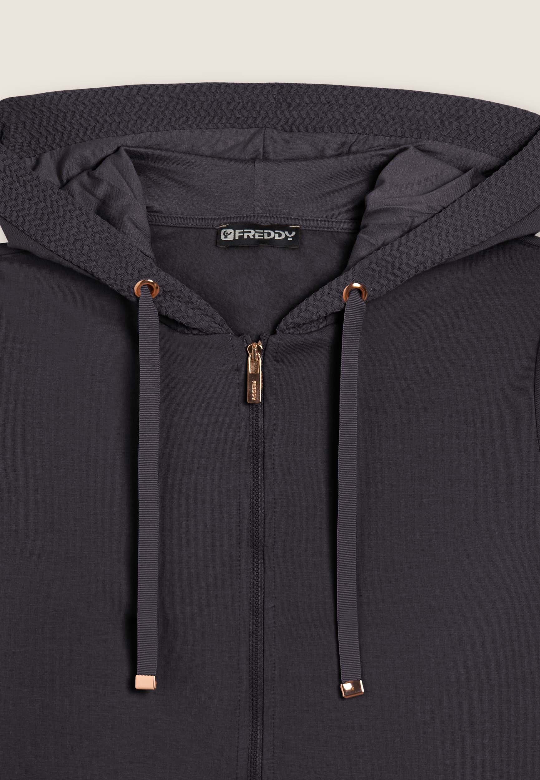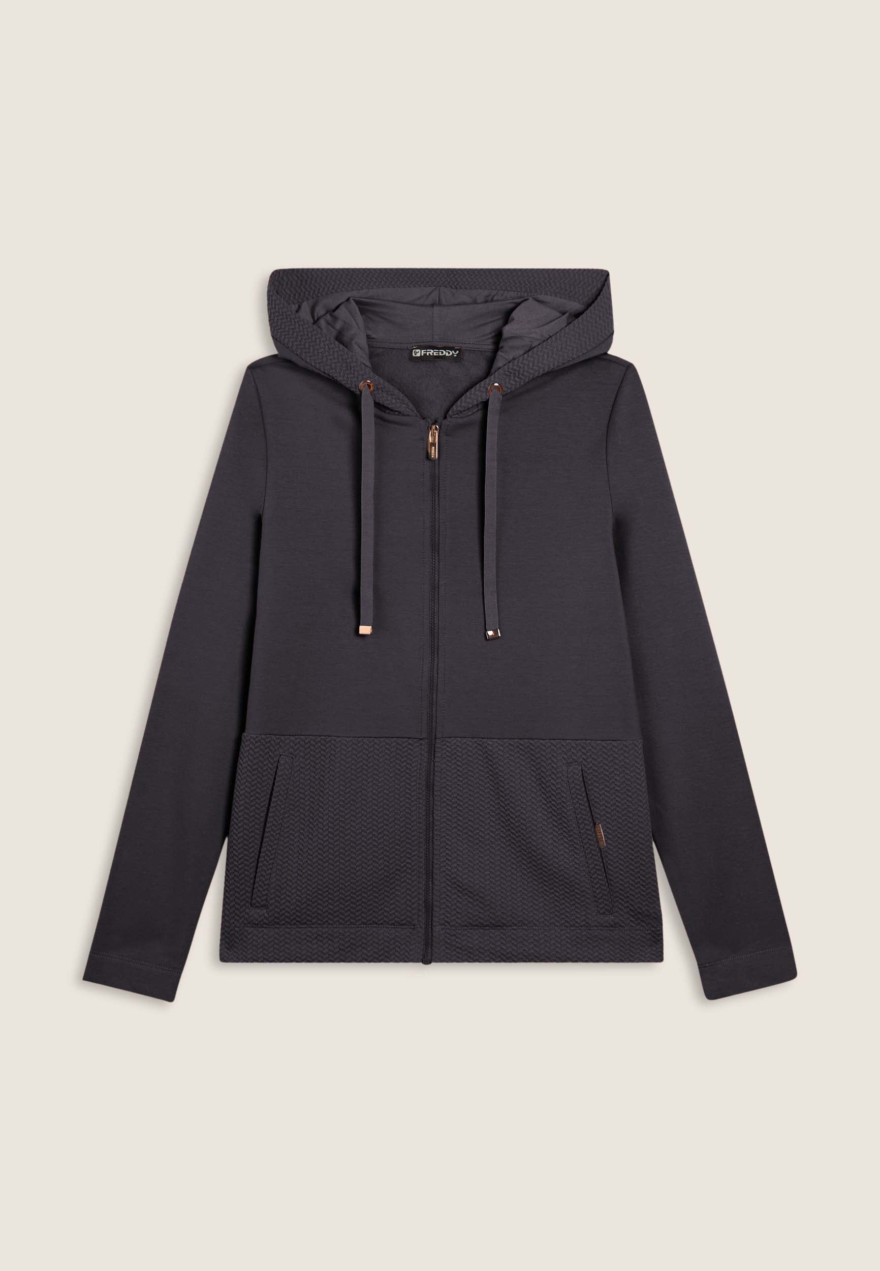 Damen-Hoodie mit normaler Passform aus angerautem Stretch-Modal-Sweatshirtstoff für absolute Wärme und Weichheit. Das Design besticht durch raffinierte Details aus doppellagigem Techno-Sweatshirtstoff mit Mikro-Zopfmuster unterhalb der Brust und am Rand der Kapuze, die mit einem Kordelzug verstellbar ist. Mit paspelierten Leistentaschen und Logo-Plakette von FREDDY am Rand der linken Tasche.