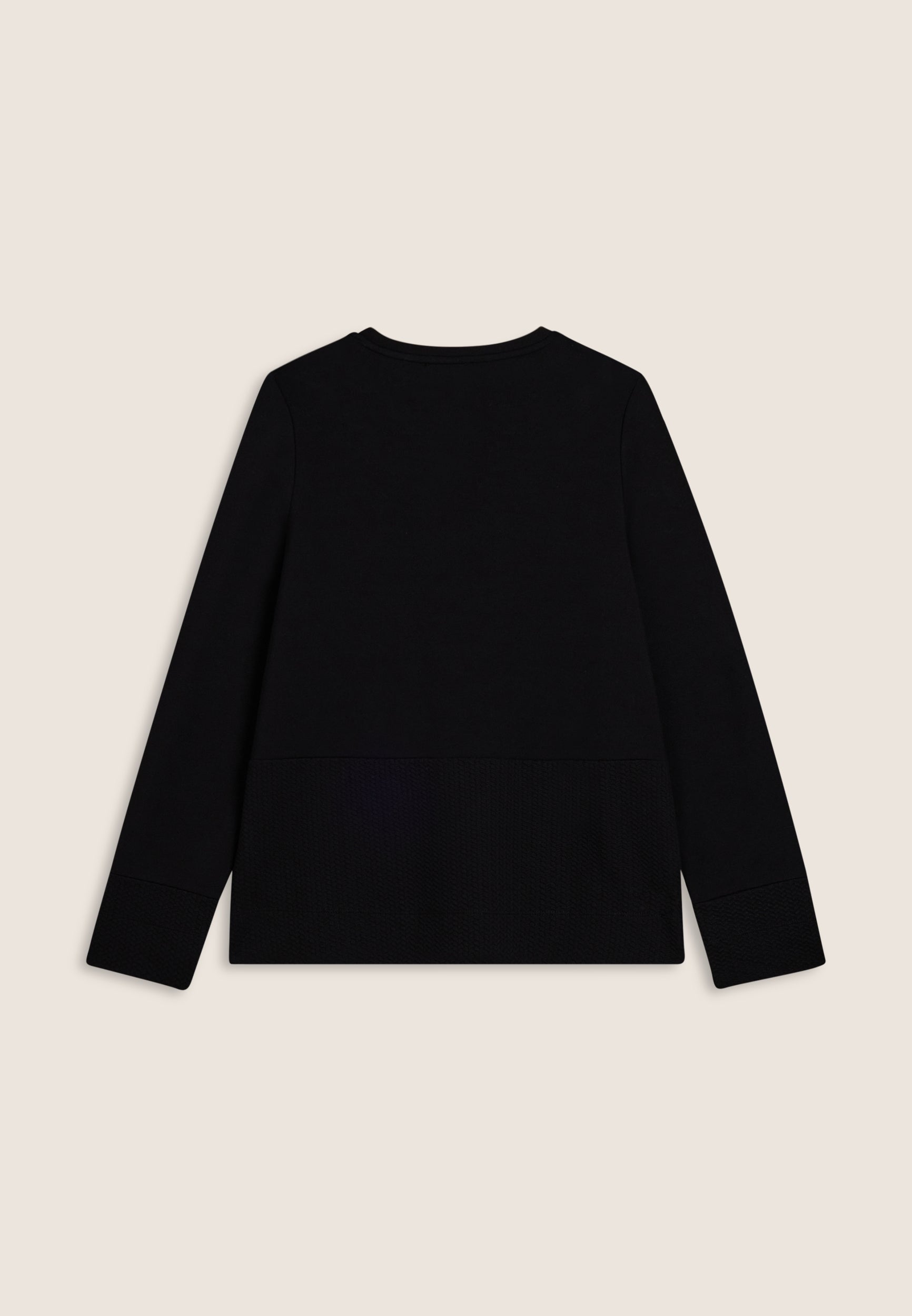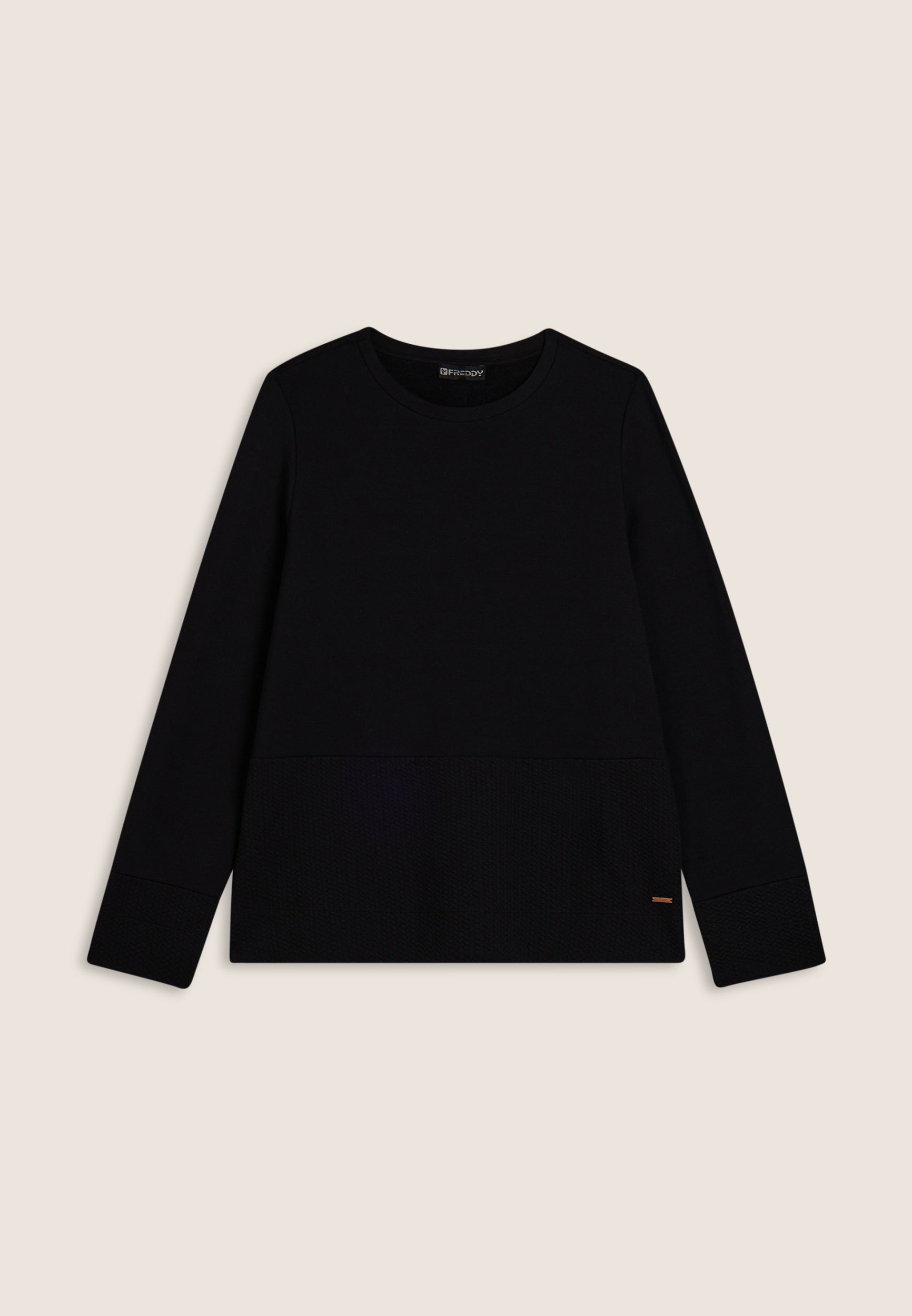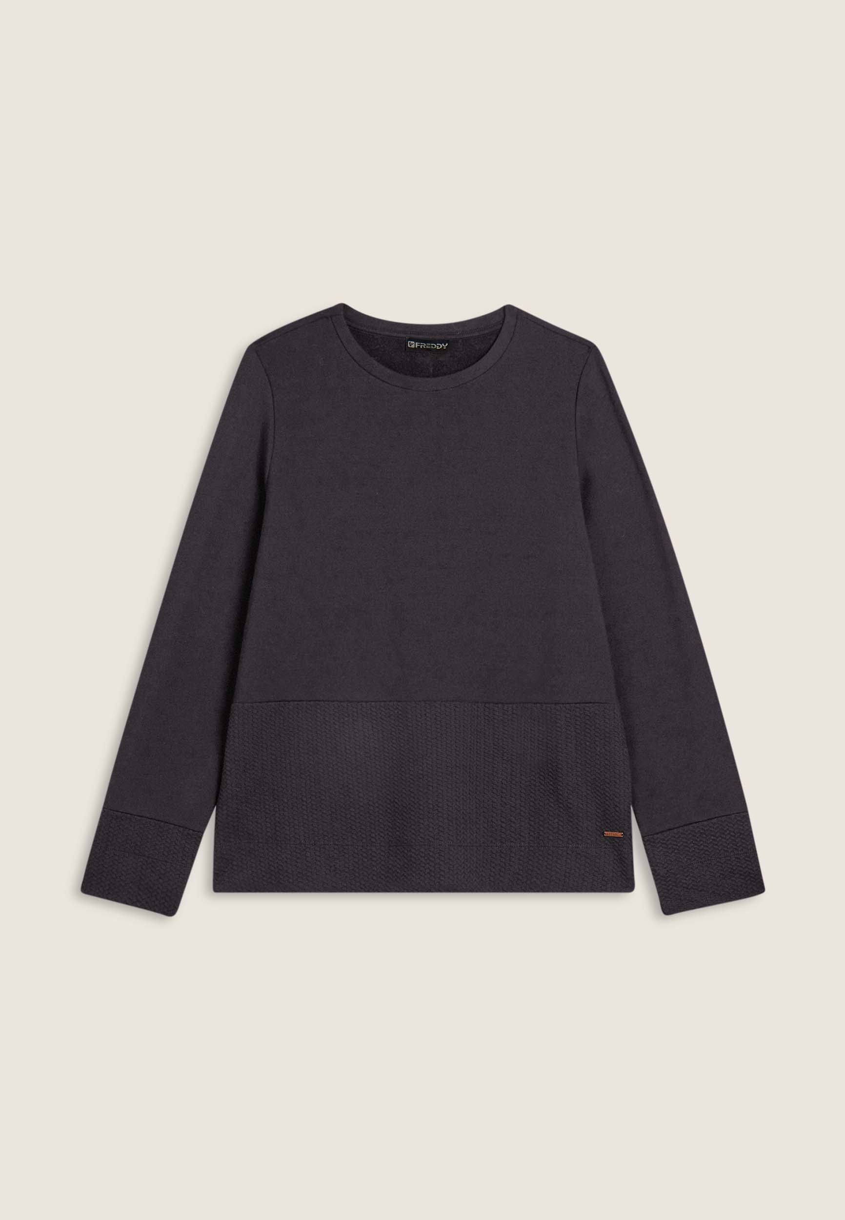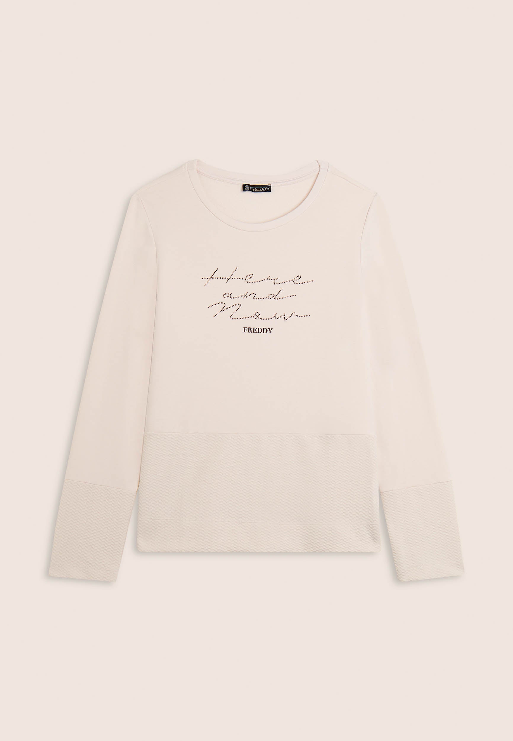 Damen-Sweatshirt mit normaler Passform aus angerautem Stretch- Modal-Sweatshirtstoff, der für Wärme und Weichheit sorgt. Das Design wird durch eine Grafik aus Strasssteinen mit der Aufschrift „Here and Now“ auf der Vorderseite und eleganten Details unterhalb der Brust und an den Ärmeln aus doppellagigem Techno-Sweatshirtstoff mit Mikro-Zopfmuster abgerundet. Rundhalsausschnitt, Ärmel ohne Bündchen und Logo-Plakette von FREDDY am linken Bund.