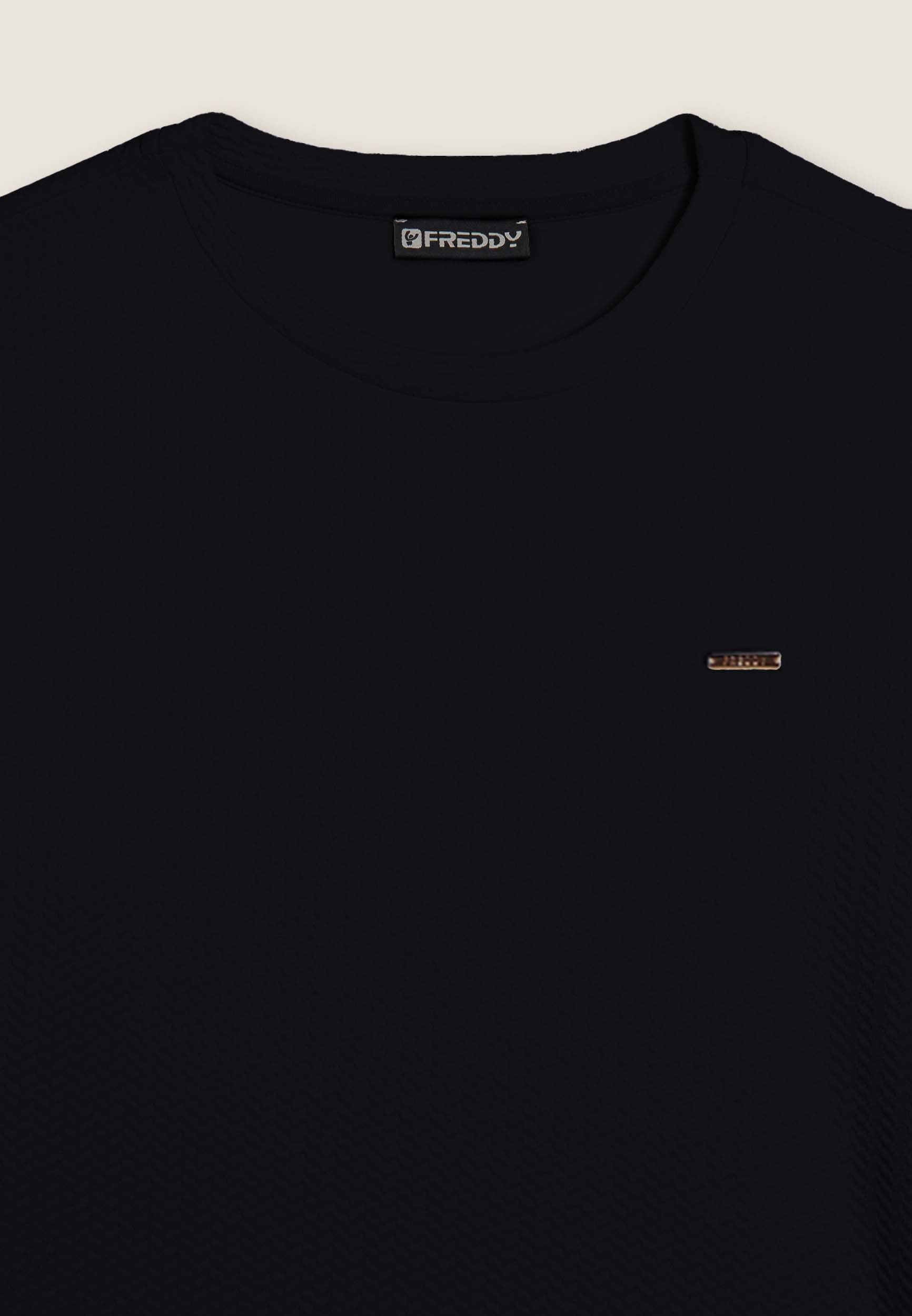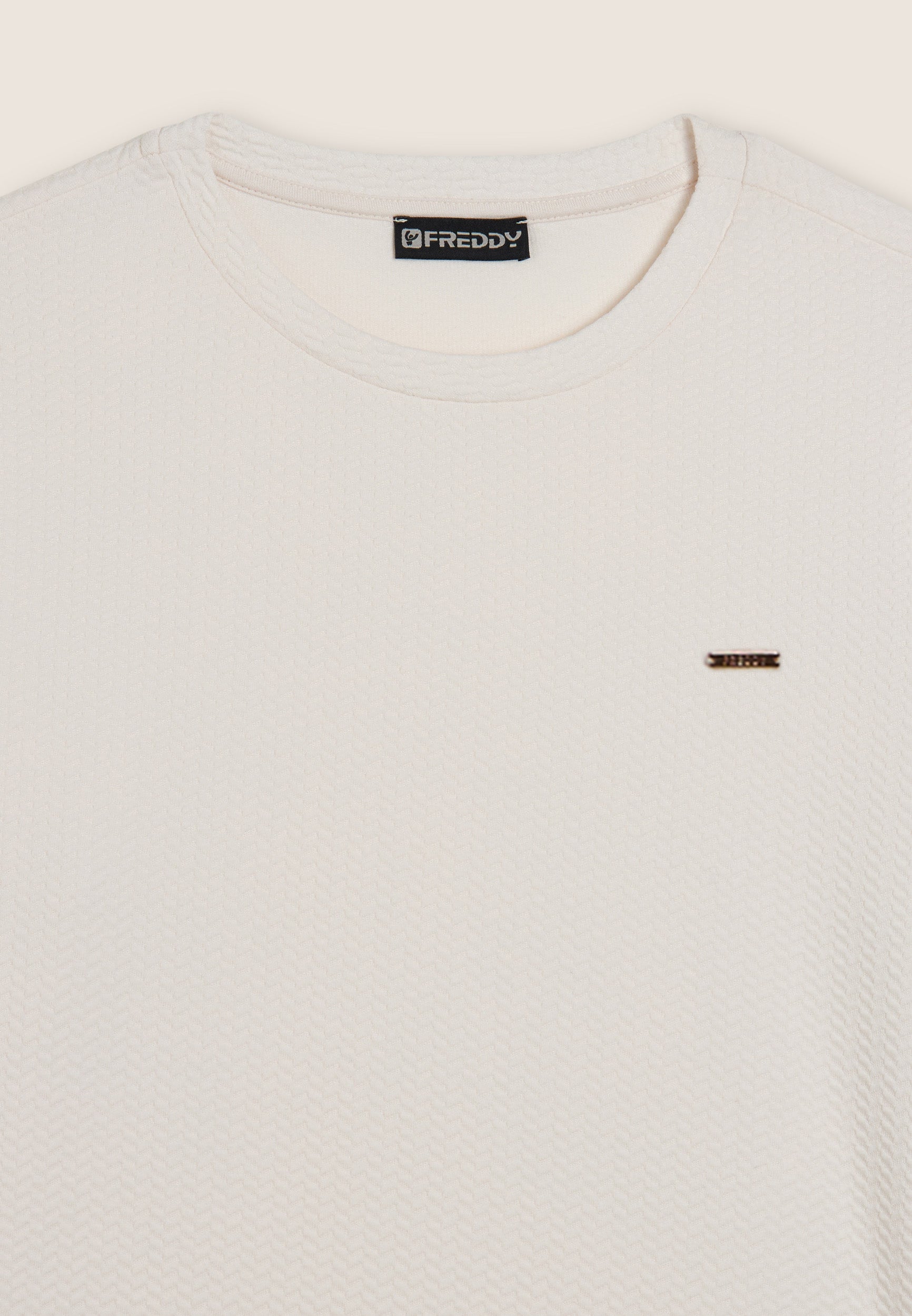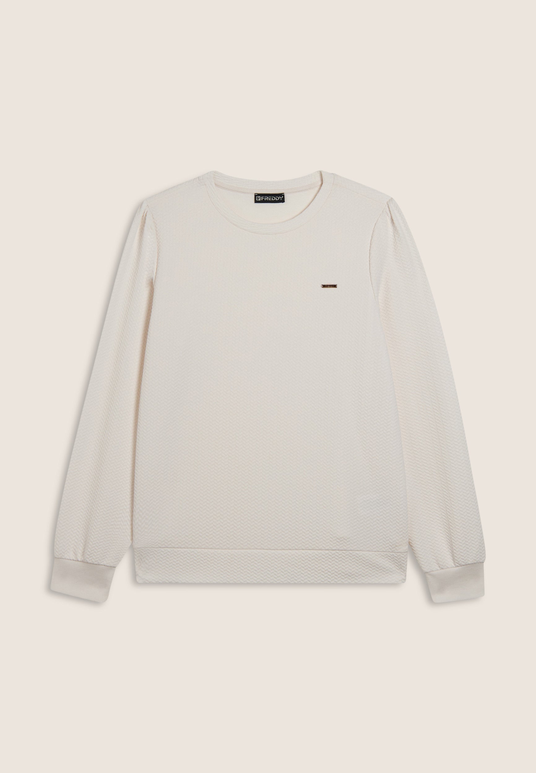 Damen-Sweatshirt mit Rundhalsausschnitt und normaler Passform, komplett aus doppellagigem Techno-Sweatshirtstoff mit raffiniertem Mikro-Zopfmuster. Lange Ärmel mit Rippenbündchen für täglichen Komfort. Einfach und vielseitig, perfekt für einen gepflegten Freizeitlook. Logo-Plakette von FREDDY auf der linken Brustseite.