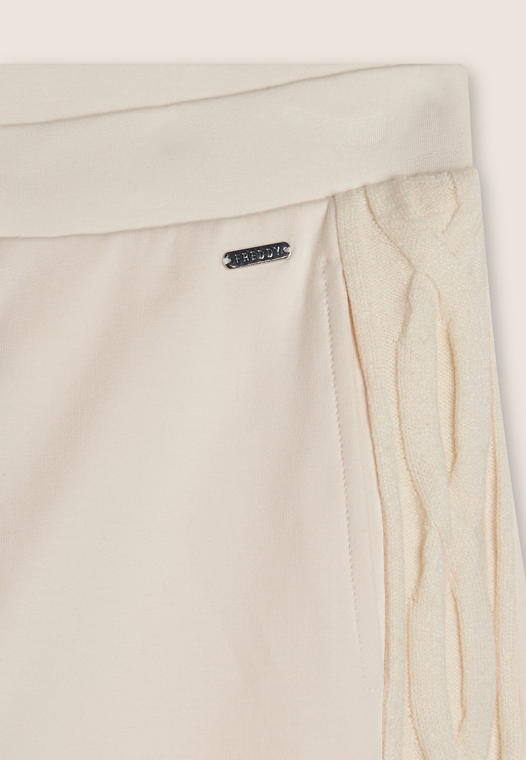 Diese bequeme und warme Damen-Sporthose hat Bündchen am Beinabschluss, einen Taillenbund mit innenliegendem Kordelzug und Trikoteinsätzen mit Zopfmuster an den Beinaußenseiten. Hergestellt aus angerautem Stretch-Modal-Sweatshirtstoff für ein weiches und angenehmes Tragegefühl. Plakette mit FREDDY-Logo.
