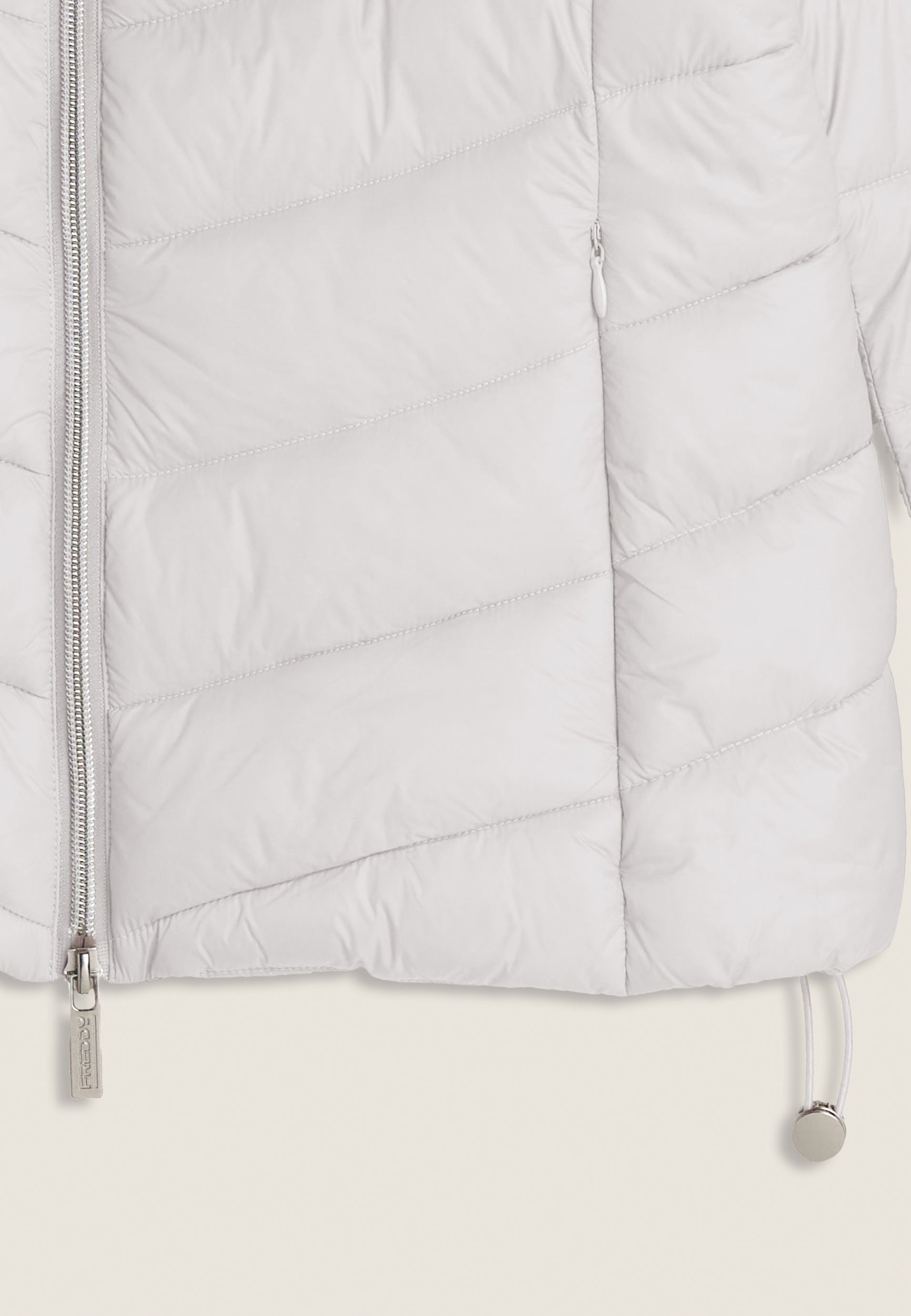 Damen-Daunenjacke mit horizontalen Bändern in normaler Passform und einer Länge knapp unterhalb der Taille, die dich an kälteren Tagen perfekt begleitet. Der hohe Kragen und der durchgehende 2-Wege-Reißverschluss garantieren optimalen Schutz vor Kälte. Der verstellbare Kordelzug am Saum lässt sich ganz nach Belieben anpassen. Die Außenseite ist aus glänzendem Nylon mit wasserabweisender Beschichtung und die Füllung aus tierfreundlicher Kunstdaune, die auch bei Nässe warm hält. Feminine Details wie das Logo mit Strasssteinen auf dem linken Ärmel und die praktischen Fronttaschen mit Reißverschluss runden den Look ab.