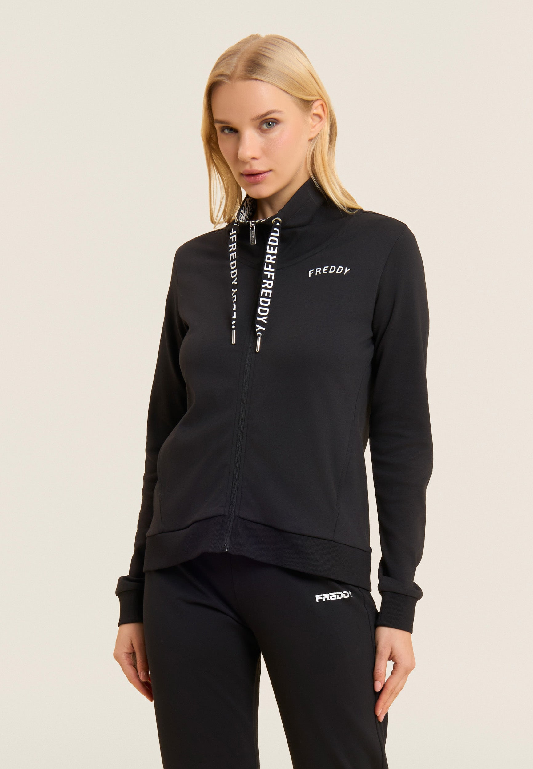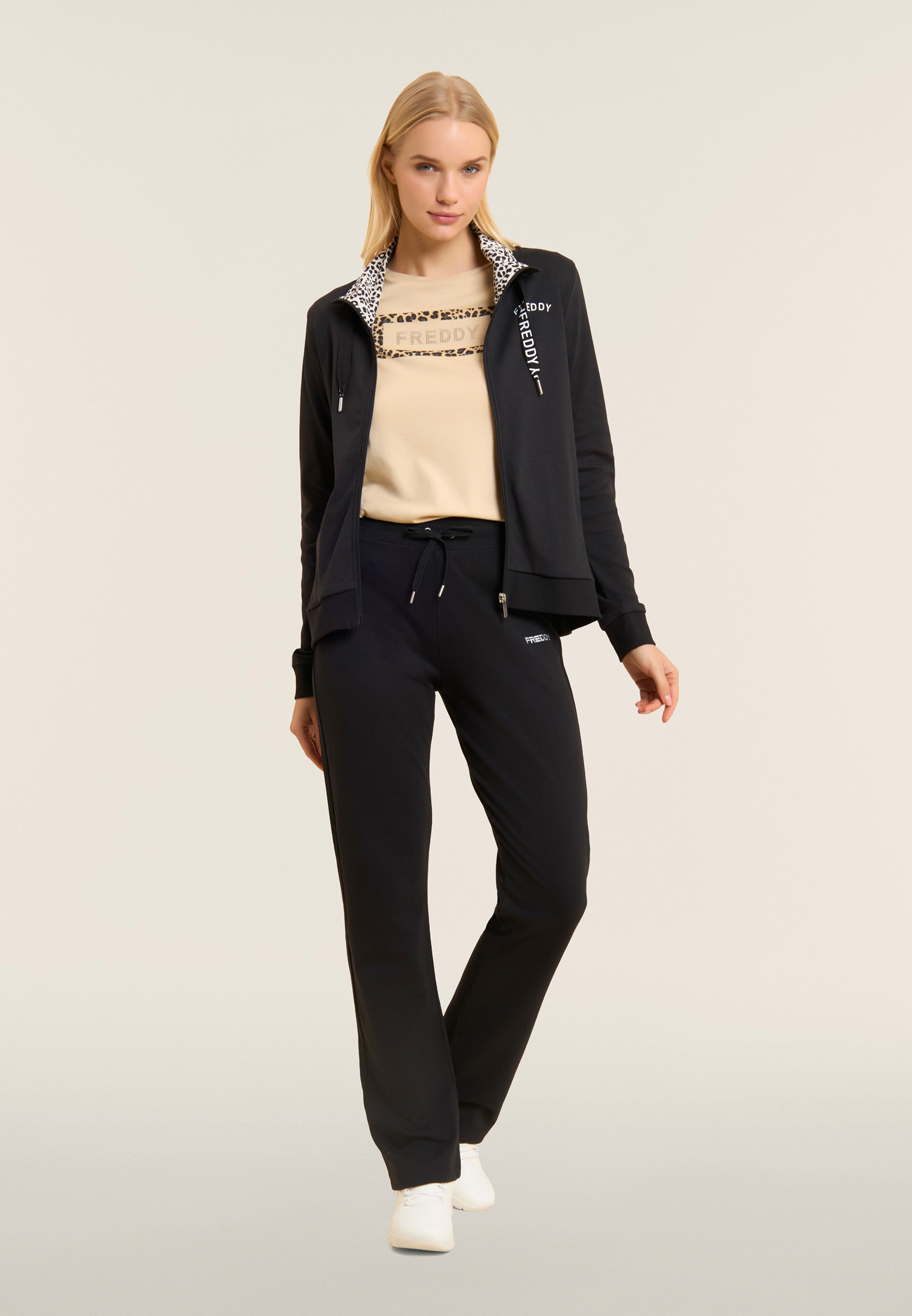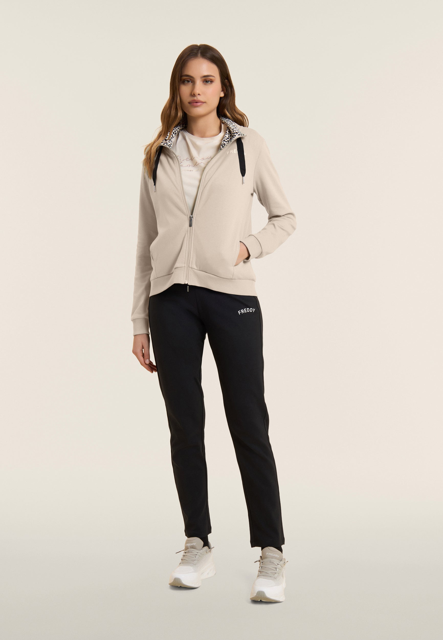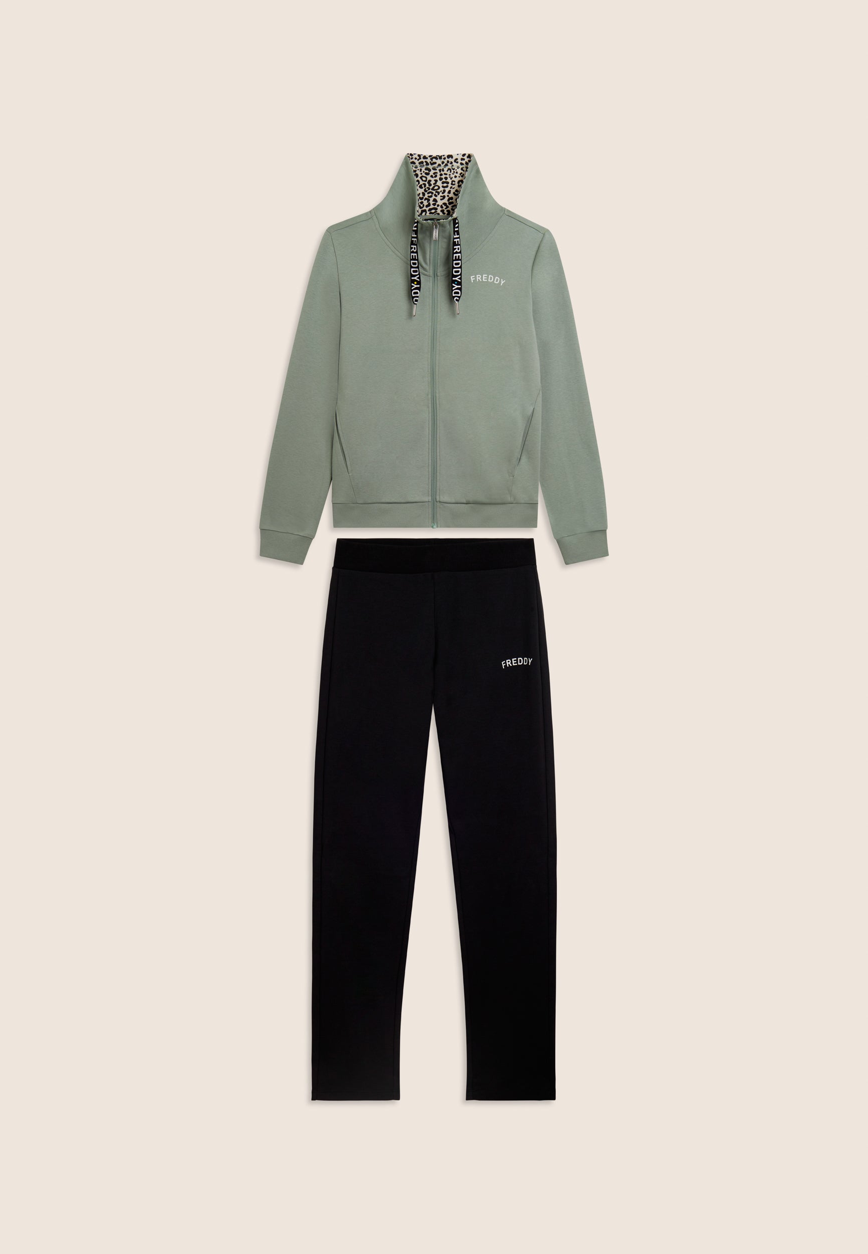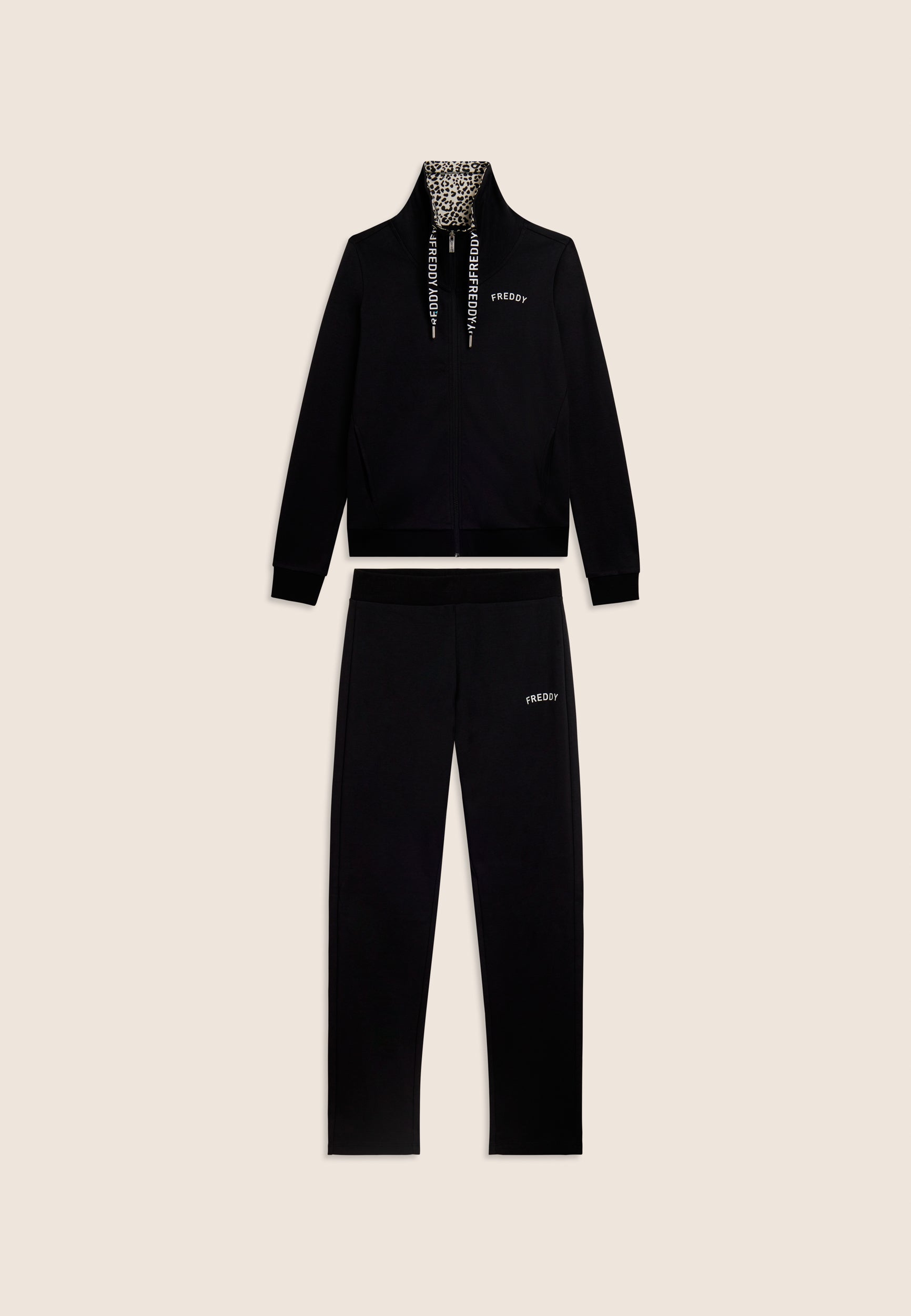 Ein starker Look für diesen Interlock-Trainingsanzug aus 100 % Baumwolle, der Komfort und Persönlichkeit vereint. Die Sweatjacke hat einen hohen Kragen, der mit Jersey mit Animalier-Aufdruck gefüttert ist, einen passenden Reißverschluss und einen Kordelzug mit Logo. Gerippter Saum und Ärmel mit Bündchen. Die Hose hat einen normalen Taillenbund mit Kordelzug und einen geraden Saum. FREDDY-Logo mit weißem Glitzer auf Herz und Seite. Leistentaschen auf der Vorderseite der Kapuzenjacke.