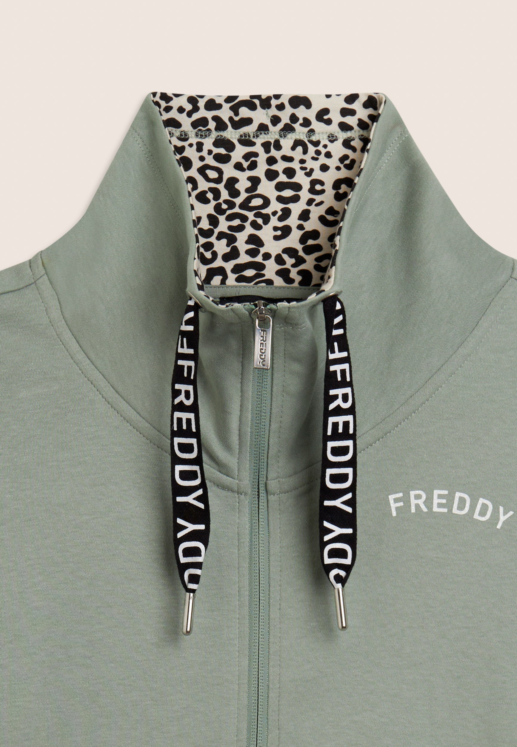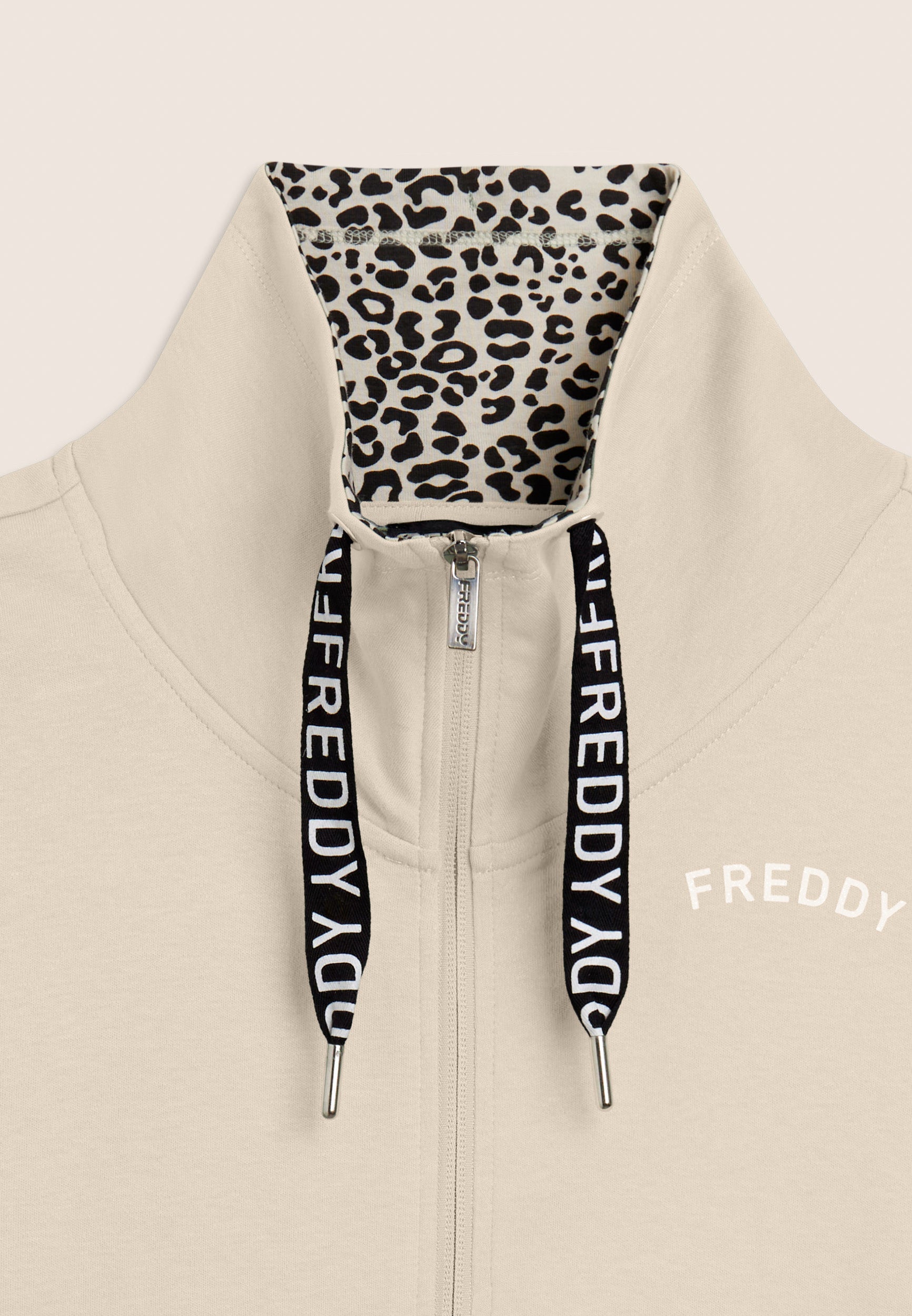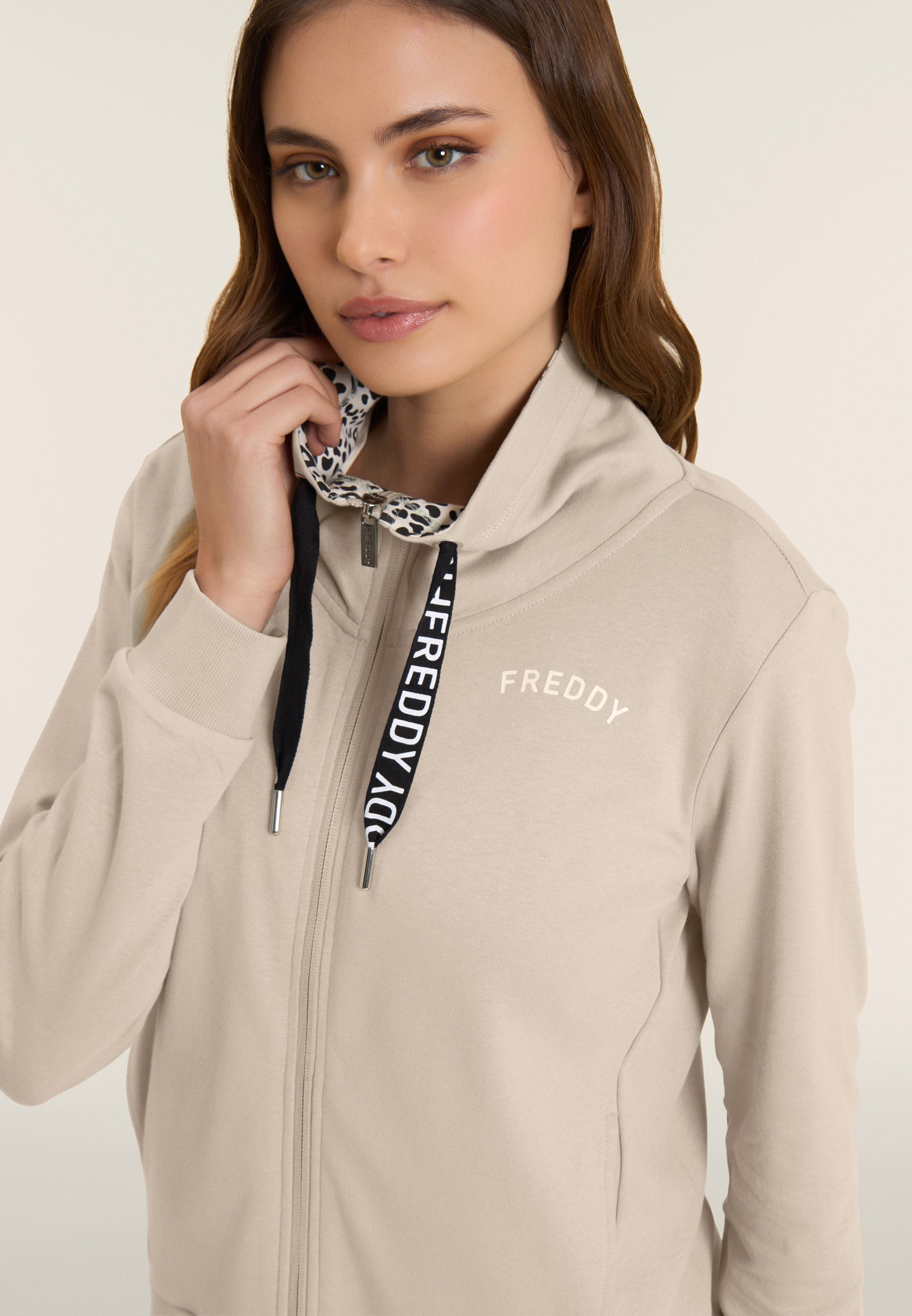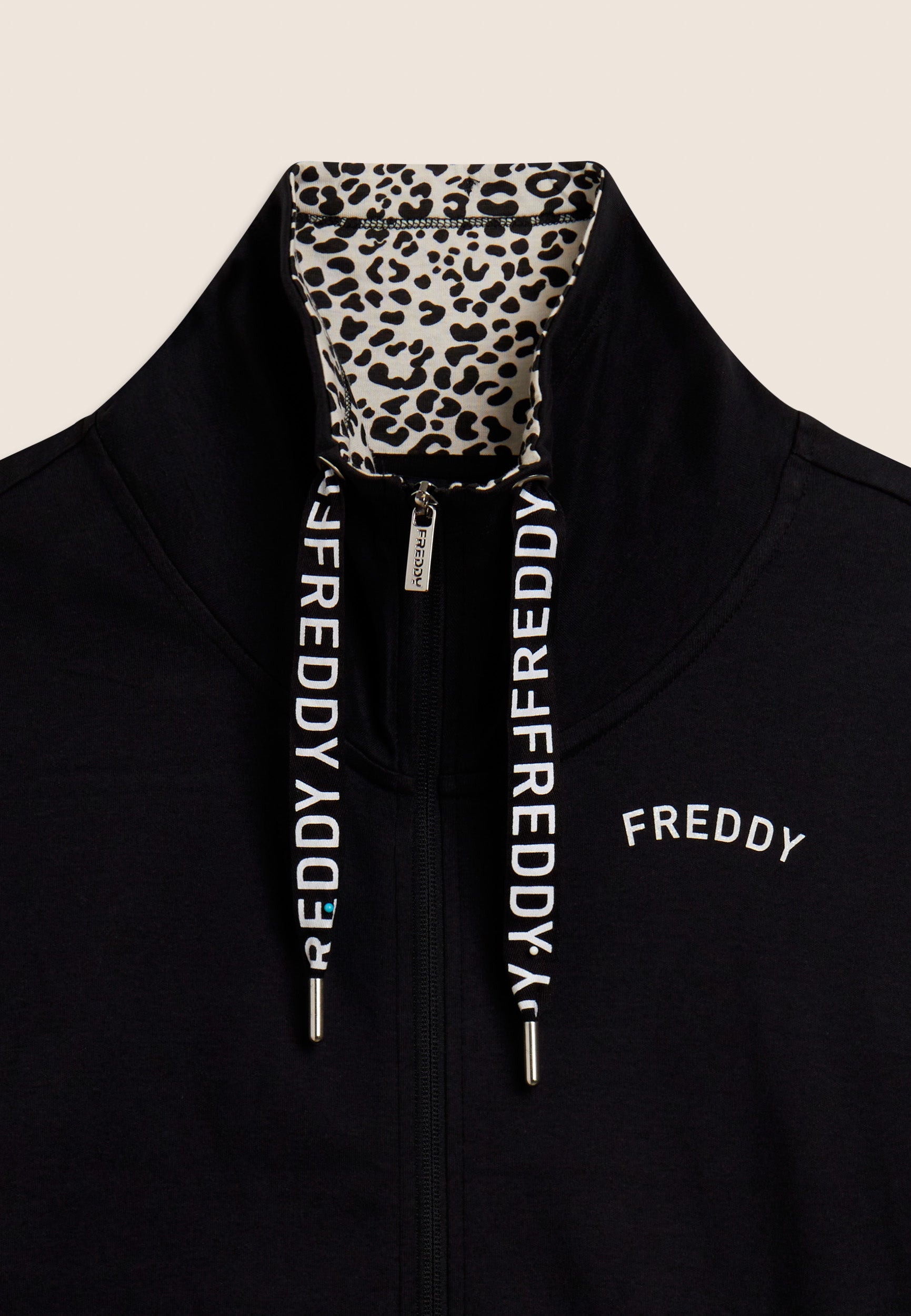 Ein starker Look für diesen Interlock-Trainingsanzug aus 100 % Baumwolle, der Komfort und Persönlichkeit vereint. Die Sweatjacke hat einen hohen Kragen, der mit Jersey mit Animalier-Aufdruck gefüttert ist, einen passenden Reißverschluss und einen Kordelzug mit Logo. Gerippter Saum und Ärmel mit Bündchen. Die Hose hat einen normalen Taillenbund mit Kordelzug und einen geraden Saum. FREDDY-Logo mit weißem Glitzer auf Herz und Seite. Leistentaschen auf der Vorderseite der Kapuzenjacke.
