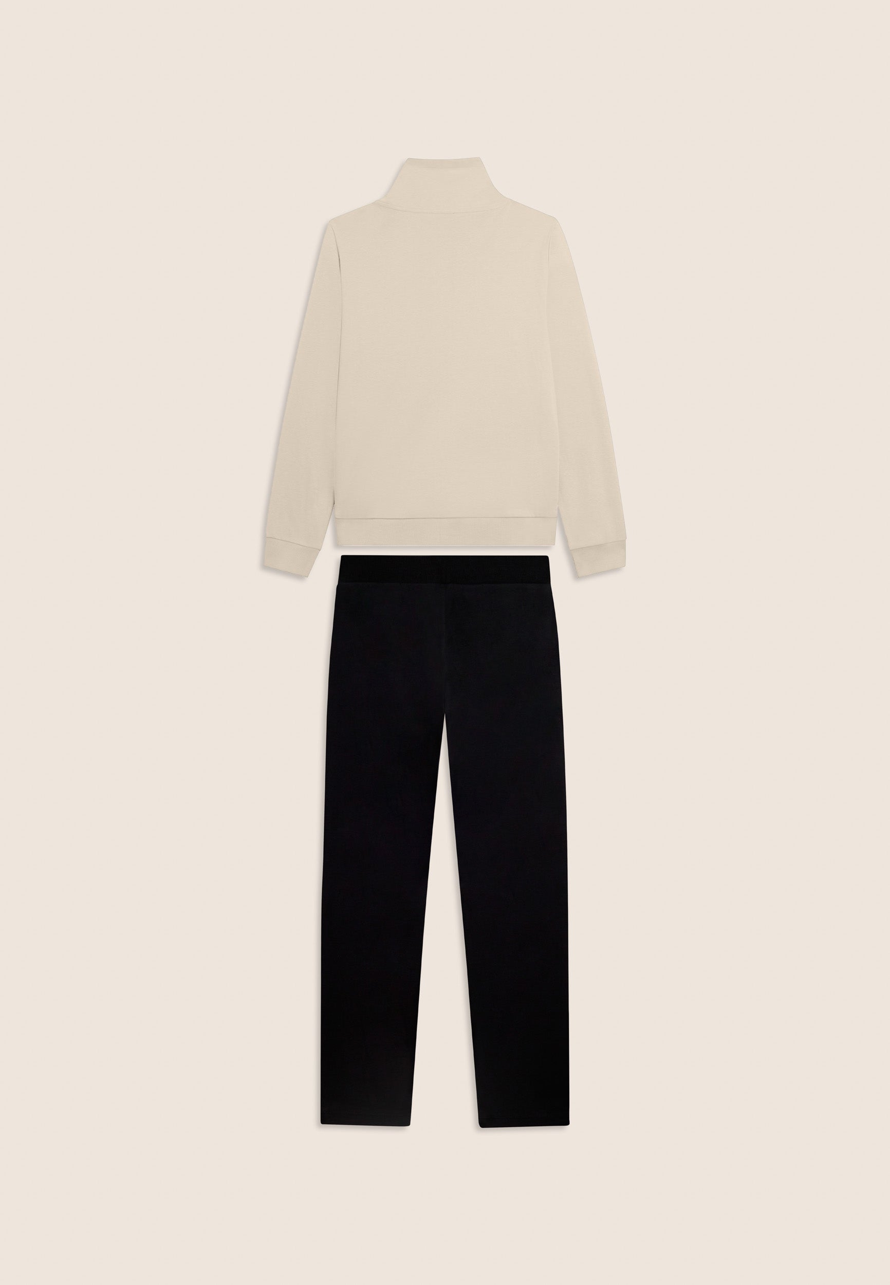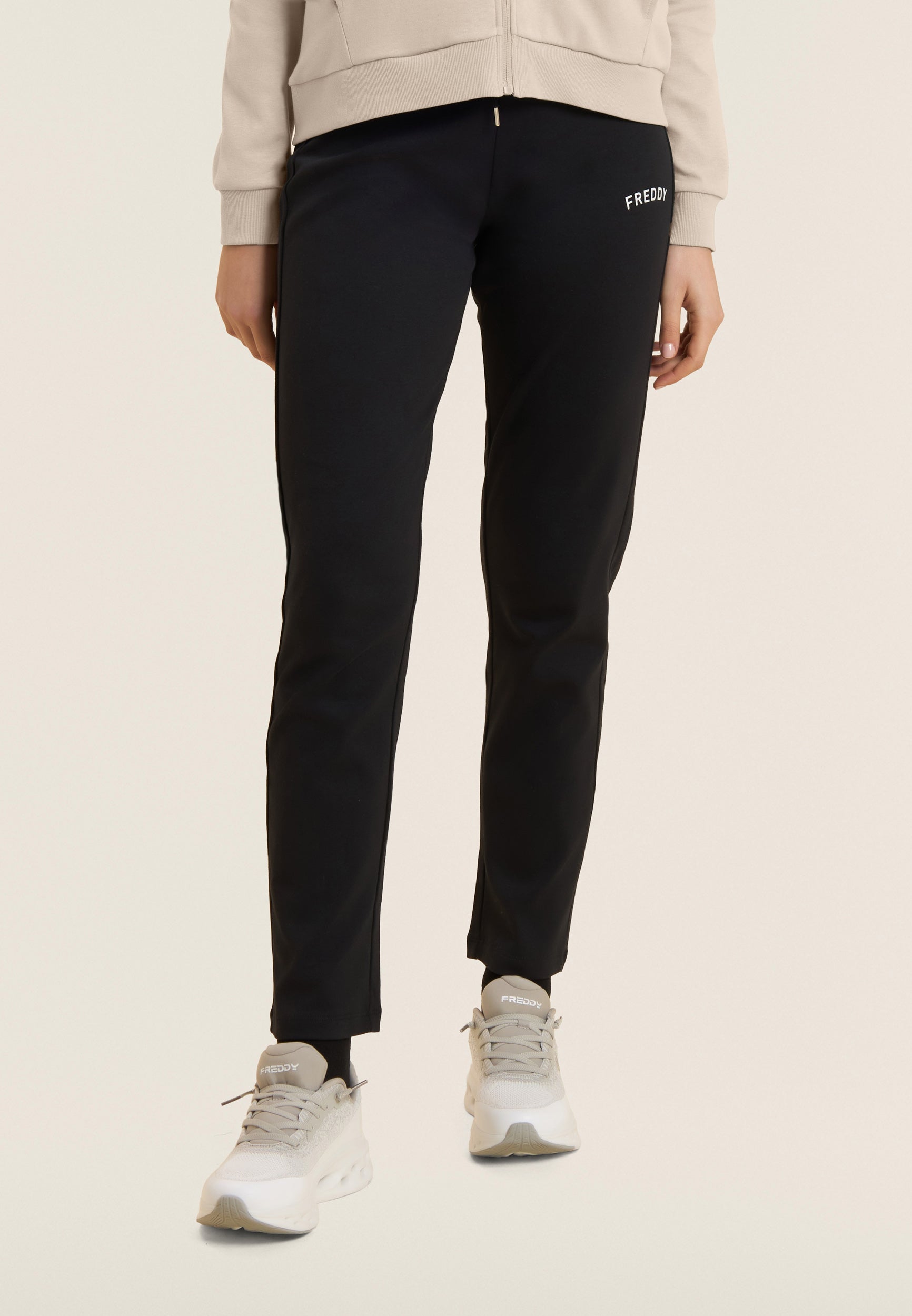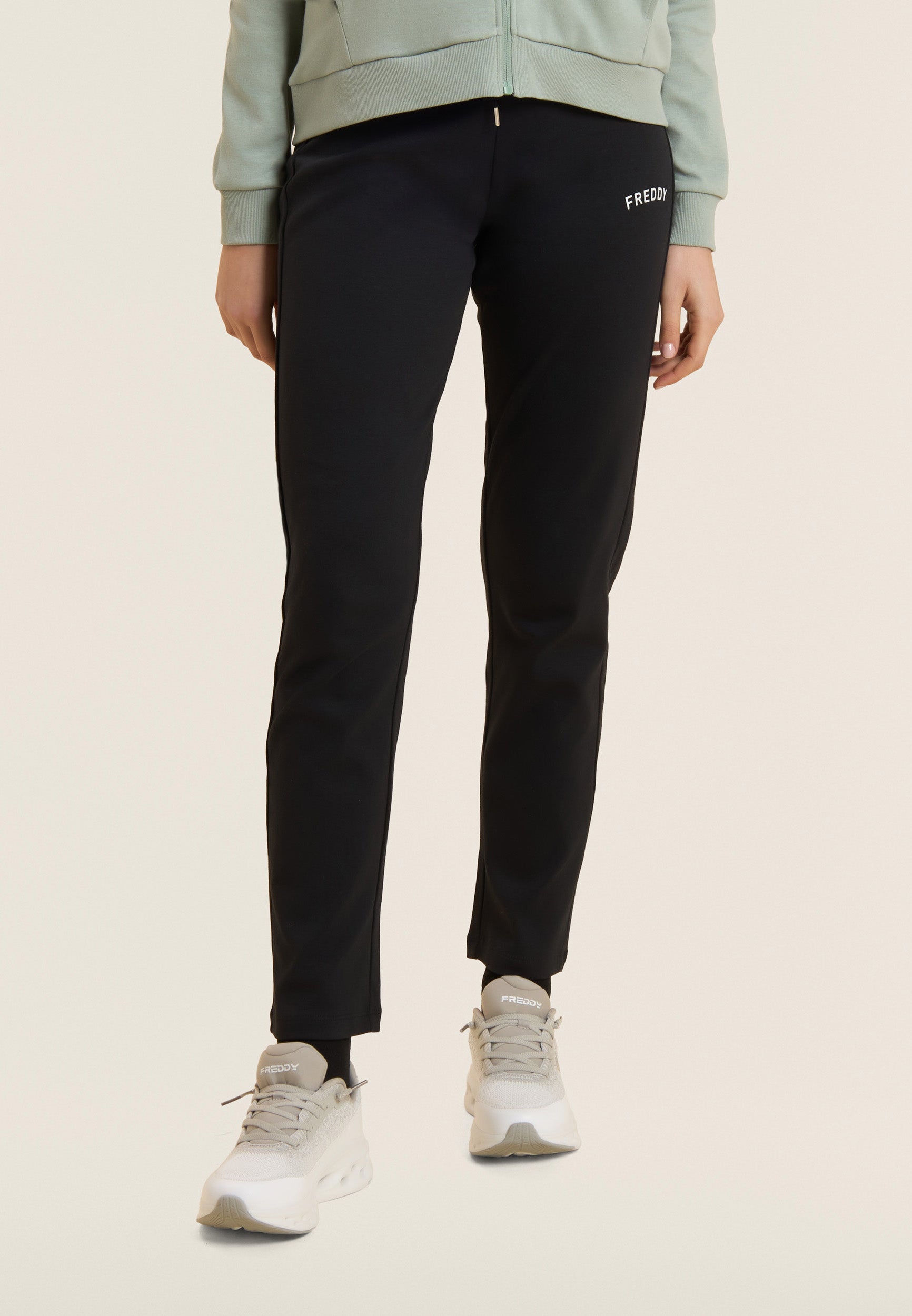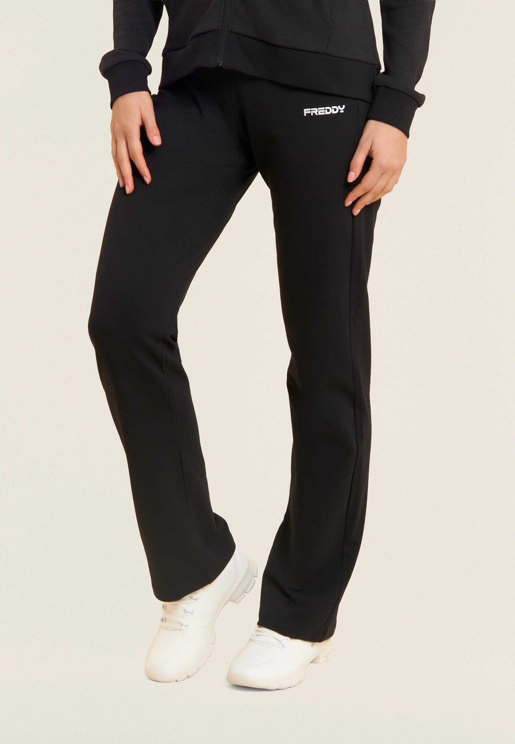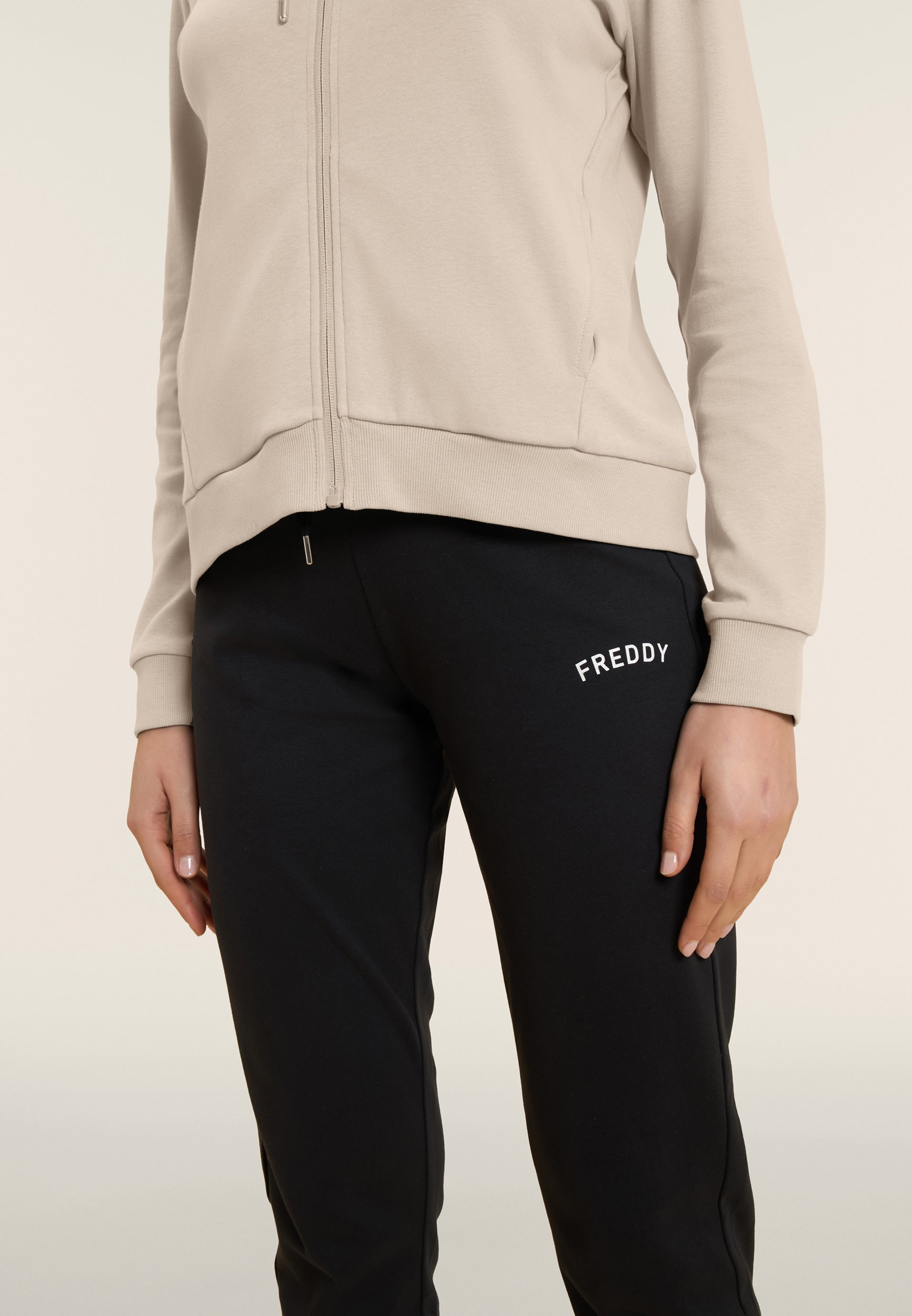 Ein starker Look für diesen Interlock-Trainingsanzug aus 100 % Baumwolle, der Komfort und Persönlichkeit vereint. Die Sweatjacke hat einen hohen Kragen, der mit Jersey mit Animalier-Aufdruck gefüttert ist, einen passenden Reißverschluss und einen Kordelzug mit Logo. Gerippter Saum und Ärmel mit Bündchen. Die Hose hat einen normalen Taillenbund mit Kordelzug und einen geraden Saum. FREDDY-Logo mit weißem Glitzer auf Herz und Seite. Leistentaschen auf der Vorderseite der Kapuzenjacke.