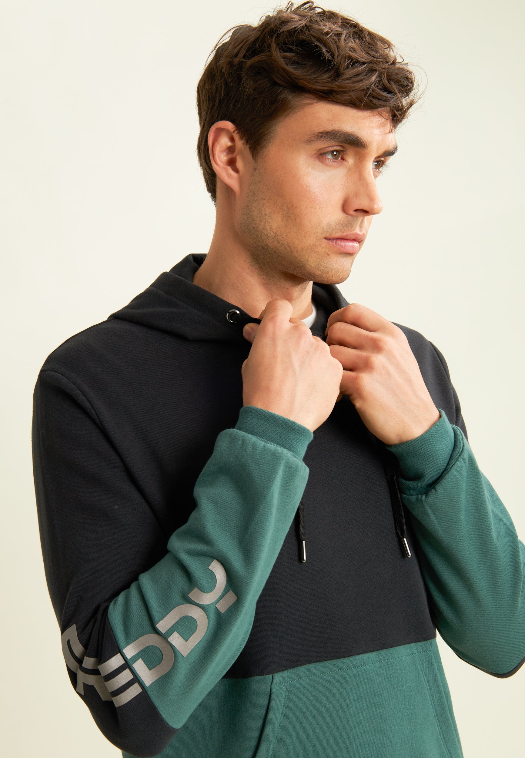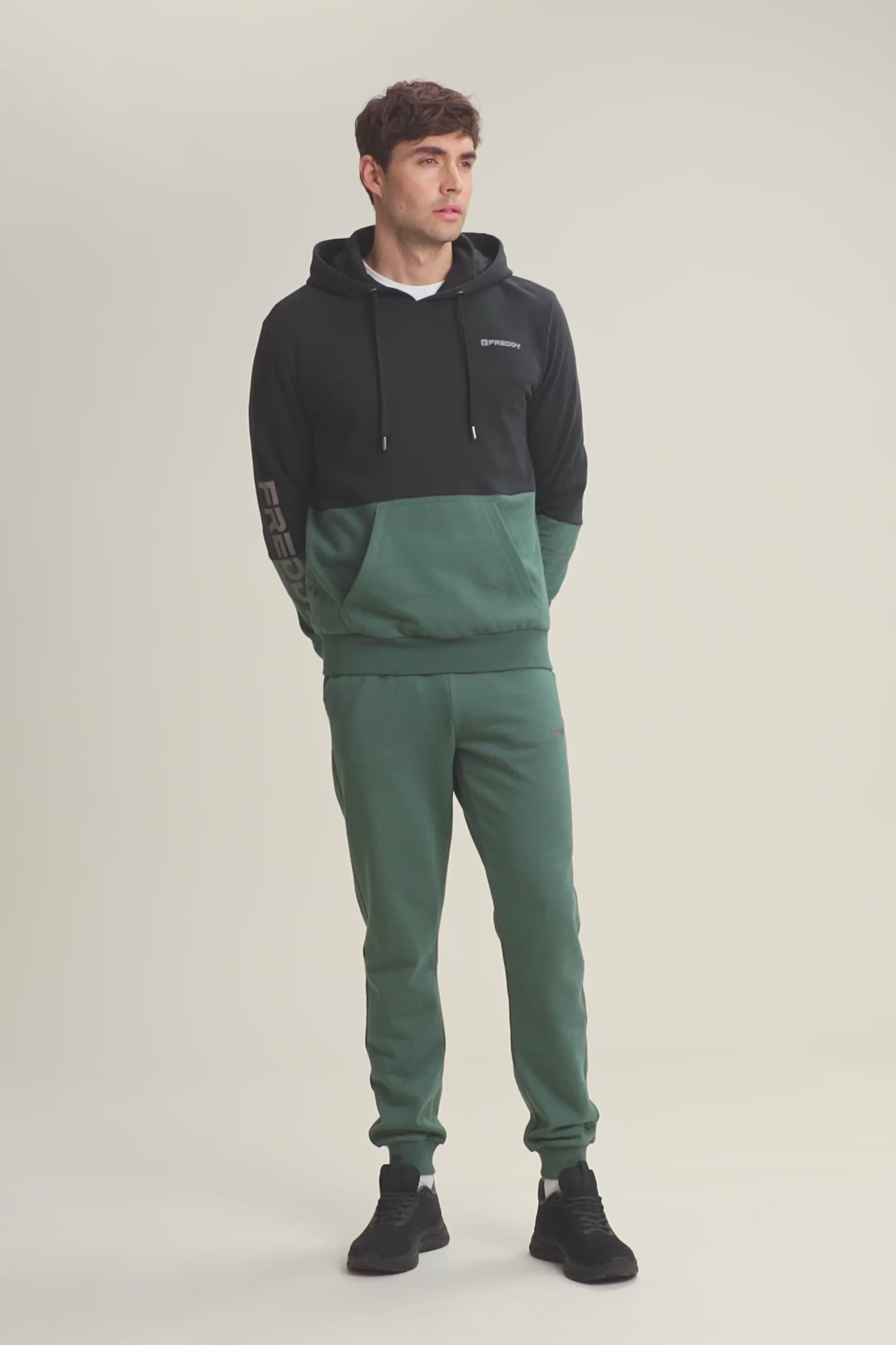 Herren-Hoodie aus angerautem Sweatshirtstoff aus 100 % Baumwolle mit normaler Passform. Das Colorblock-Design an den Schultern und der Kapuze verleiht dem Look Charakter. Verstellbare Kapuze mit Jersey-Futter, Ärmel mit Bündchen und geripptem Saum. Ausgestattet mit praktischer interner Kängurutasche und FREDDY-Logo auf dem rechten Ärmel.