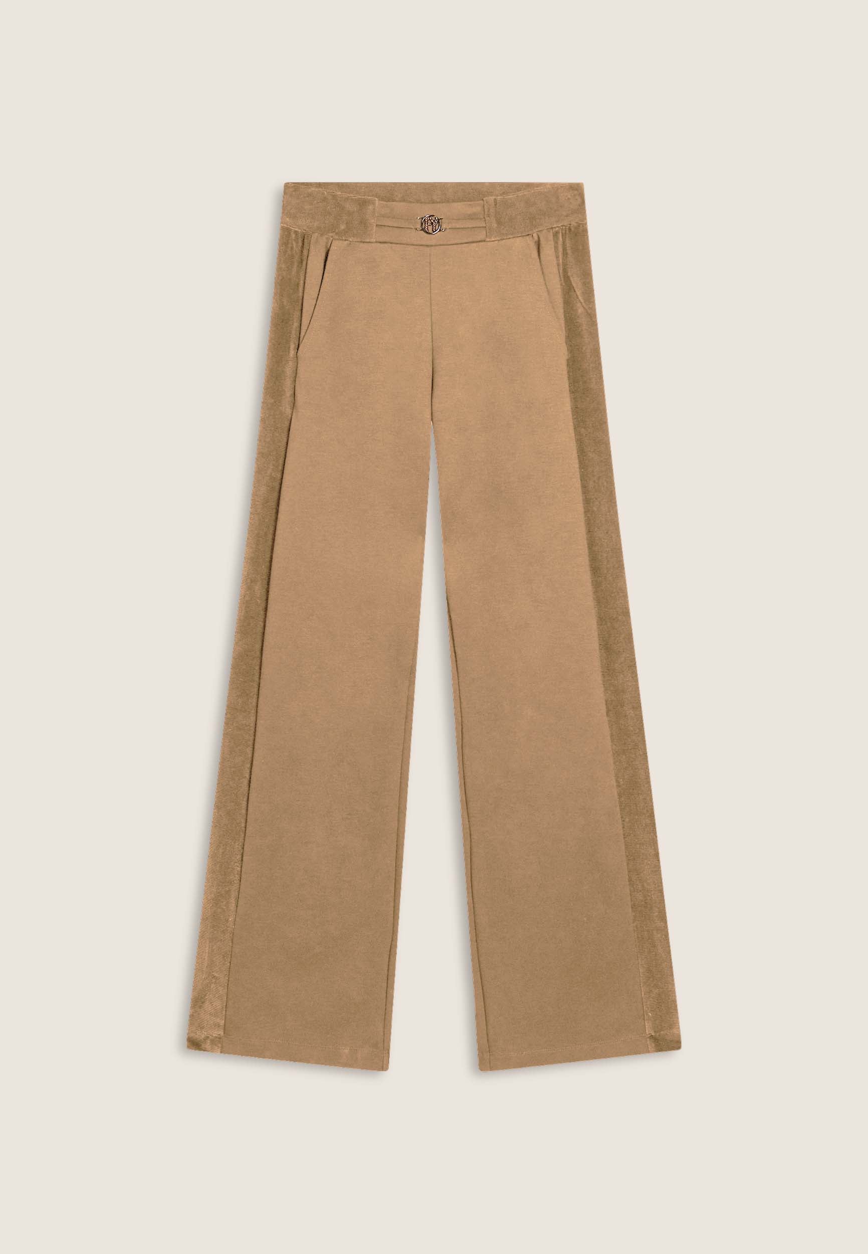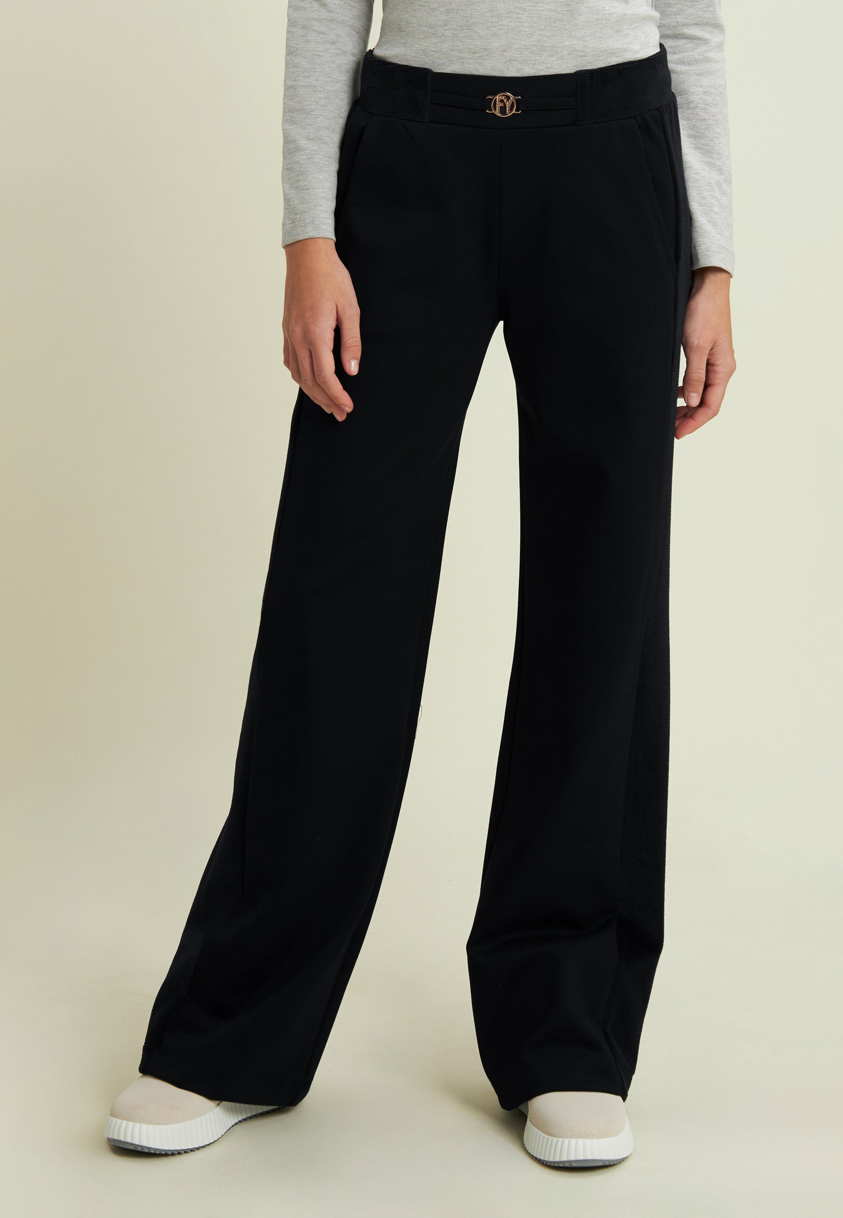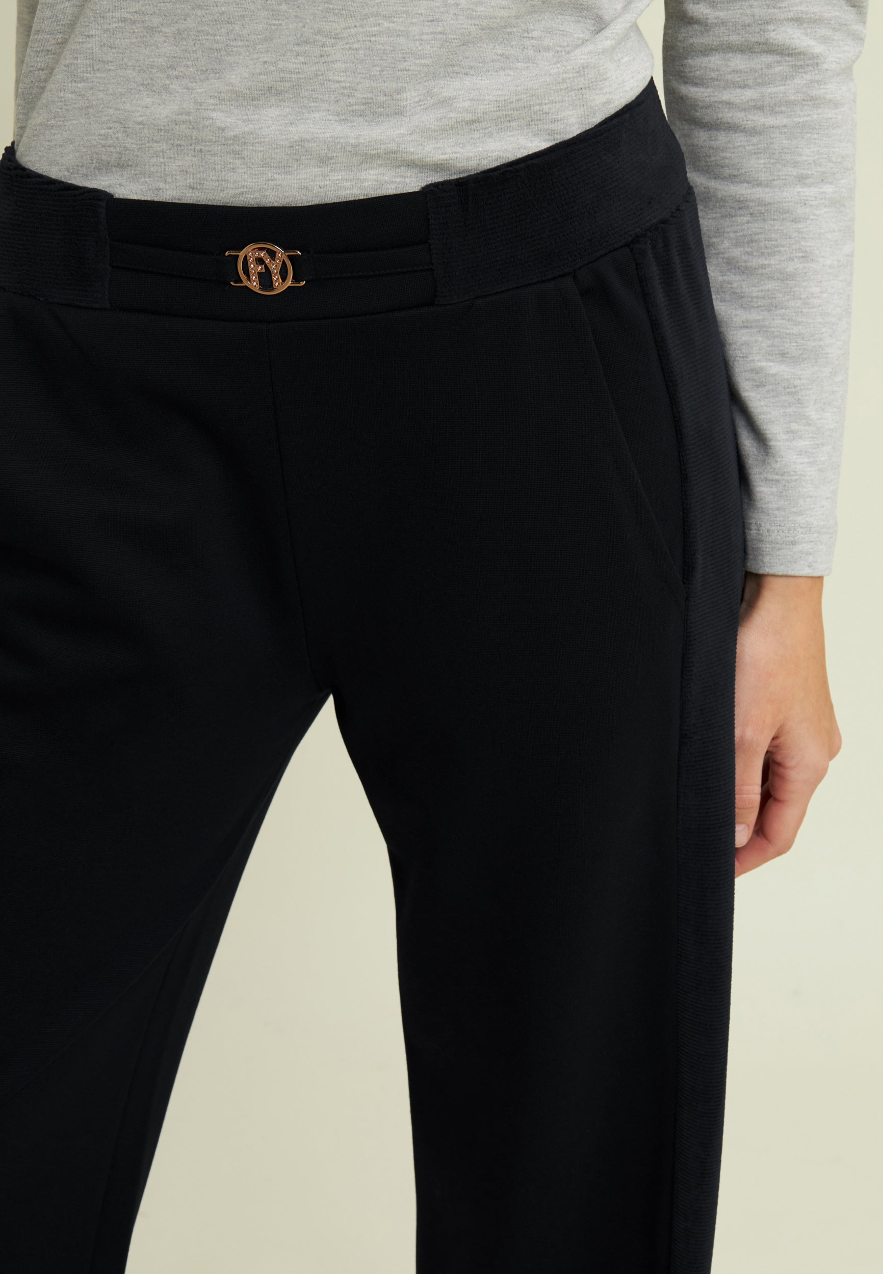 Weit geschnittene Damenhosen aus Stretch-Viskose mit einem fließenden und raffinierten Schnitt. Der hohe Taillenbund ist mit einem Chenille-Einsatz mit FY-Logo in der Mitte verziert, der sich auch an den Beinseiten wiederfindet. Schräge Eingrifftaschen runden das bequeme und feminine Design ab.