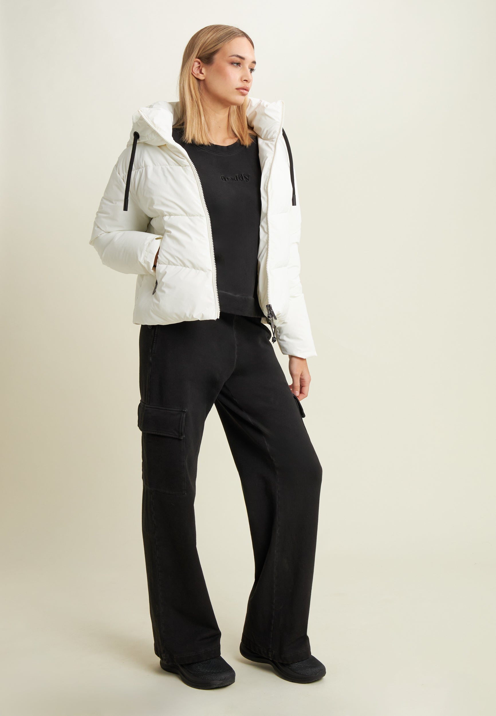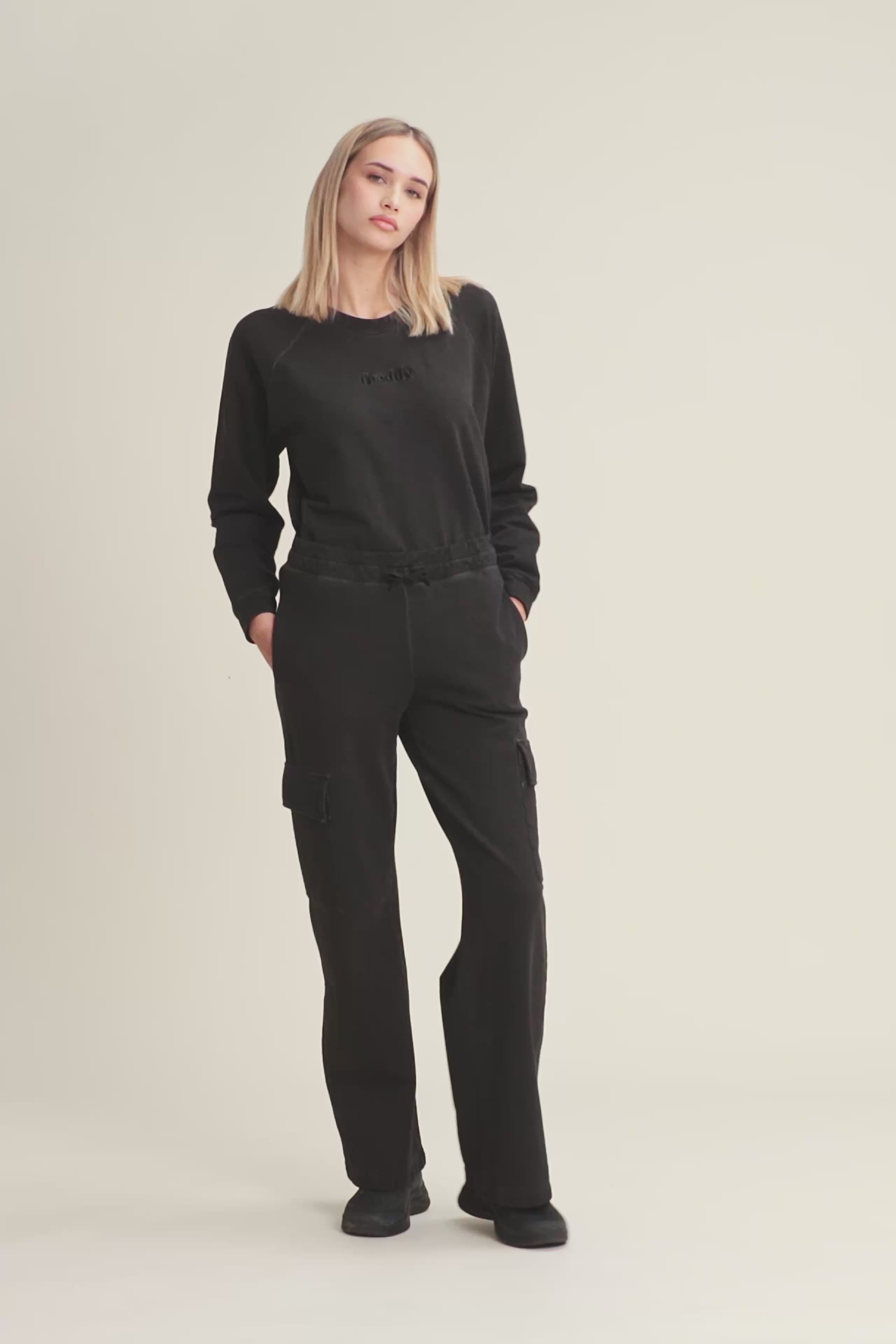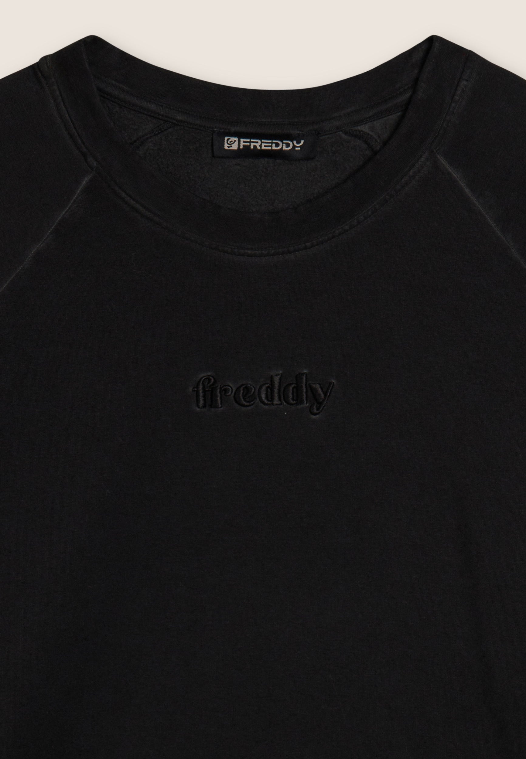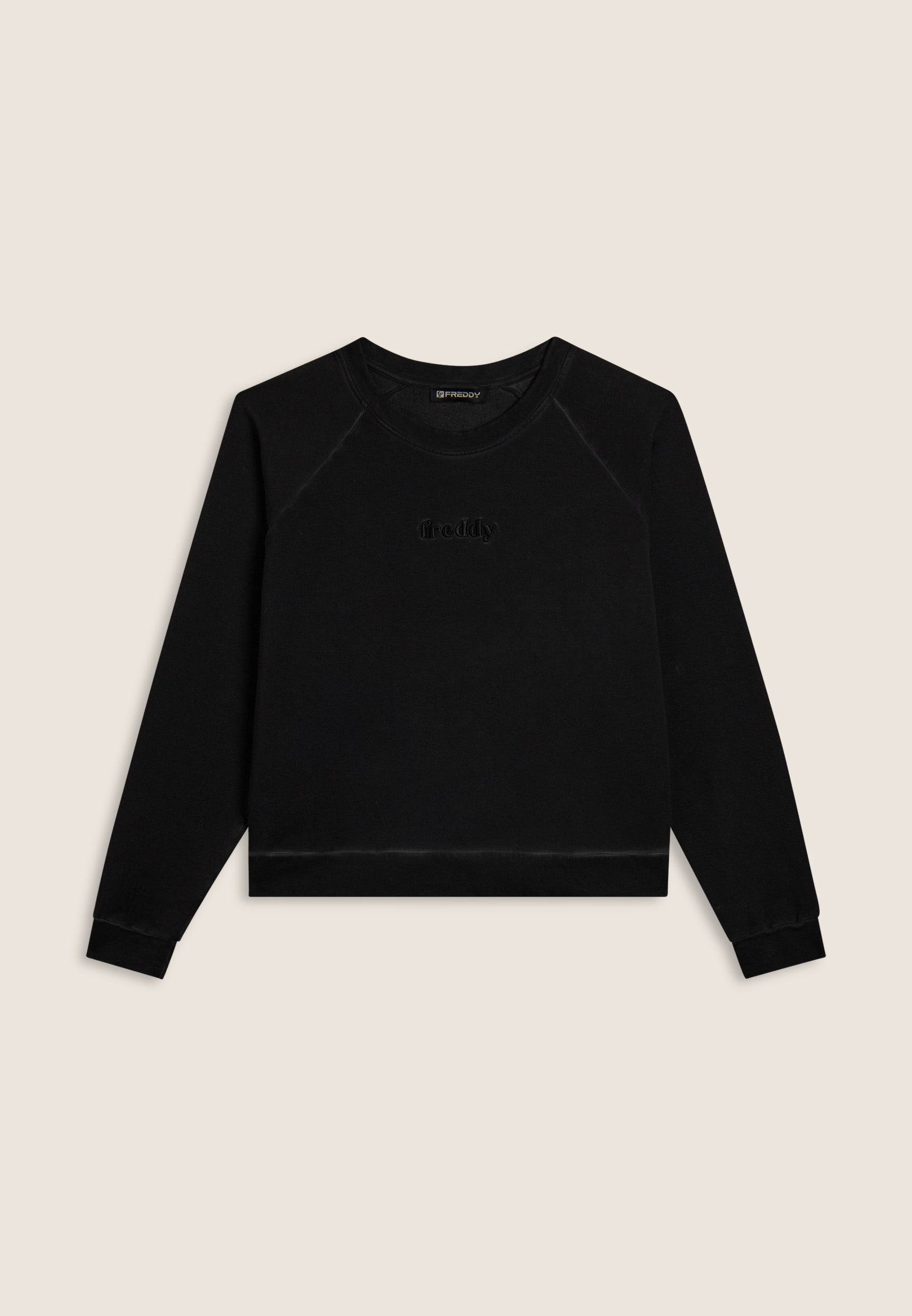 Jedes Kleidungsstück ist dank der Kaltfärbung, die für einzigartige und authentische Farbtöne sorgt, ein Unikat. Dieses verkürzte Sweatshirt aus schwarzem, angerautem Stretch-Sweatshirtstoff vereint Komfort und Streetstyle. Es hat Raglanärmel und Bündchen, einen Rundhalsausschnitt und ein gesticktes FREDDY-Logo. Genau das Richtige, um deinen Outfits einen urbanen und lässigen Touch zu verleihen.