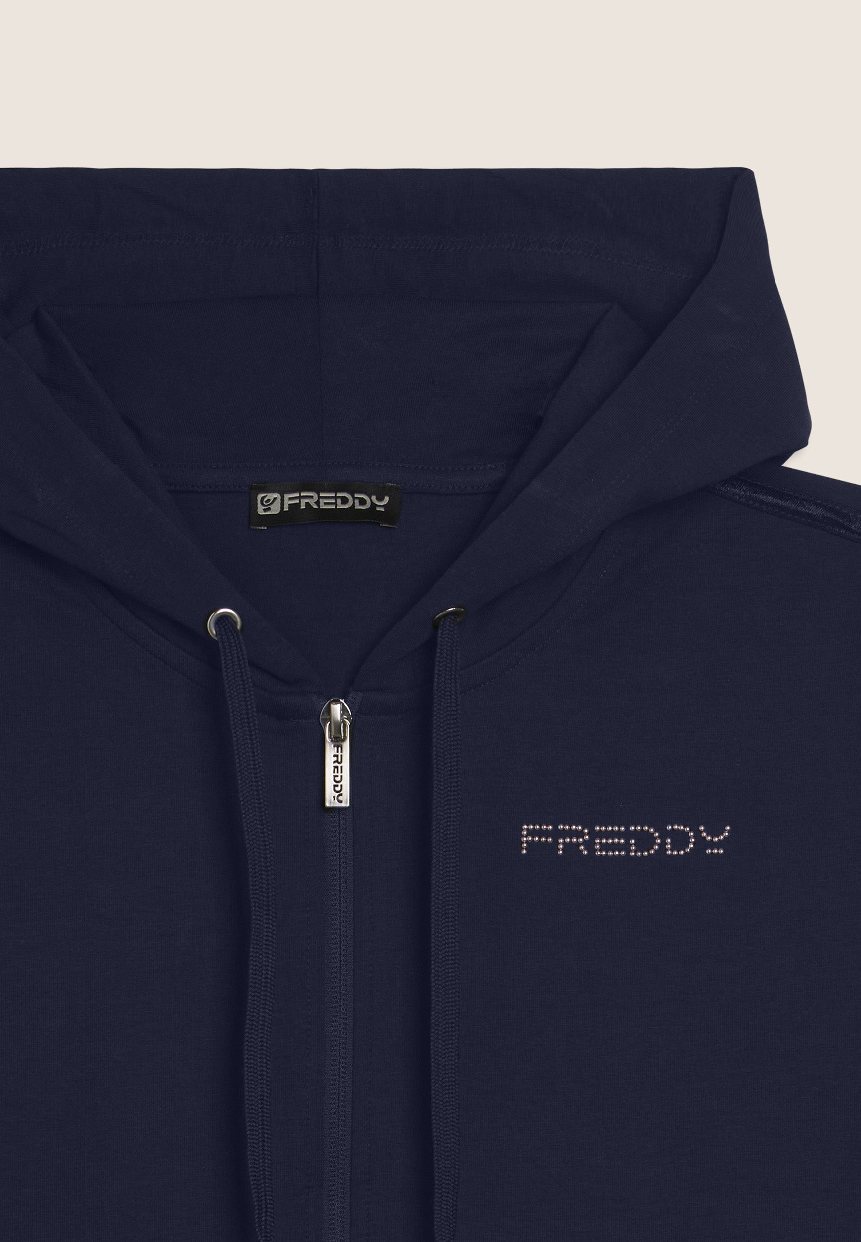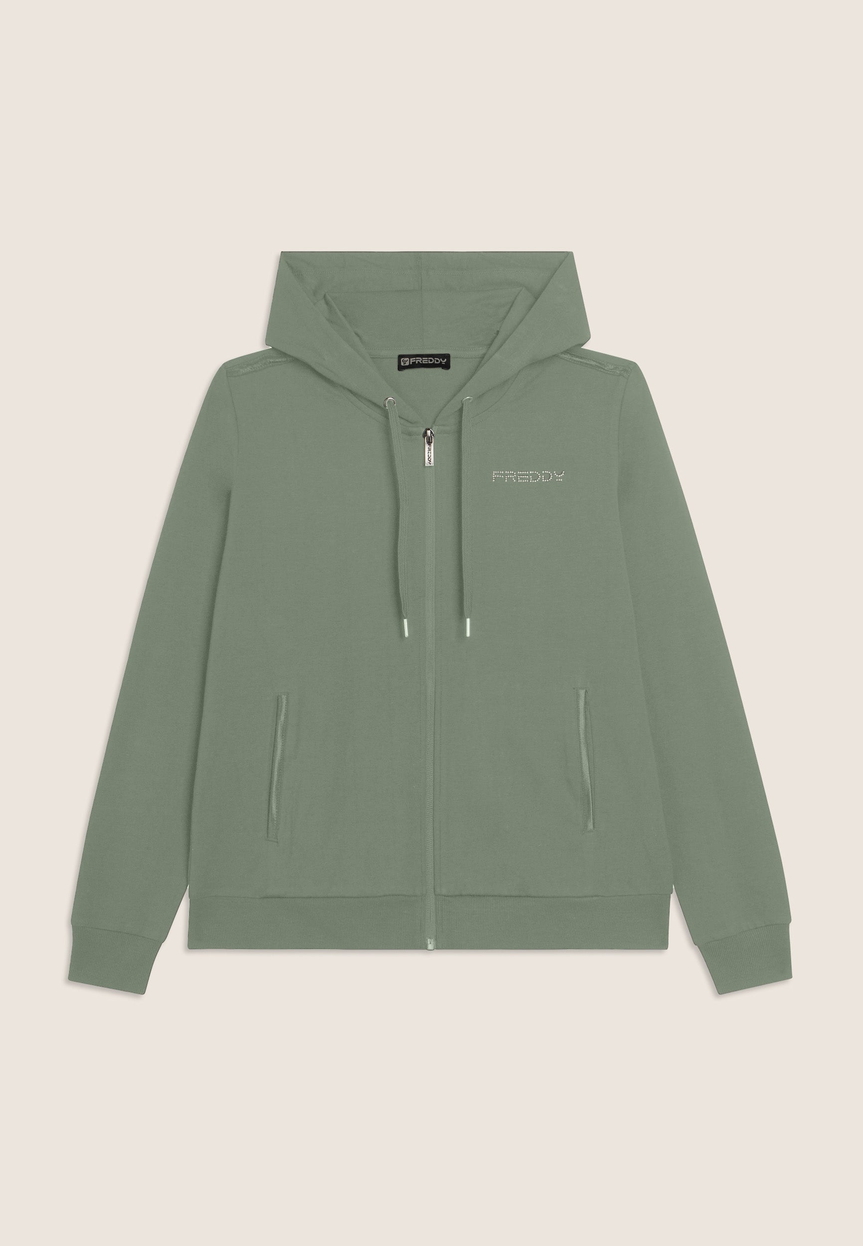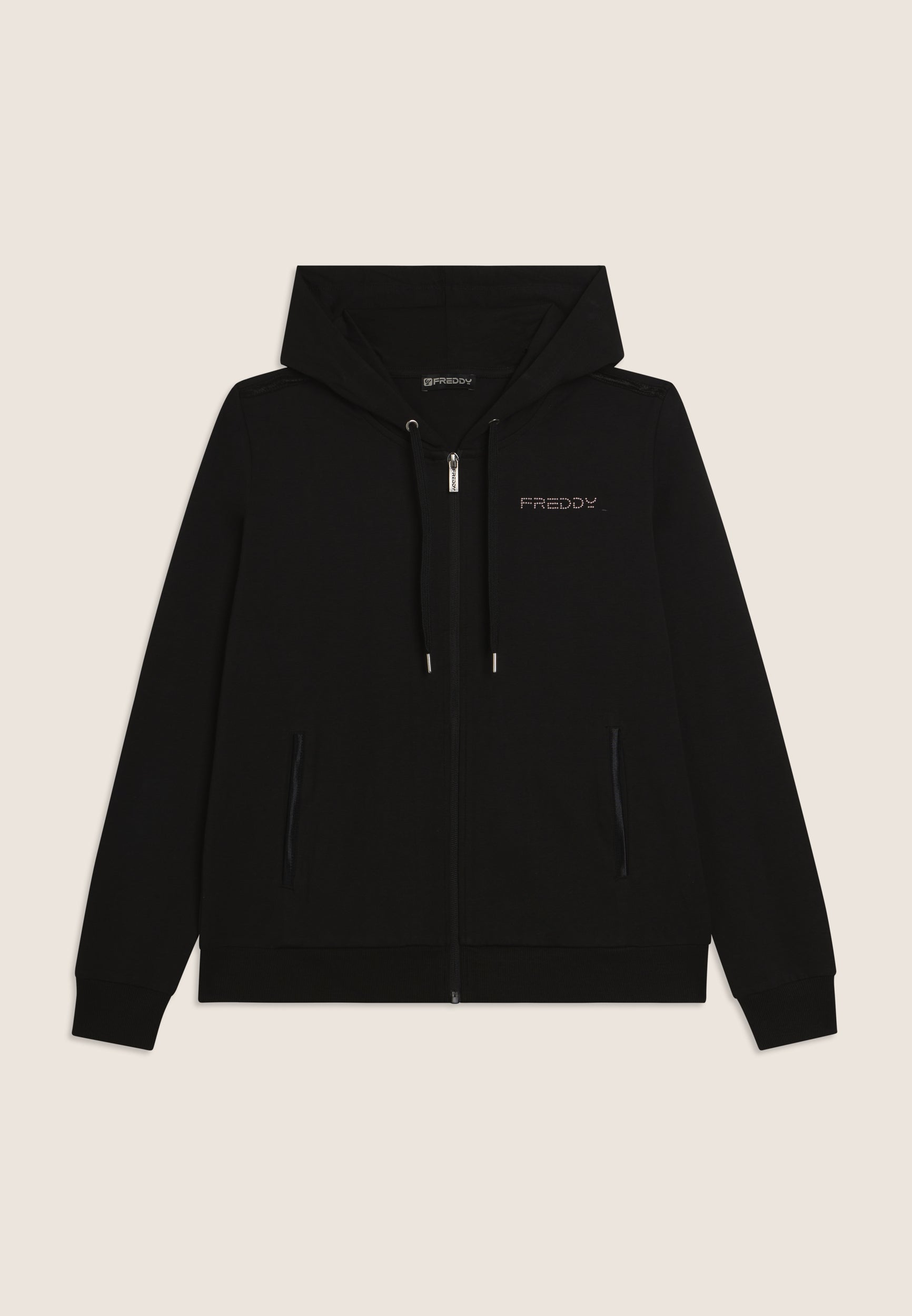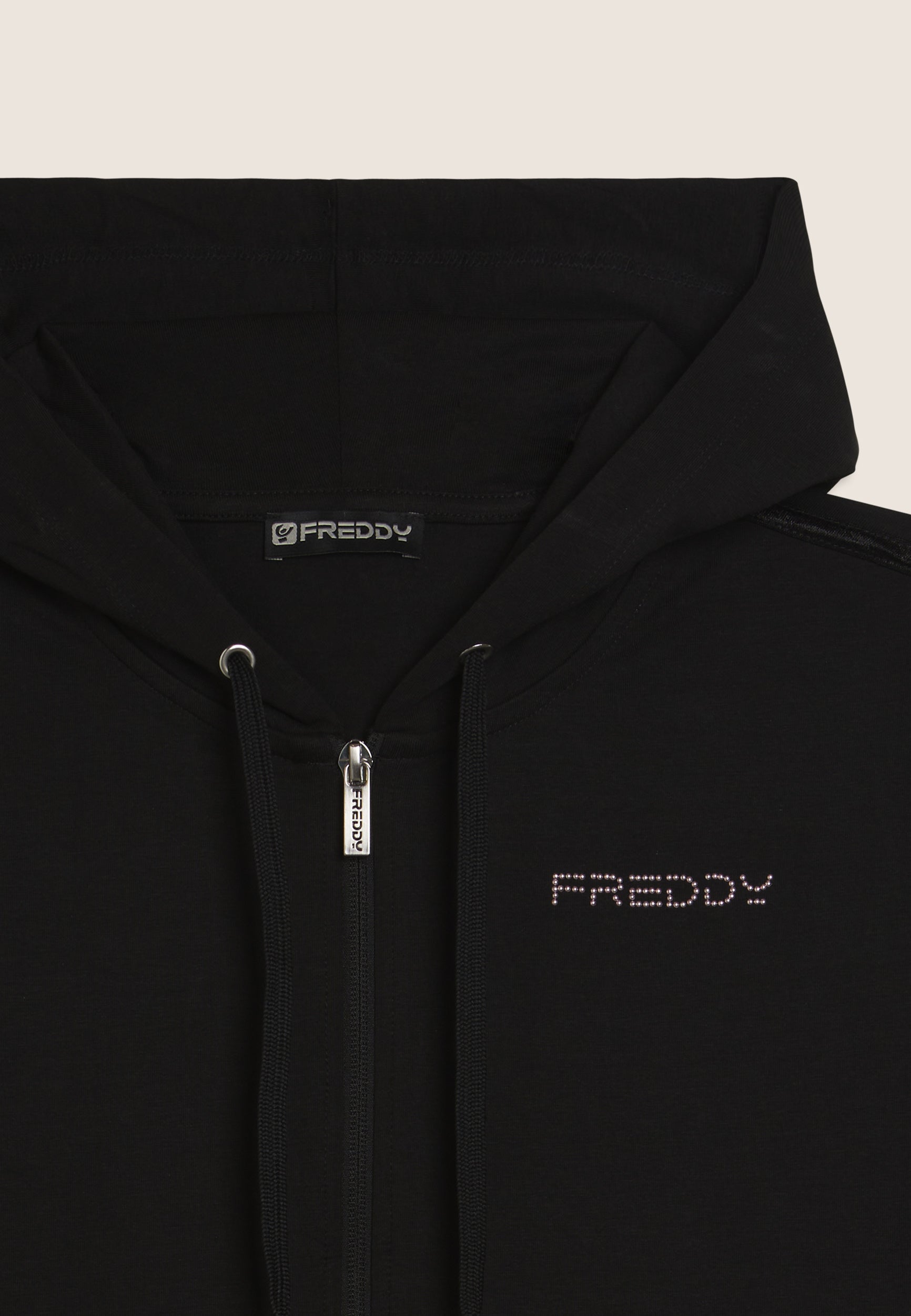 Kapuzenjacke mit gefütterter Kapuze und Reißverschluss, modernes und funktionelles Design. Die reguläre Passform und der gerippte Saum sorgen für Komfort, während die Kapuze mit Kordelzug und die langen Ärmel mit Rippbündchen praktisch sind. Das FREDDY-Logo in hellrosa Perlen auf dem Herz und die glänzenden elastischen Einsätze an den Schultern sorgen für ein elegantes Detail. Hergestellt aus schwerem Stretch-Baumwolljersey, perfekt für Freizeit und leichte Aktivitäten.