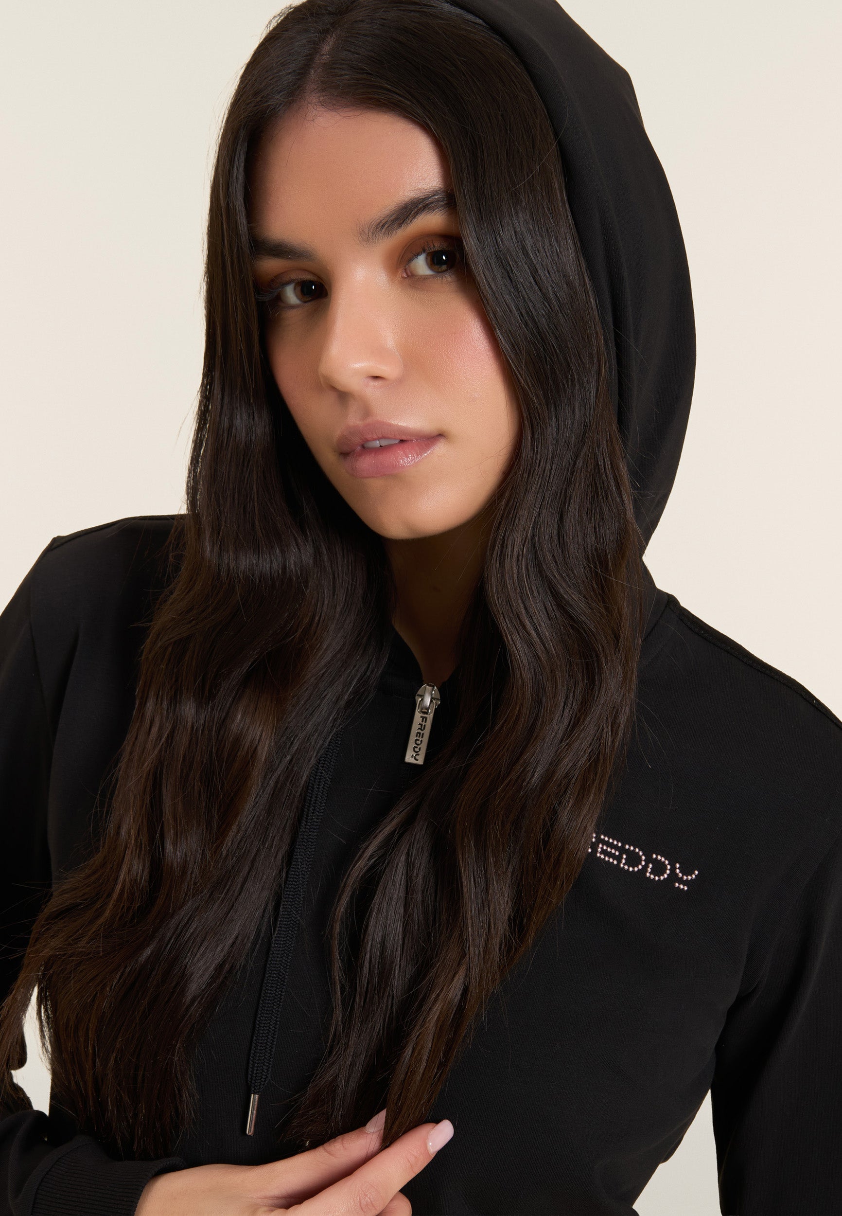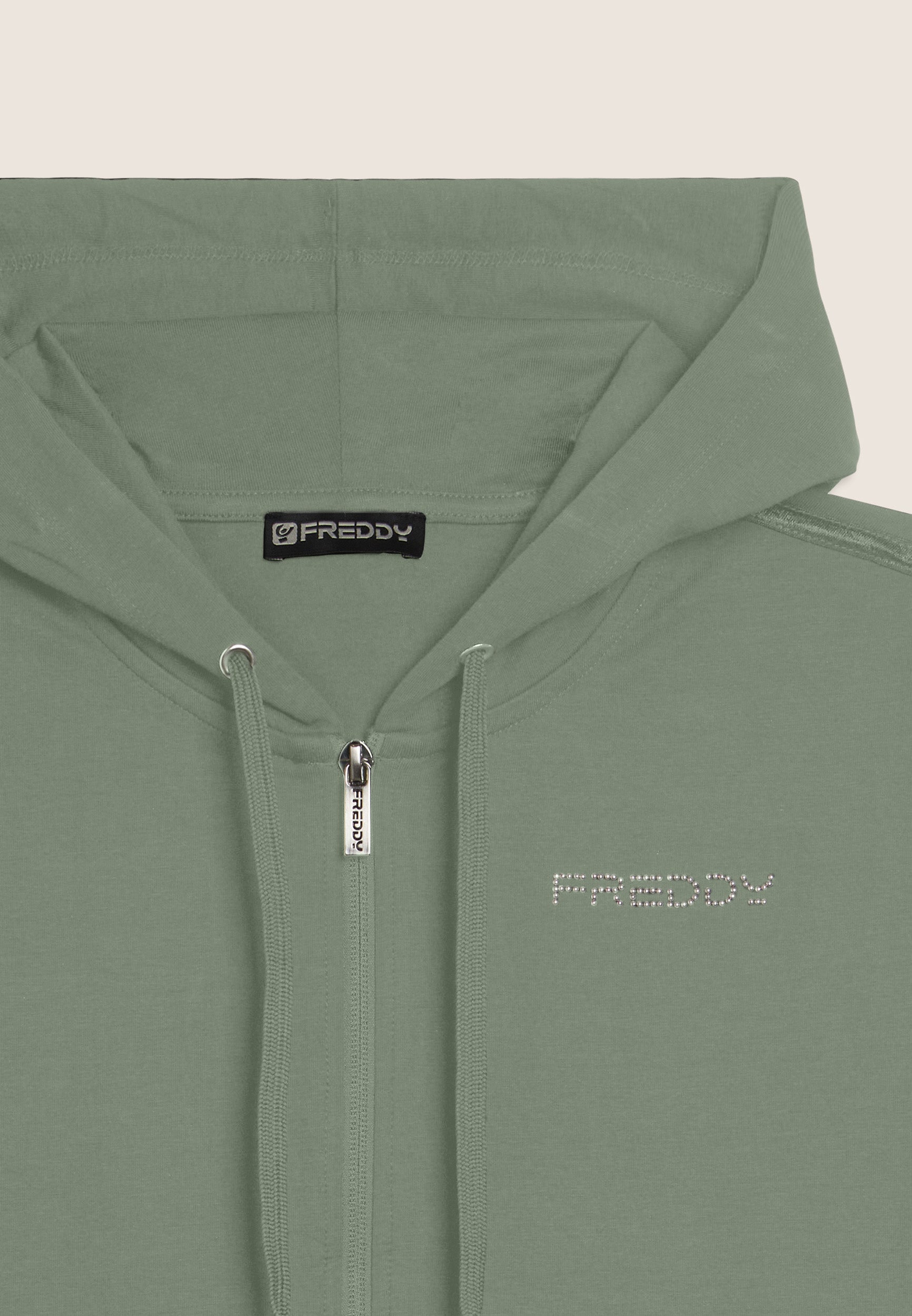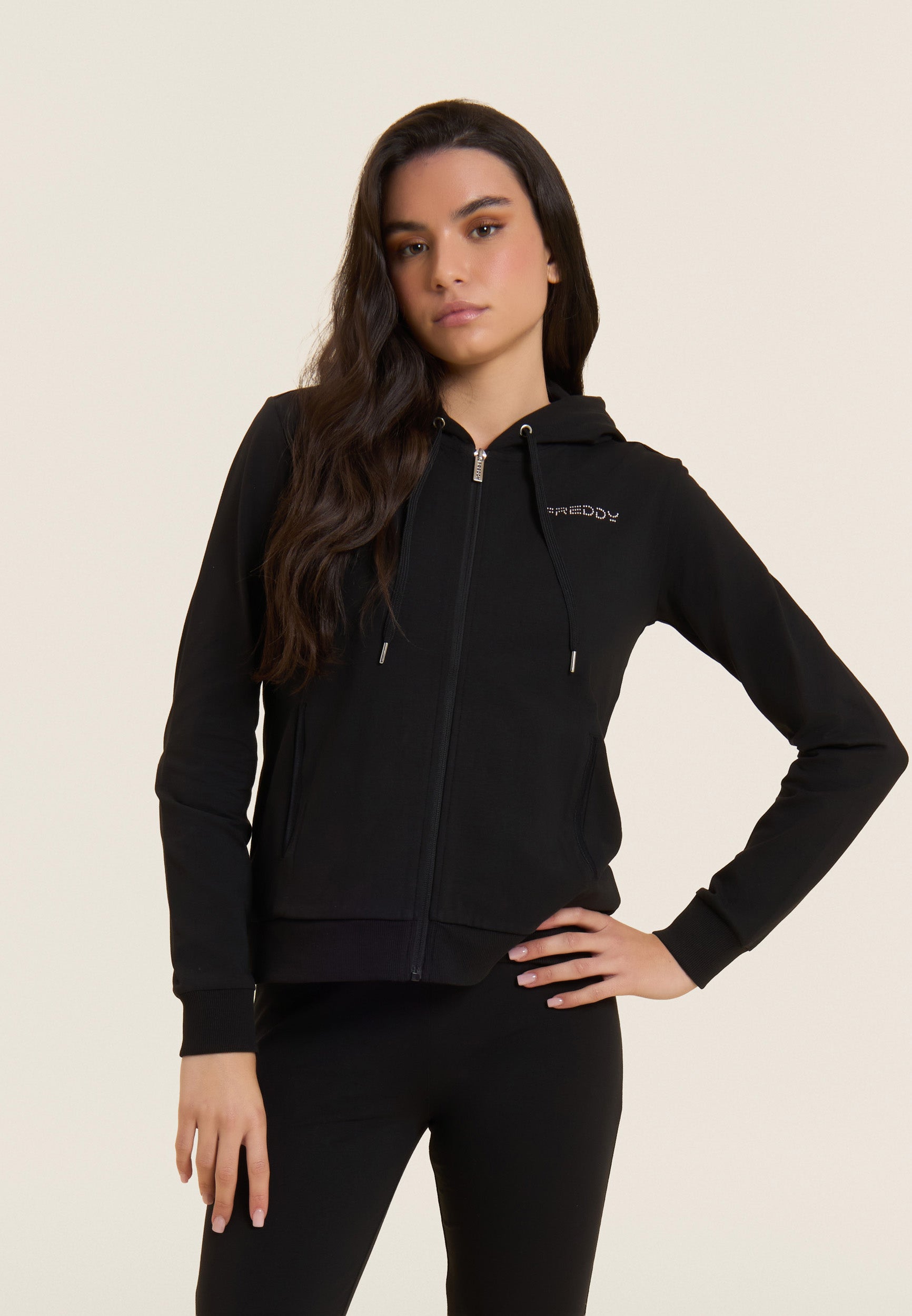 Kapuzenjacke mit gefütterter Kapuze und Reißverschluss, modernes und funktionelles Design. Die reguläre Passform und der gerippte Saum sorgen für Komfort, während die Kapuze mit Kordelzug und die langen Ärmel mit Rippbündchen praktisch sind. Das FREDDY-Logo in hellrosa Perlen auf dem Herz und die glänzenden elastischen Einsätze an den Schultern sorgen für ein elegantes Detail. Hergestellt aus schwerem Stretch-Baumwolljersey, perfekt für Freizeit und leichte Aktivitäten.