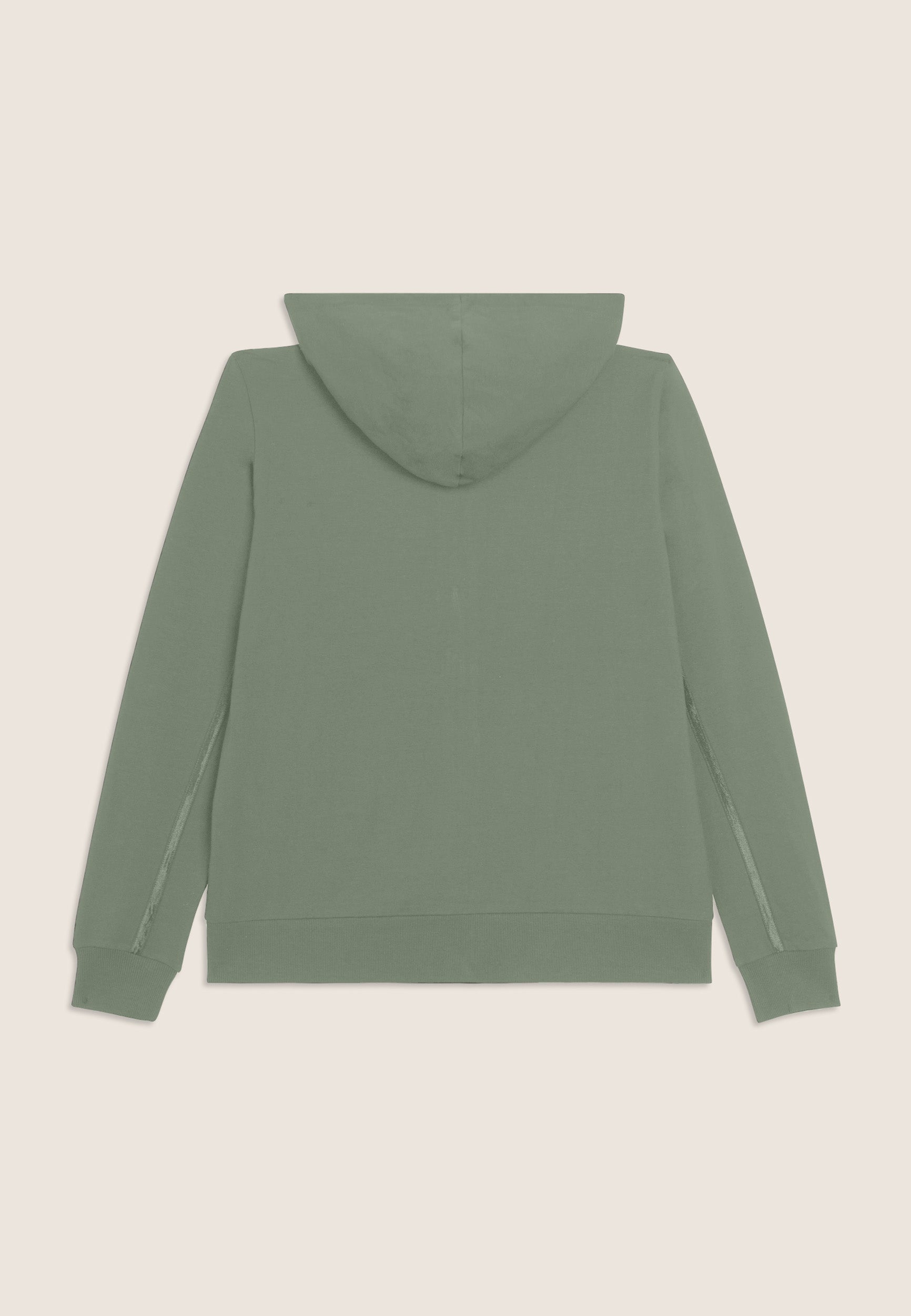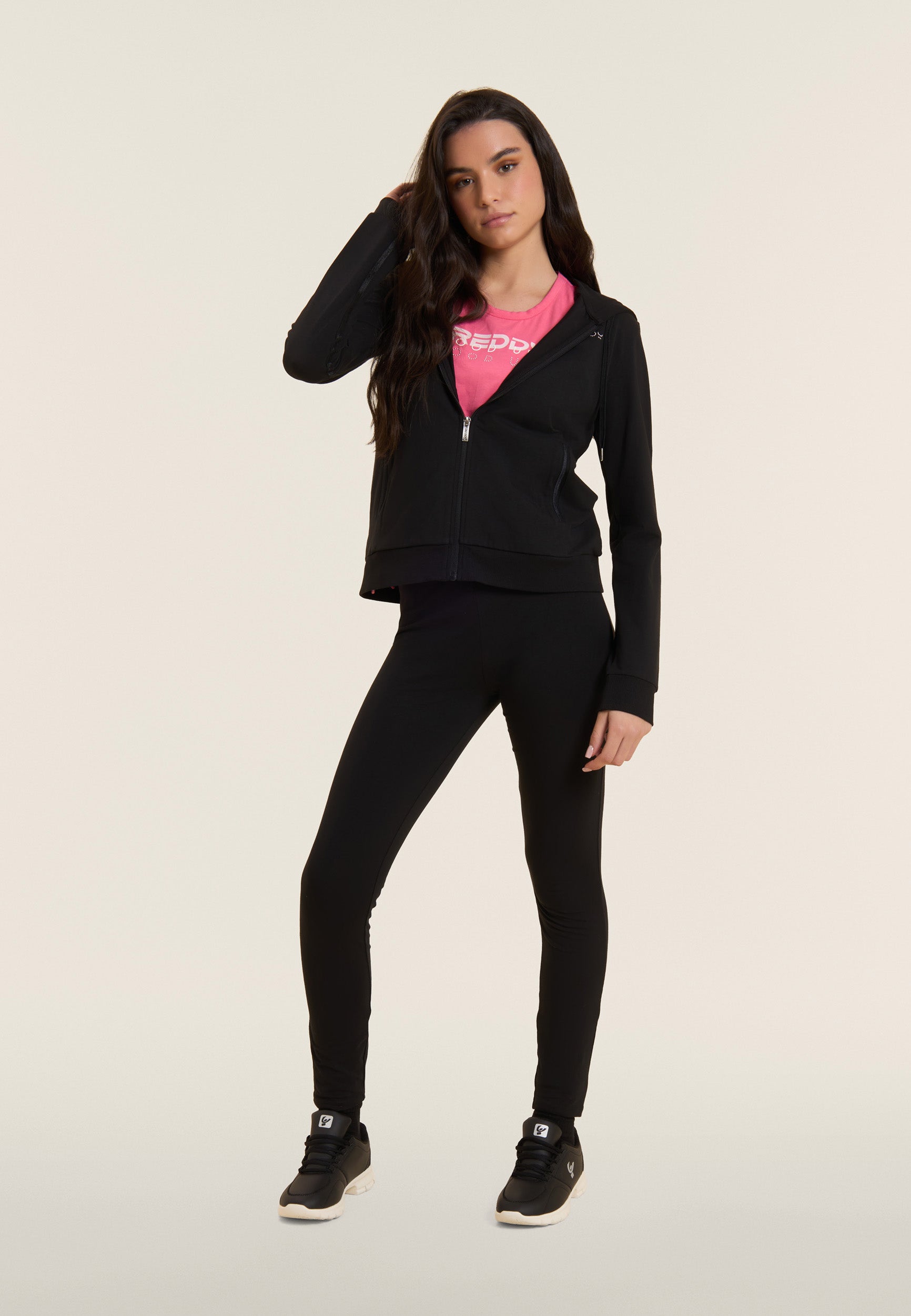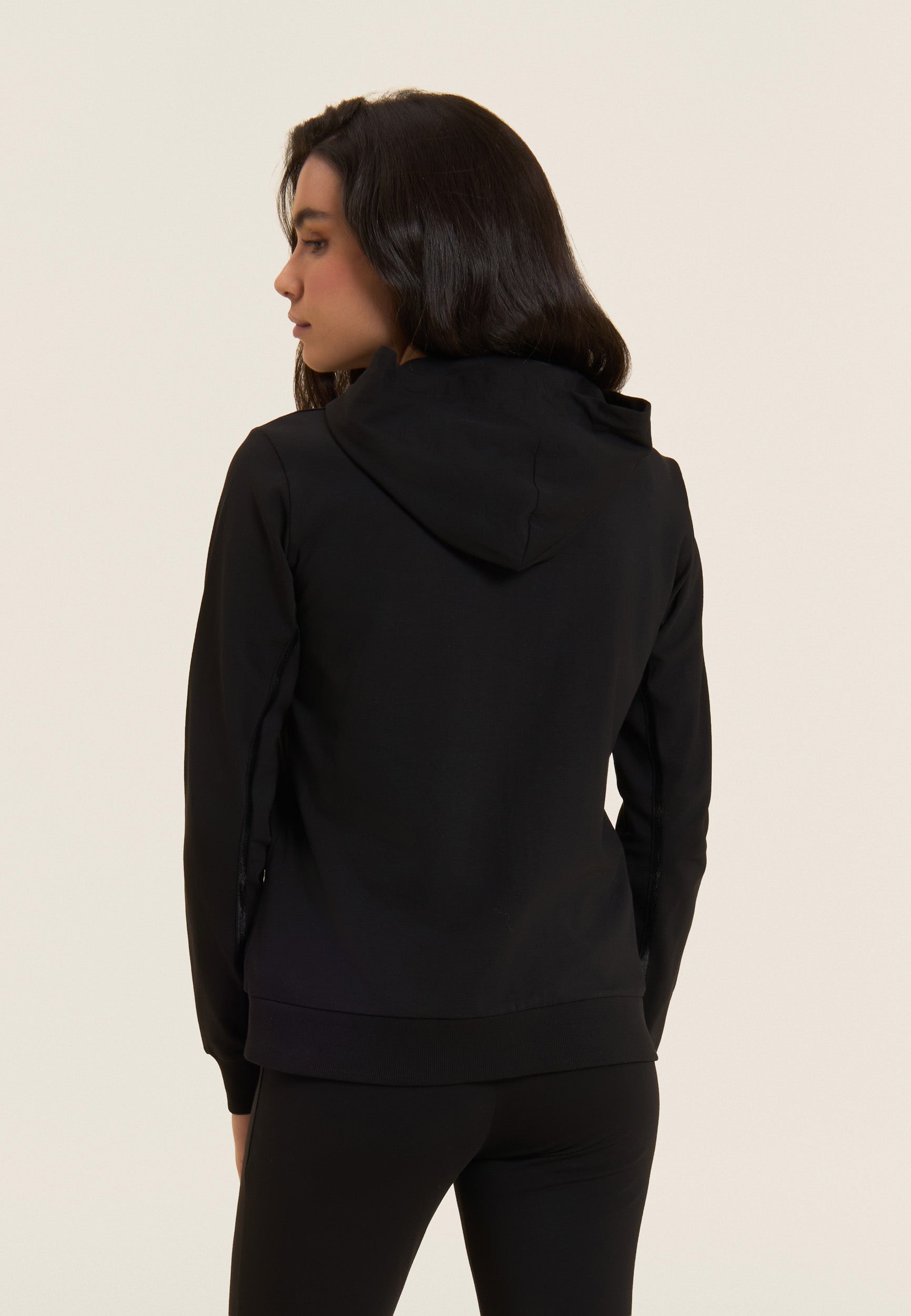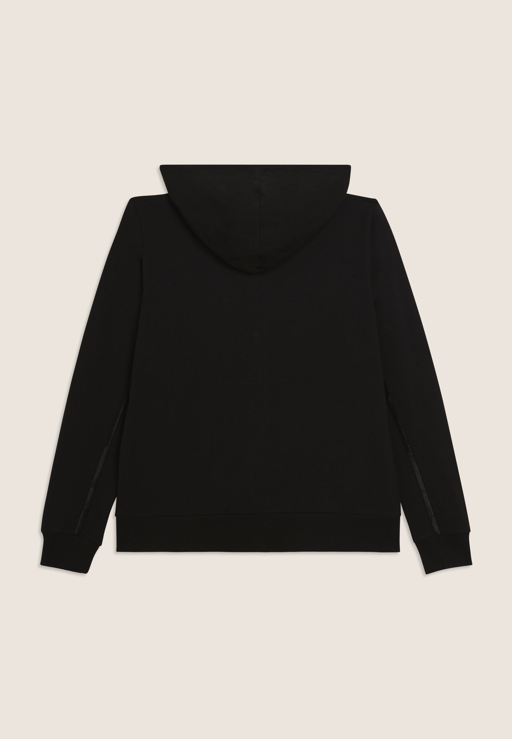 Kapuzenjacke mit gefütterter Kapuze und Reißverschluss, modernes und funktionelles Design. Die reguläre Passform und der gerippte Saum sorgen für Komfort, während die Kapuze mit Kordelzug und die langen Ärmel mit Rippbündchen praktisch sind. Das FREDDY-Logo in hellrosa Perlen auf dem Herz und die glänzenden elastischen Einsätze an den Schultern sorgen für ein elegantes Detail. Hergestellt aus schwerem Stretch-Baumwolljersey, perfekt für Freizeit und leichte Aktivitäten.