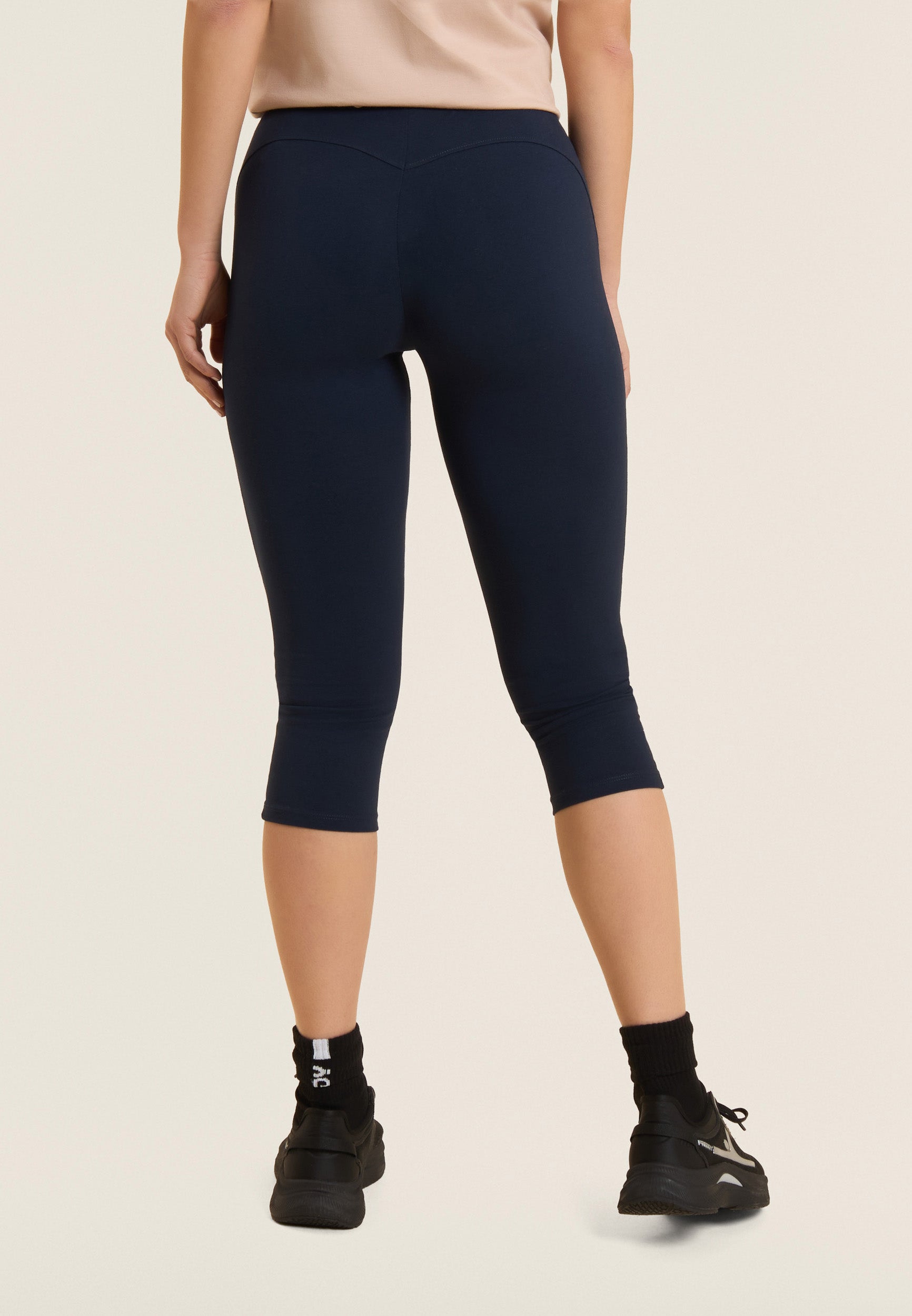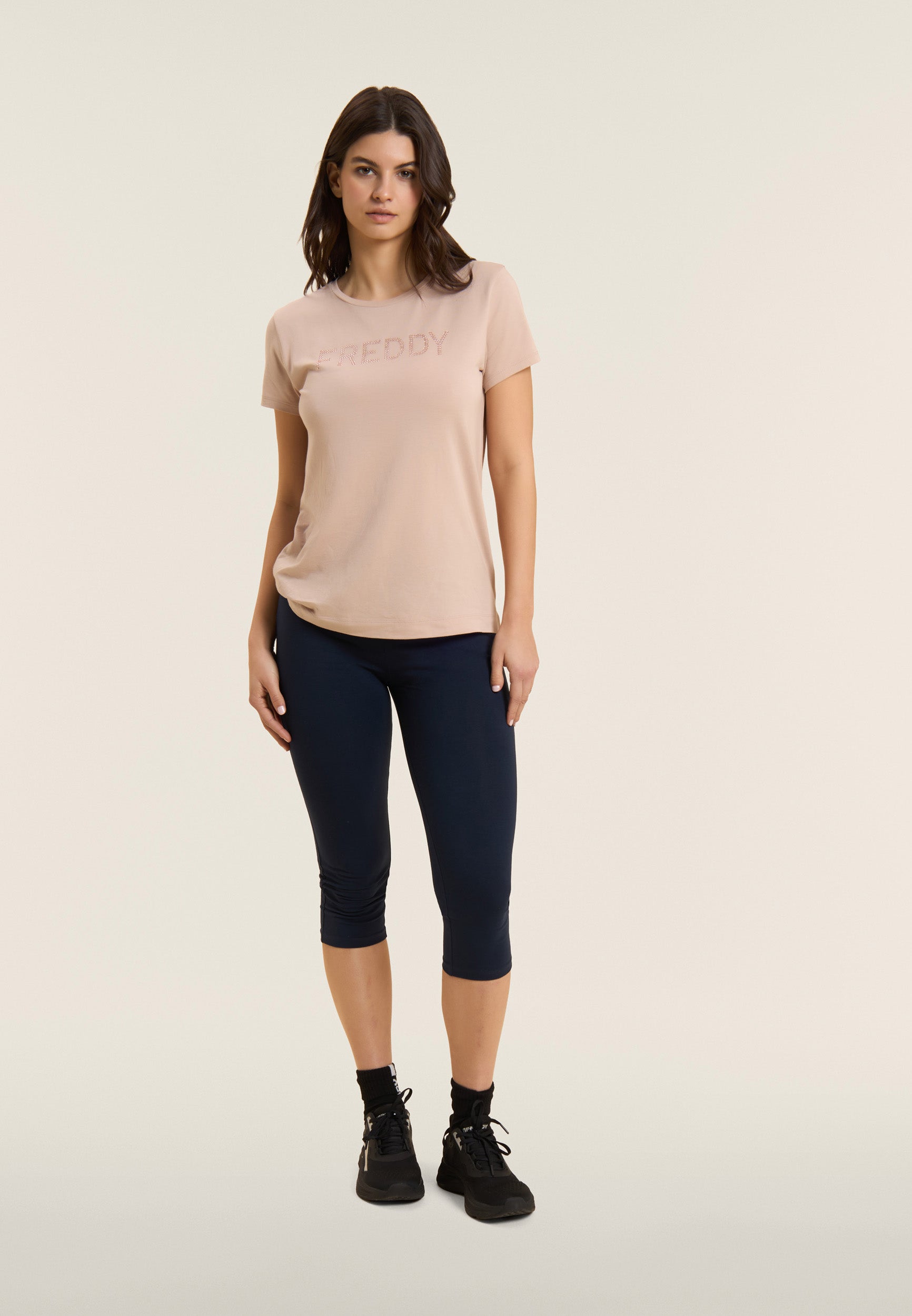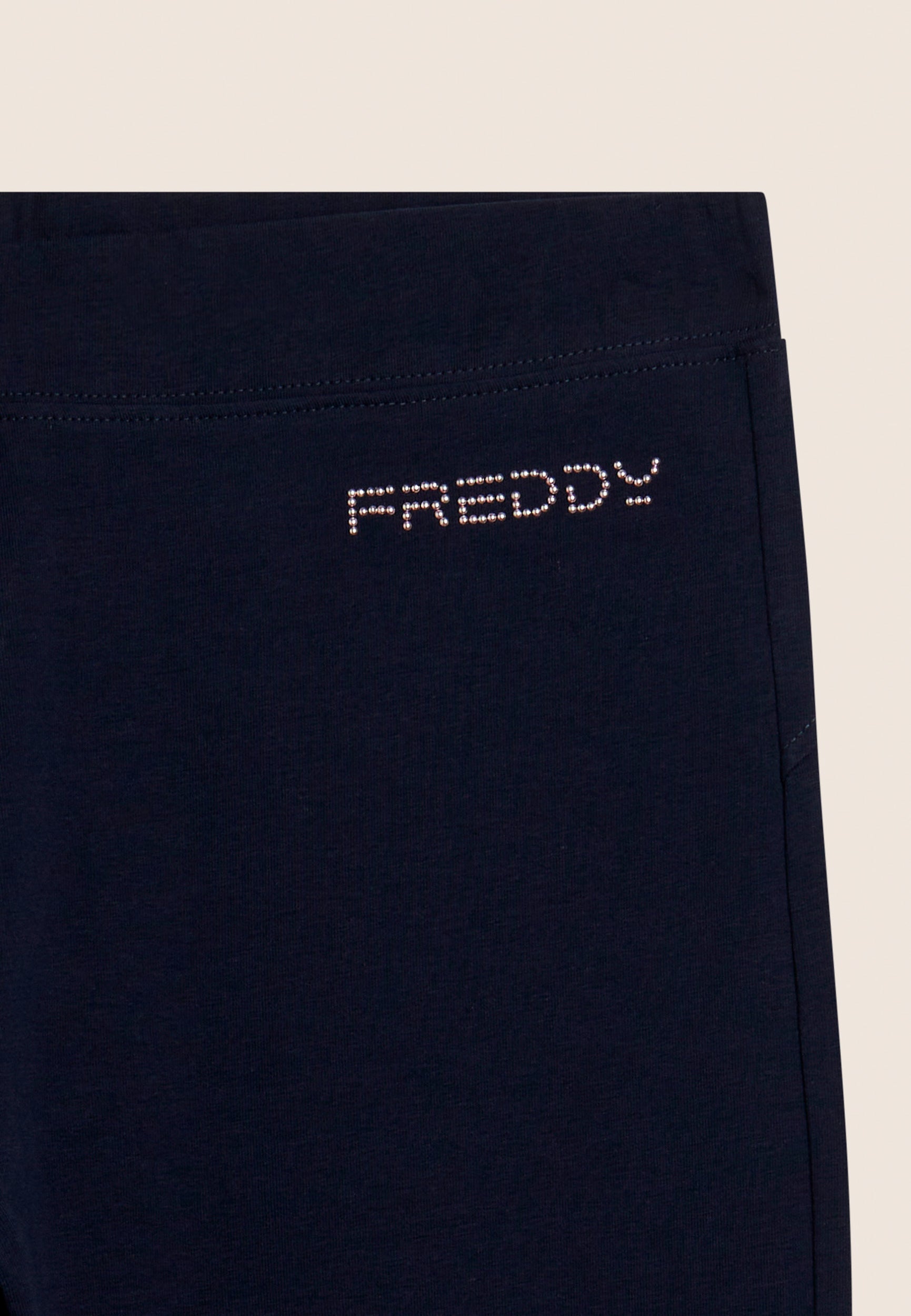 Leggings in Korsarenlänge mit schlankem Design, normalem Taillenbund und Herznähten auf der Rückenpasse für einen Hauch von Eleganz. Das FREDDY-Logo auf der linken Tasche in hellrosa Perlen macht den Look komplett. Sie sind aus schwerem Stretch-Baumwolljersey gefertigt und eignen sich ideal für leichte Aktivitäten und für einen lässigen, aber raffinierten Look.