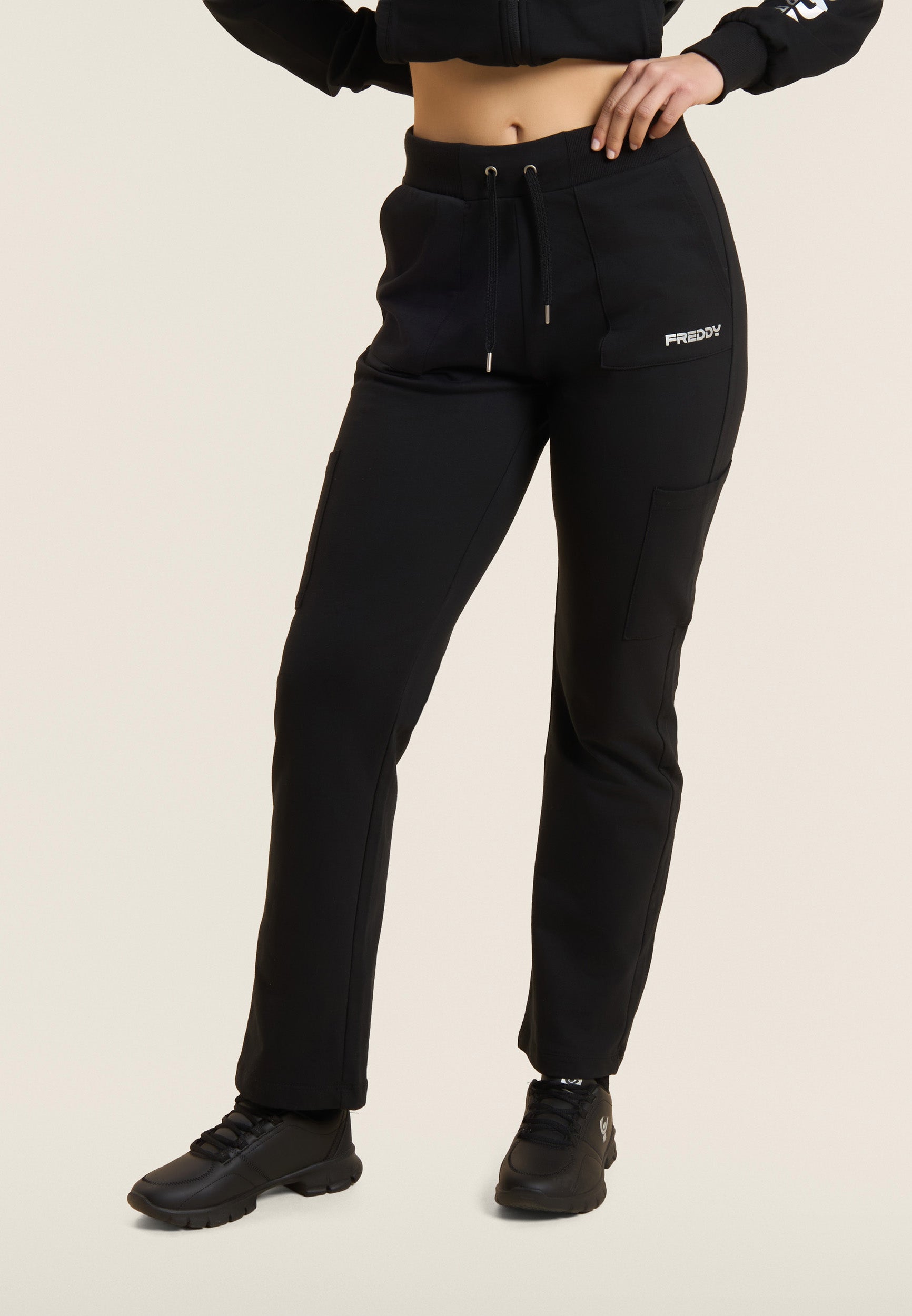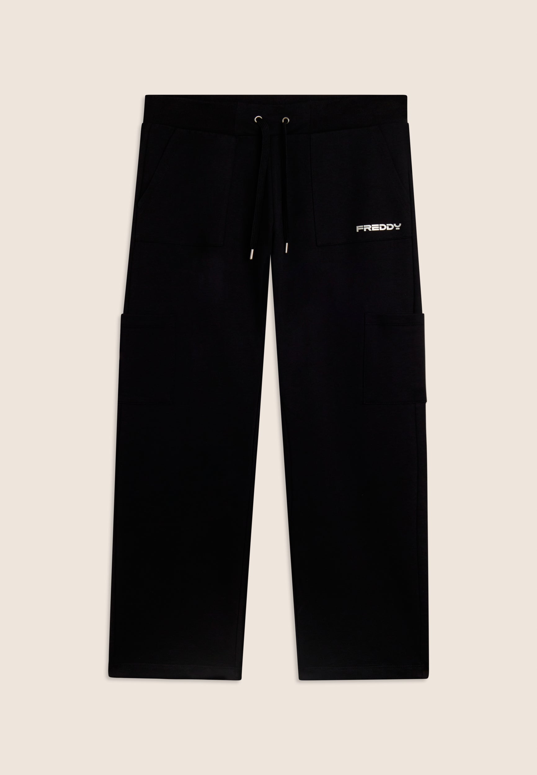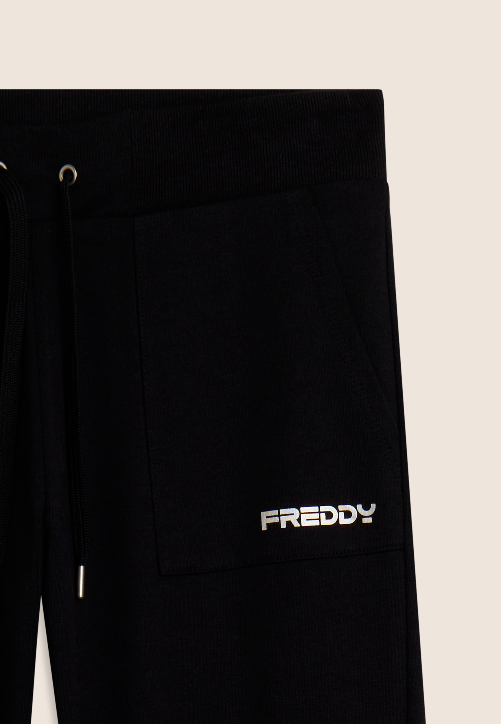Sporthose aus schwerem Baumwoll-Stretch-Jersey, die bei alltäglichen Aktivitäten für Komfort und Funktionalität sorgt. Das Modell hat eine normale Passform und Länge, mit einem normalen Taillenbund, die mit einem gerippten Bund mit verstellbarem Kordelzug abgeschlossen ist. Das Bein ist gerade und hat ein reguläres Beinende für eine natürliche Passform. Aufgesetzte Taschen auf der Hüfte und entlang des Beins sorgen für Funktionalität und einen praktischen Touch, während das kleine FREDDY-Logo mit Perlenbesatz auf der linken Tasche den Look mit diskreter Eleganz abrundet.