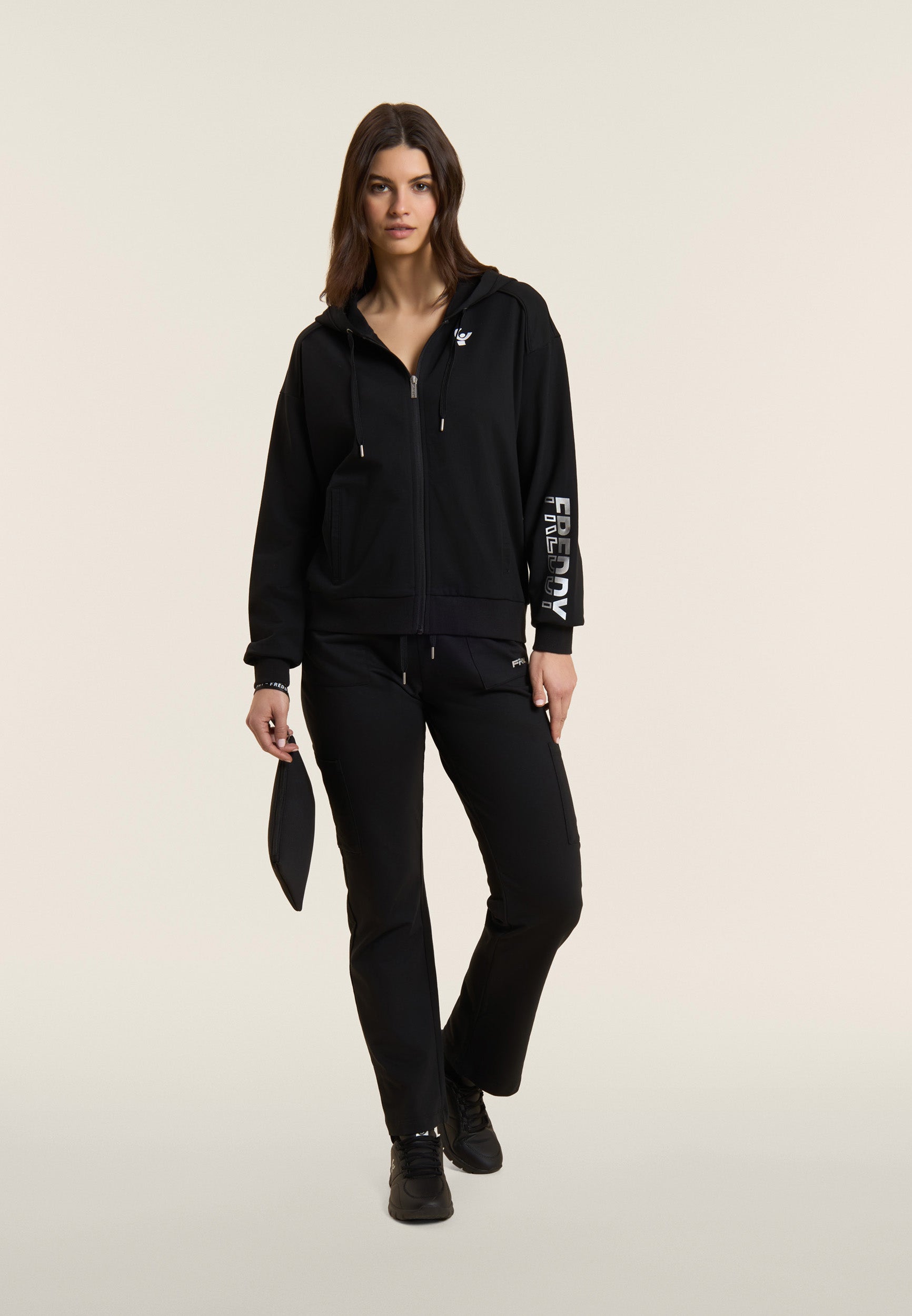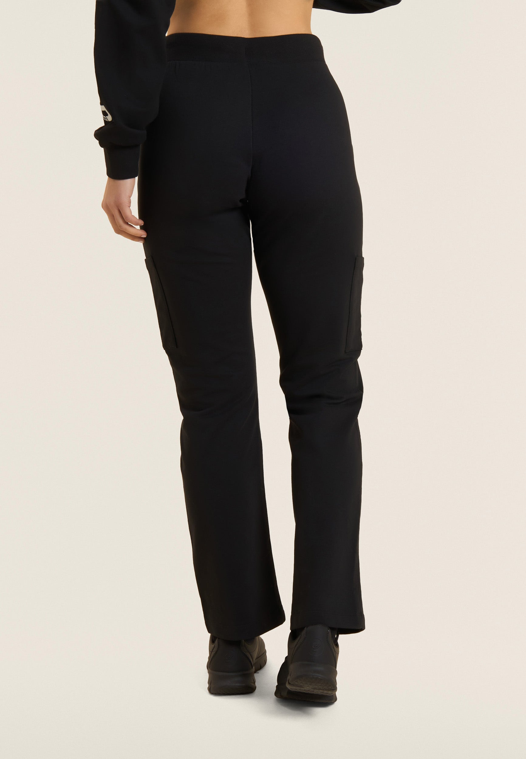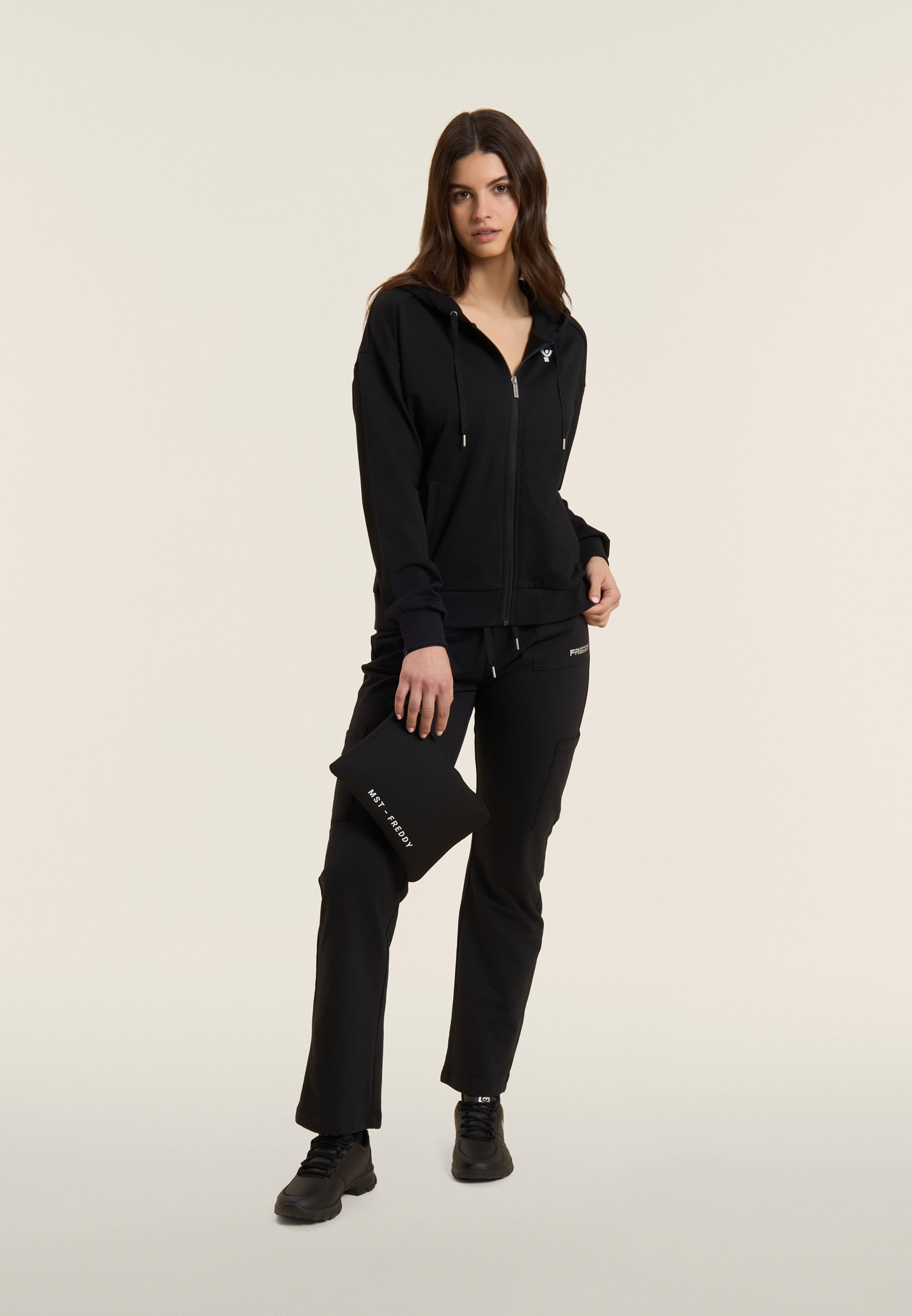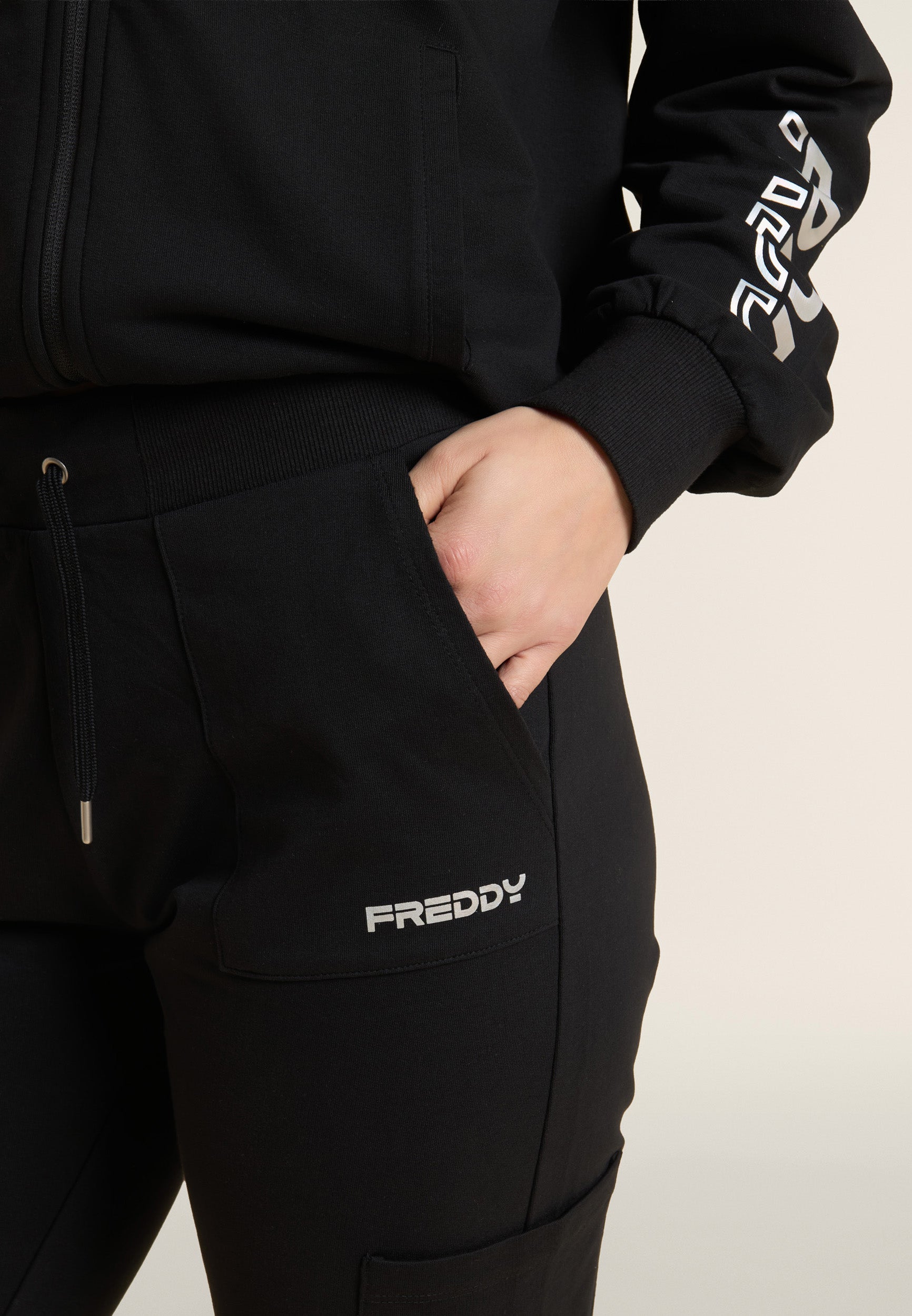 Sporthose aus schwerem Baumwoll-Stretch-Jersey, die bei alltäglichen Aktivitäten für Komfort und Funktionalität sorgt. Das Modell hat eine normale Passform und Länge, mit einem normalen Taillenbund, die mit einem gerippten Bund mit verstellbarem Kordelzug abgeschlossen ist. Das Bein ist gerade und hat ein reguläres Beinende für eine natürliche Passform. Aufgesetzte Taschen auf der Hüfte und entlang des Beins sorgen für Funktionalität und einen praktischen Touch, während das kleine FREDDY-Logo mit Perlenbesatz auf der linken Tasche den Look mit diskreter Eleganz abrundet.