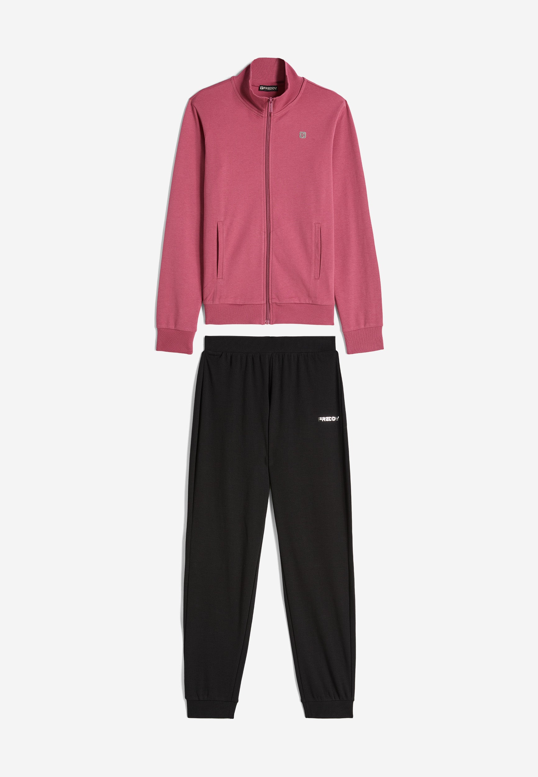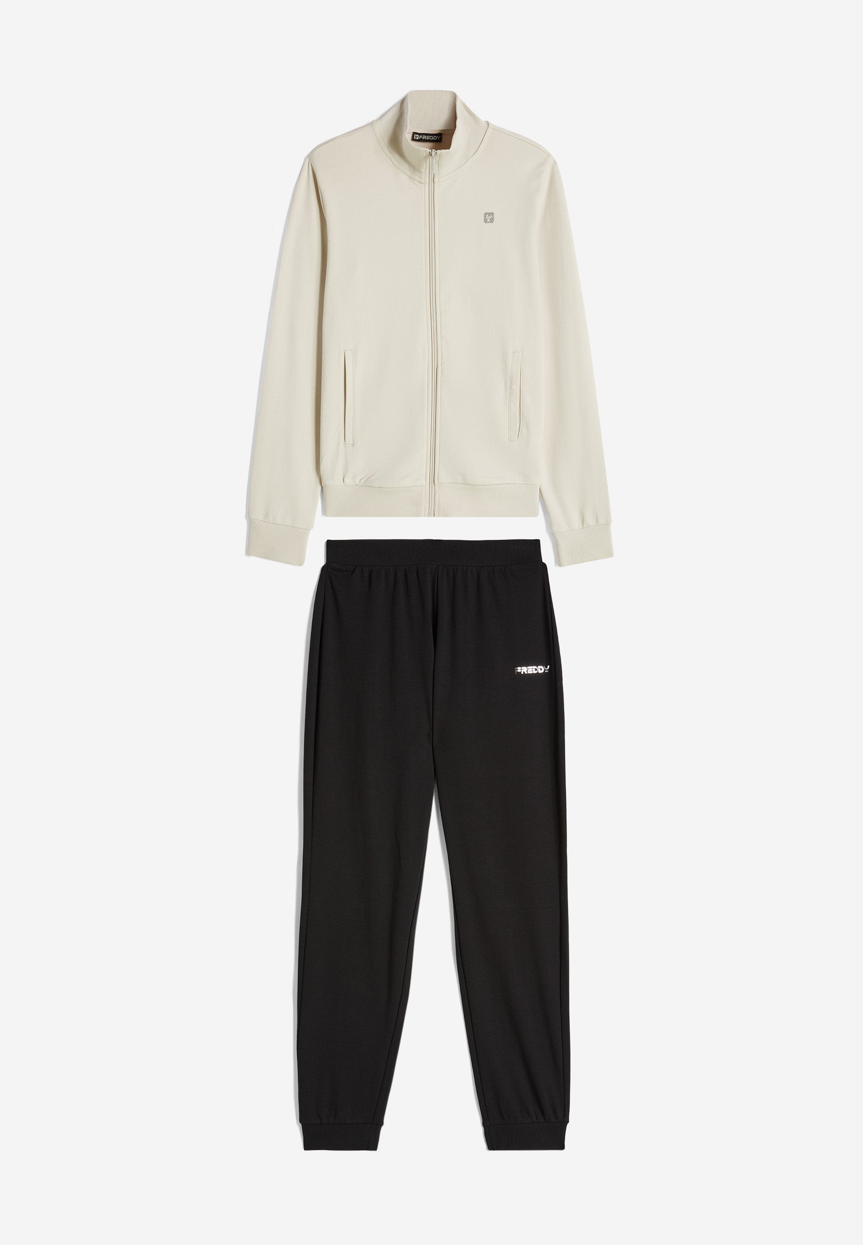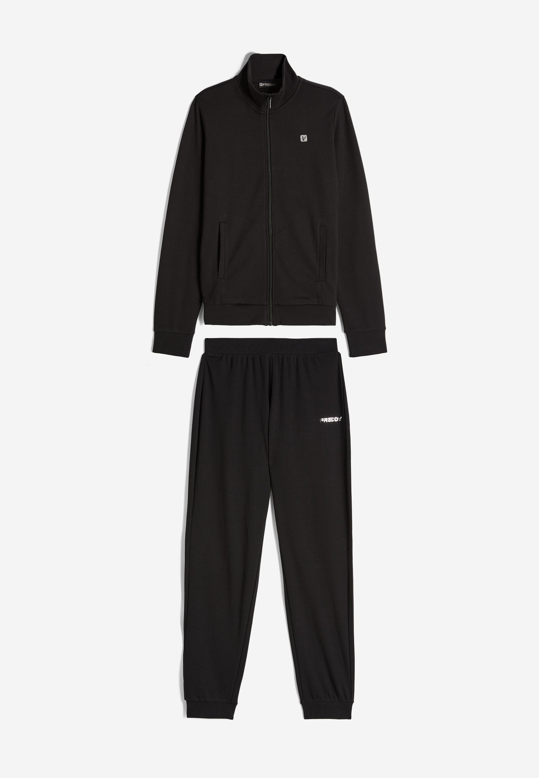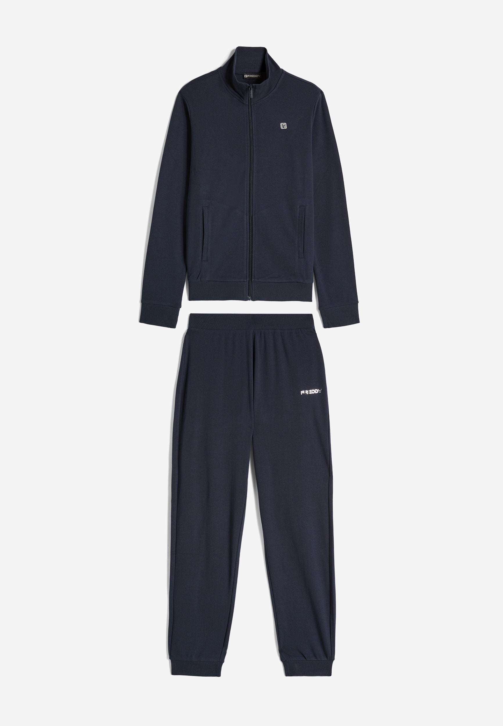 Trainingsanzug aus Interlock-Baumwolle mit regulärer Passform und einer Verarbeitung, die den Stoff weich, kompakt und flexibel macht und beim Tragen für mehr Komfort und Bewegungsfreiheit bei beiden Teilen des Anzugs sorgt. Die Sweatjacke hat einen hohen, gerippten Kragen, einen durchgehenden Reißverschluss, paspelierte Leistentaschen sowie gerippte Bündchen an Ärmeln und Saum. Die Hose hat Innentaschen, eine Ripptaille, einen Rippsaum und Rippbündchen. Sweatshirt und Hose haben ein kleines Freddy-Logo auf der linken Vorderseite und an der Seite unter der Tasche.