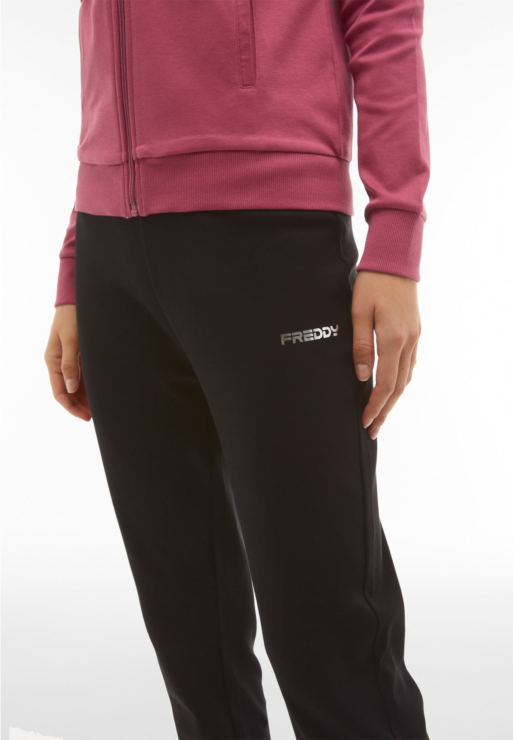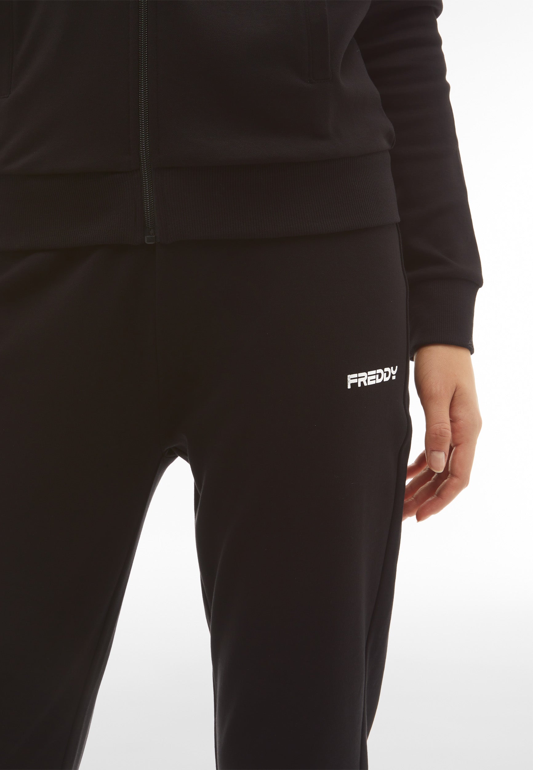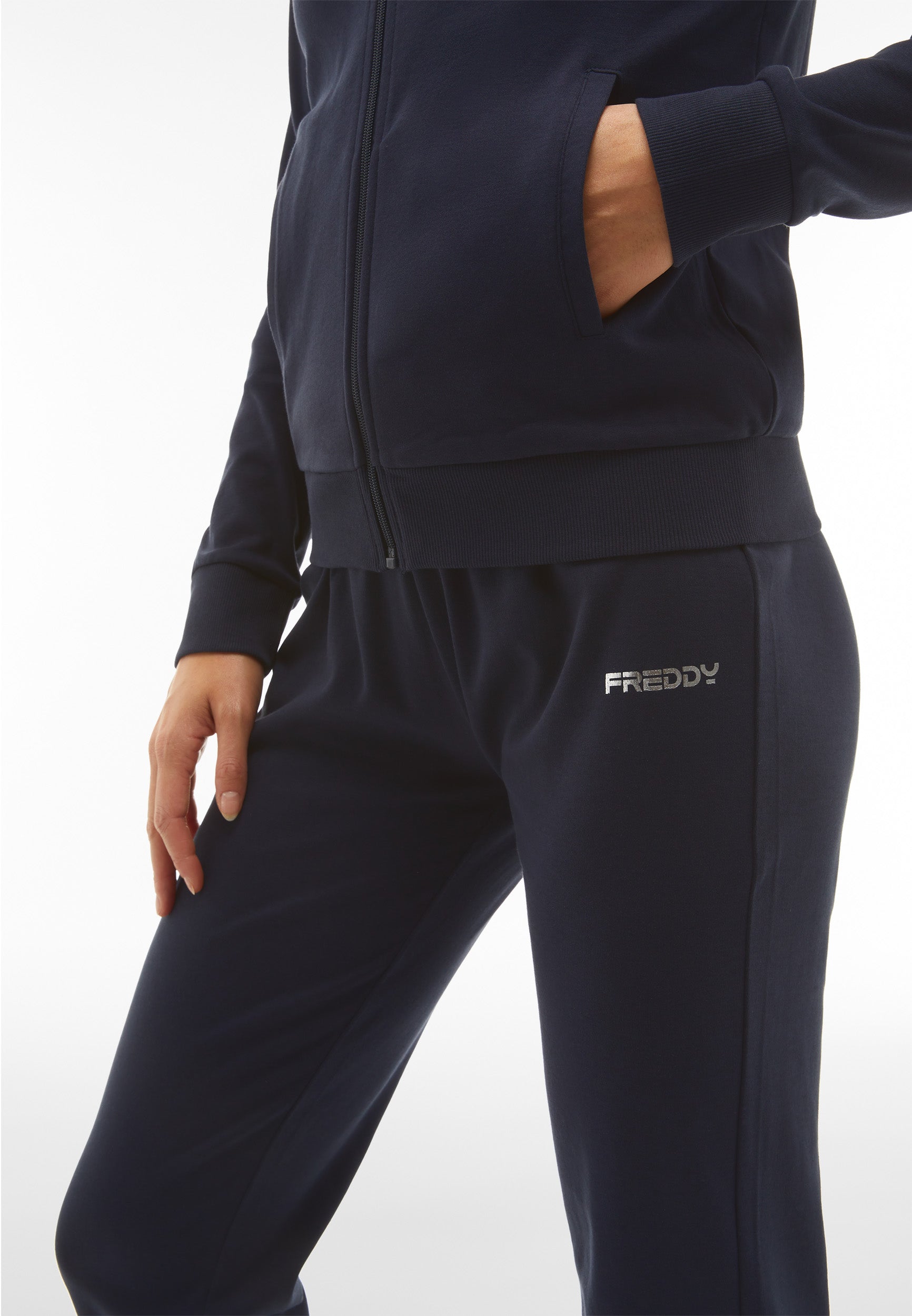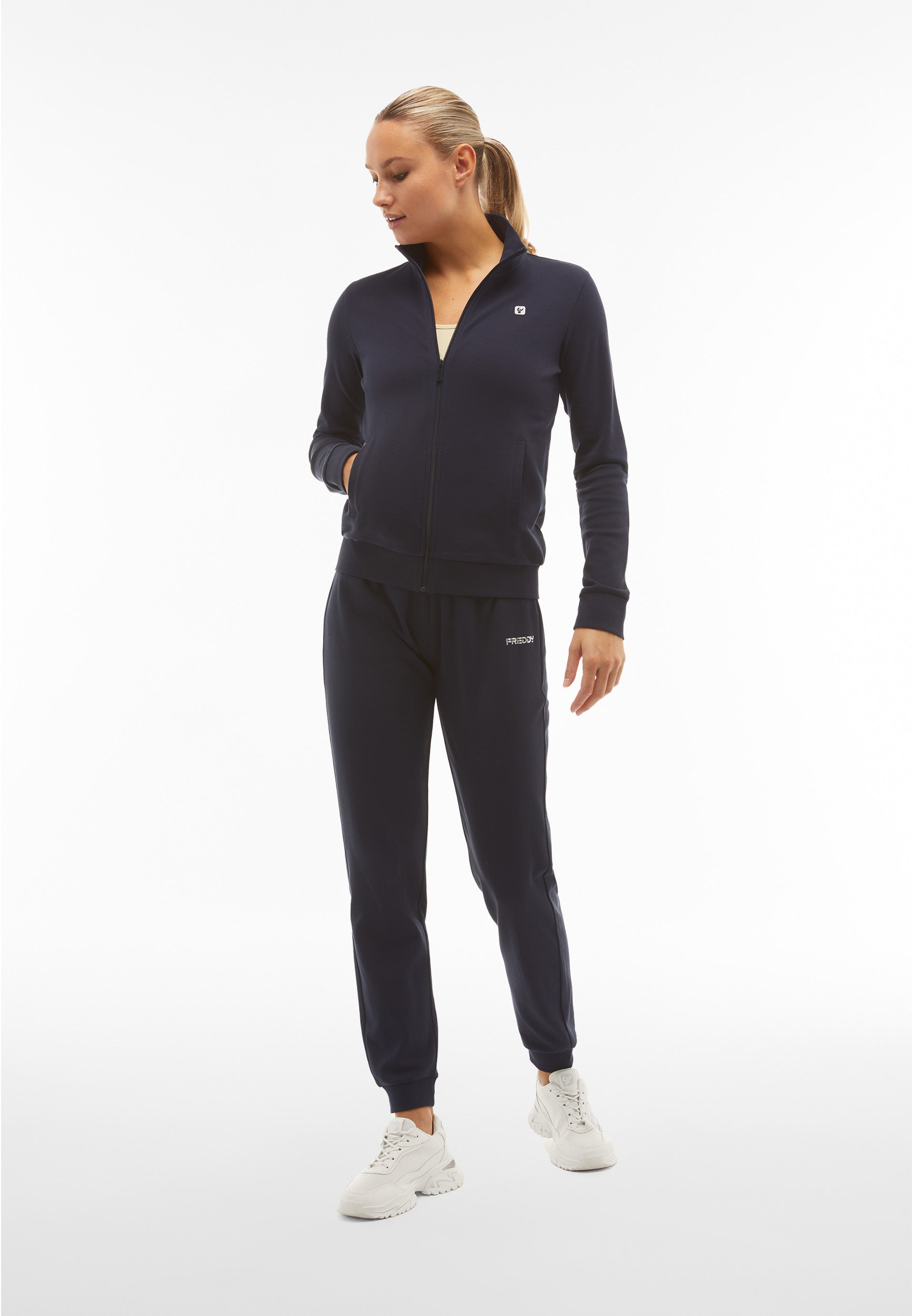 Trainingsanzug aus Interlock-Baumwolle mit regulärer Passform und einer Verarbeitung, die den Stoff weich, kompakt und flexibel macht und beim Tragen für mehr Komfort und Bewegungsfreiheit bei beiden Teilen des Anzugs sorgt. Die Sweatjacke hat einen hohen, gerippten Kragen, einen durchgehenden Reißverschluss, paspelierte Leistentaschen sowie gerippte Bündchen an Ärmeln und Saum. Die Hose hat Innentaschen, eine Ripptaille, einen Rippsaum und Rippbündchen. Sweatshirt und Hose haben ein kleines Freddy-Logo auf der linken Vorderseite und an der Seite unter der Tasche.