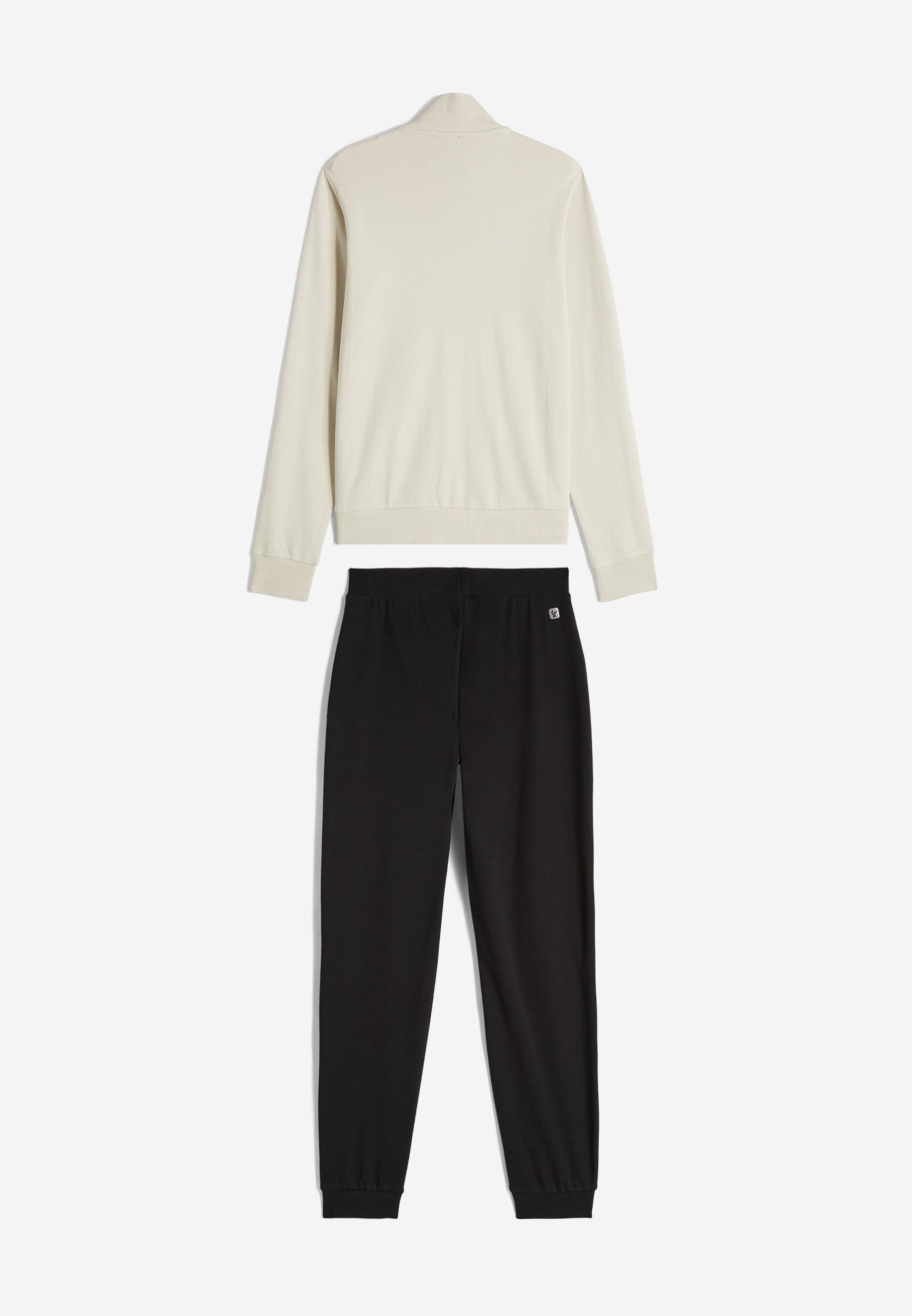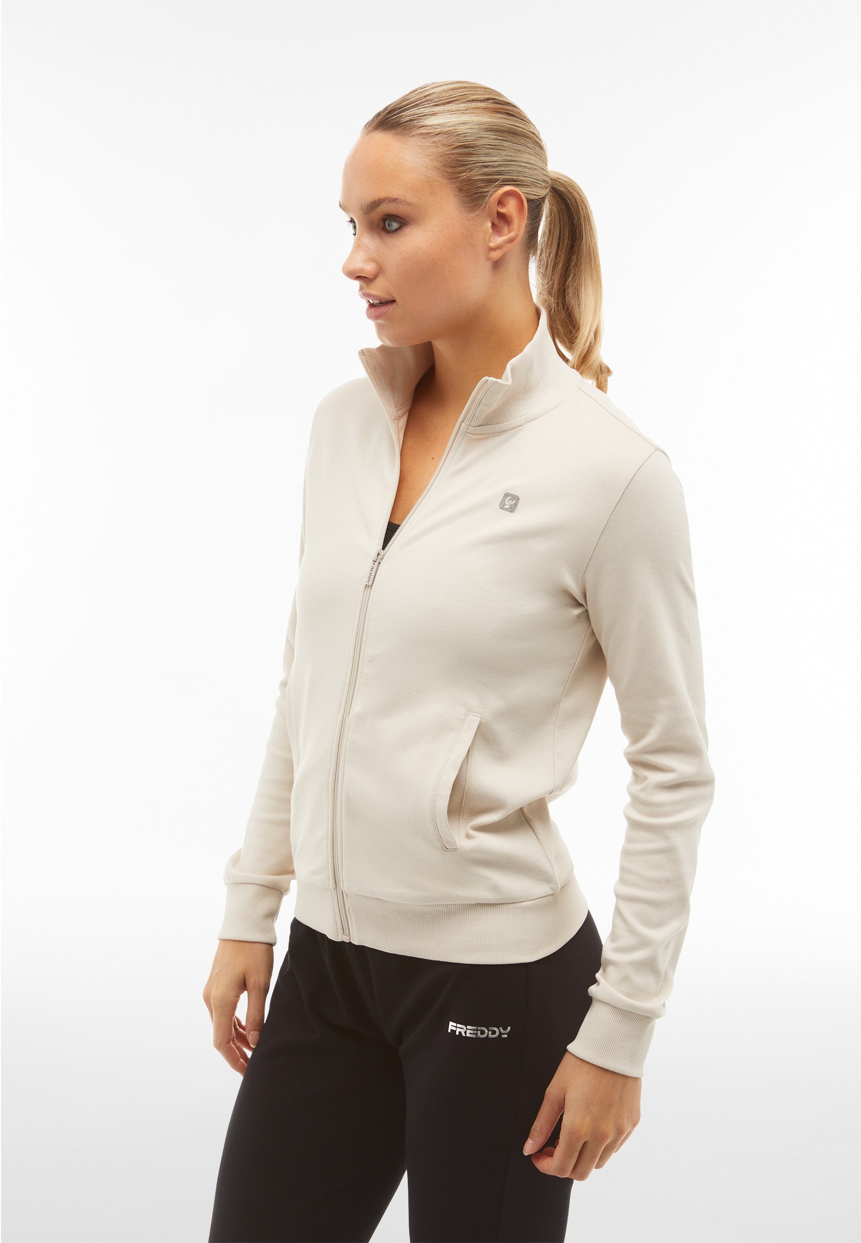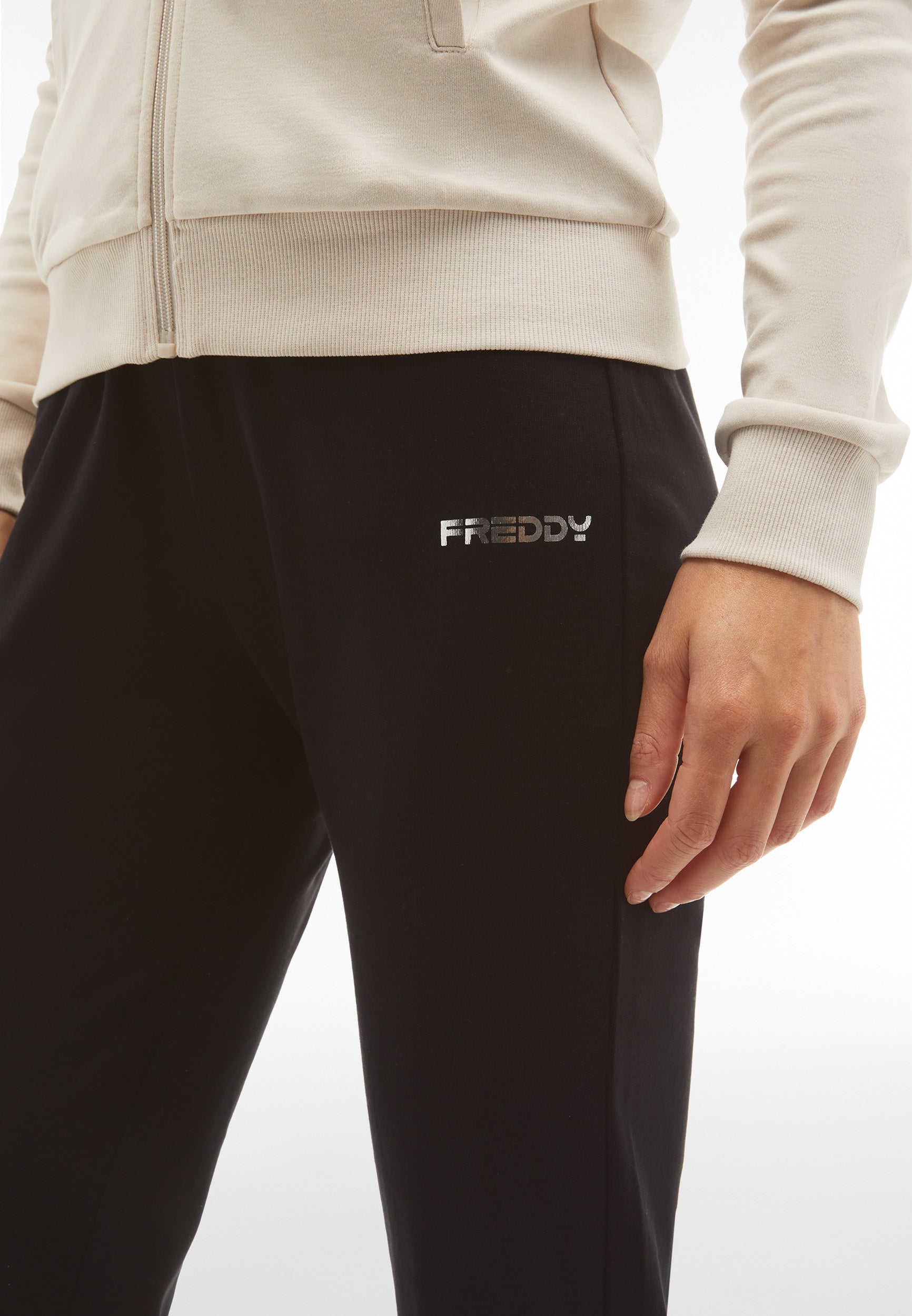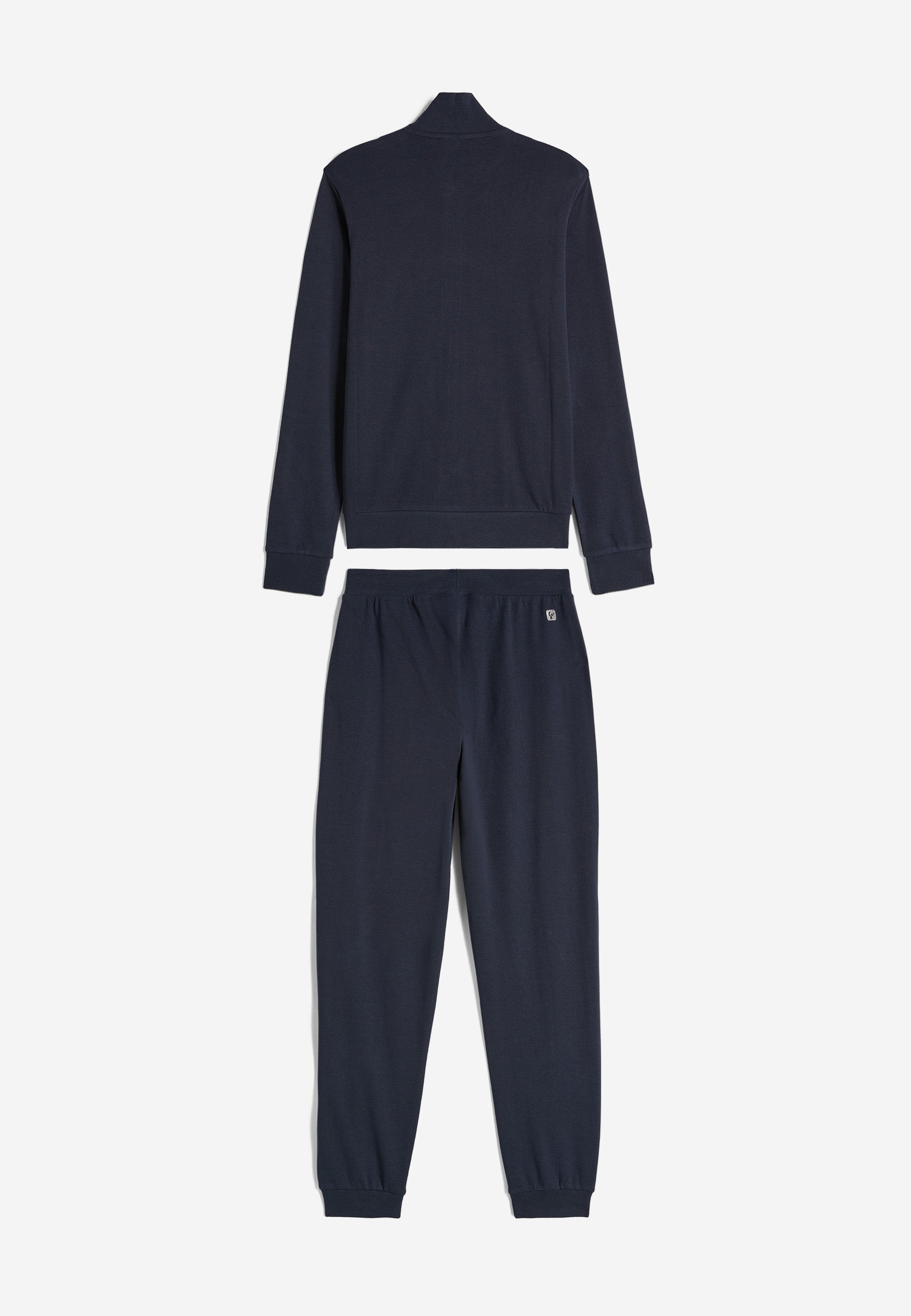 Trainingsanzug aus Interlock-Baumwolle mit regulärer Passform und einer Verarbeitung, die den Stoff weich, kompakt und flexibel macht und beim Tragen für mehr Komfort und Bewegungsfreiheit bei beiden Teilen des Anzugs sorgt. Die Sweatjacke hat einen hohen, gerippten Kragen, einen durchgehenden Reißverschluss, paspelierte Leistentaschen sowie gerippte Bündchen an Ärmeln und Saum. Die Hose hat Innentaschen, eine Ripptaille, einen Rippsaum und Rippbündchen. Sweatshirt und Hose haben ein kleines Freddy-Logo auf der linken Vorderseite und an der Seite unter der Tasche.