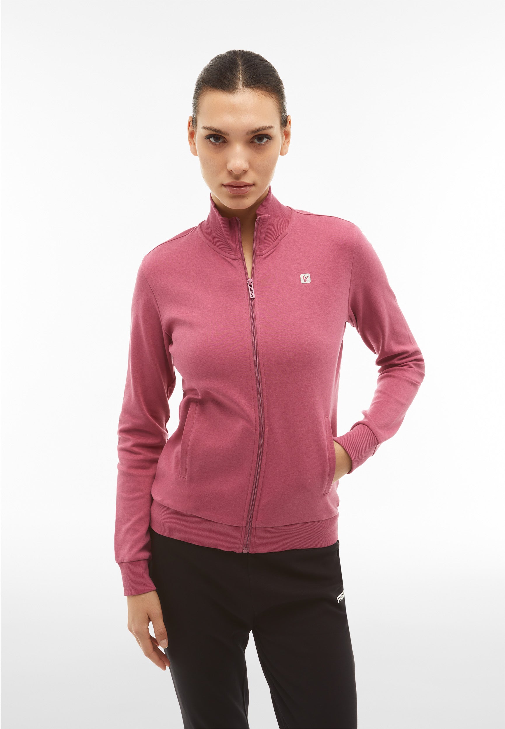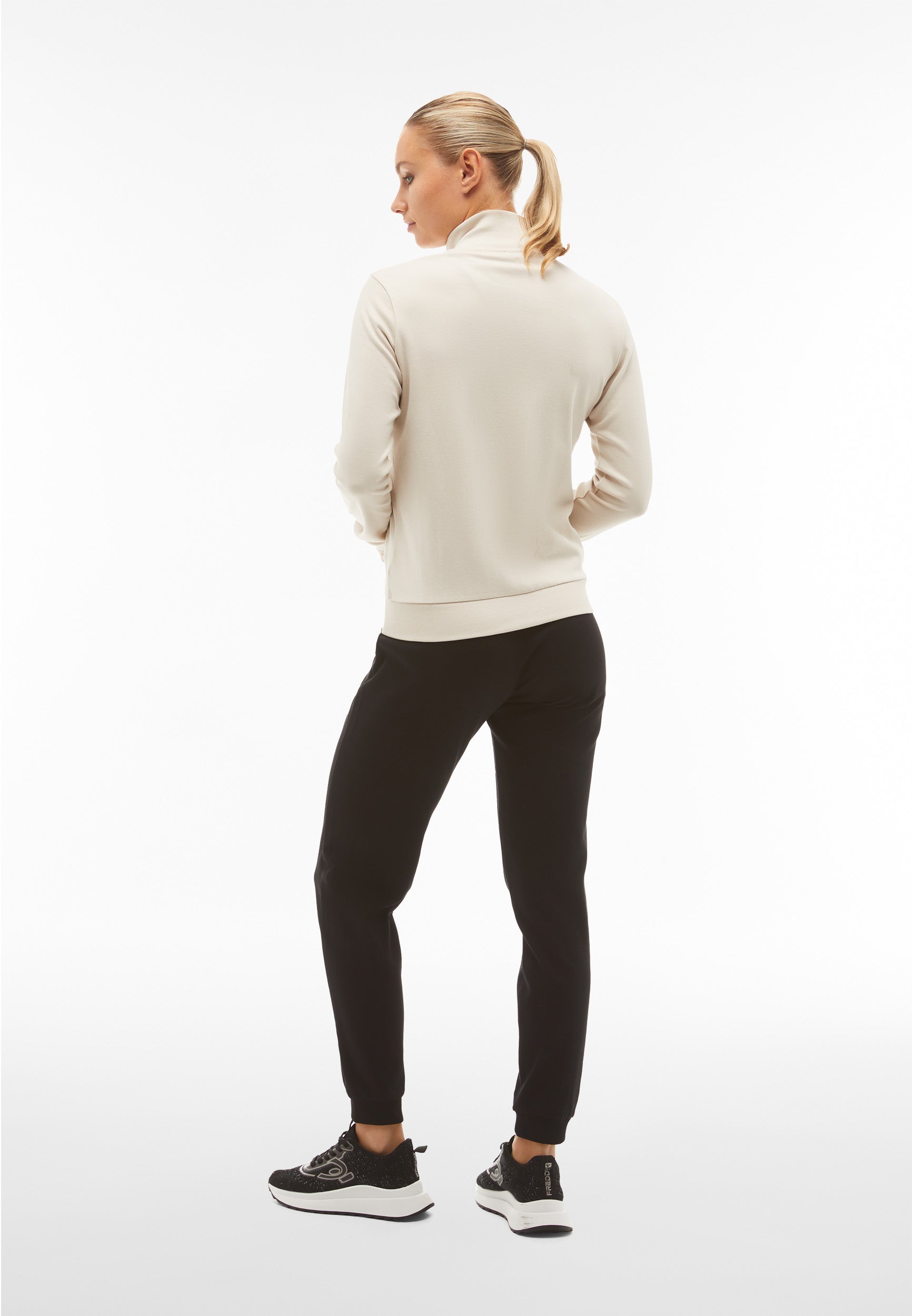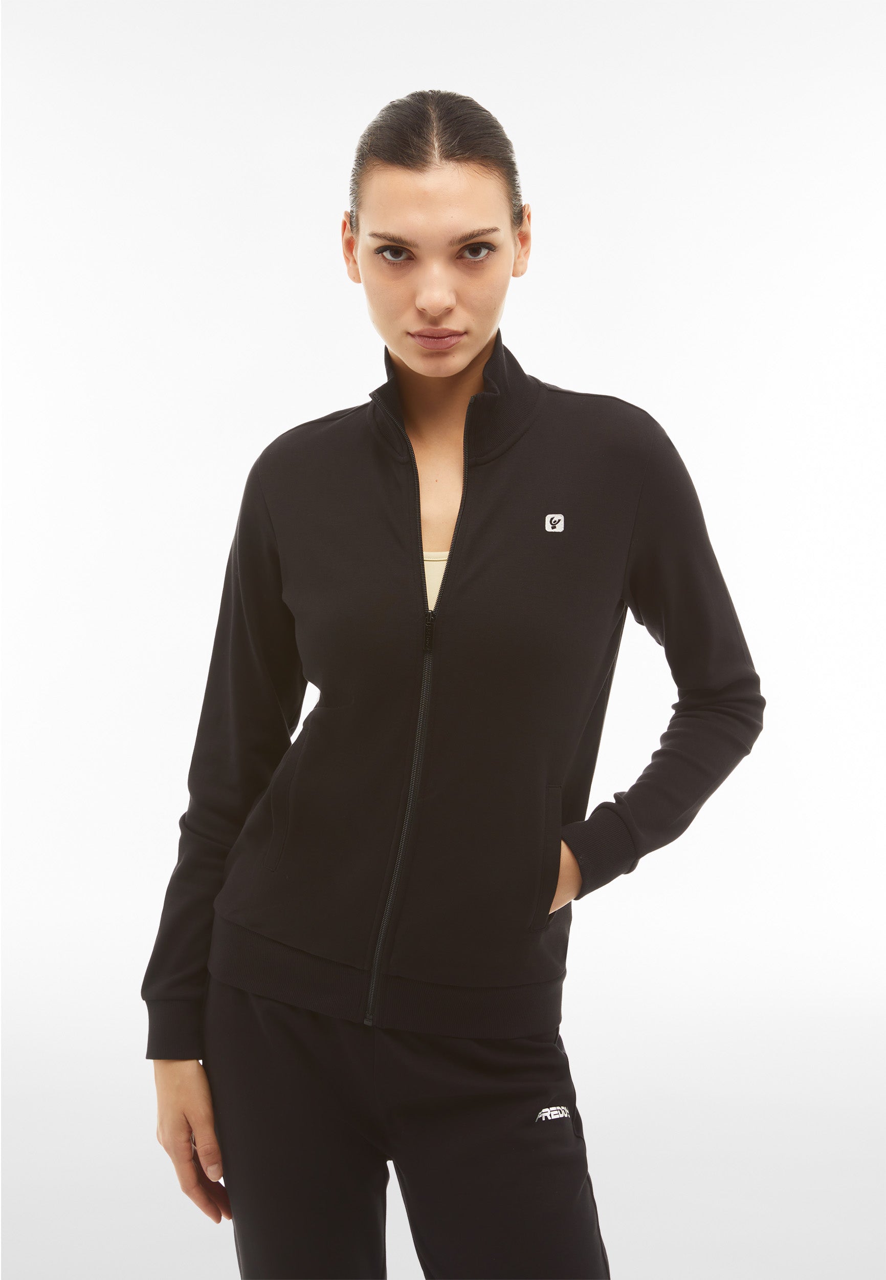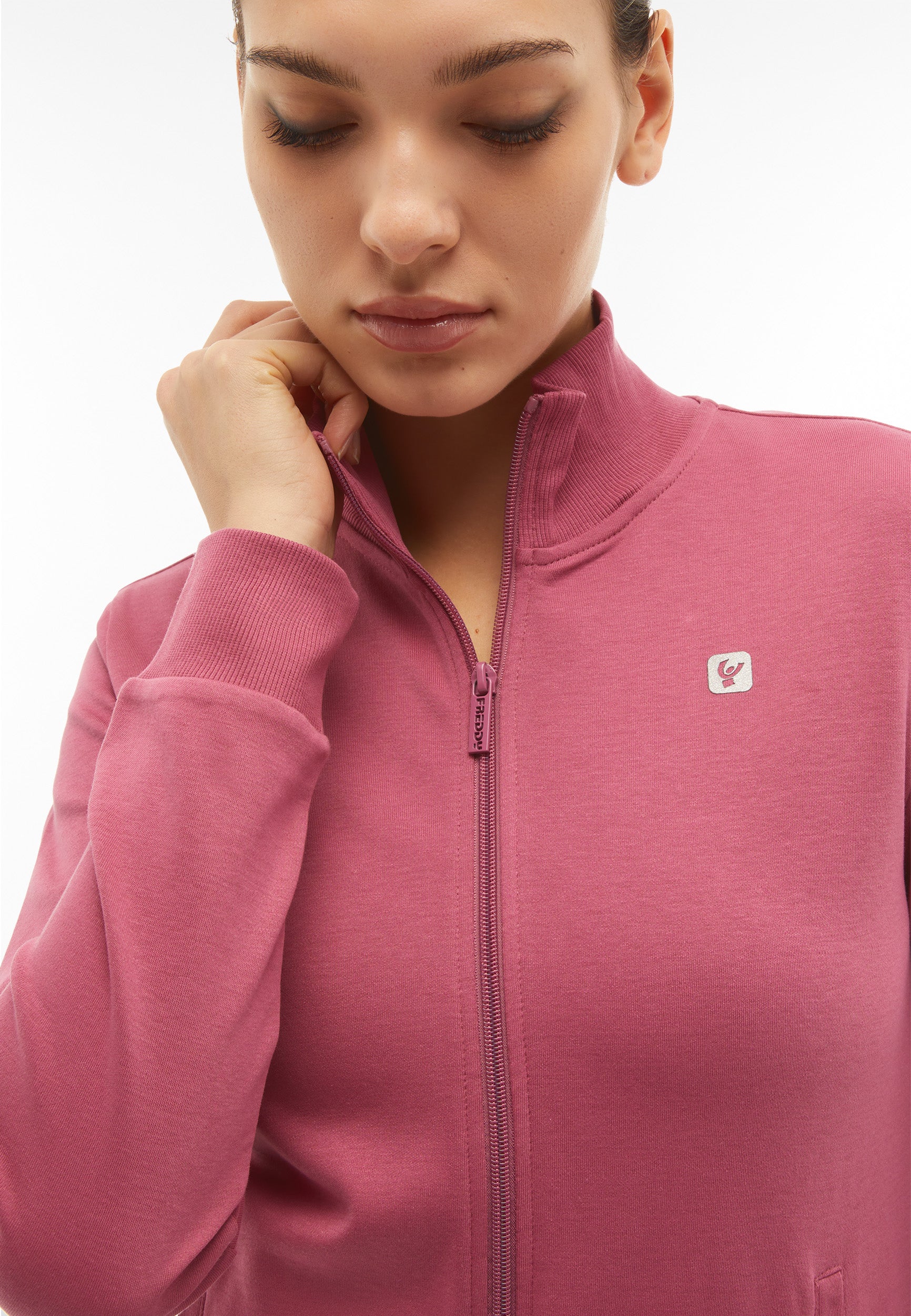 Trainingsanzug aus Interlock-Baumwolle mit regulärer Passform und einer Verarbeitung, die den Stoff weich, kompakt und flexibel macht und beim Tragen für mehr Komfort und Bewegungsfreiheit bei beiden Teilen des Anzugs sorgt. Die Sweatjacke hat einen hohen, gerippten Kragen, einen durchgehenden Reißverschluss, paspelierte Leistentaschen sowie gerippte Bündchen an Ärmeln und Saum. Die Hose hat Innentaschen, eine Ripptaille, einen Rippsaum und Rippbündchen. Sweatshirt und Hose haben ein kleines Freddy-Logo auf der linken Vorderseite und an der Seite unter der Tasche.