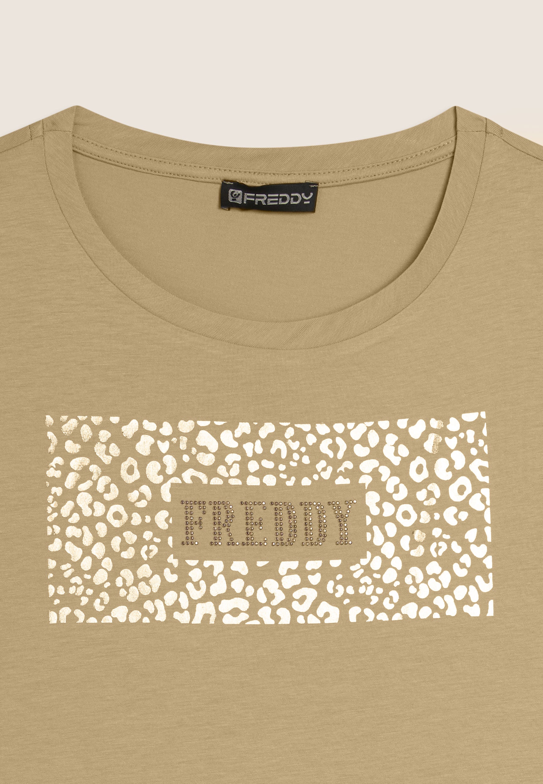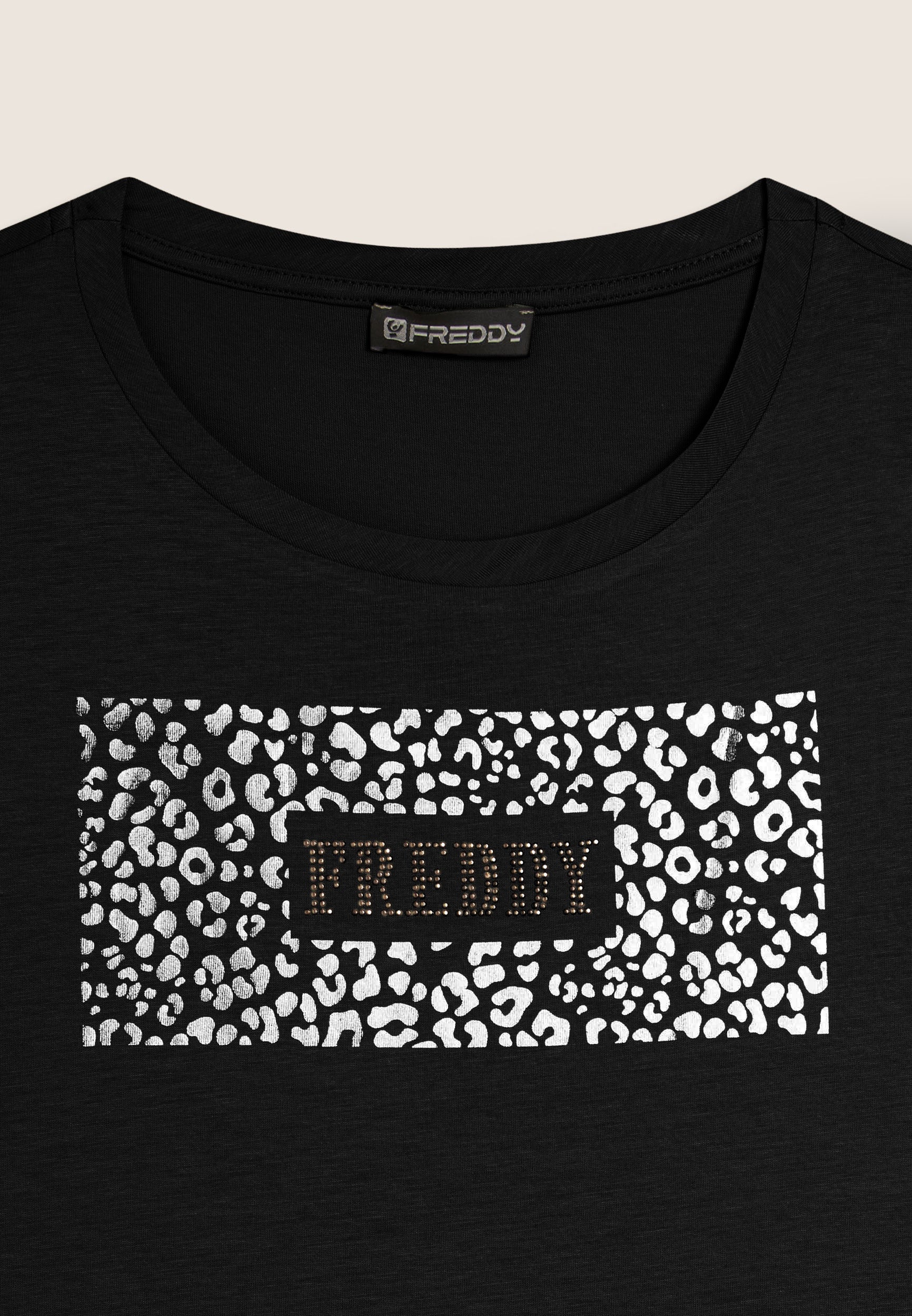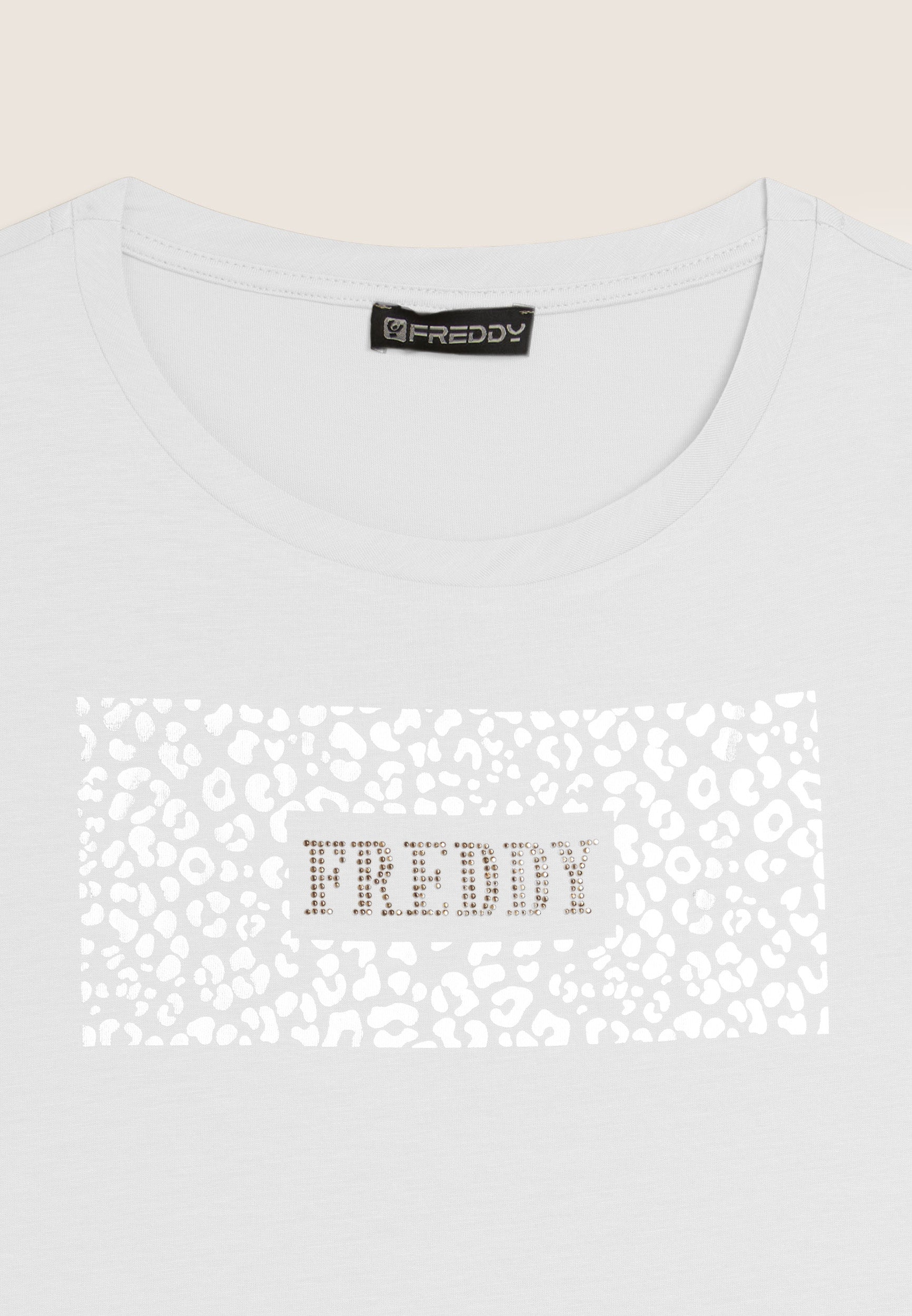 Ein Tanktop mit normaler Passform und Länge, das unten mit Seitenschlitzen aus Viskose mit Animal-Muster versehen ist und für einen Hauch von Frische und Bewegung sorgt. Der Rundhalsausschnitt und die regulären Träger vervollständigen das essentielle Design. Das FREDDY-Logo, das auf der Vorderseite in Gold gedruckt und von Animal-Grafiken umgeben ist, wird zum Star des Kleidungsstücks. Dieses Tanktop aus Baumwoll- und Modaljersey ist perfekt für einen sommerlichen und dynamischen Style und garantiert Weichheit, Atmungsaktivität und Komfort.