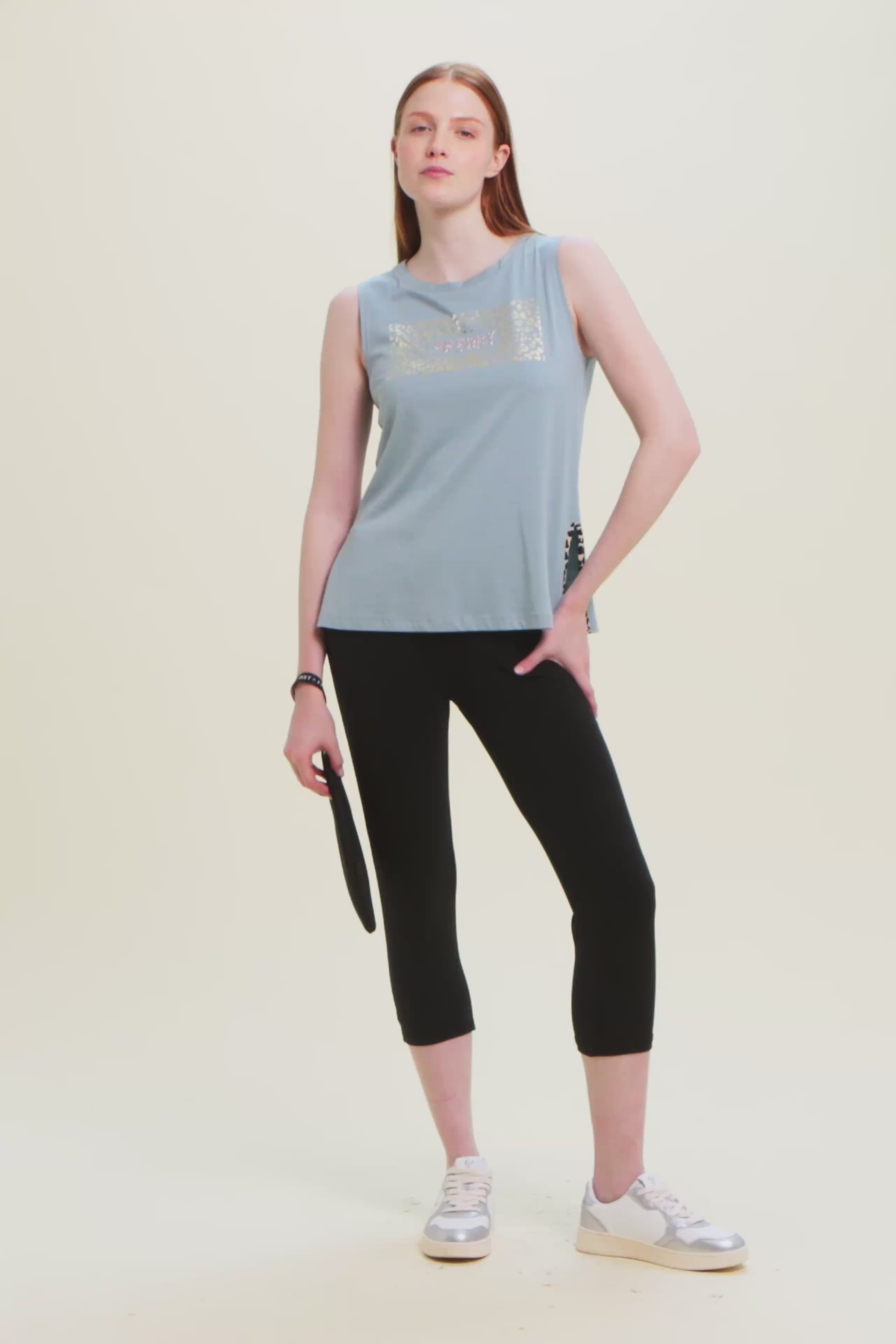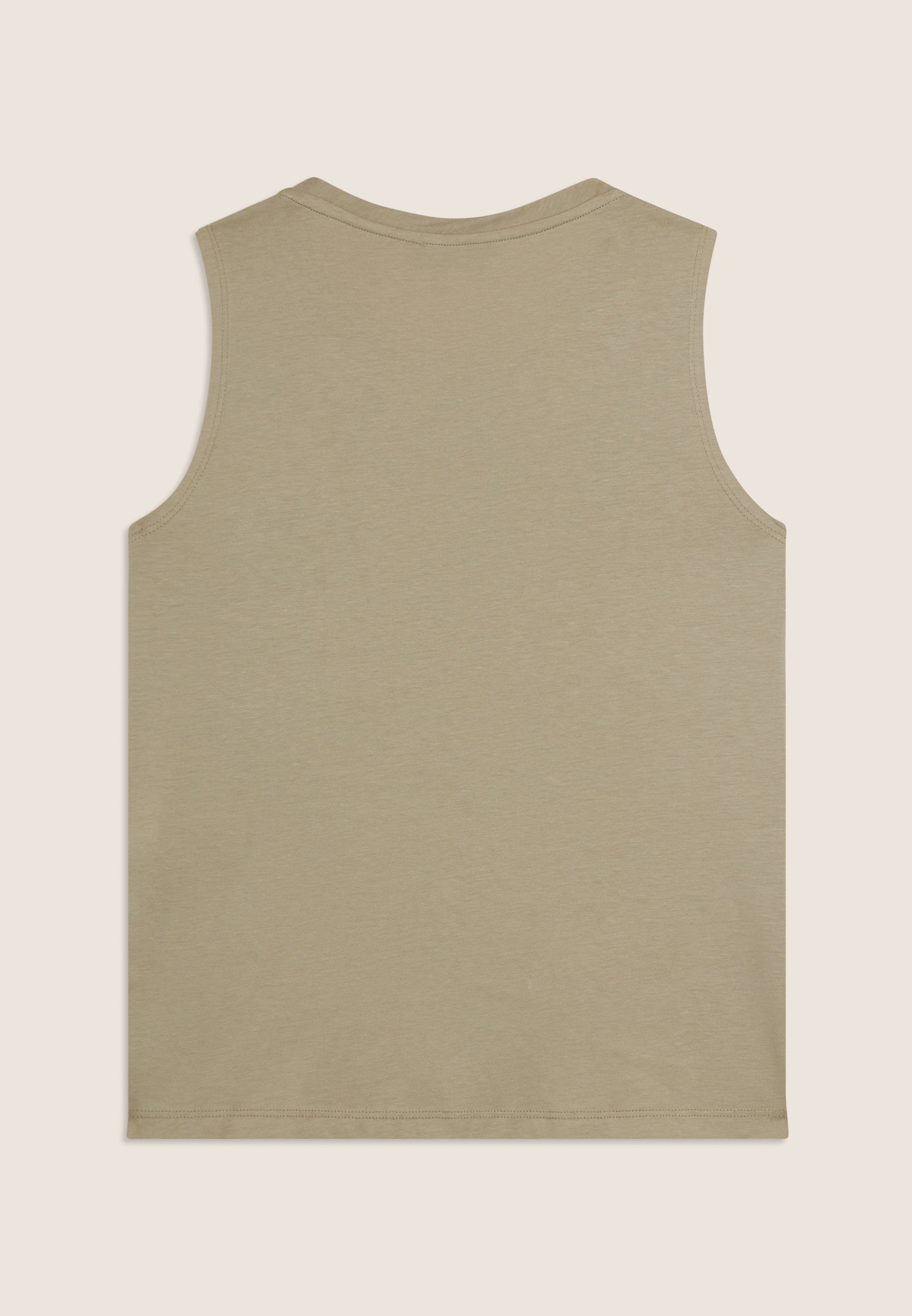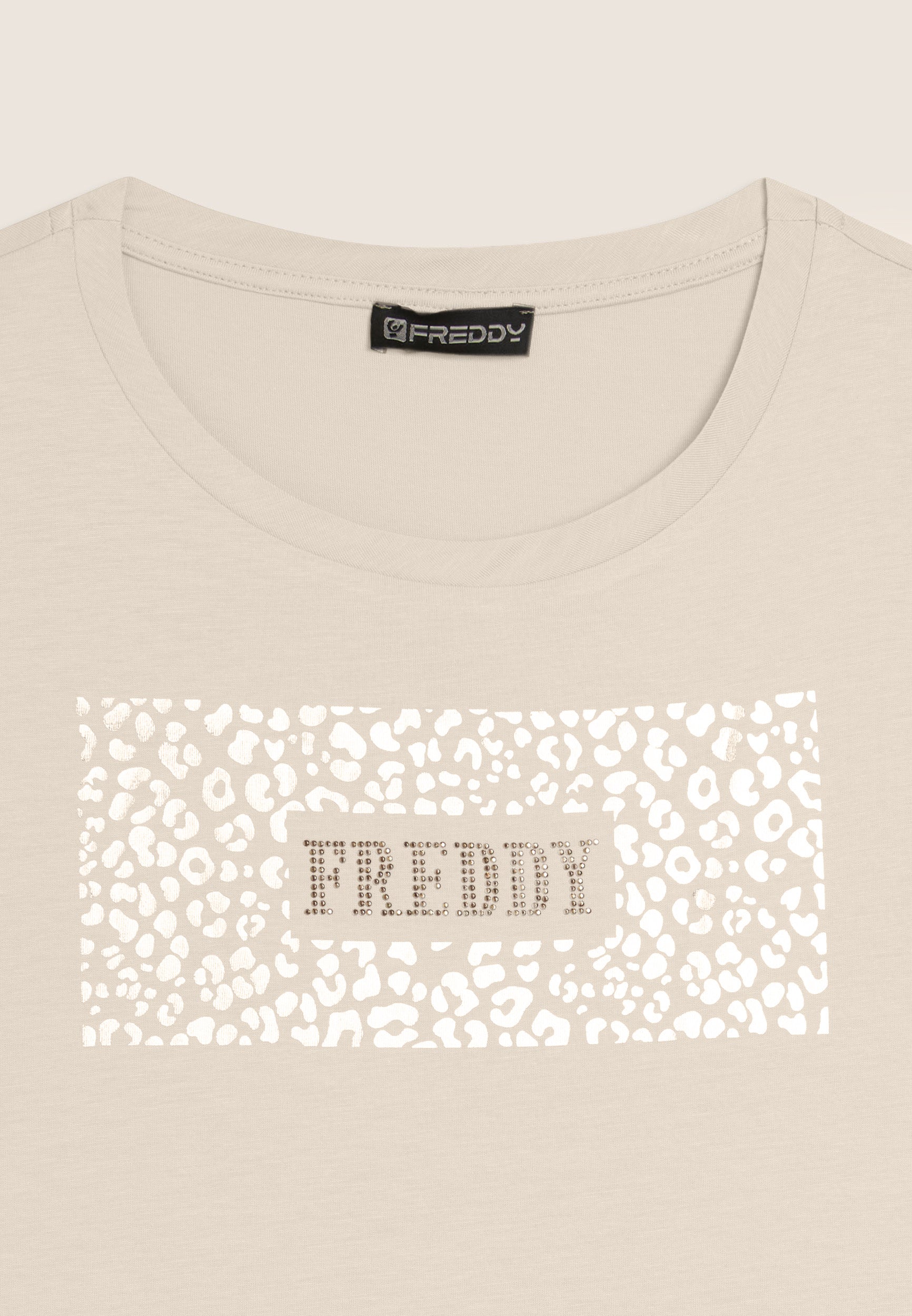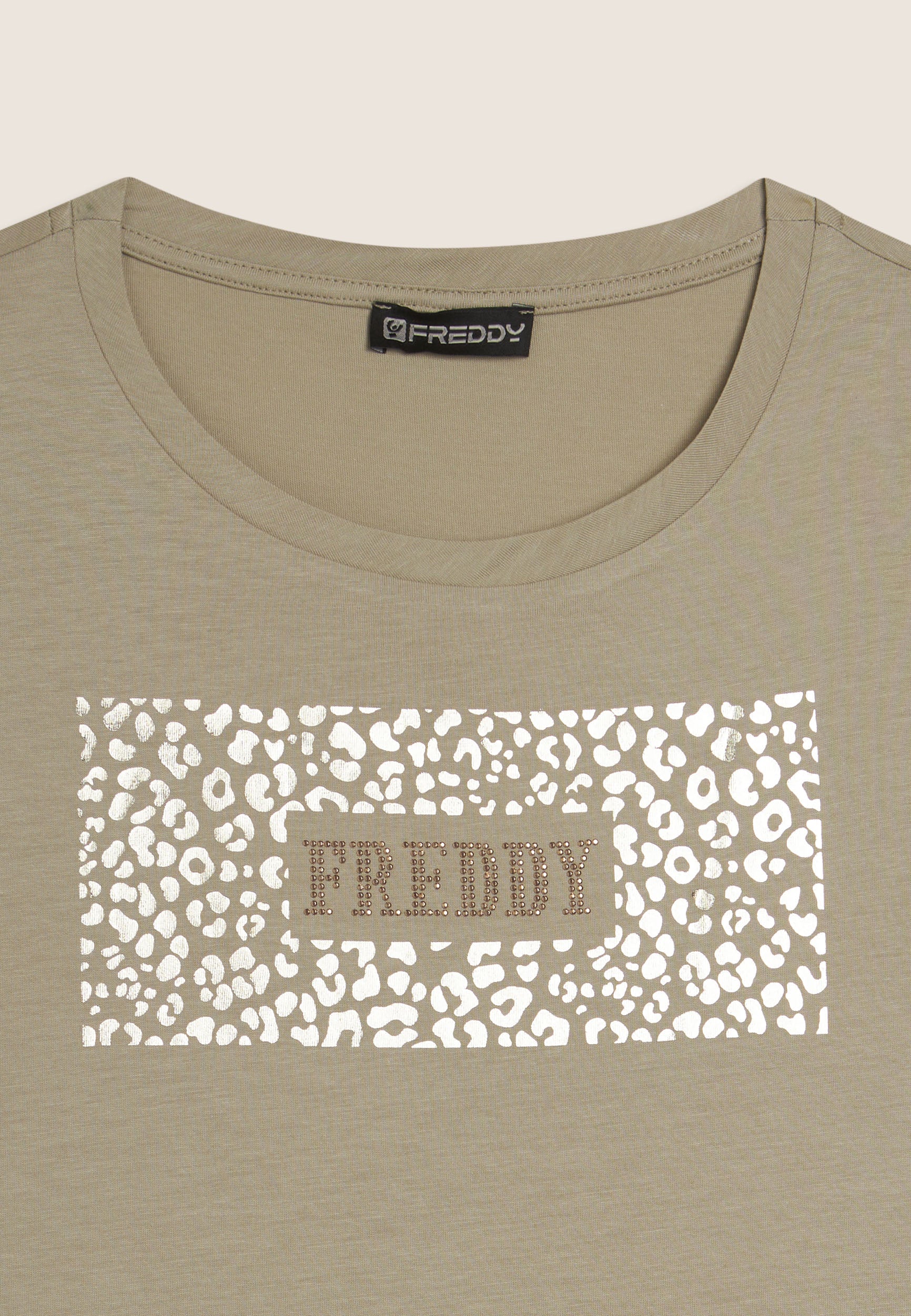 Ein Tanktop mit normaler Passform und Länge, das unten mit Seitenschlitzen aus Viskose mit Animal-Muster versehen ist und für einen Hauch von Frische und Bewegung sorgt. Der Rundhalsausschnitt und die regulären Träger vervollständigen das essentielle Design. Das FREDDY-Logo, das auf der Vorderseite in Gold gedruckt und von Animal-Grafiken umgeben ist, wird zum Star des Kleidungsstücks. Dieses Tanktop aus Baumwoll- und Modaljersey ist perfekt für einen sommerlichen und dynamischen Style und garantiert Weichheit, Atmungsaktivität und Komfort.