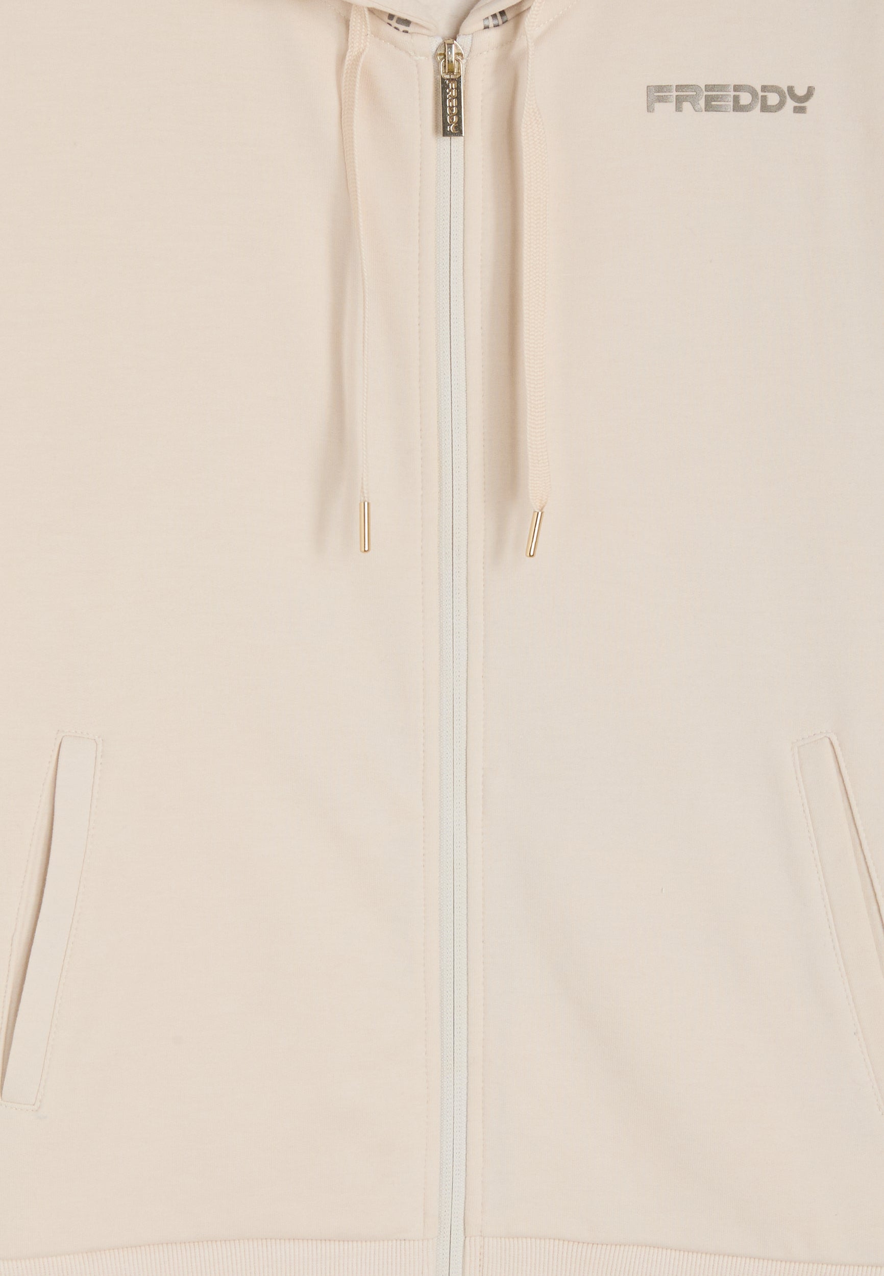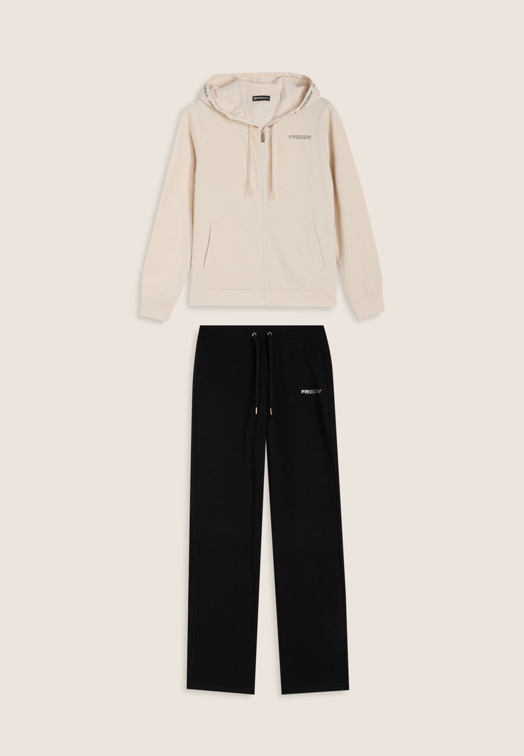 Dieser Trainingsanzug aus angerautem Stretch-Sweatshirtstoff sieht sportlich und lässig aus. Die Kapuzenjacke mit Reißverschluss und geripptem Bündchen hat eine verstellbare Kapuze mit Kordelzug, die mit weichem Jersey gefüttert ist. Die langen Ärmel haben Rippenbündchen für eine bessere Passform. Die Hose hat ein gerades Bein, einen gerippten Bund mit Kordelzug und eine bequeme Passform. Das goldfarbene Freddy-Logo ziert elegant den Rand der Kapuze, die linke Brustseite und die linke Seite der Hose. Der Hoodie ist mit praktischen und diskreten Leistentaschen ausgestattet.