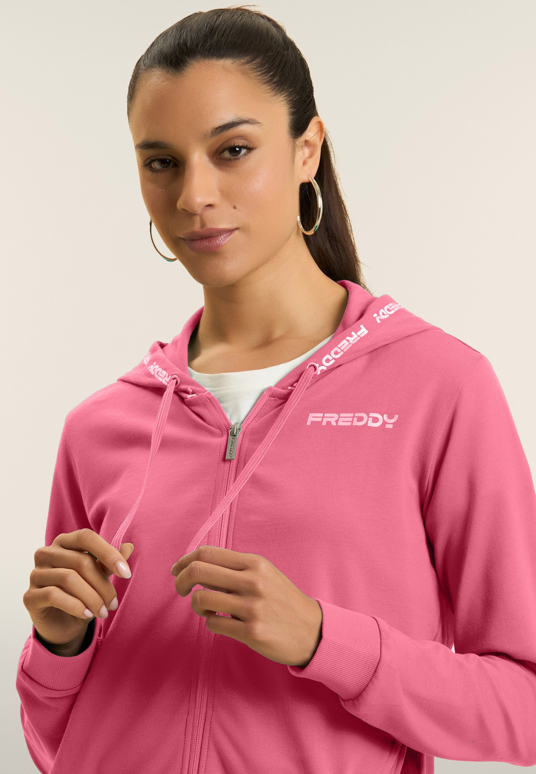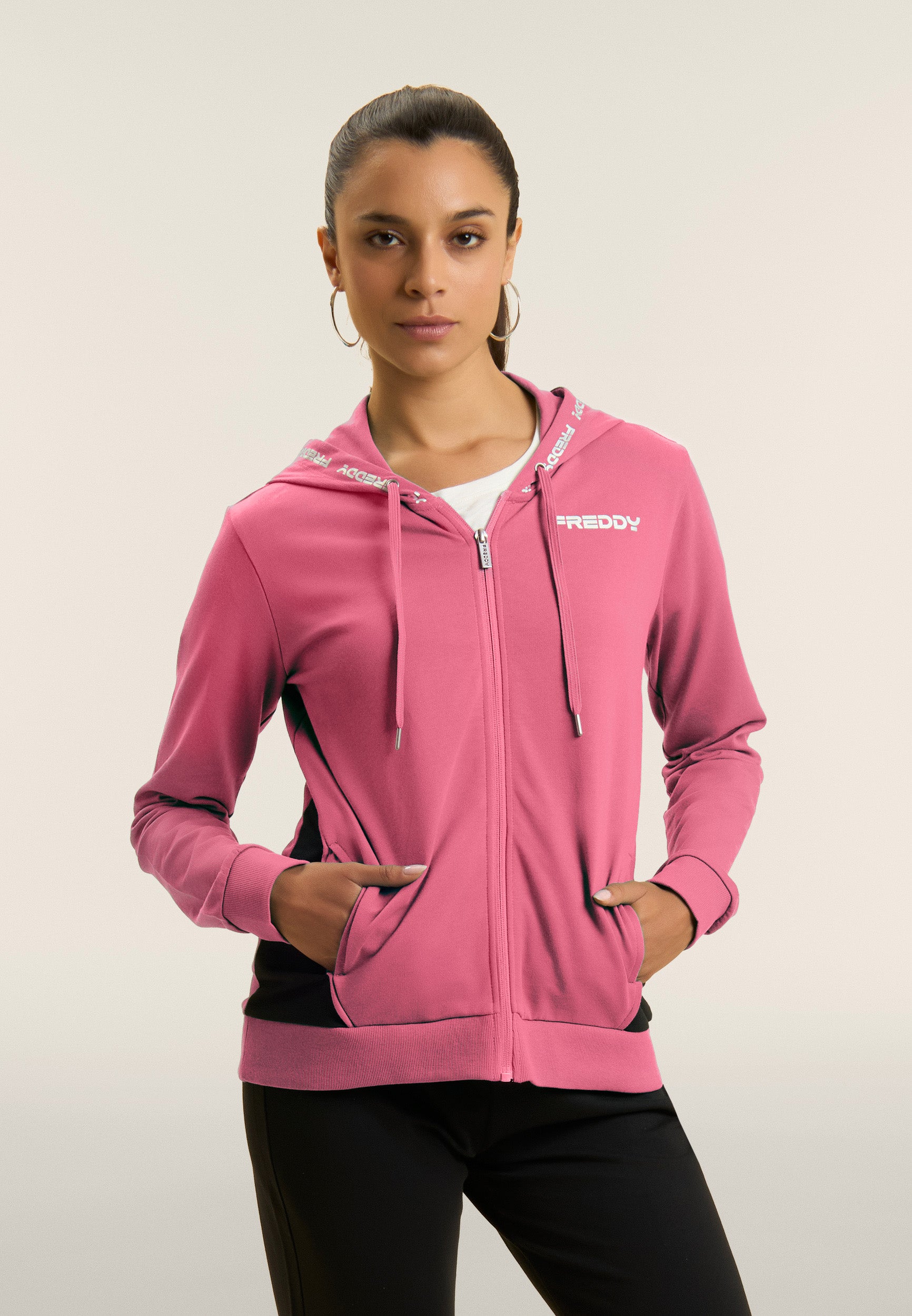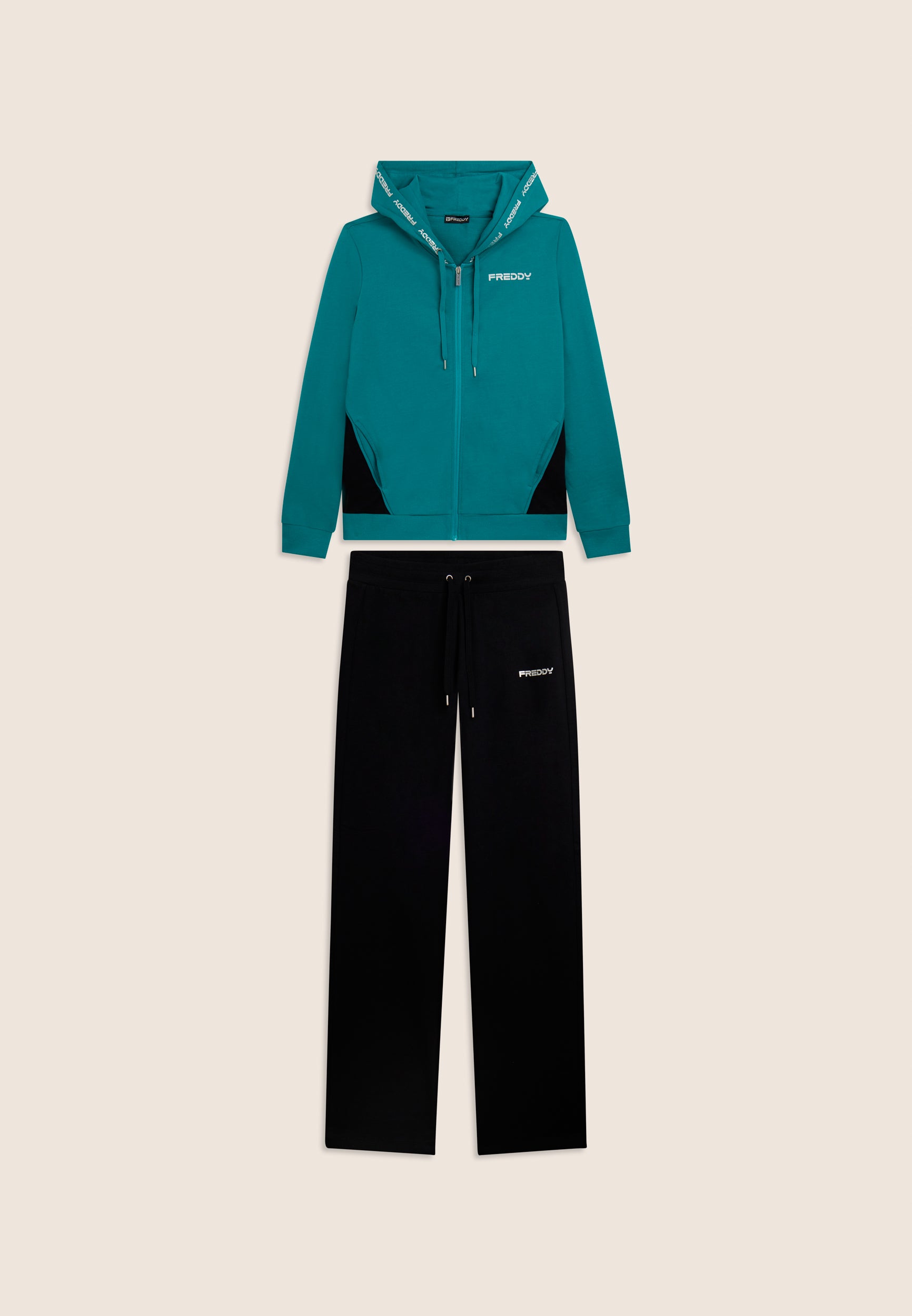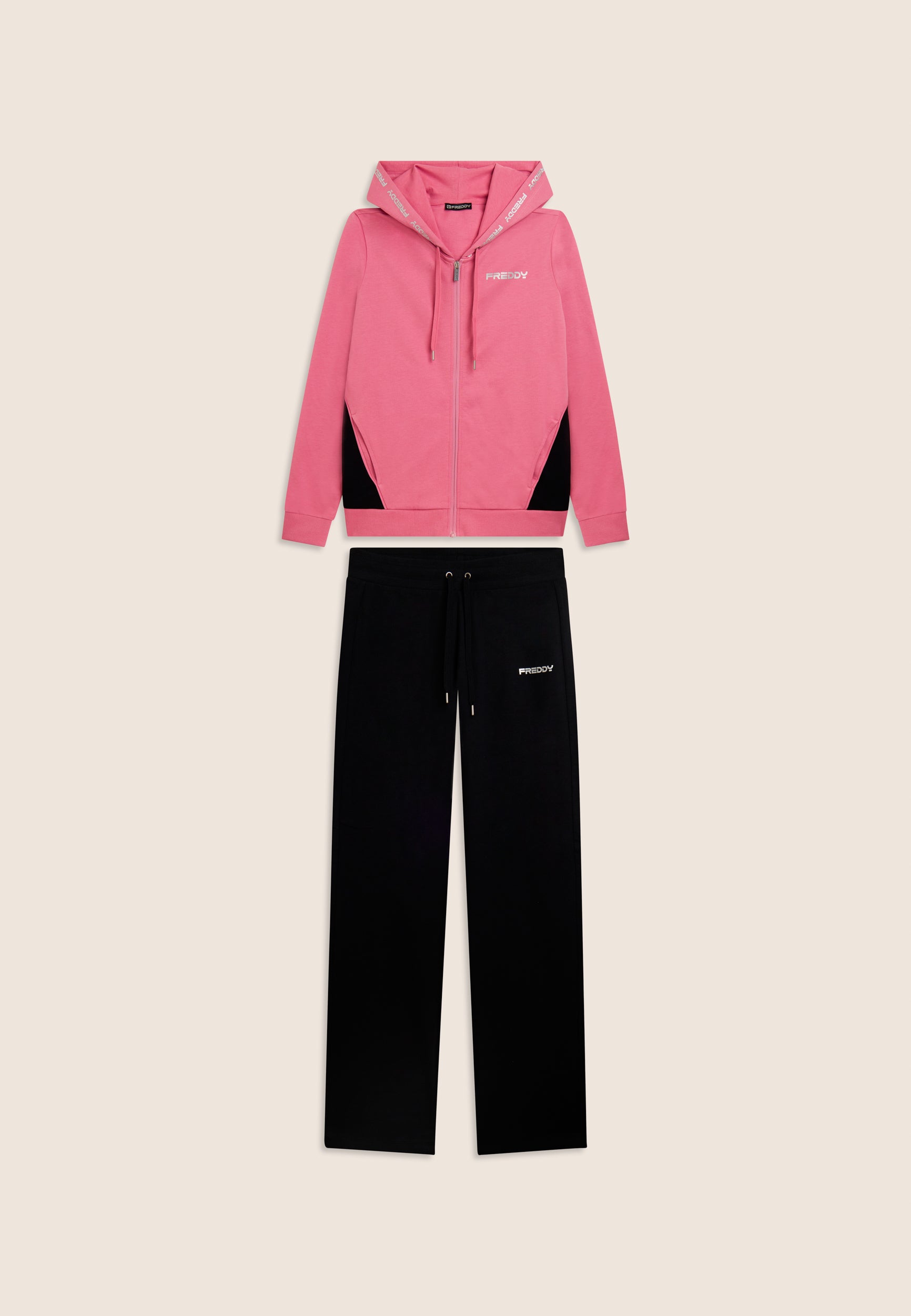 Ein Trainingsanzug mit dynamischem Geist aus Baumwoll-Interlock, einem weichen und strapazierfähigen Stoff, der ideal für jeden Moment des Tages ist. Die Kapuzenjacke hat eine mit Jersey gefütterte Kapuze, die mit dem wiederholten FREDDY-Logo eingefasst und mit einem Kordelzug verstellbar ist. Kontrastierende Stoffeinsätze an den Hüften verleihen dem Design einen kernigen Touch. Ein farblich abgestimmter Reißverschluss, ein gerippter Saum und Bündchen an den Ärmeln machen das Kleidungsstück komplett. Die Hose mit normaler Passform hat einen elastischen Bund mit innenliegendem Kordelzug und einen geraden Boden. Kleines FREDDY-Logo auf Herz und Seite. Leistentaschen auf der Vorderseite der Kapuzenjacke.