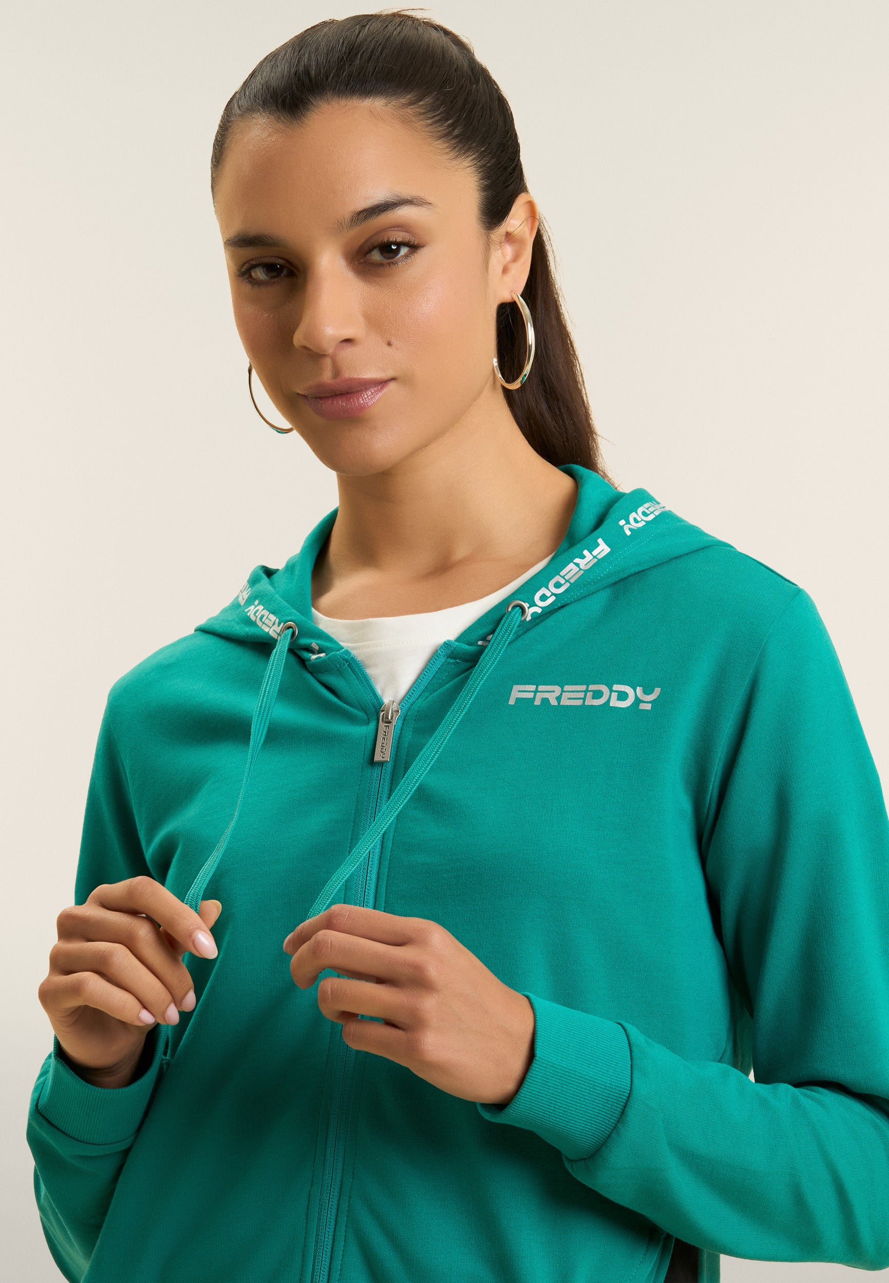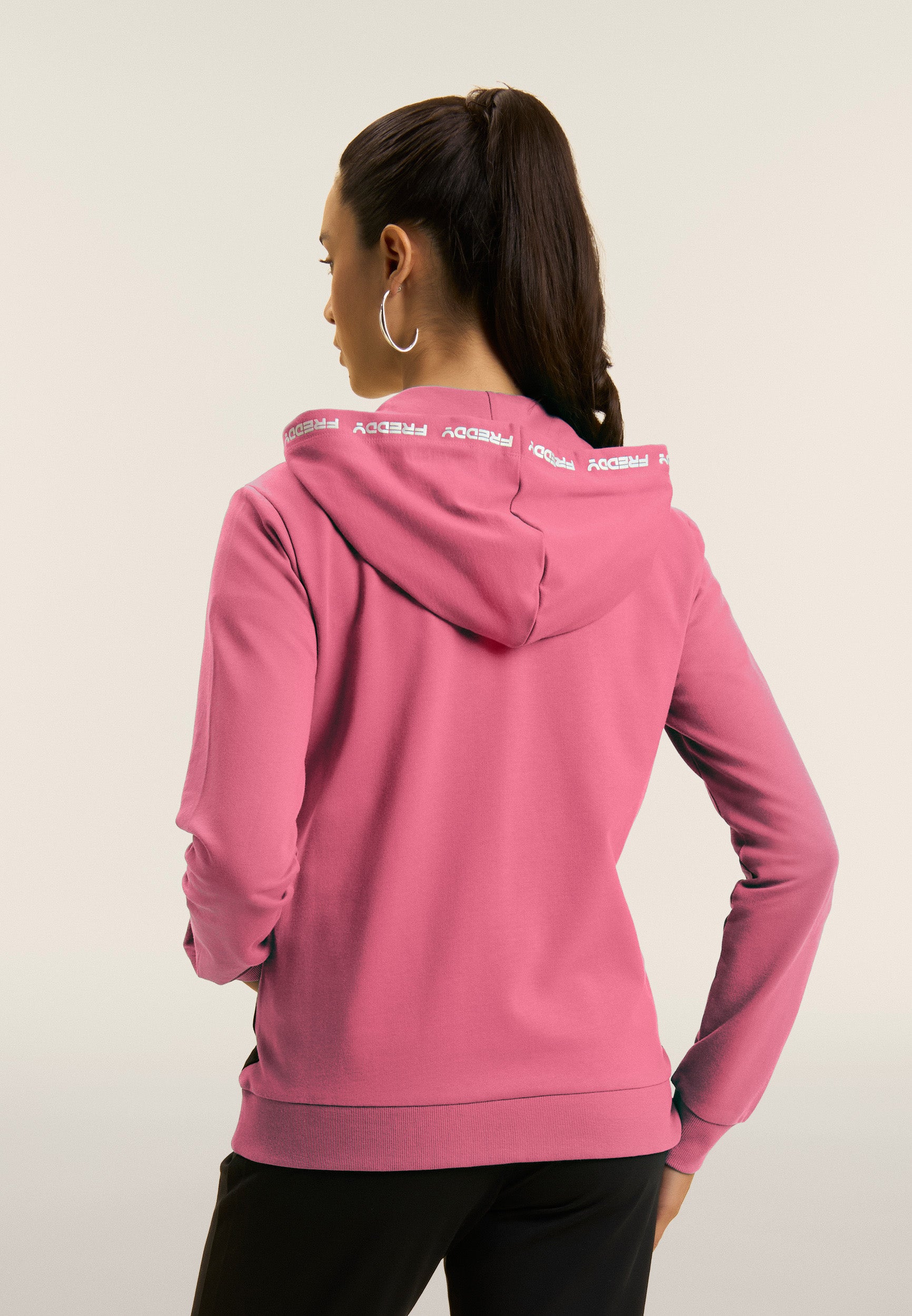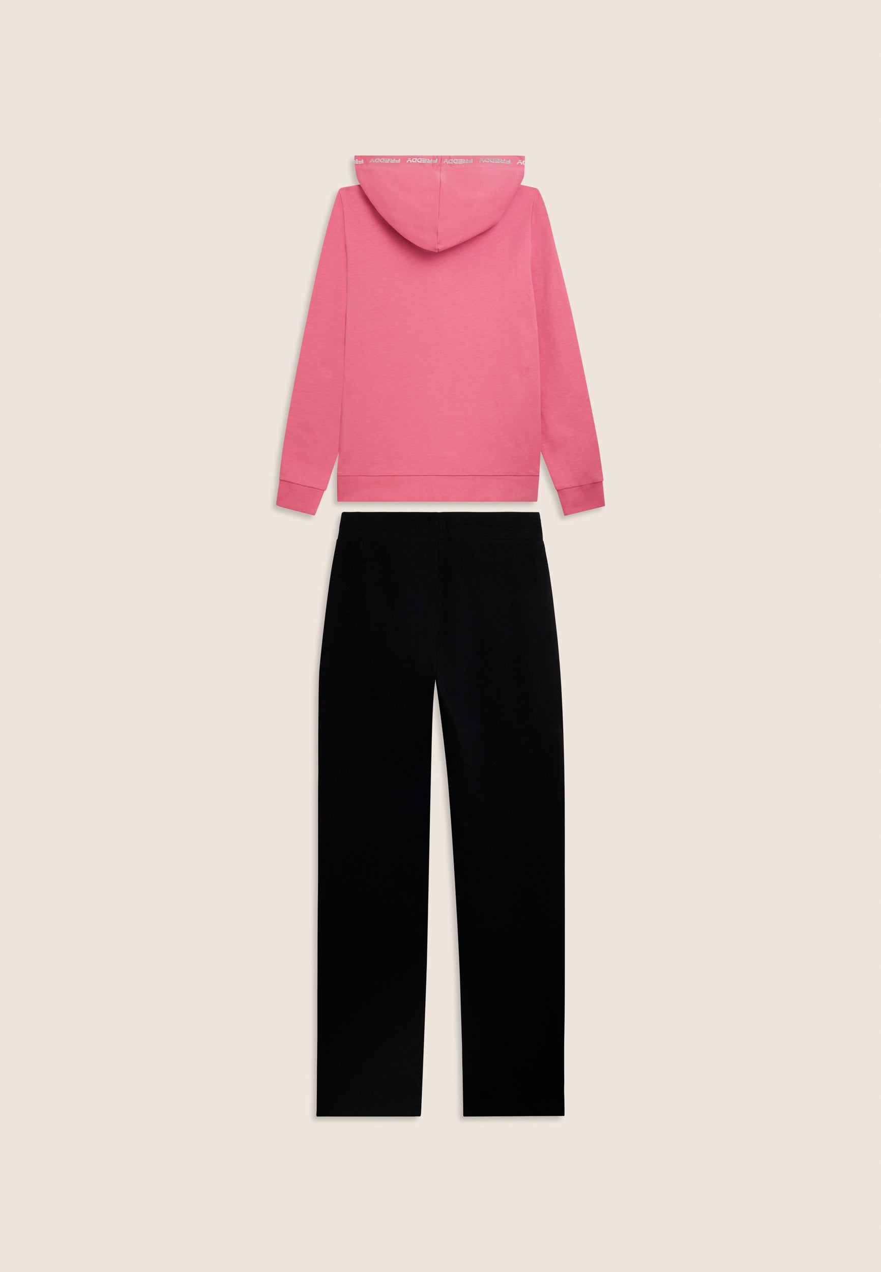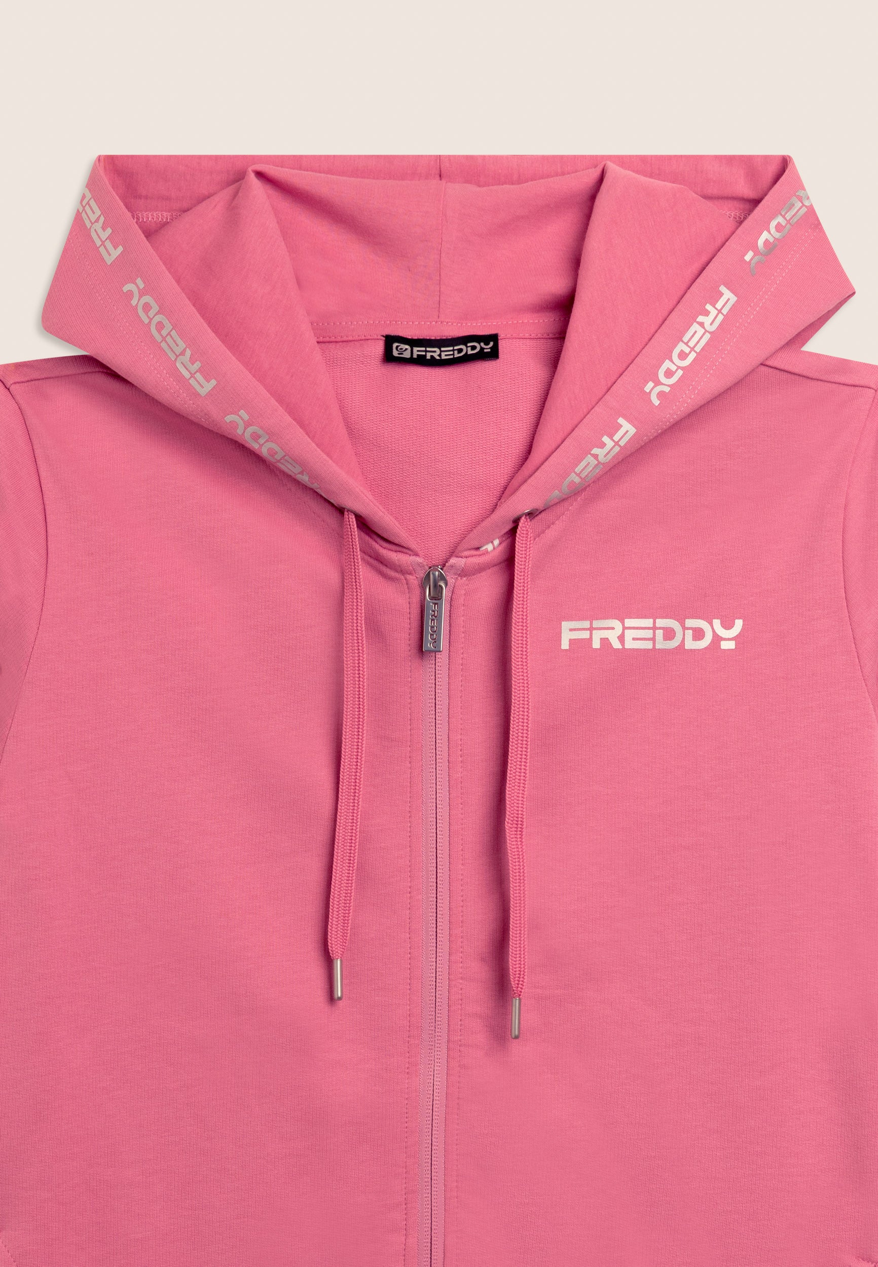 Ein Trainingsanzug mit dynamischem Geist aus Baumwoll-Interlock, einem weichen und strapazierfähigen Stoff, der ideal für jeden Moment des Tages ist. Die Kapuzenjacke hat eine mit Jersey gefütterte Kapuze, die mit dem wiederholten FREDDY-Logo eingefasst und mit einem Kordelzug verstellbar ist. Kontrastierende Stoffeinsätze an den Hüften verleihen dem Design einen kernigen Touch. Ein farblich abgestimmter Reißverschluss, ein gerippter Saum und Bündchen an den Ärmeln machen das Kleidungsstück komplett. Die Hose mit normaler Passform hat einen elastischen Bund mit innenliegendem Kordelzug und einen geraden Boden. Kleines FREDDY-Logo auf Herz und Seite. Leistentaschen auf der Vorderseite der Kapuzenjacke.