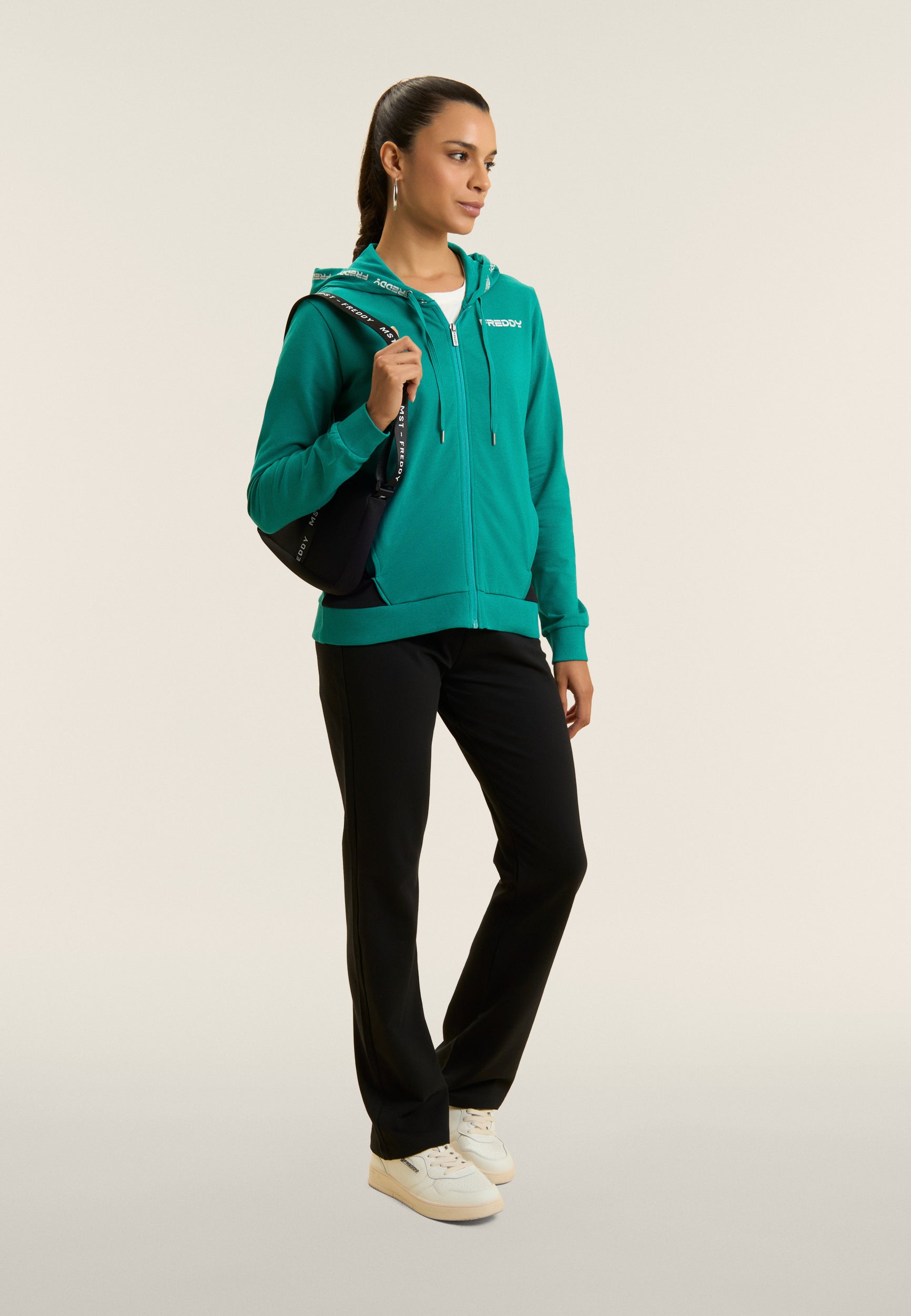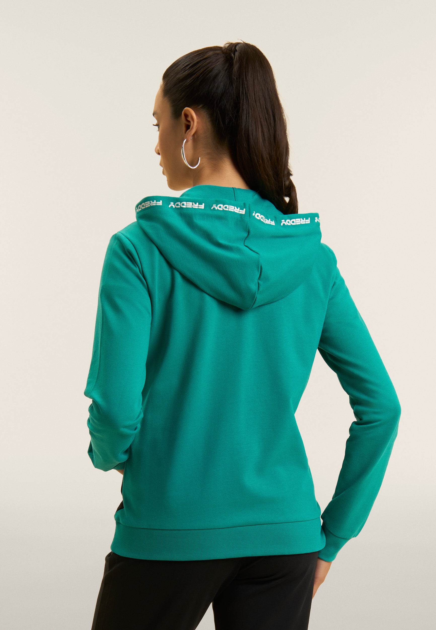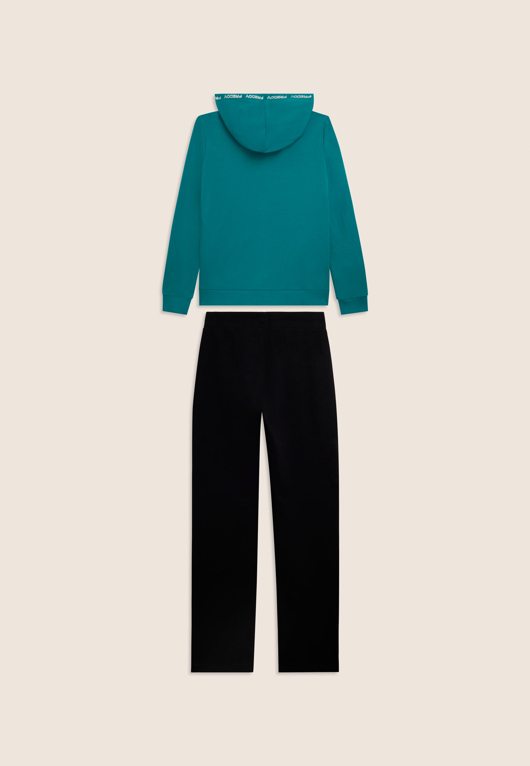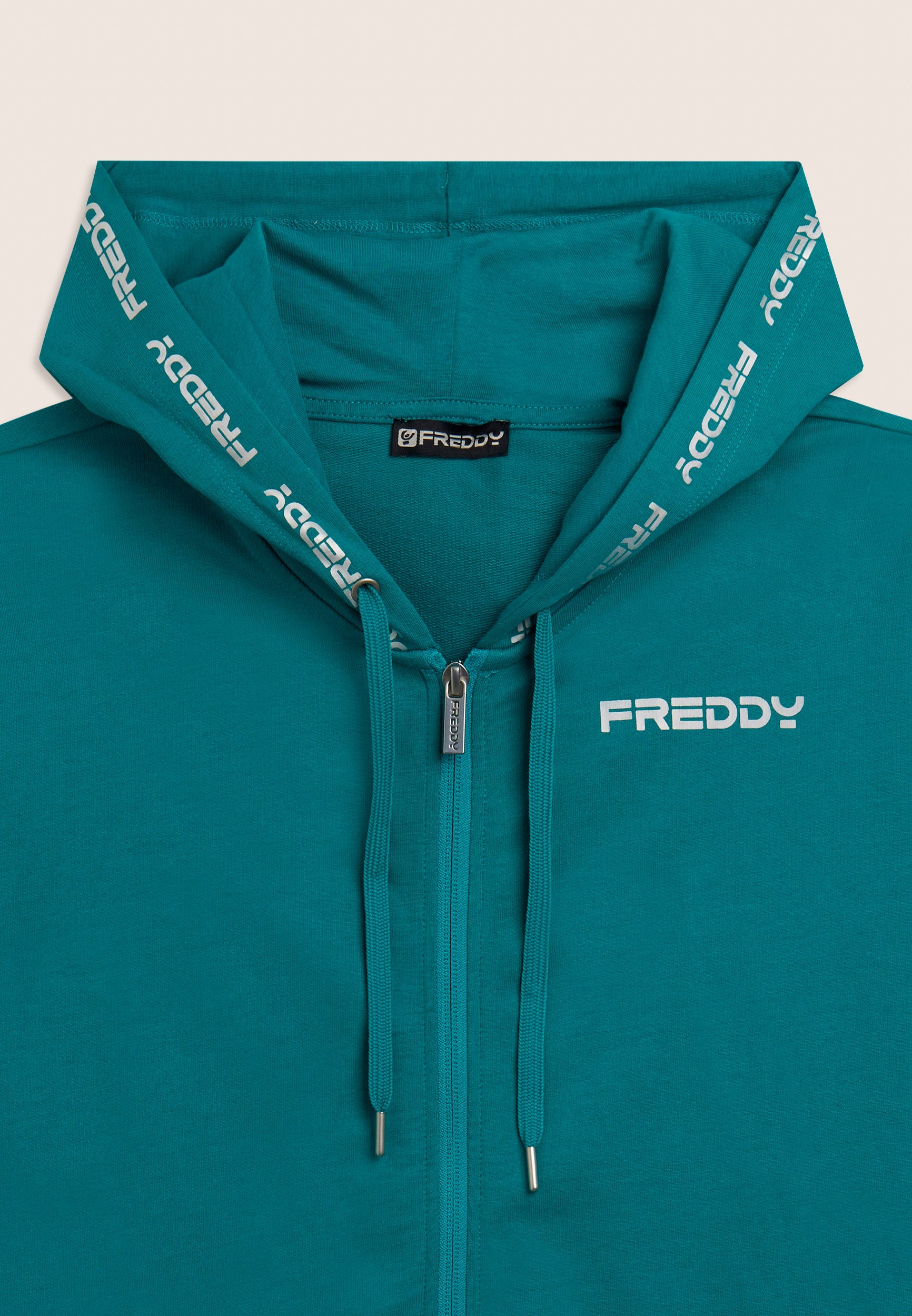 Ein Trainingsanzug mit dynamischem Geist aus Baumwoll-Interlock, einem weichen und strapazierfähigen Stoff, der ideal für jeden Moment des Tages ist. Die Kapuzenjacke hat eine mit Jersey gefütterte Kapuze, die mit dem wiederholten FREDDY-Logo eingefasst und mit einem Kordelzug verstellbar ist. Kontrastierende Stoffeinsätze an den Hüften verleihen dem Design einen kernigen Touch. Ein farblich abgestimmter Reißverschluss, ein gerippter Saum und Bündchen an den Ärmeln machen das Kleidungsstück komplett. Die Hose mit normaler Passform hat einen elastischen Bund mit innenliegendem Kordelzug und einen geraden Boden. Kleines FREDDY-Logo auf Herz und Seite. Leistentaschen auf der Vorderseite der Kapuzenjacke.