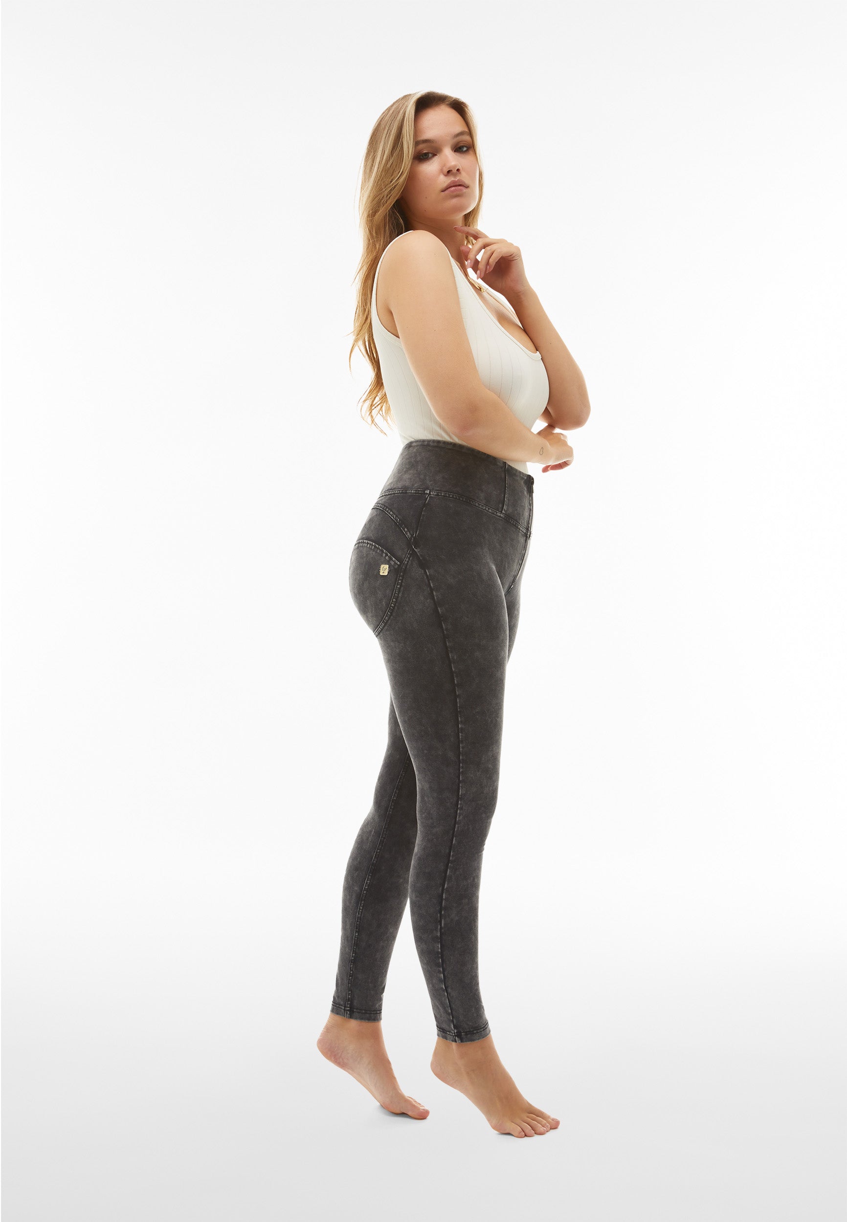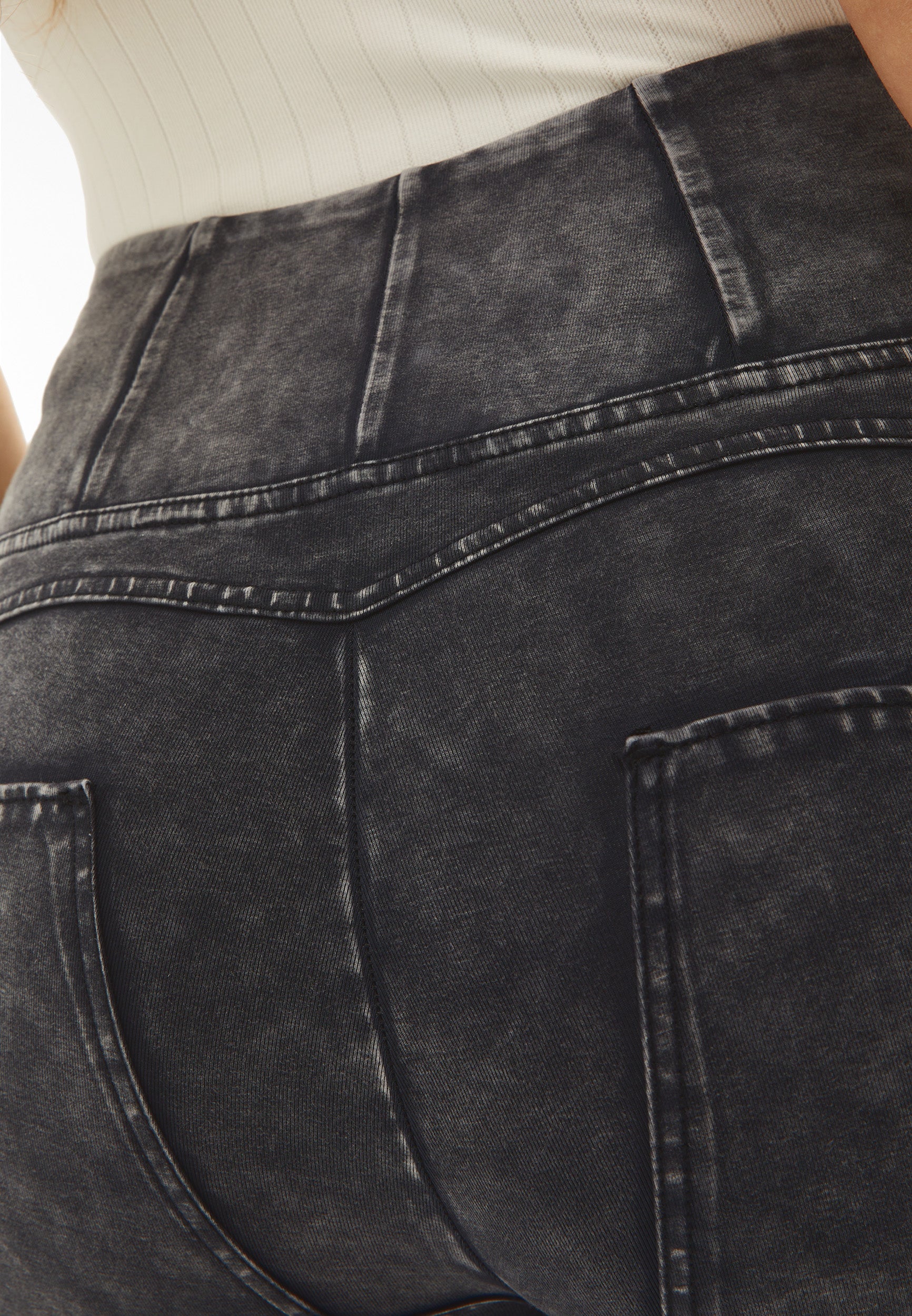 Push up-Hose aus der WR.UP®-Linie aus nachhaltigem, garngefärbtem Stretchgewebe mit Bleaching-Effekt aus Bio-Baumwolle und recyceltem Elastan. Das Modell hat einen hohen Taillenbund mit Frontreißverschluss, normale Länge und eine Superskinny-Passform, die die Linien des Körpers maximal unterstützt.
