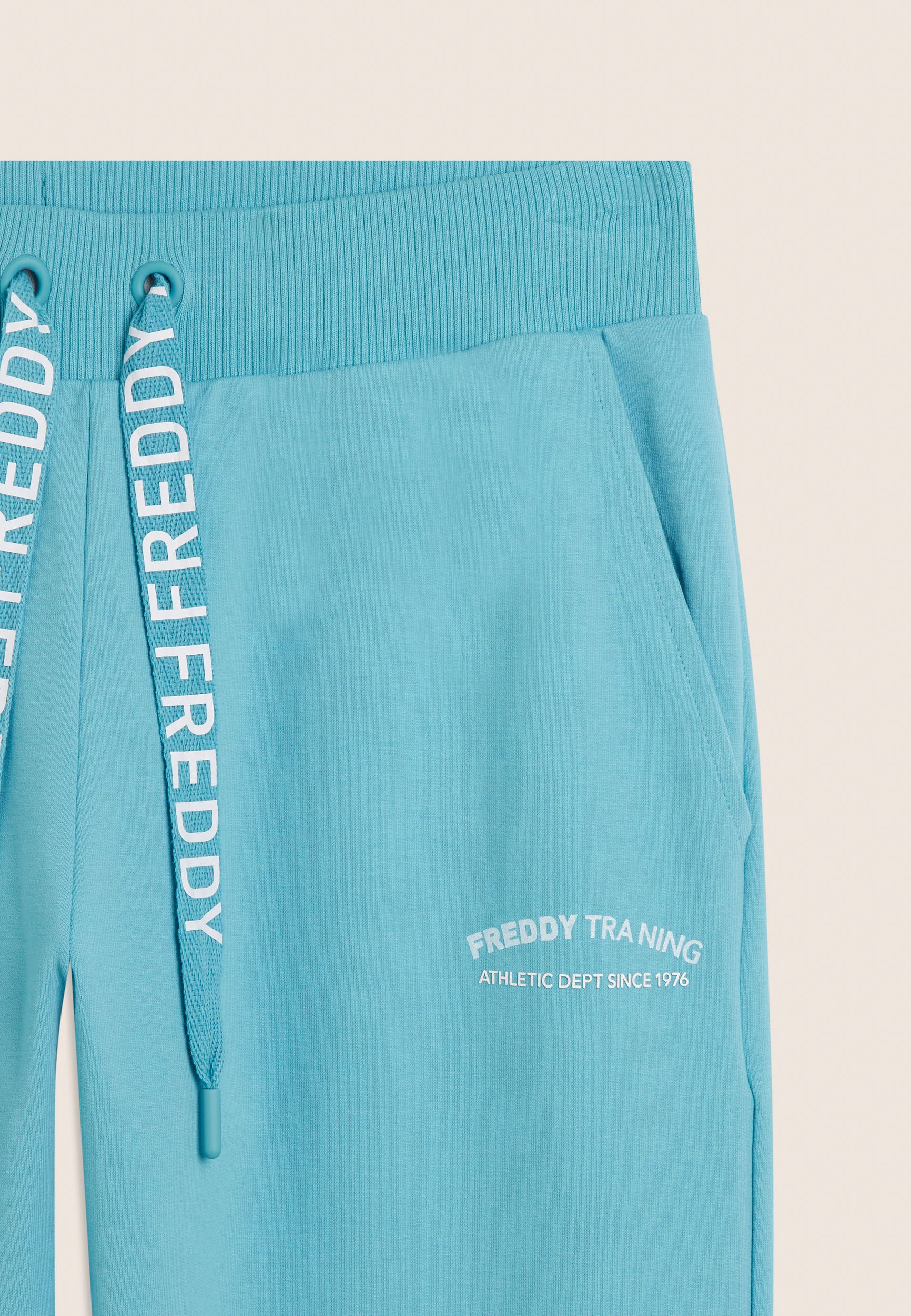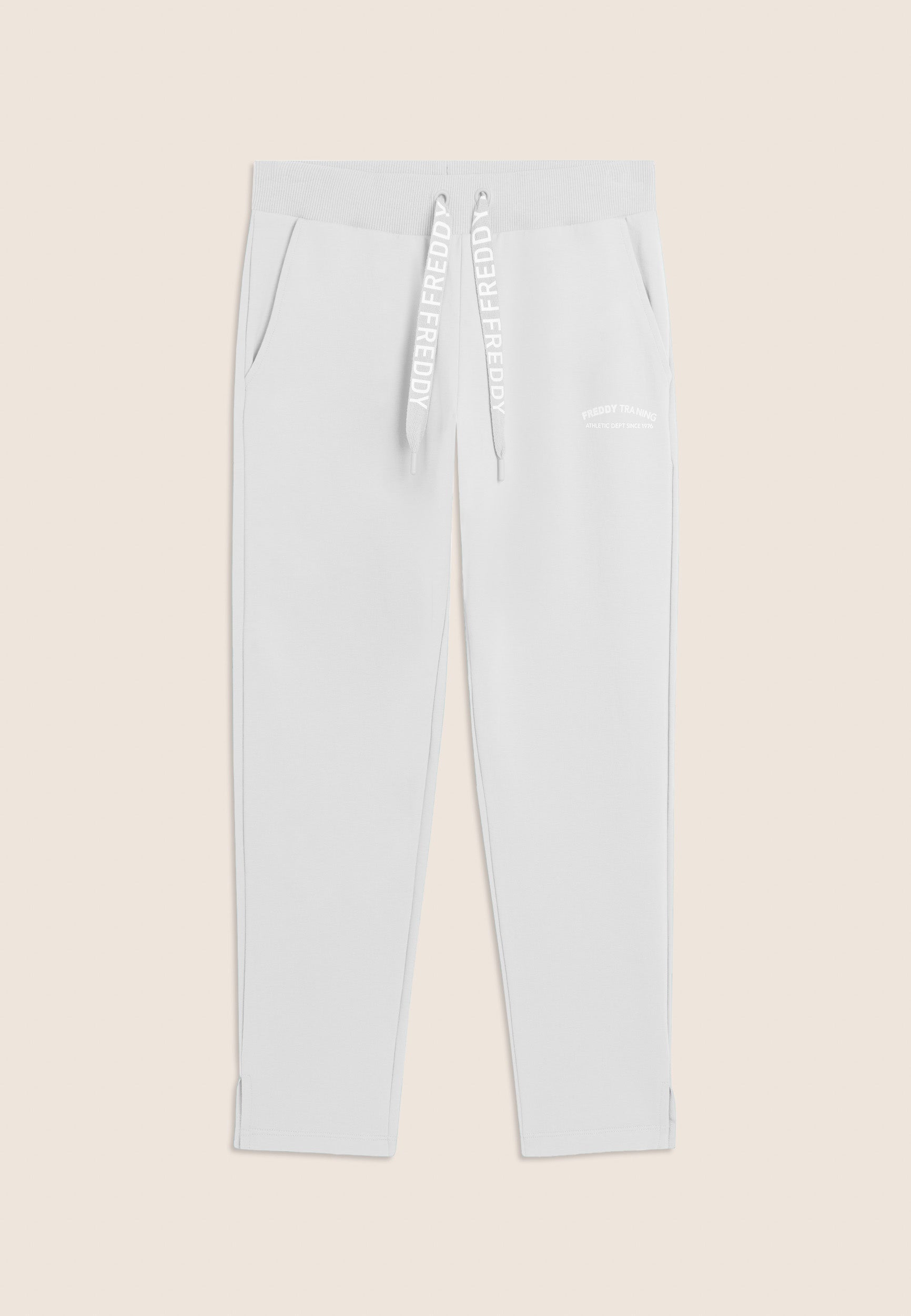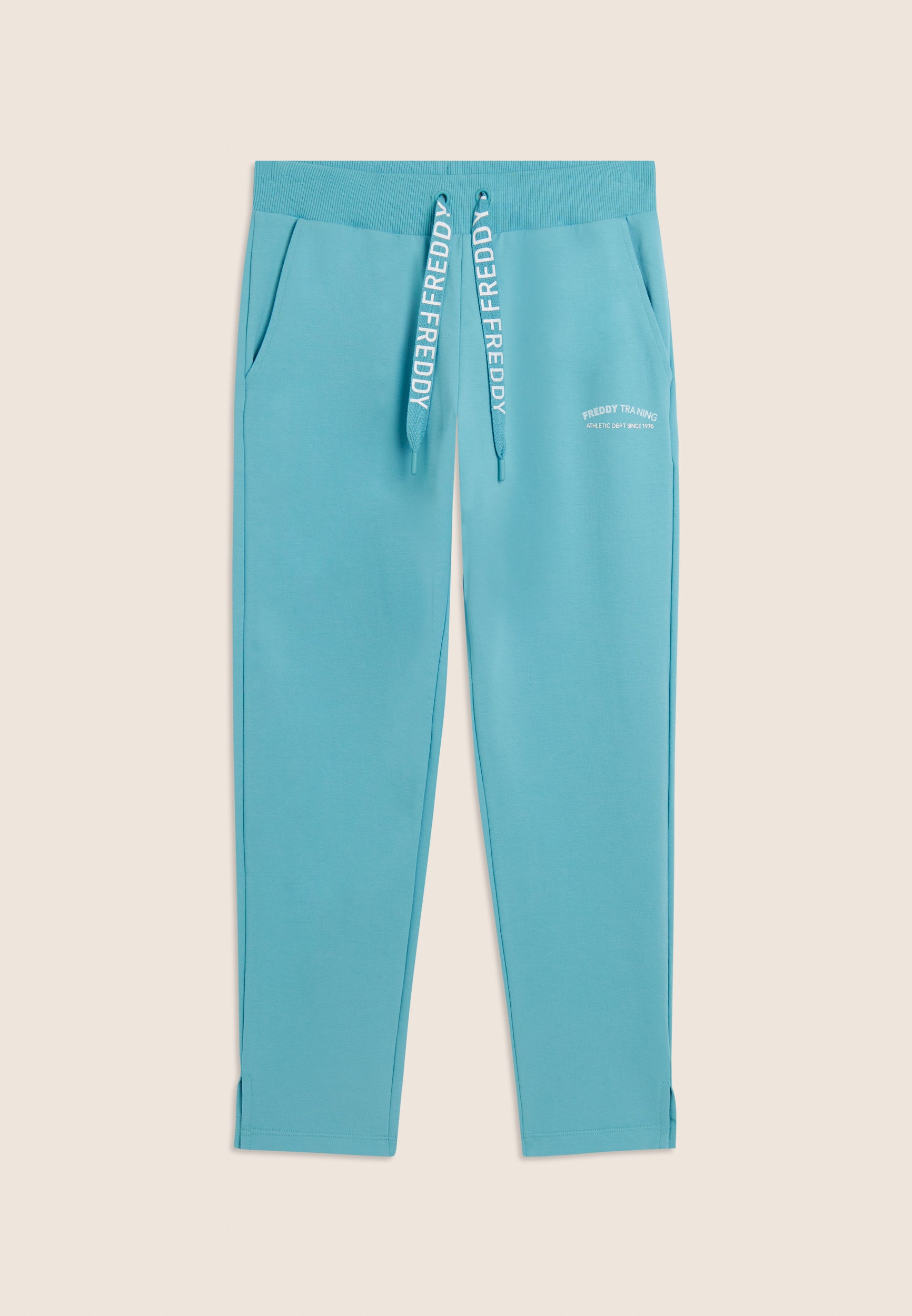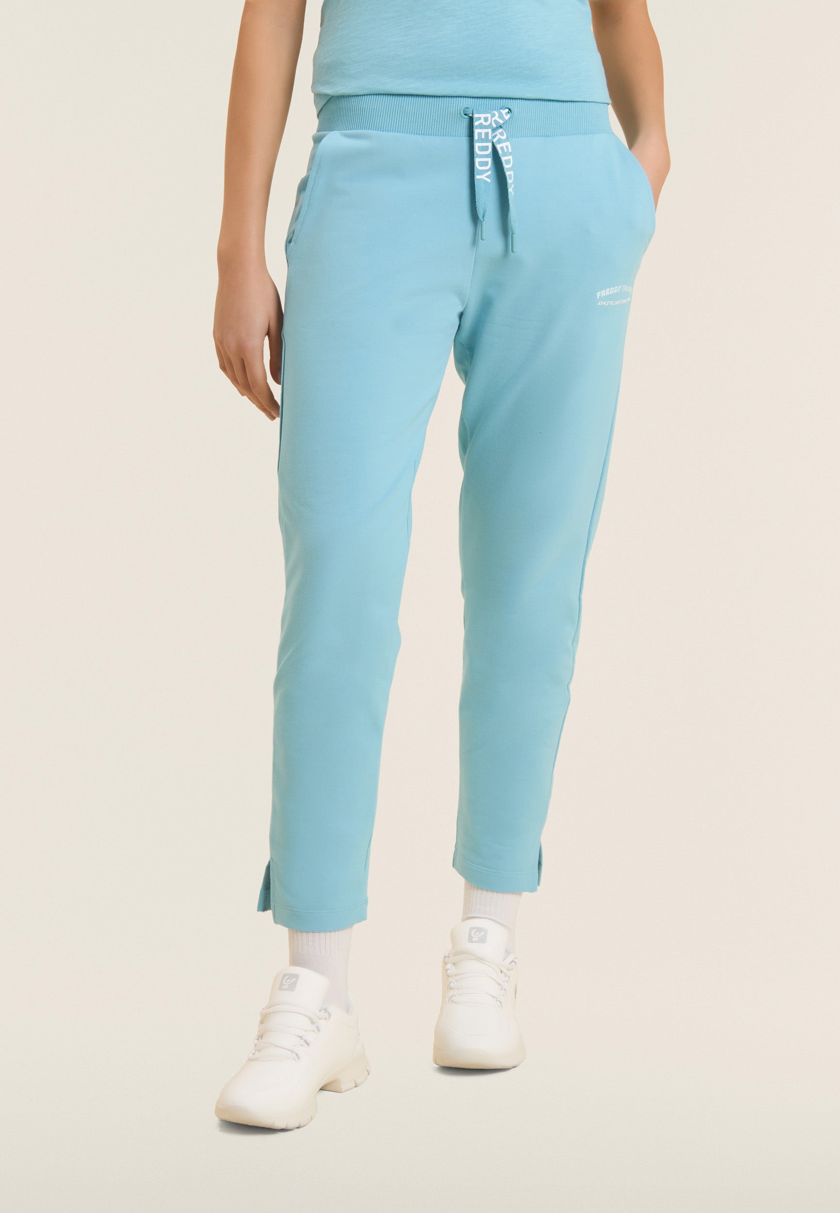 7/8 length trousers, straight bottom with small side slits for a touch of style and practicality. The regular waist with ribbed waistband and FREDDY logo drawstring ensures maximum comfort. The FREDDY logo in white glitter on the left side completes the look. Made of stretch French terry, perfect for mid-season.
