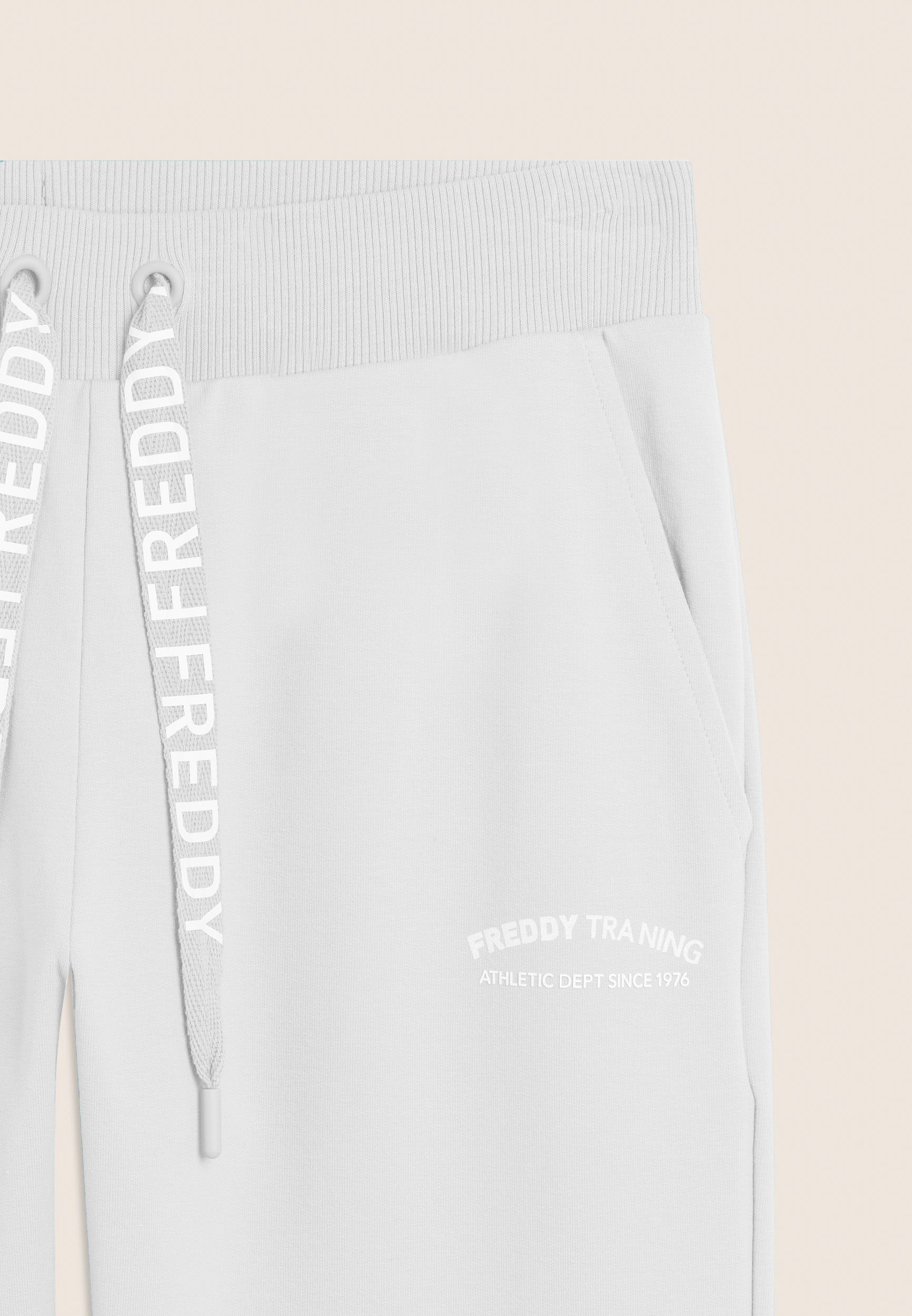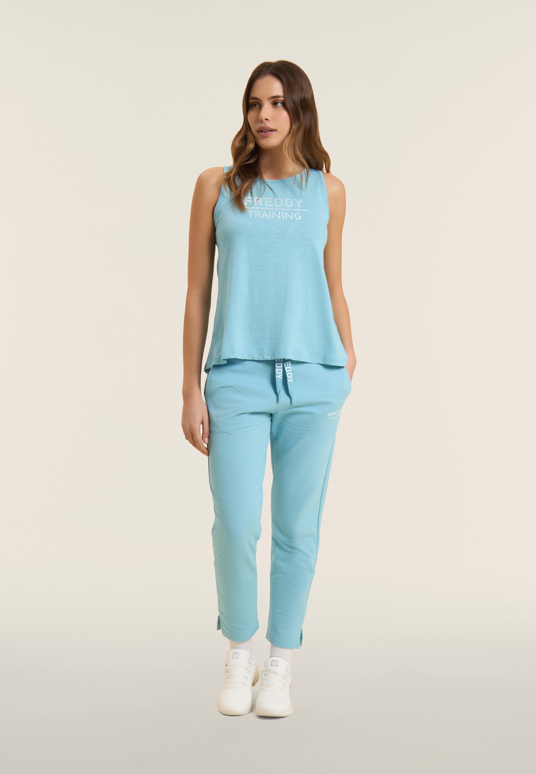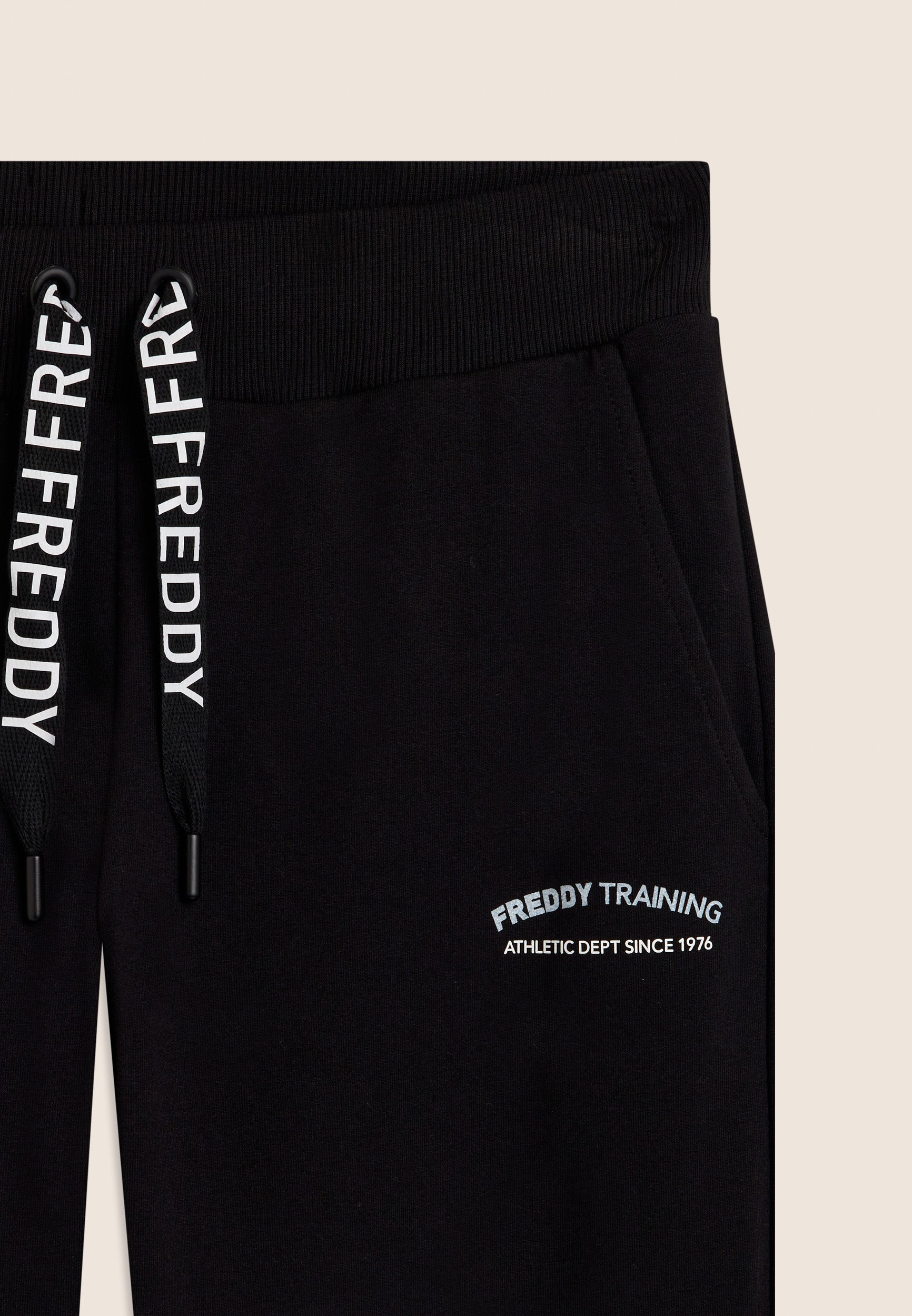 7/8 length trousers, straight bottom with small side slits for a touch of style and practicality. The regular waist with ribbed waistband and FREDDY logo drawstring ensures maximum comfort. The FREDDY logo in white glitter on the left side completes the look. Made of stretch French terry, perfect for mid-season.