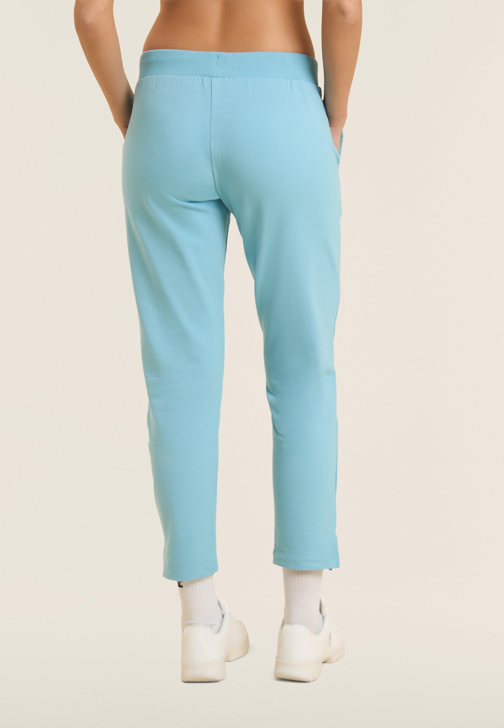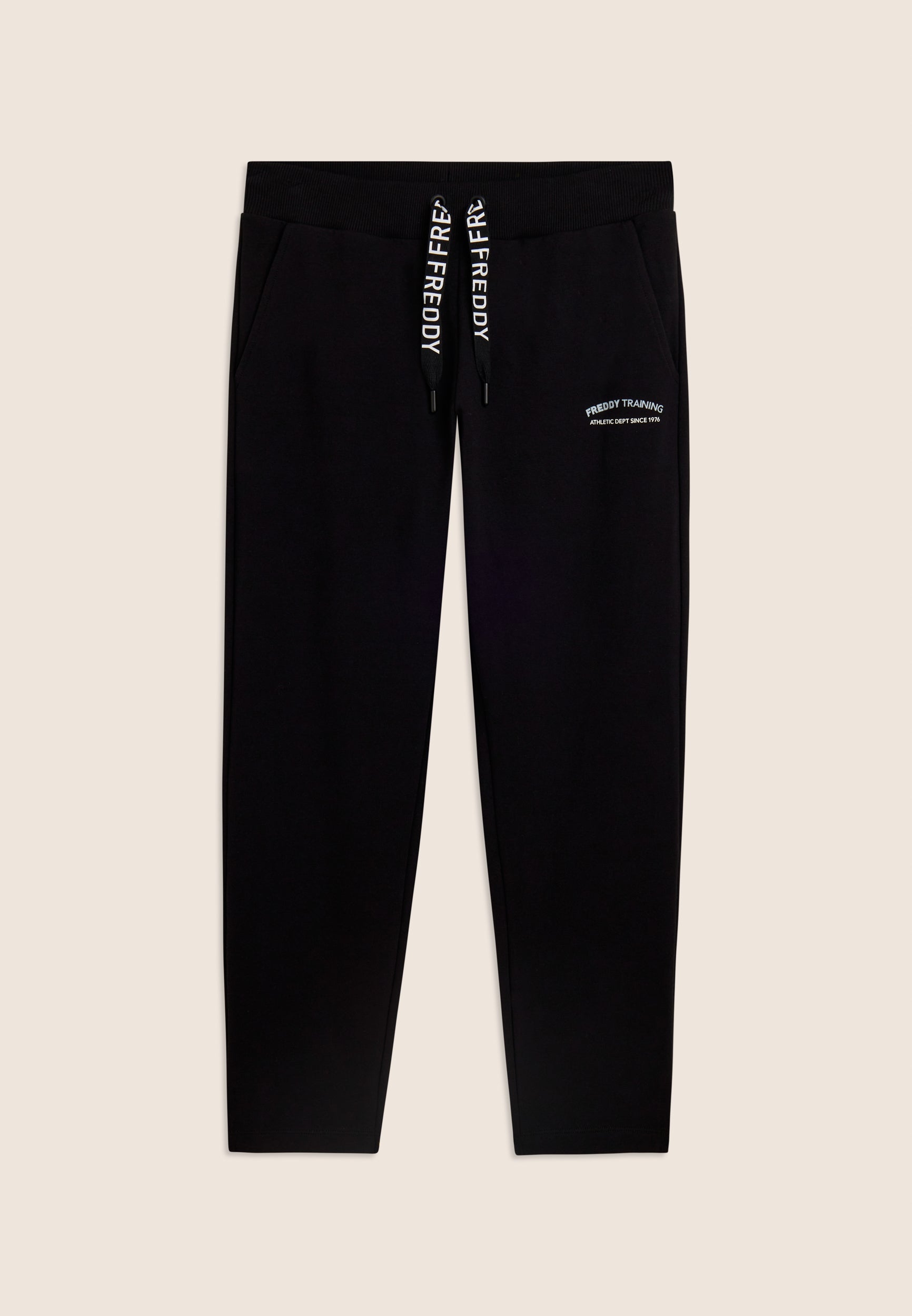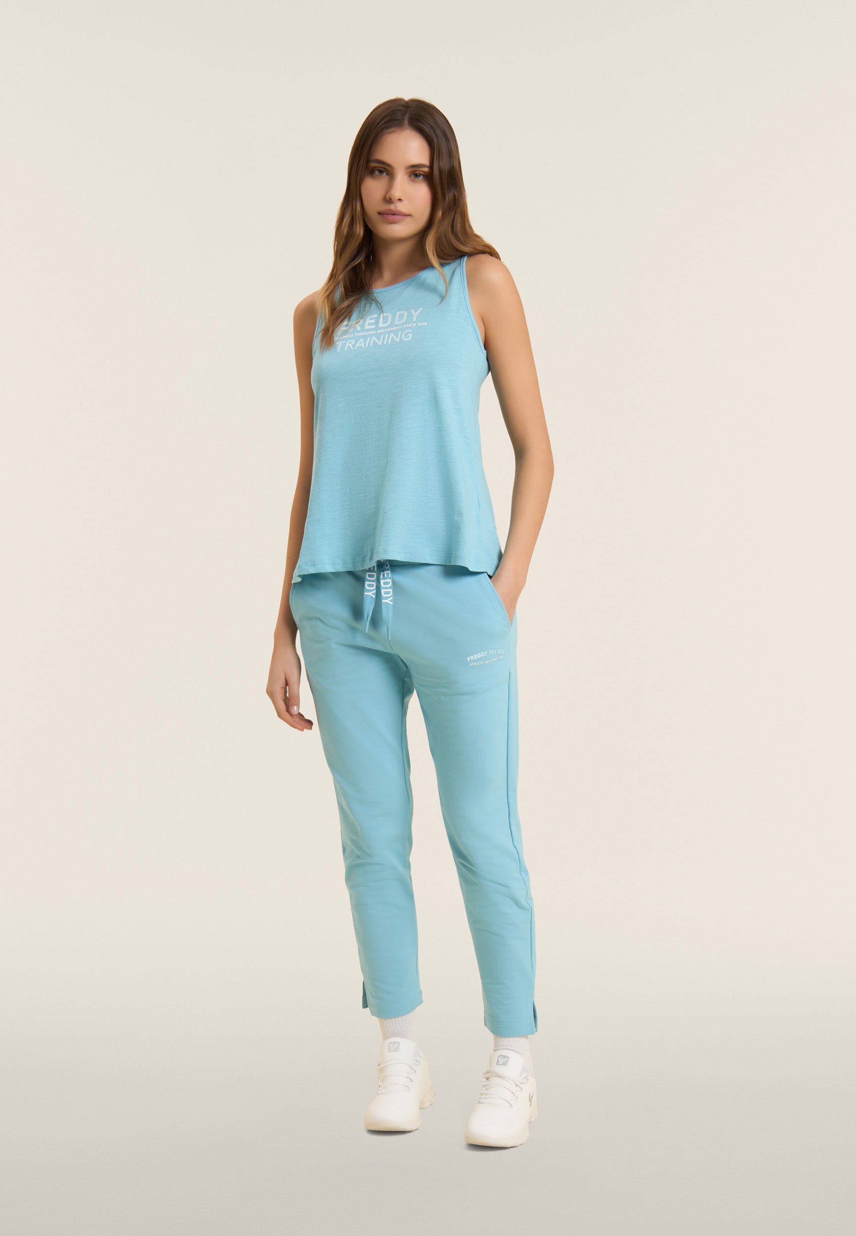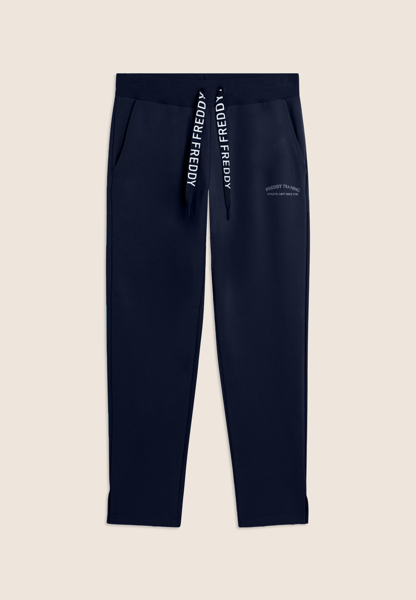 7/8 length trousers, straight bottom with small side slits for a touch of style and practicality. The regular waist with ribbed waistband and FREDDY logo drawstring ensures maximum comfort. The FREDDY logo in white glitter on the left side completes the look. Made of stretch French terry, perfect for mid-season.