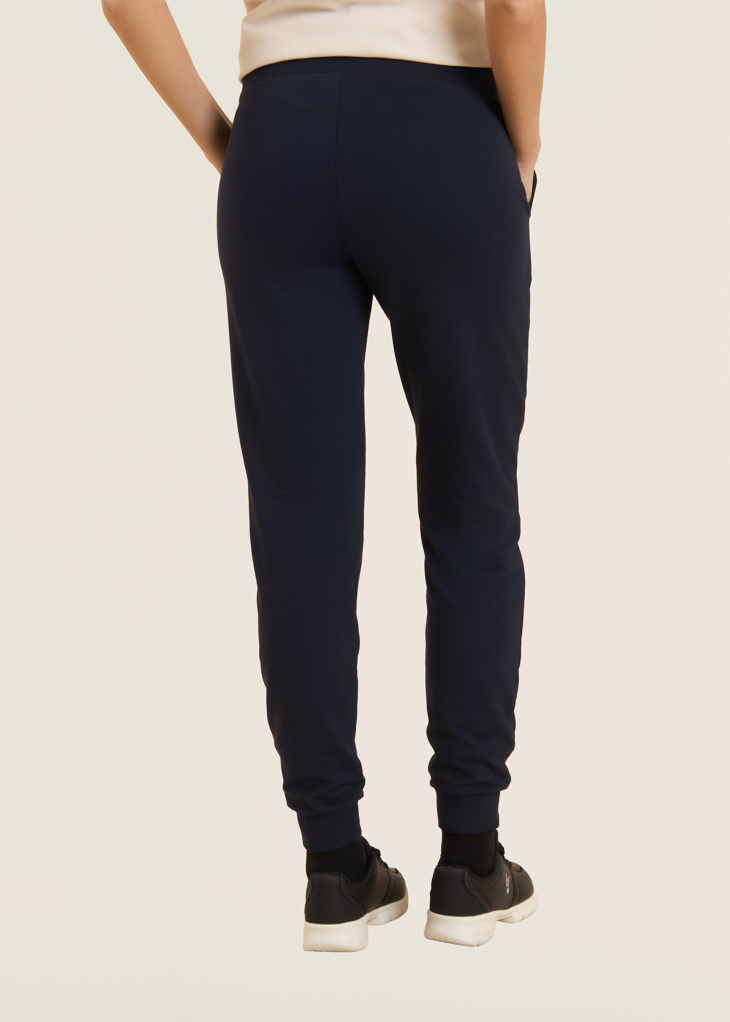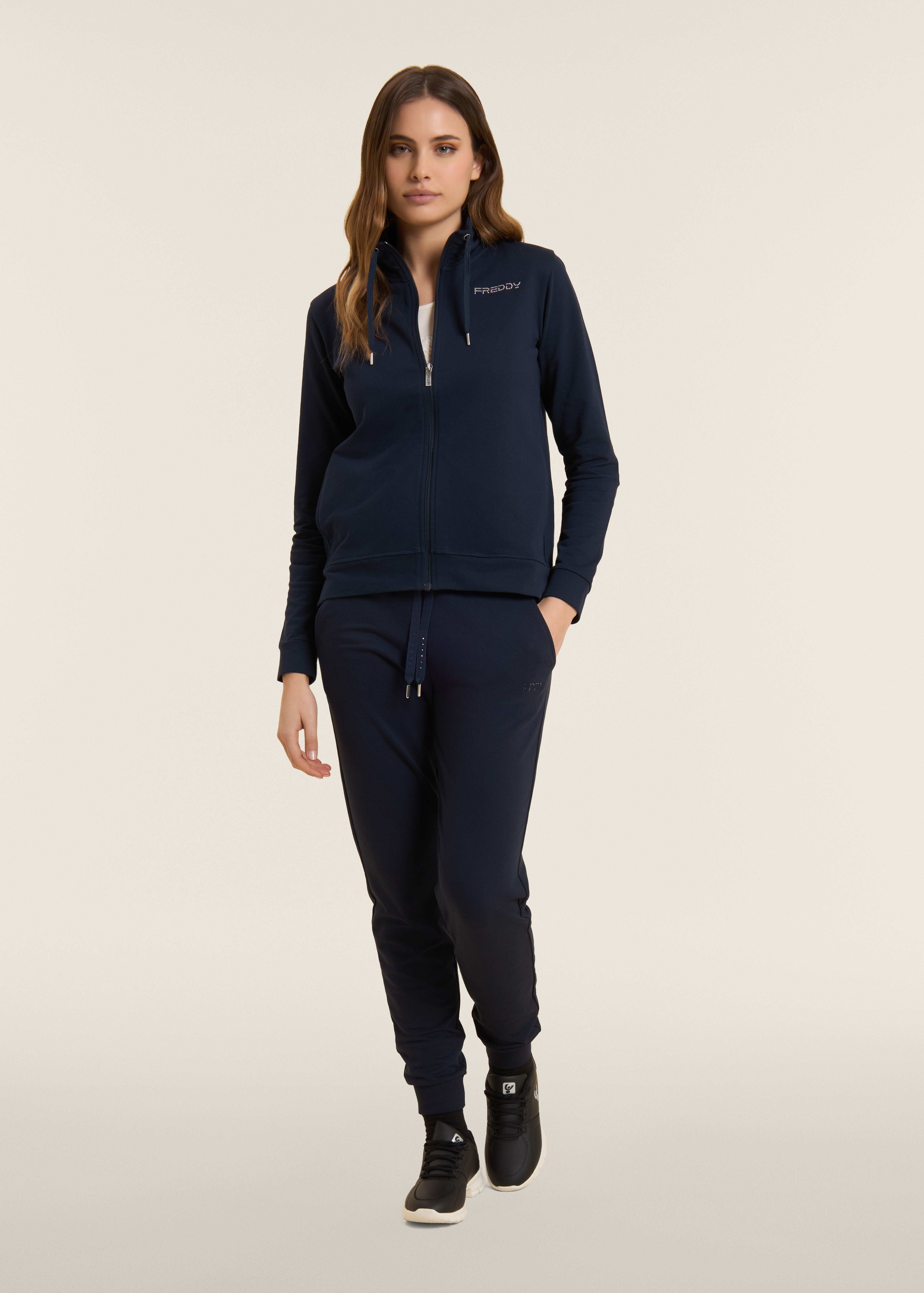 Athletic trousers with a regular fit and regular length, featuring a regular waist with a ribbed band and drawstring. The ribbed cuffed leg creates a dynamic and sporty effect. The FREDDY logo in colour-tone rhinestones, located on the left side, adds brightness to the garment. Slant pockets complete the practical design. The French terry fabric, consisting of modal, cotton and elastane, is soft, stretchy and breathable for optimal comfort and a modern look.