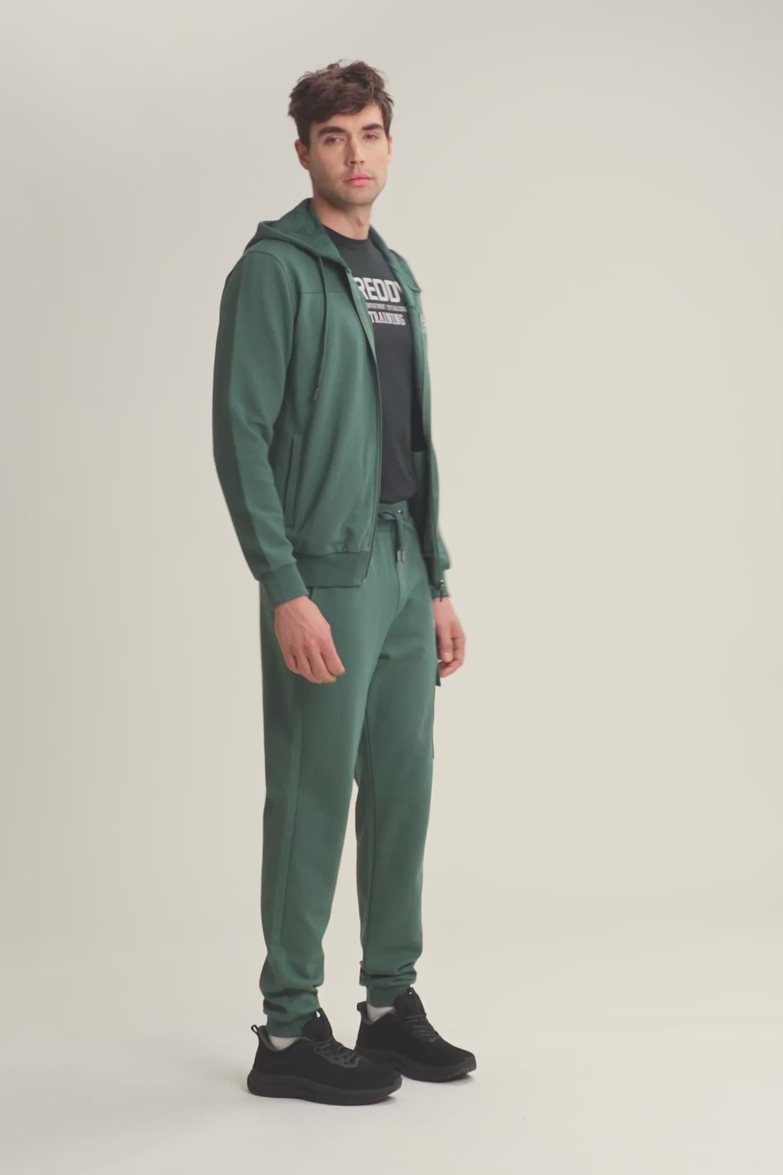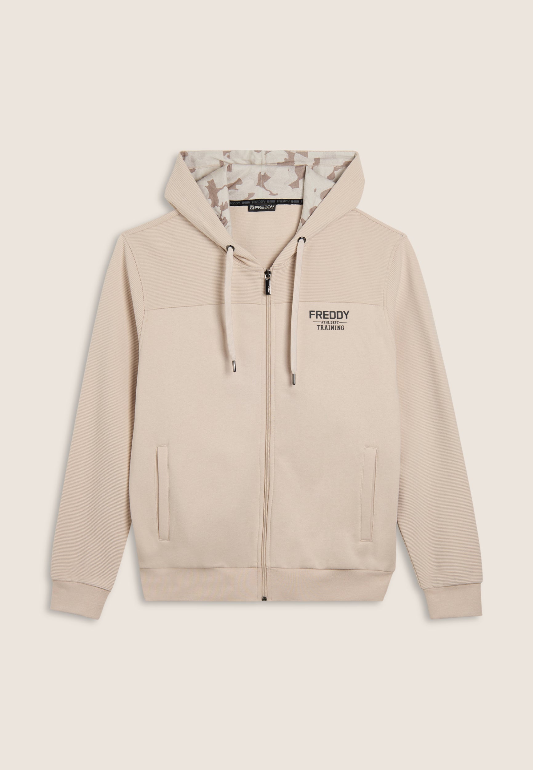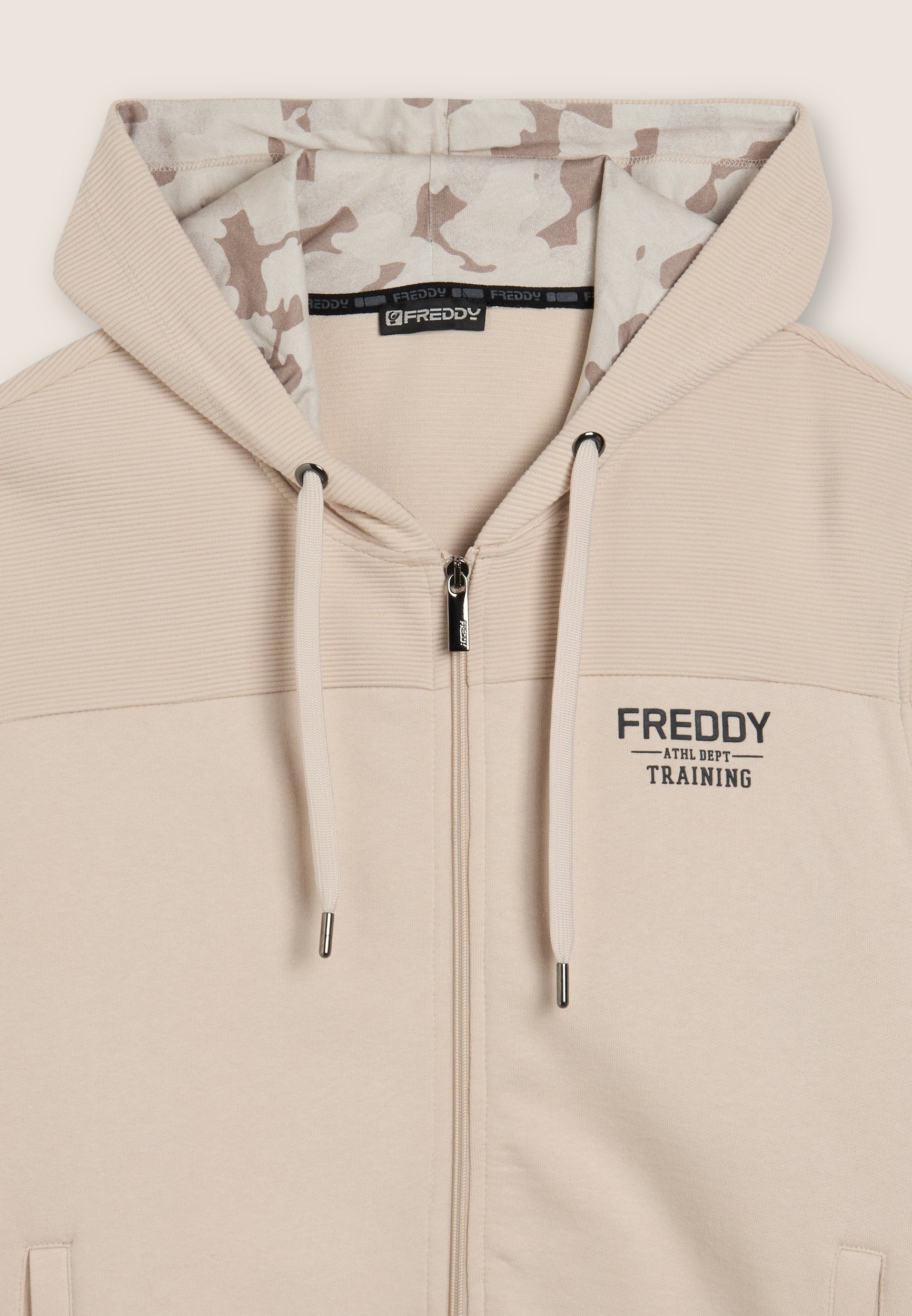 Men's regular fit sweatshirt with full-zip fastening. The torso is made from 100% cotton brushed fleece, while the hood, shoulders and sleeves are in striped sweatshirt fabric. Adjustable drawstring hood with camouflage print jersey lining. Cuffed sleeves, rib-knit hem and besom pockets. FREDDY logo printed on the chest.