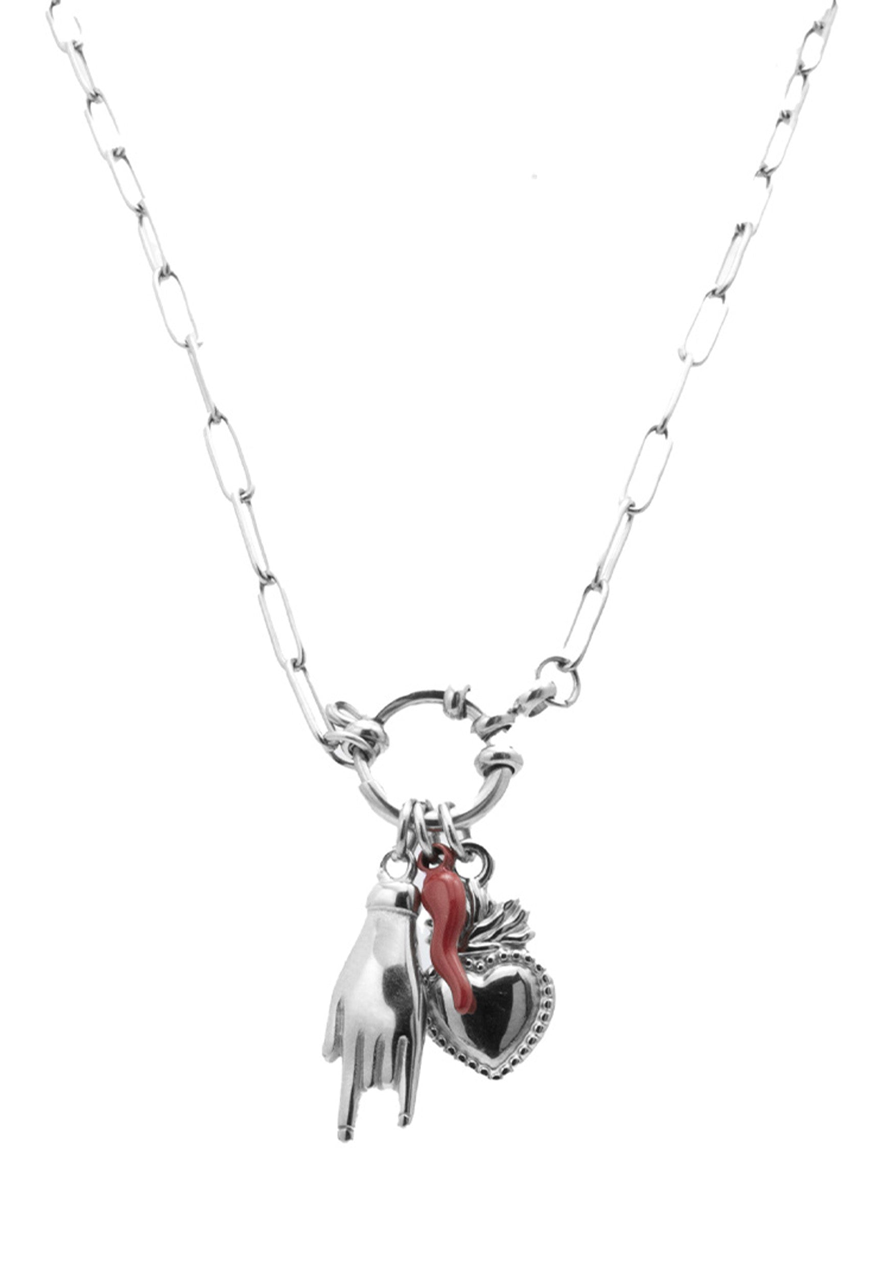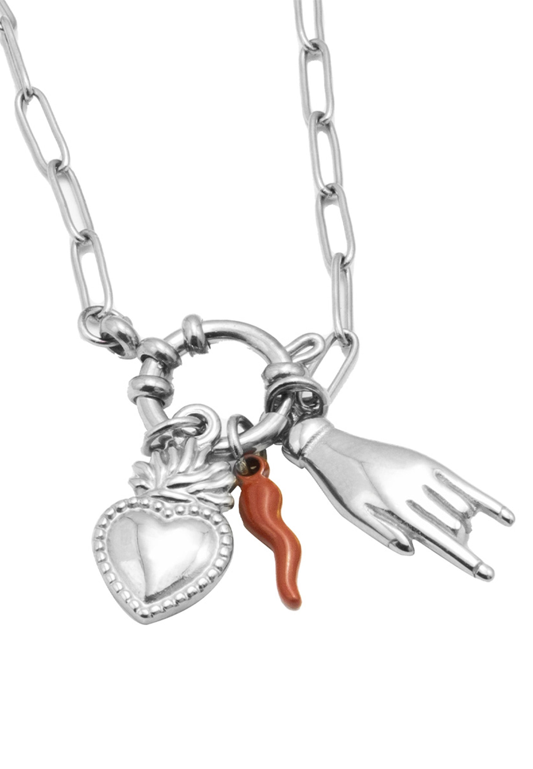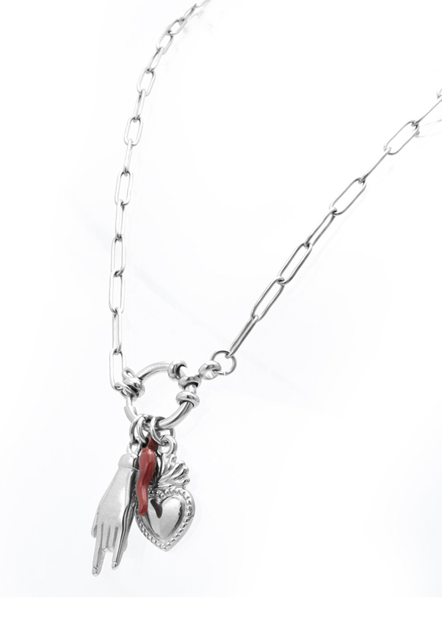 Dai un tocco di significato al tuo stile con questa collana a catena in acciaio inossidabile 316L ipoallergenico dalla raffinata finitura argento. Con una lunghezza di 45 cm, è perfetta per un comfort quotidiano senza rinunciare all'eleganza. I tre pendenti portafortuna – tra cui un cuore sacro e un cornetto rosso – aggiungono un simbolismo speciale a un design moderno e versatile. Un accessorio che unisce stile e tradizione, perfetto per esaltare ogni outfit con classe e personalità.