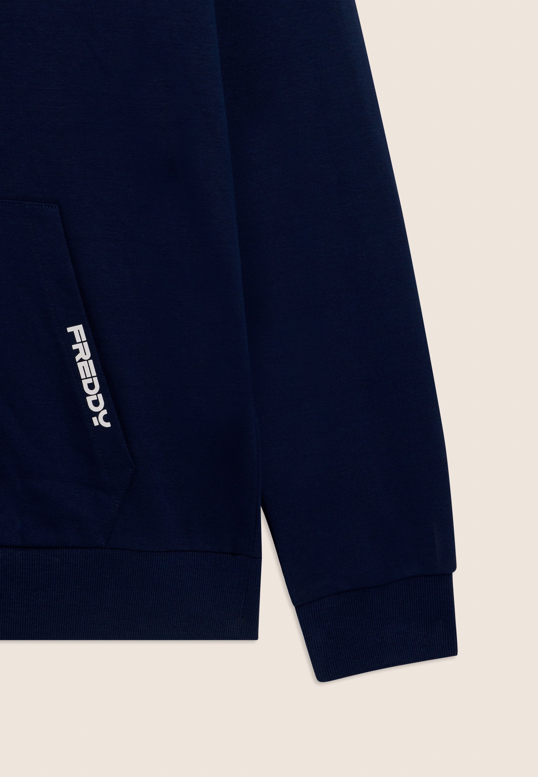 Hoodie with a colour block design, perfect for a minimalist yet distinctive style. The hood is jersey-lined and fitted with a drawstring. Regular fit and length, with ribbed hem and cuffs. The upper part is separated from the lower part by a black elastic insert with a repeated white FREDDY logo. The pouch pocket is complemented by a matt rubberised FREDDY logo print on the left opening. Made of 100% cotton interlock, compact but comfortable.