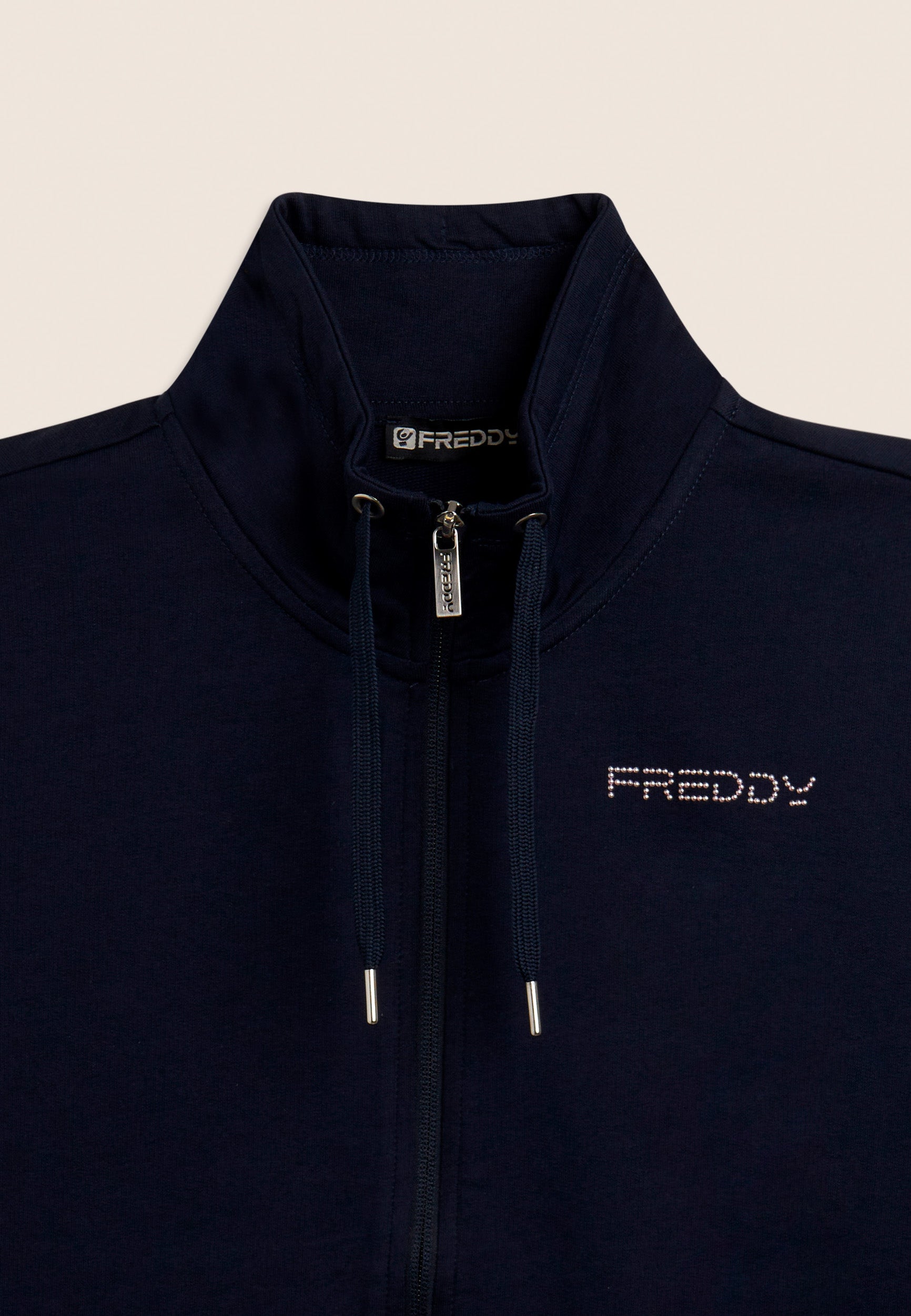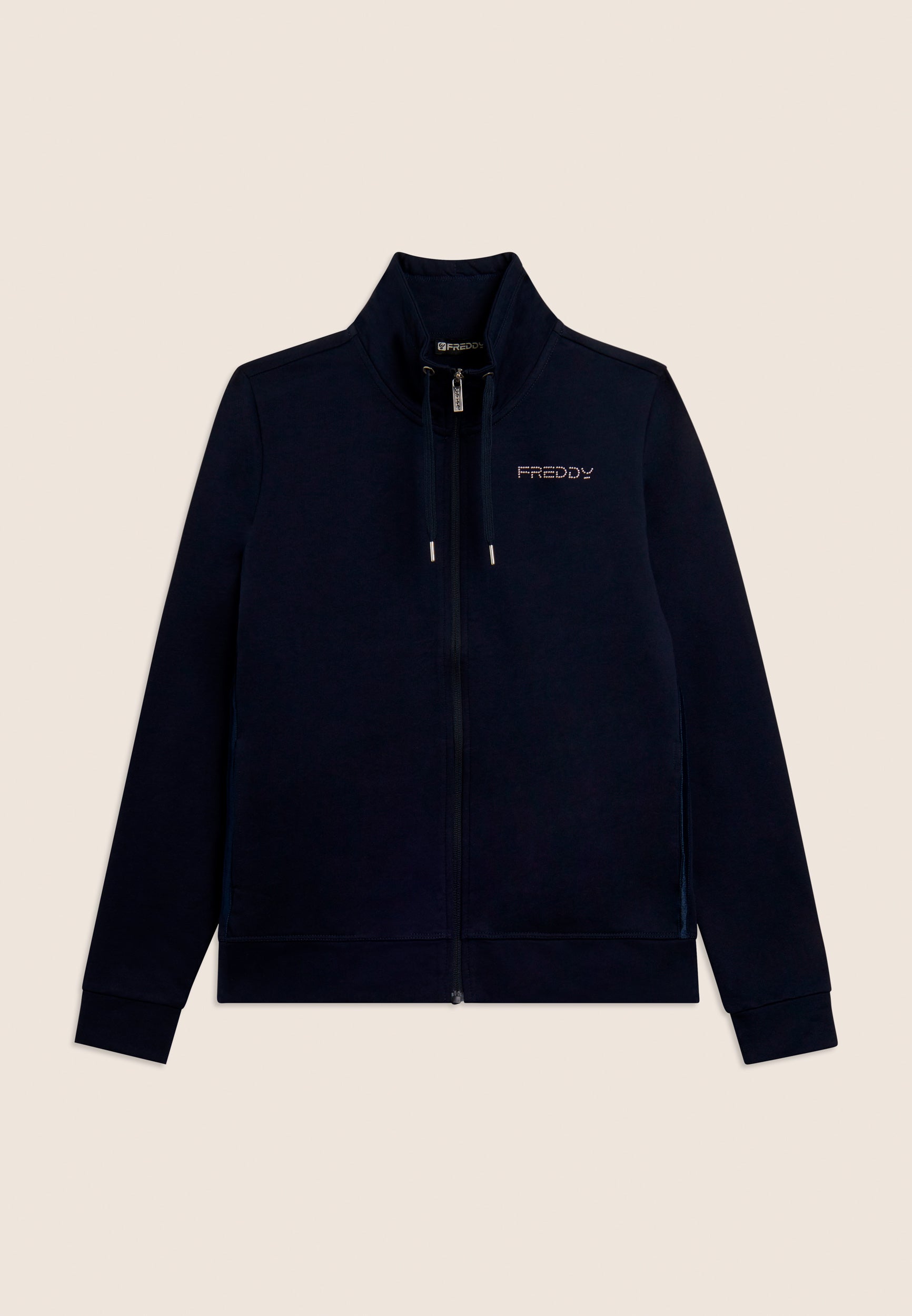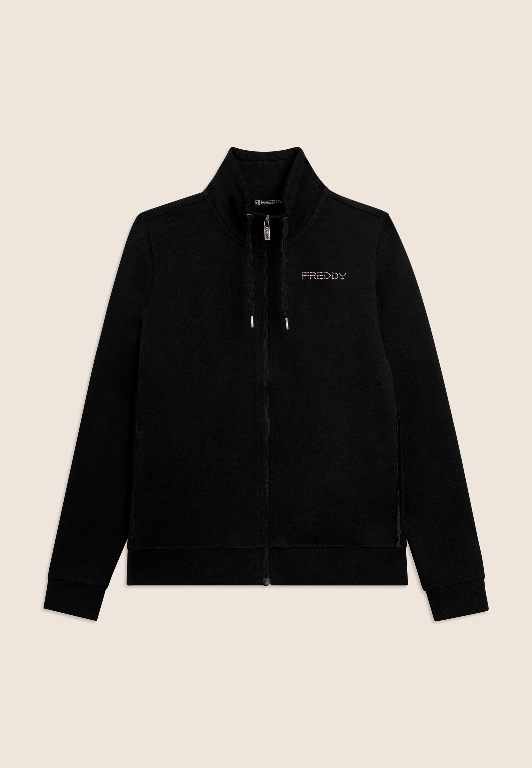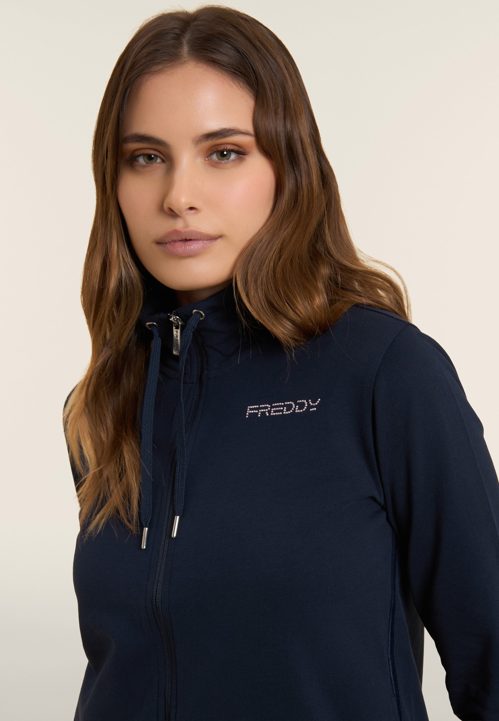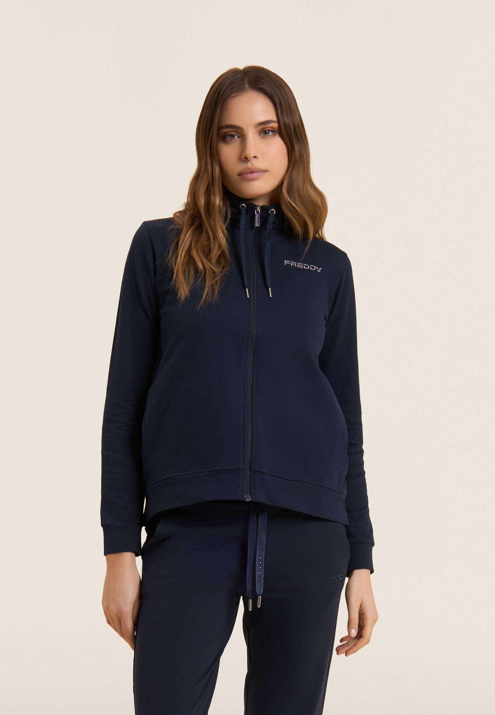 High-necked, zip sweatshirt with a comfortable and practical design, perfect for leisure time. The regular fit and straight bottom with band and side slits guarantee comfort and freedom of movement. The high neck with drawstring and cuffed sleeves add practicality. The FREDDY logo in light pink beads on the heart and shiny elastic inserts decorate the side seams. Made of heavy cotton stretch jersey, ideal for low-intensity sports.