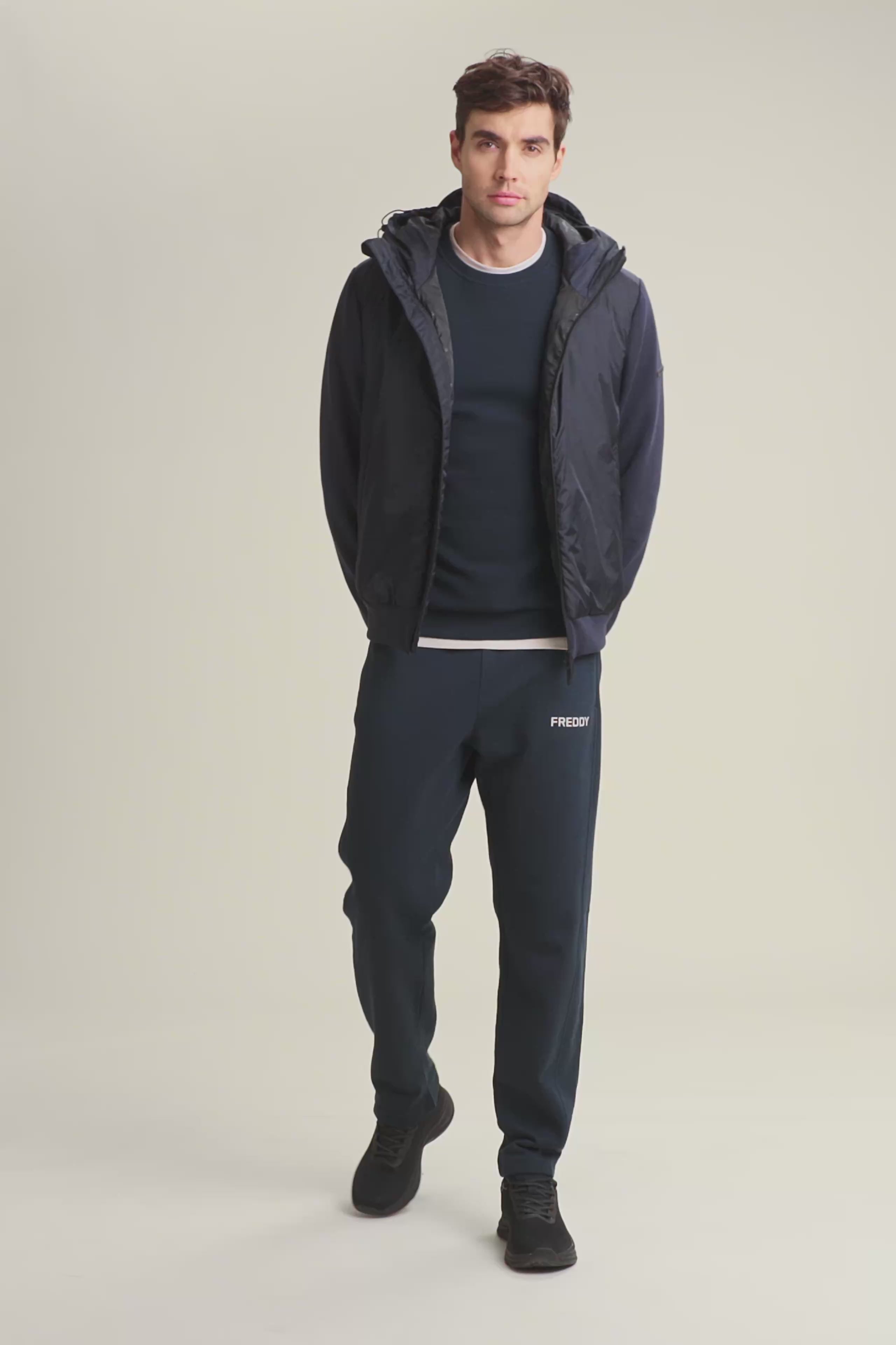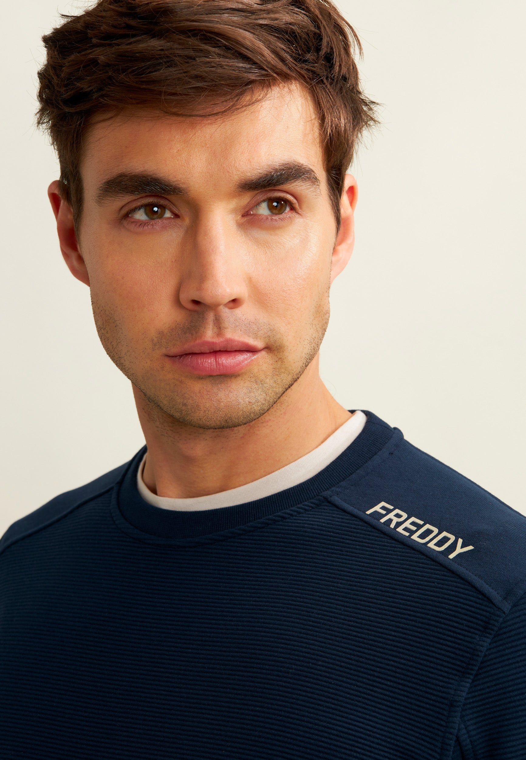 Men's regular fit sweatshirt made from soft and structured stretch sweatshirt fabric with striped texture. It features a crew neck and long cuffed sleeves. The FREDDY logo is printed on the left shoulder, with additional graphics on the bottom of the left sleeve. Ribbed waistband.