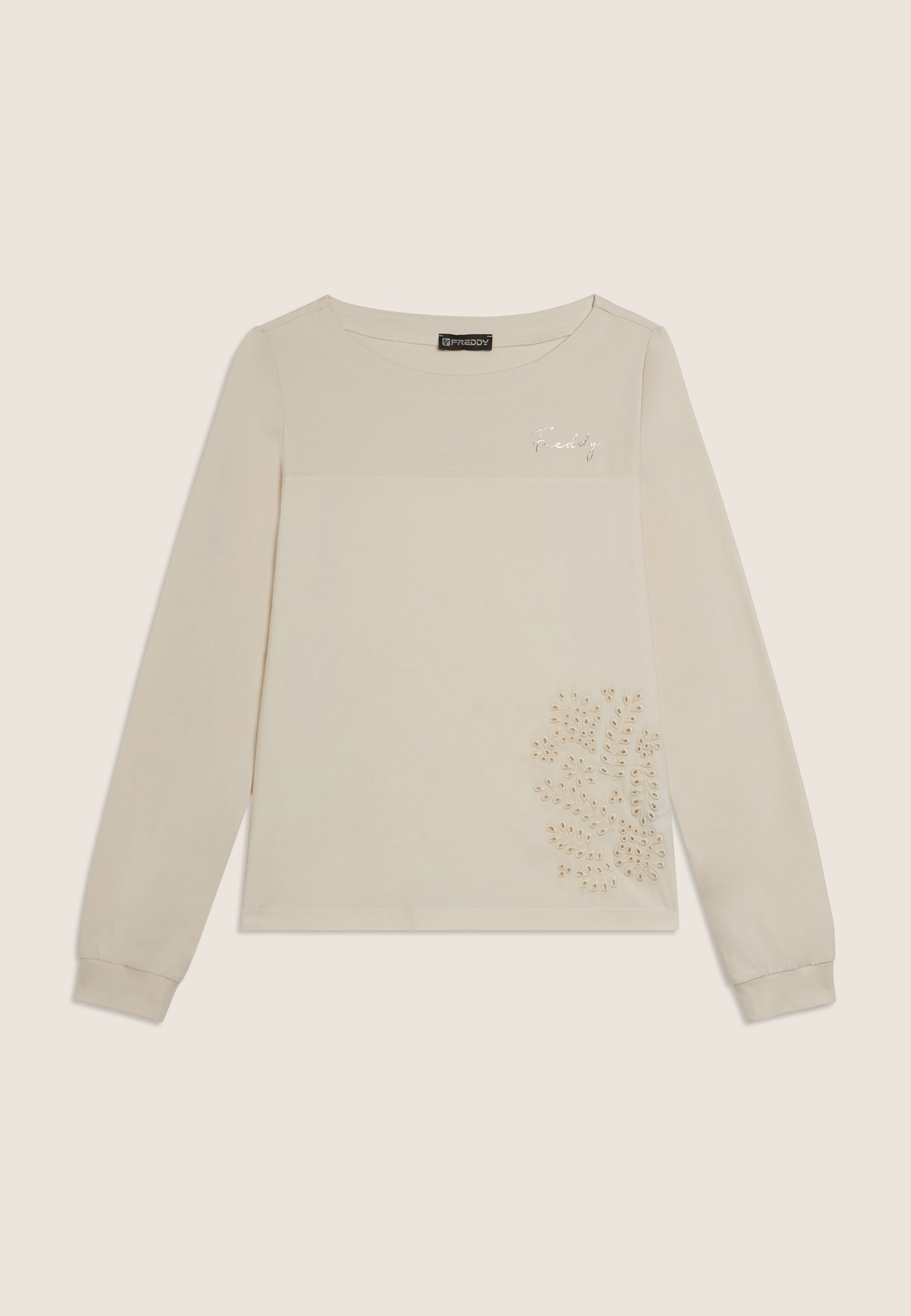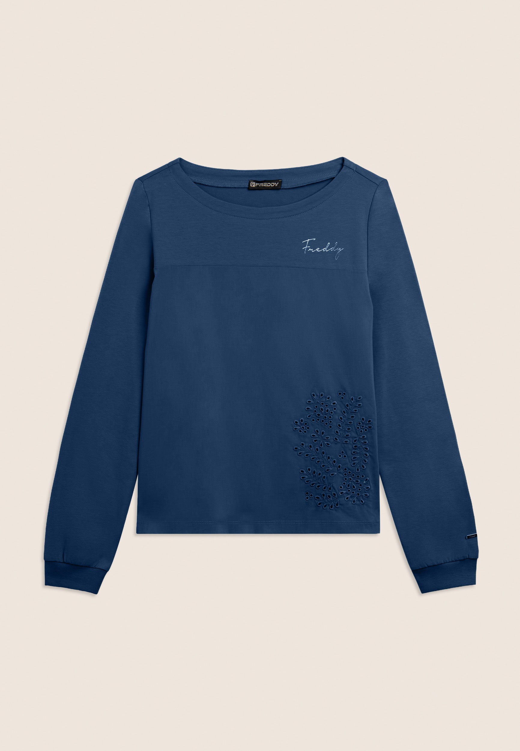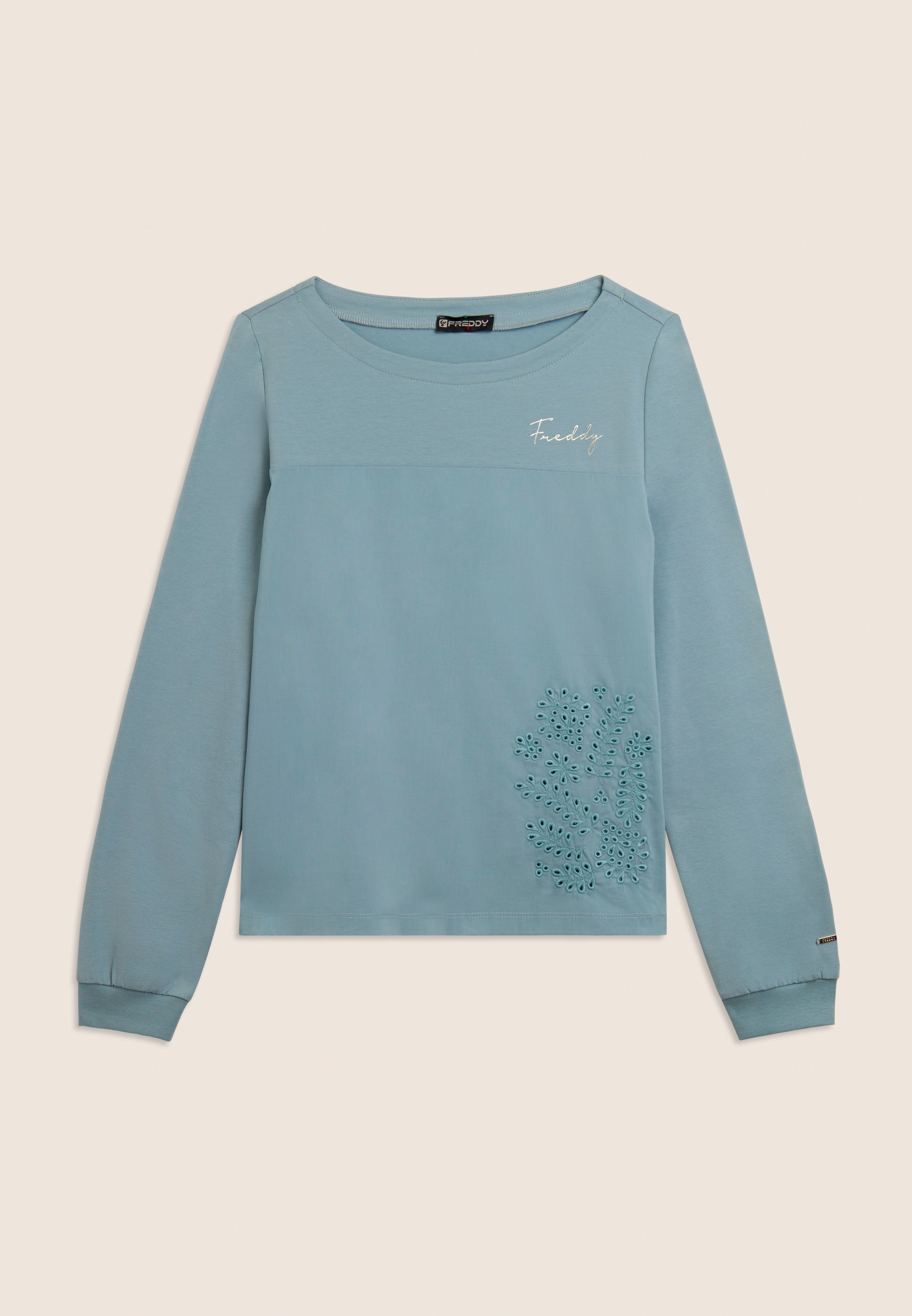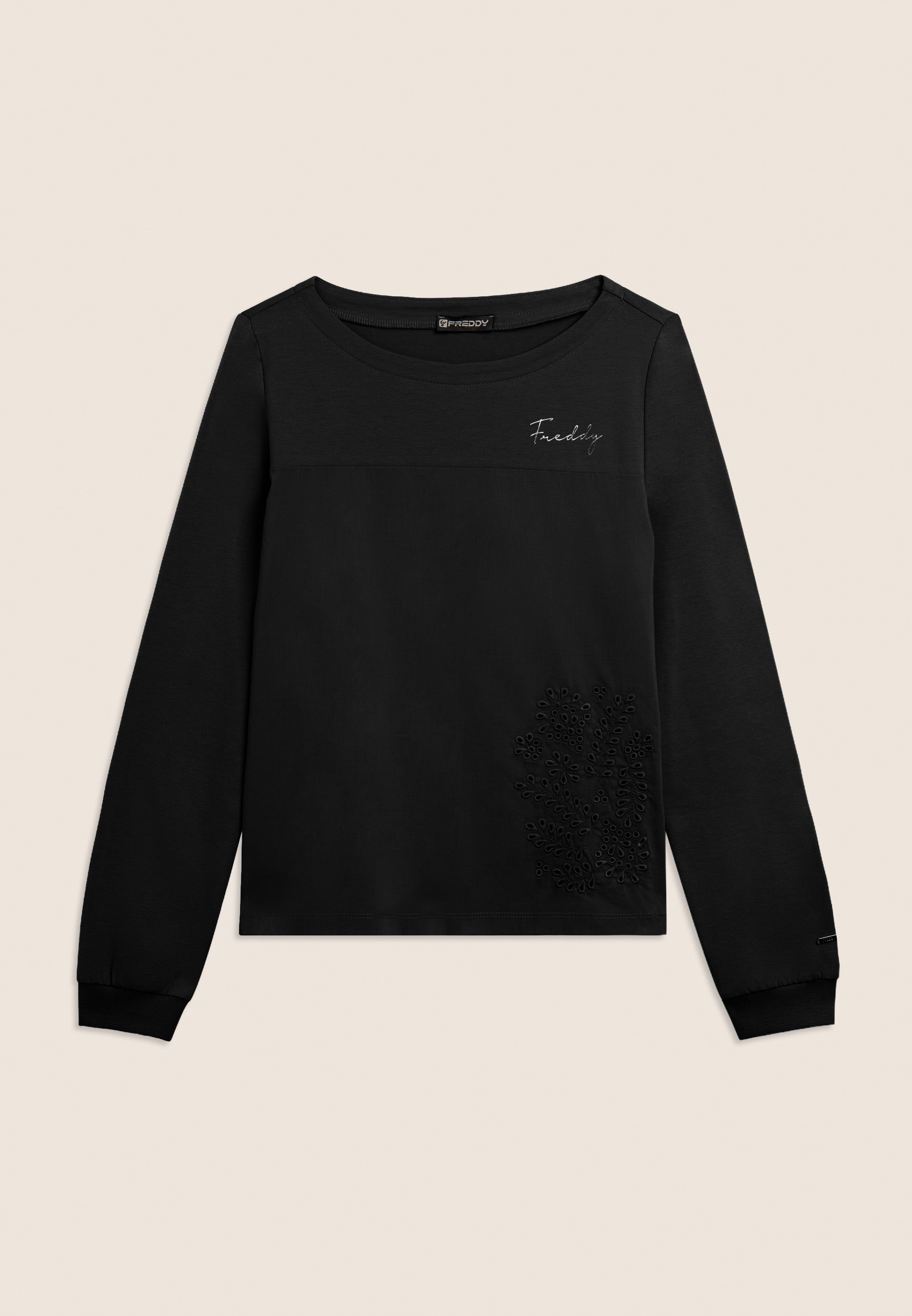 Regular-fit, standard-length sweatshirt with straight hem and boat neck. The long sleeves are finished with ribbed cuffs for a neat look. The front of the bust is in stretch poplin fabric, decorated with broderie anglaise-style floral embroidery on the side. A small embroidery logo on the heart and a golden FREDDY logo tab on the bottom left sleeve complete the elegant design. Made of heavy cotton stretch jersey, the sweatshirt is ideal for those seeking comfort and style.