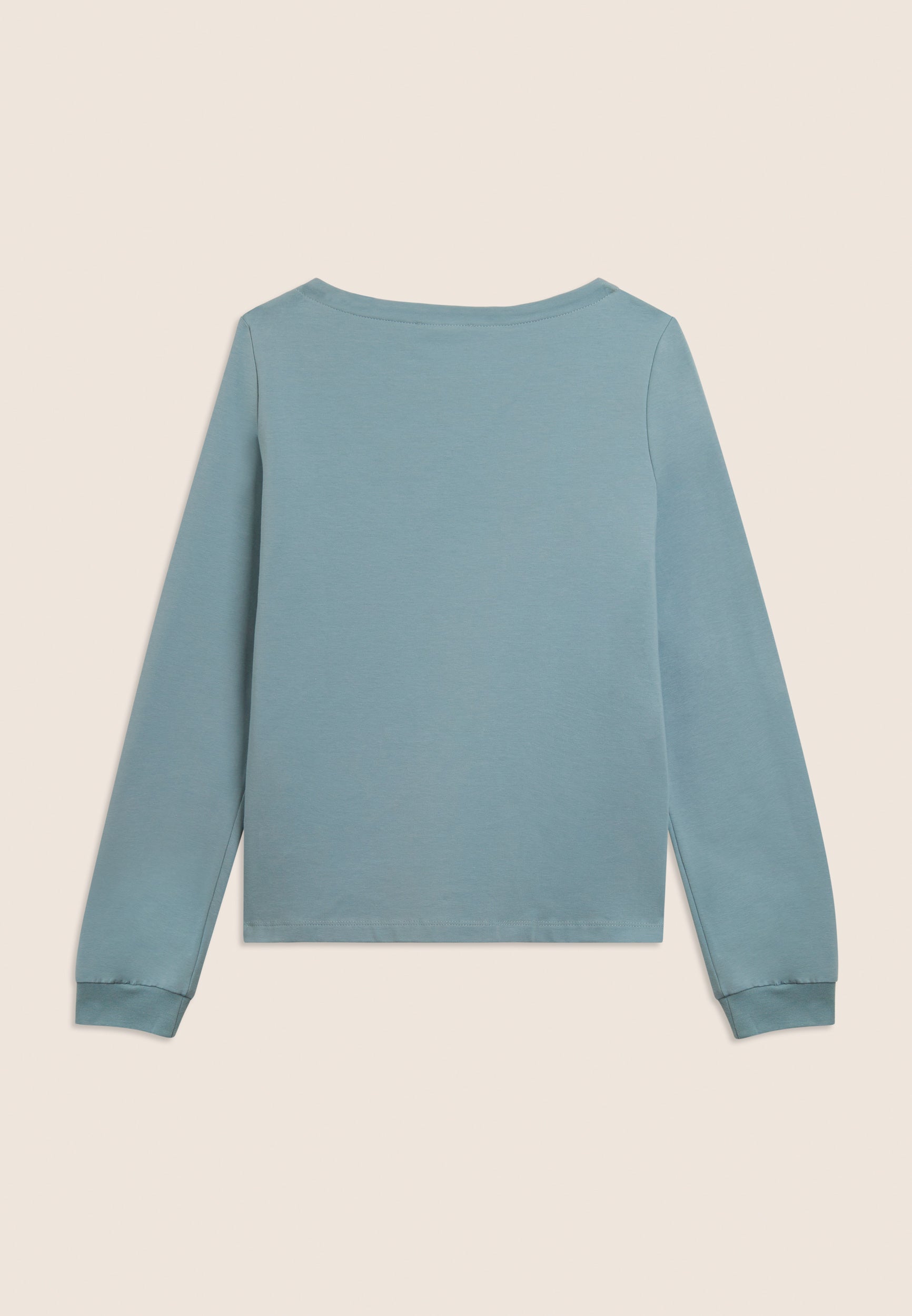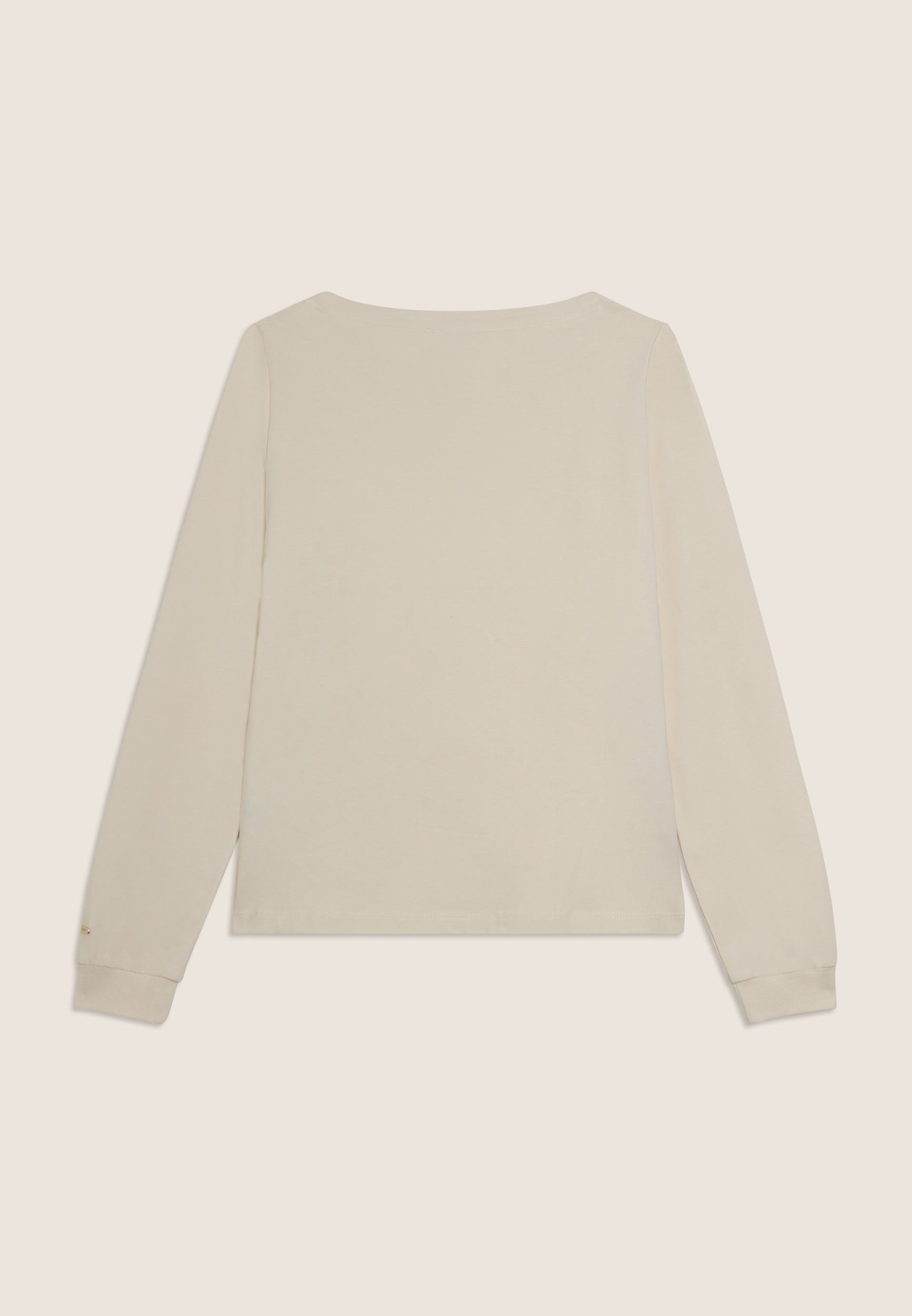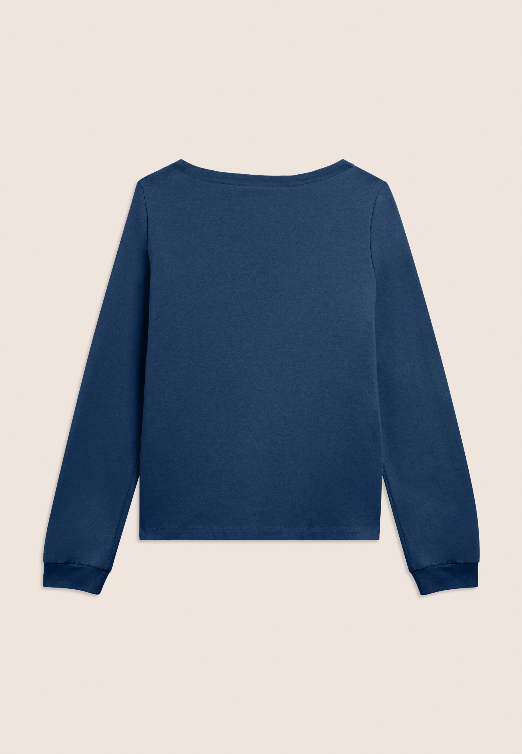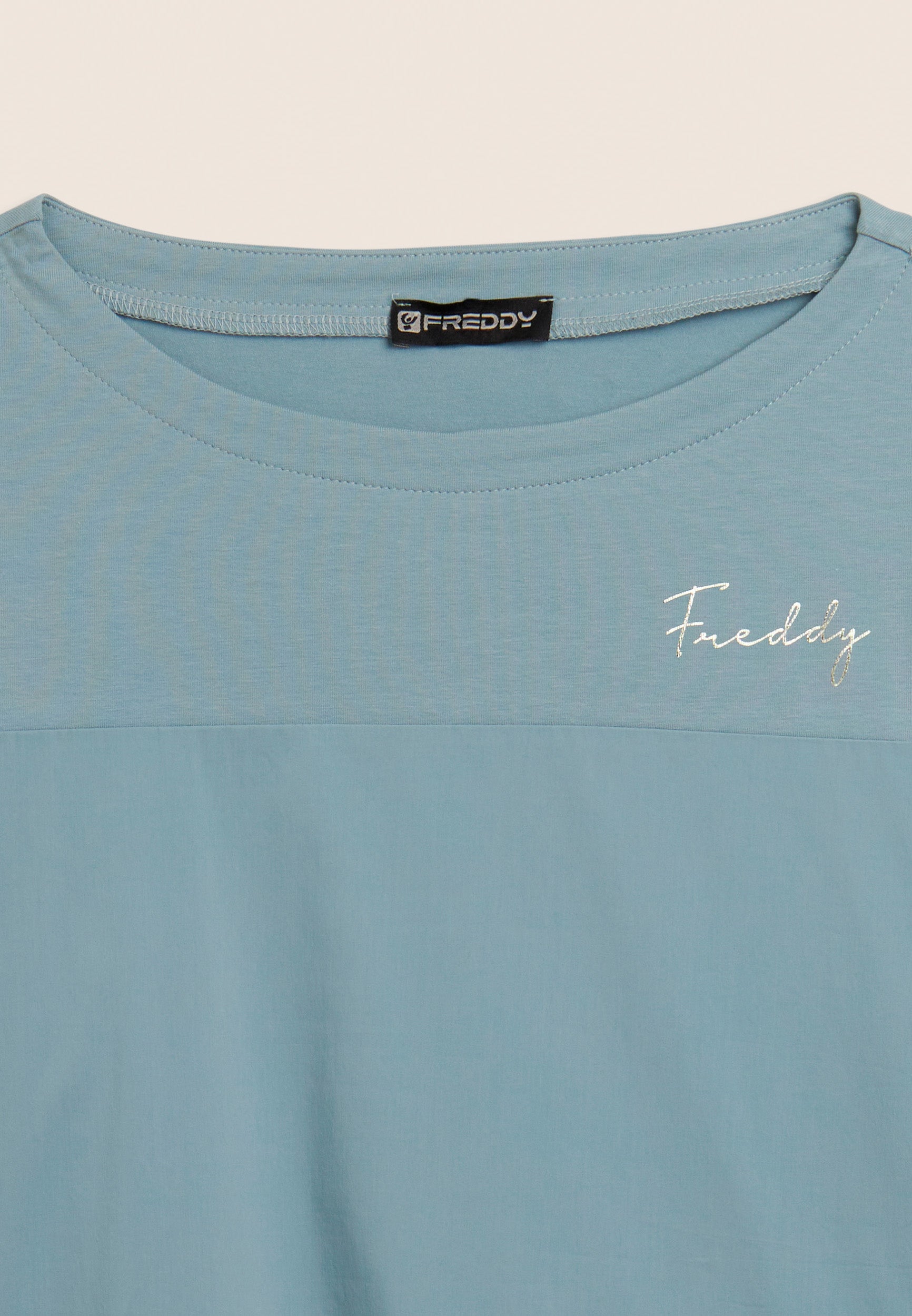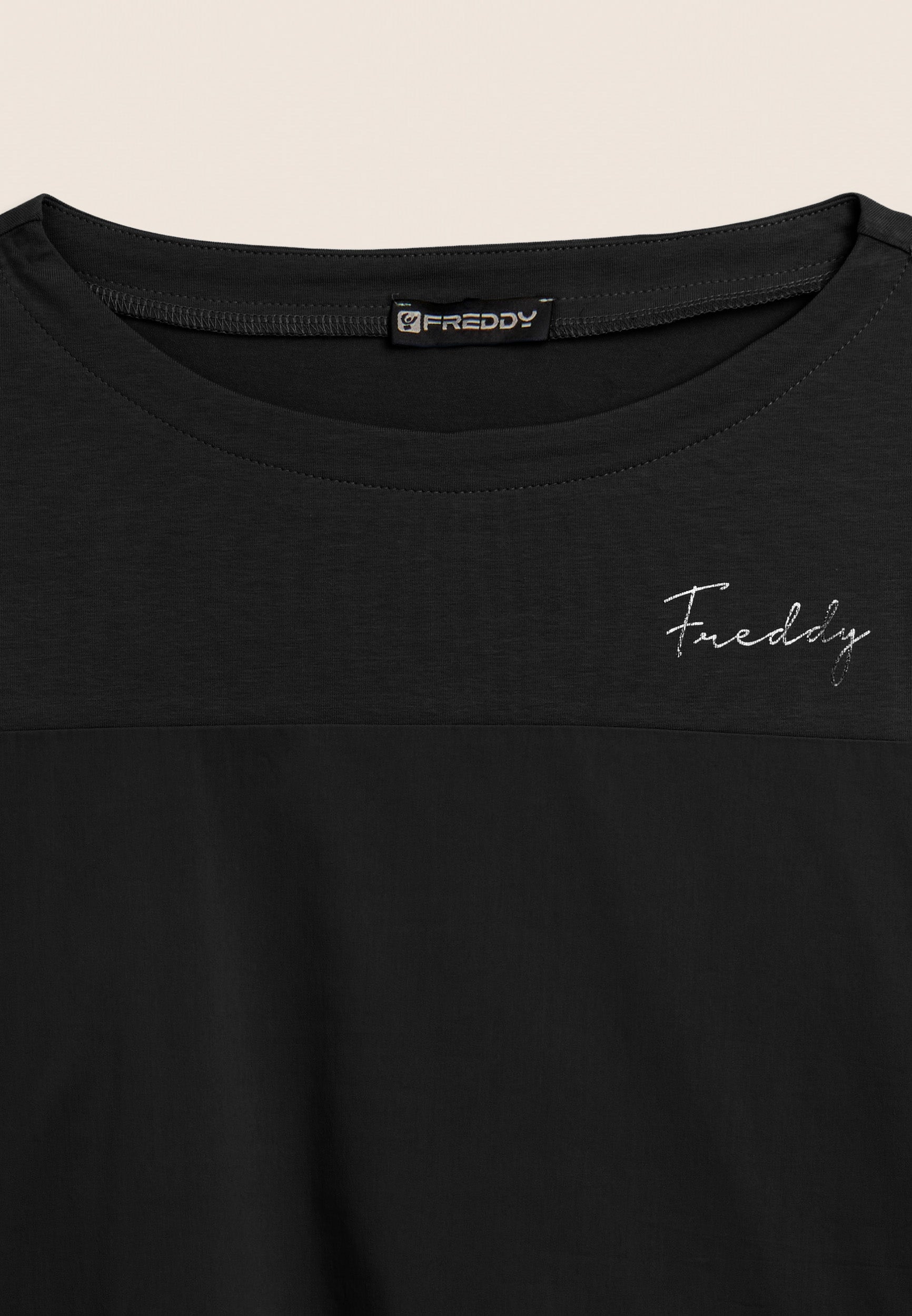 Regular-fit, standard-length sweatshirt with straight hem and boat neck. The long sleeves are finished with ribbed cuffs for a neat look. The front of the bust is in stretch poplin fabric, decorated with broderie anglaise-style floral embroidery on the side. A small embroidery logo on the heart and a golden FREDDY logo tab on the bottom left sleeve complete the elegant design. Made of heavy cotton stretch jersey, the sweatshirt is ideal for those seeking comfort and style.