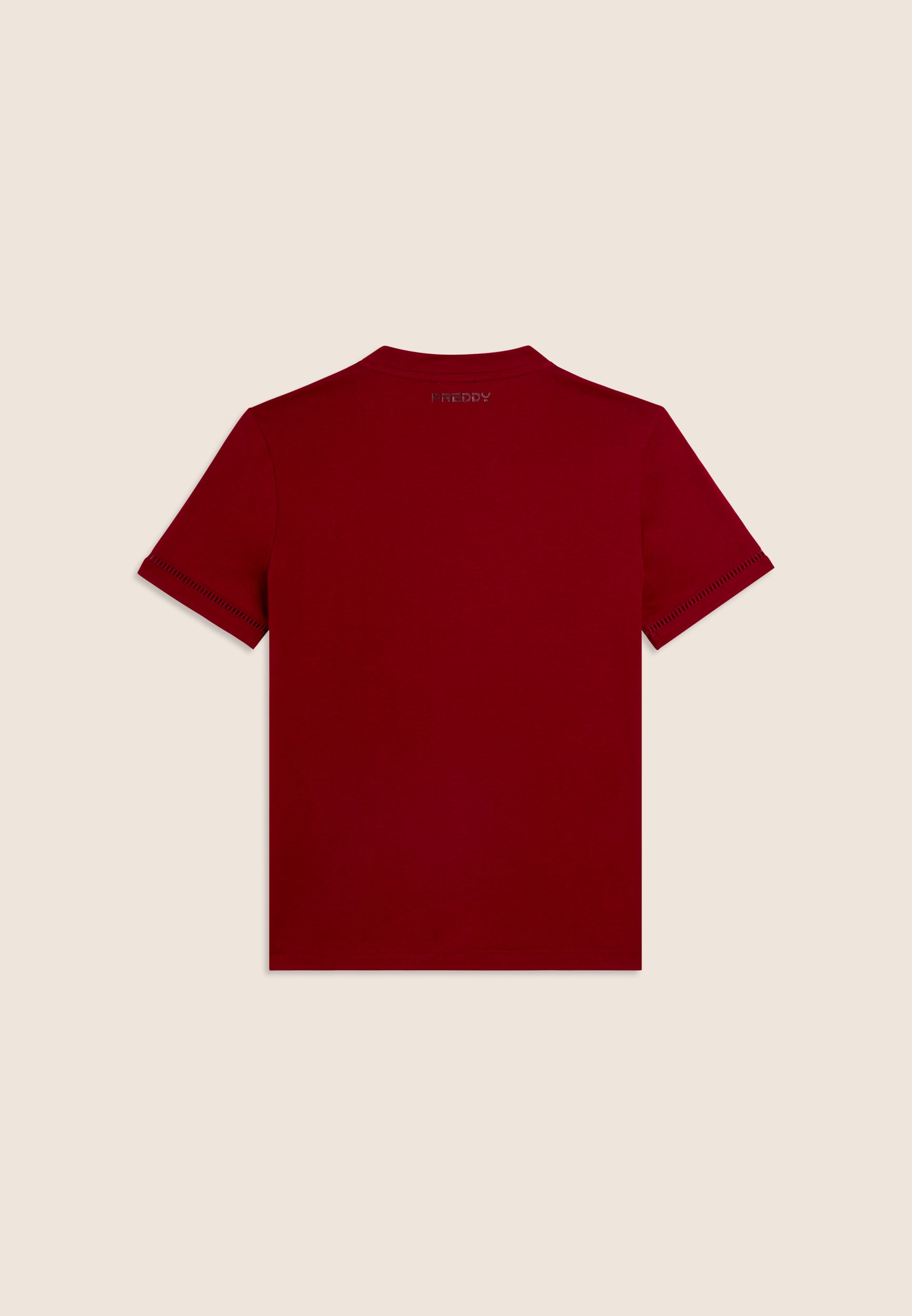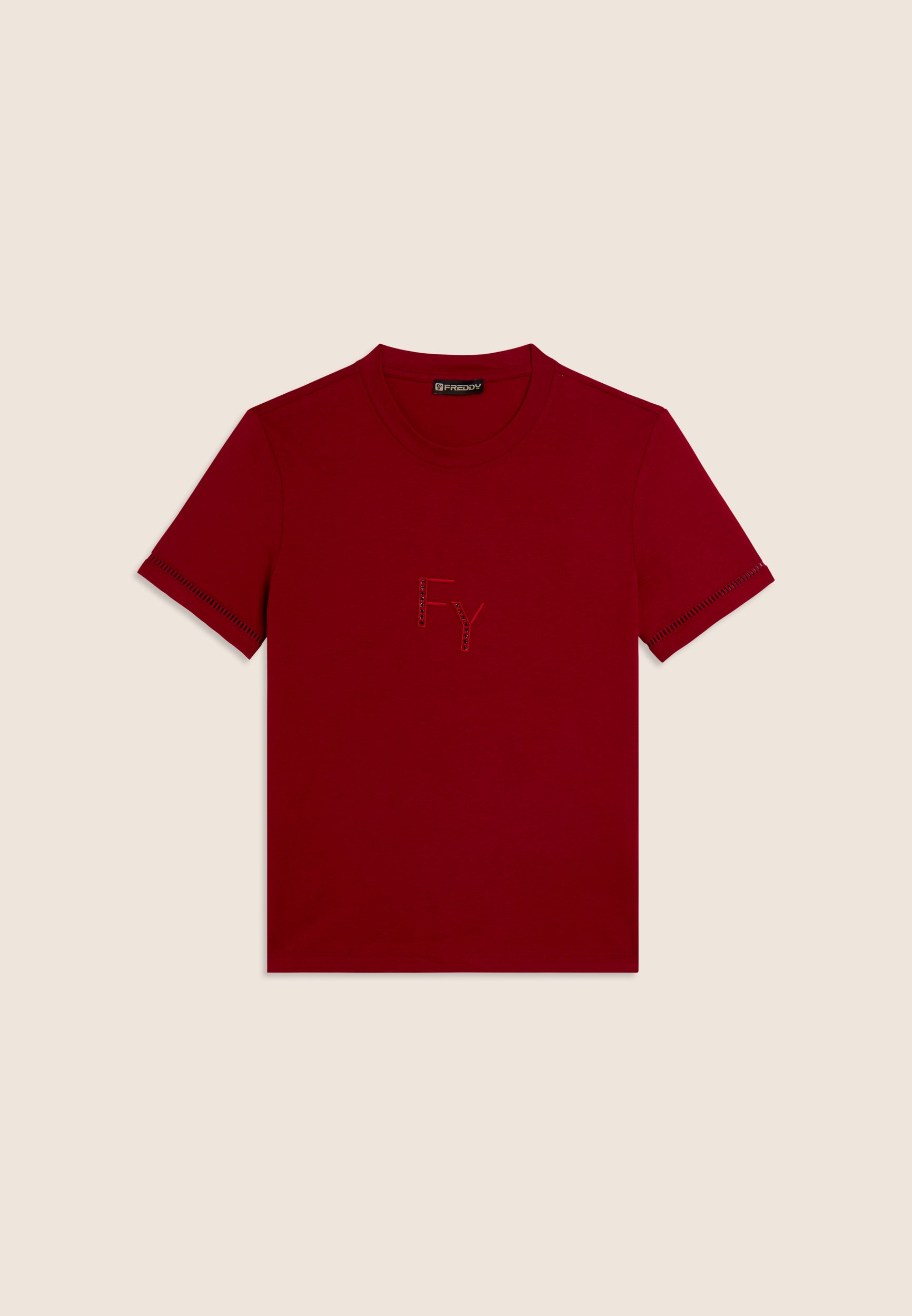 Regular-fit, standard-length t-shirt with straight hem. The minimalist design of crew neckline and short sleeves is enriched by the FY logo embroidered in a perforated form on the front, and the sleeve bottoms feature a decorative detail. A small Freddy logo is printed under the back neckline. Made of 100% cotton jersey, it guarantees comfort and breathability.