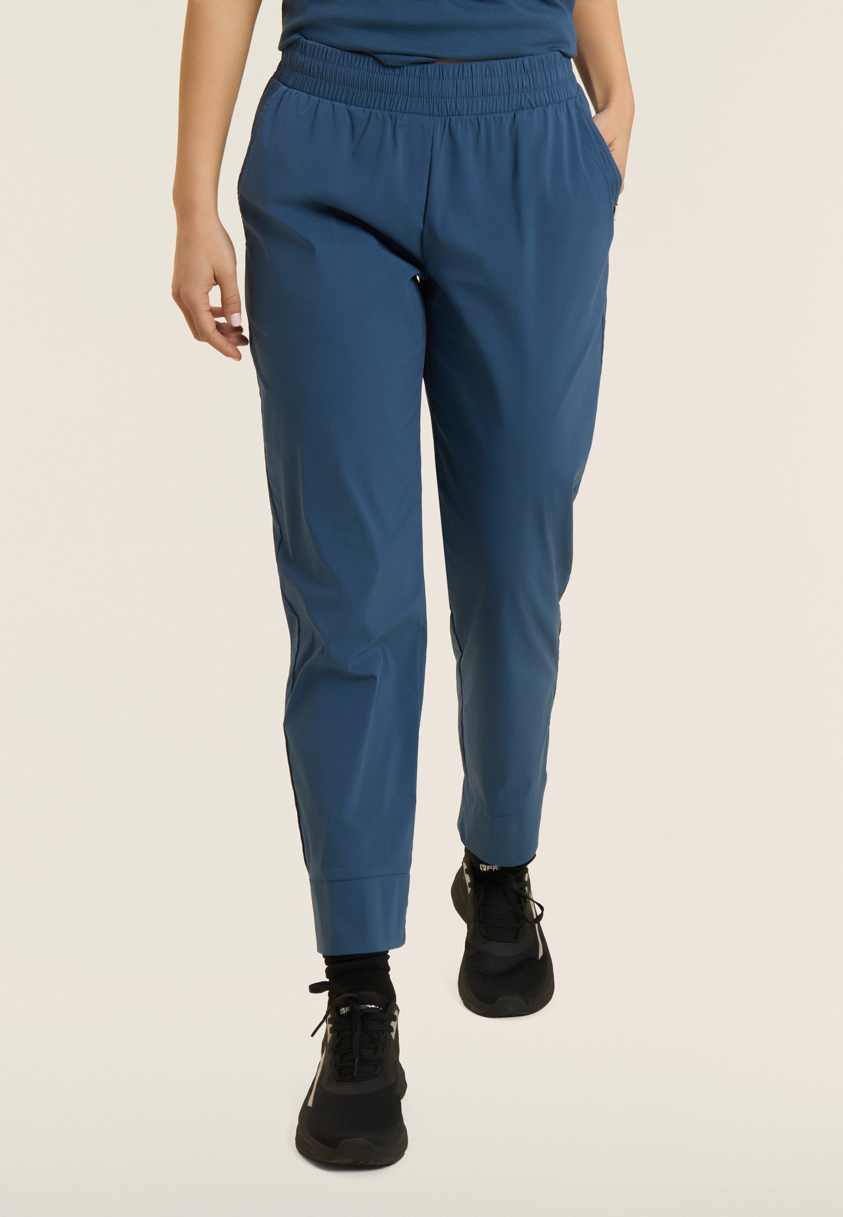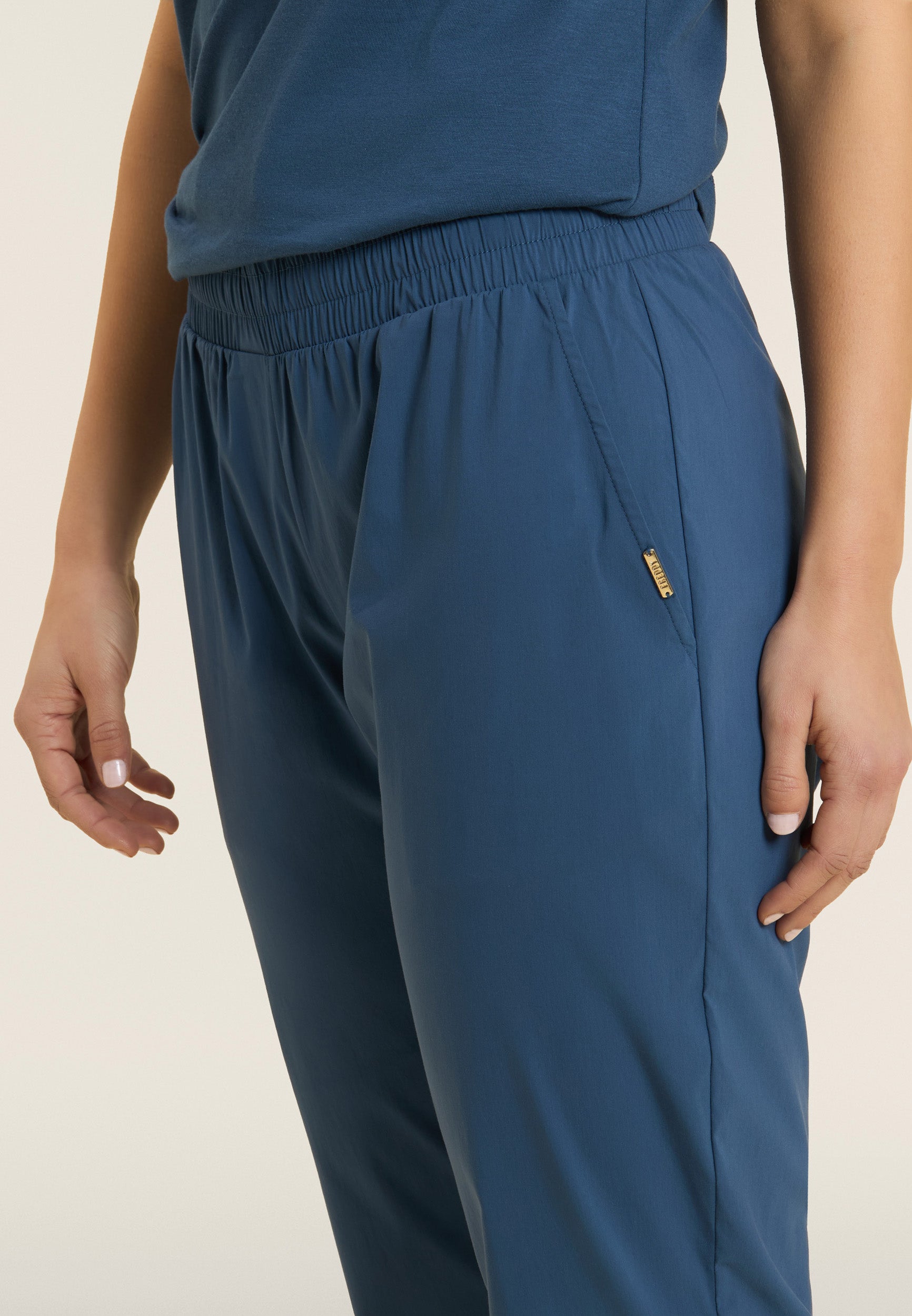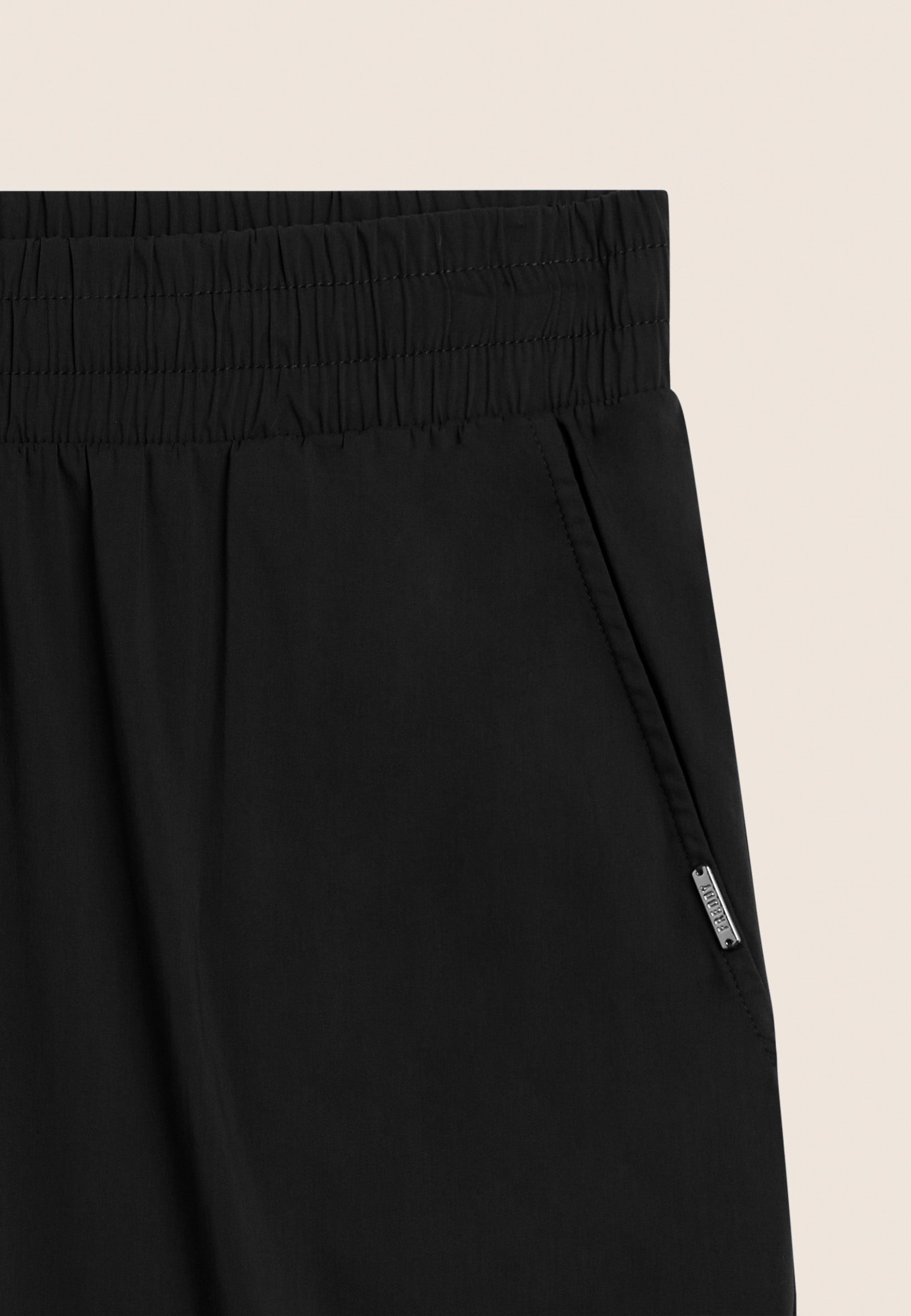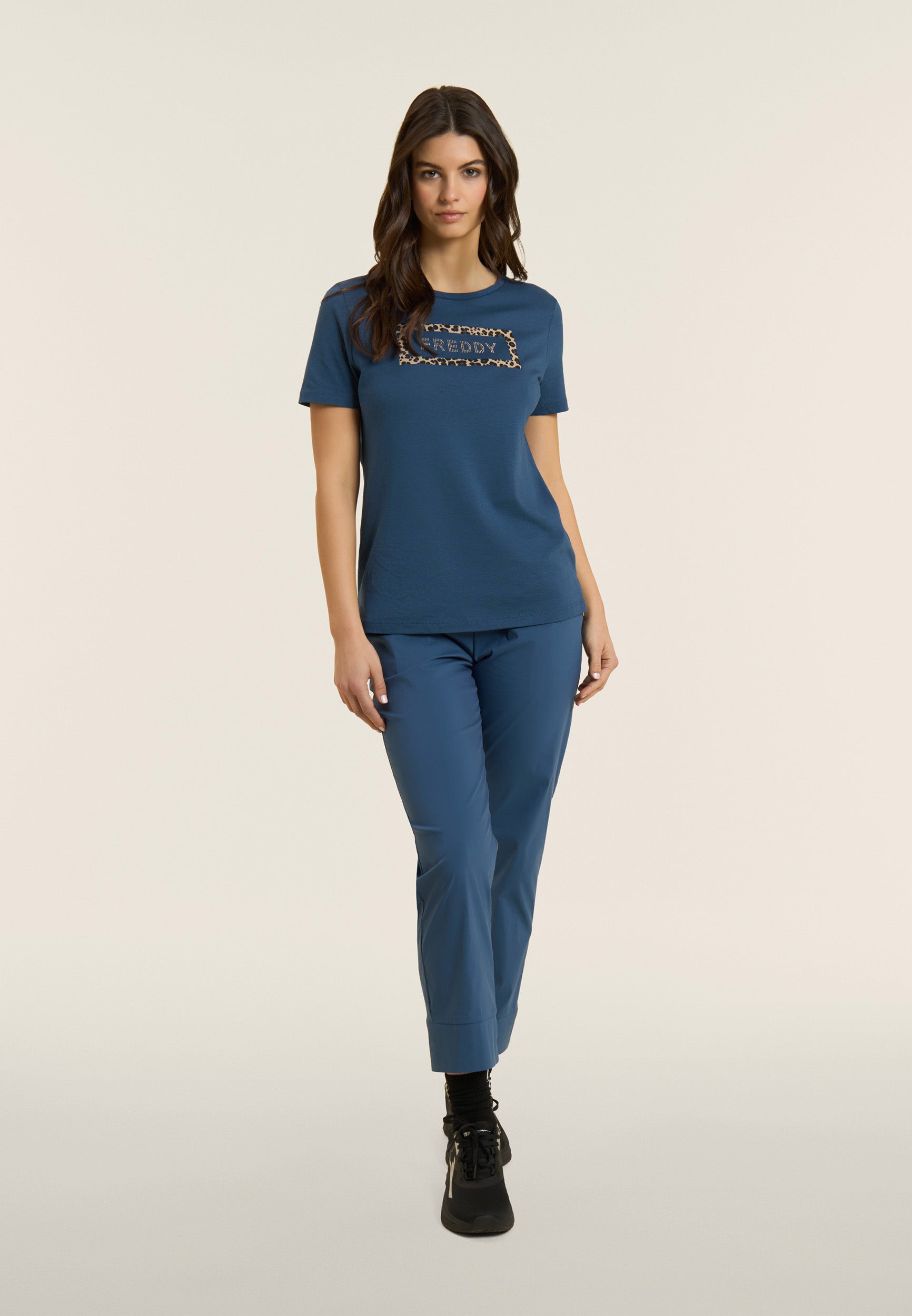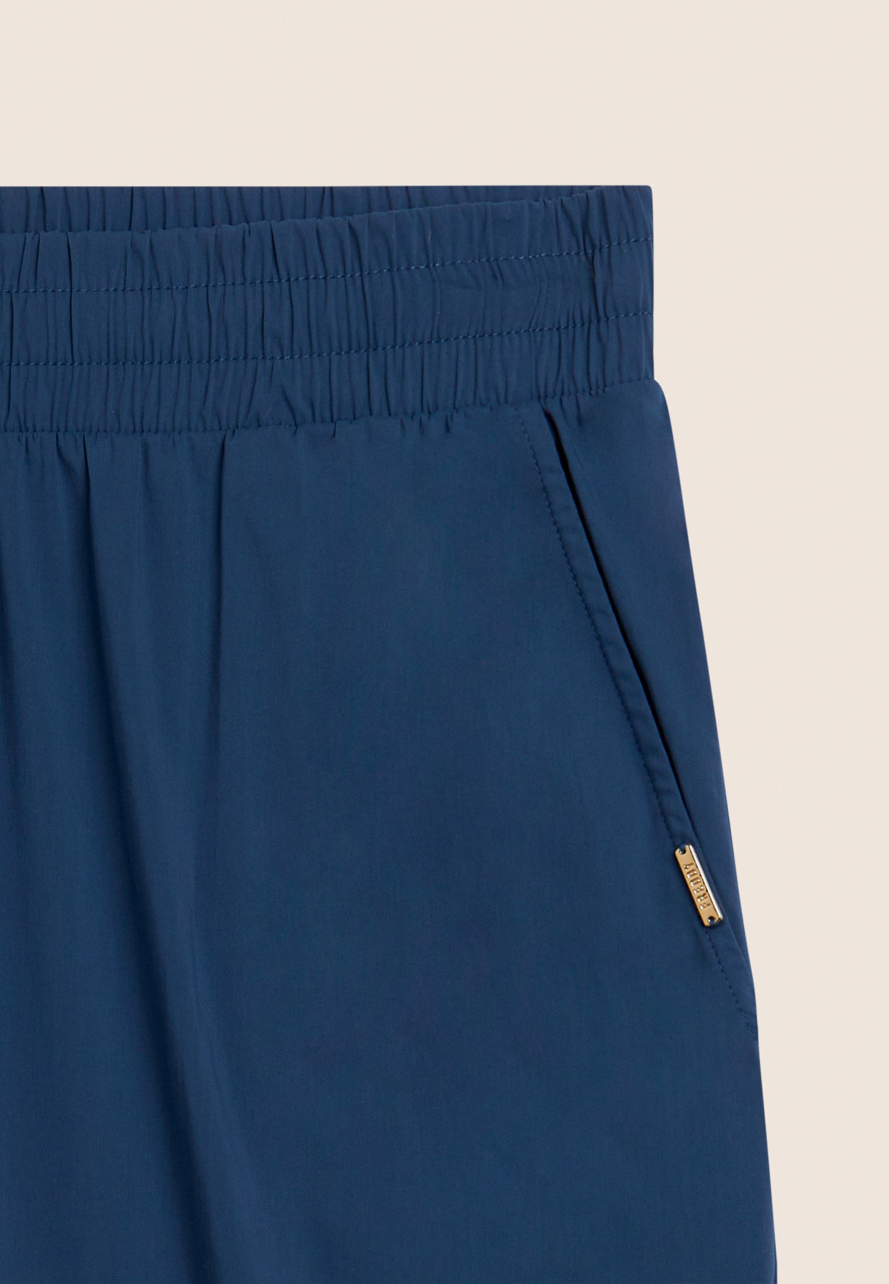 Regular-fit cropped trousers with carrot fit, regular waist with inner elastic for a gathered effect and drawstring on the inside. The design is enhanced by a golden FREDDY logo tab on the left pocket opening. The slant besom pockets offer practicality, and the stretch poplin fabric guarantees lightness, softness and a comfortable, flexible fit, ideal for the warm season.