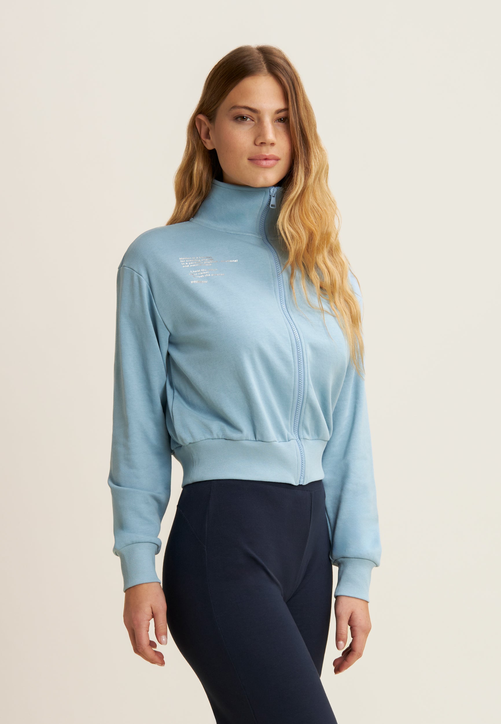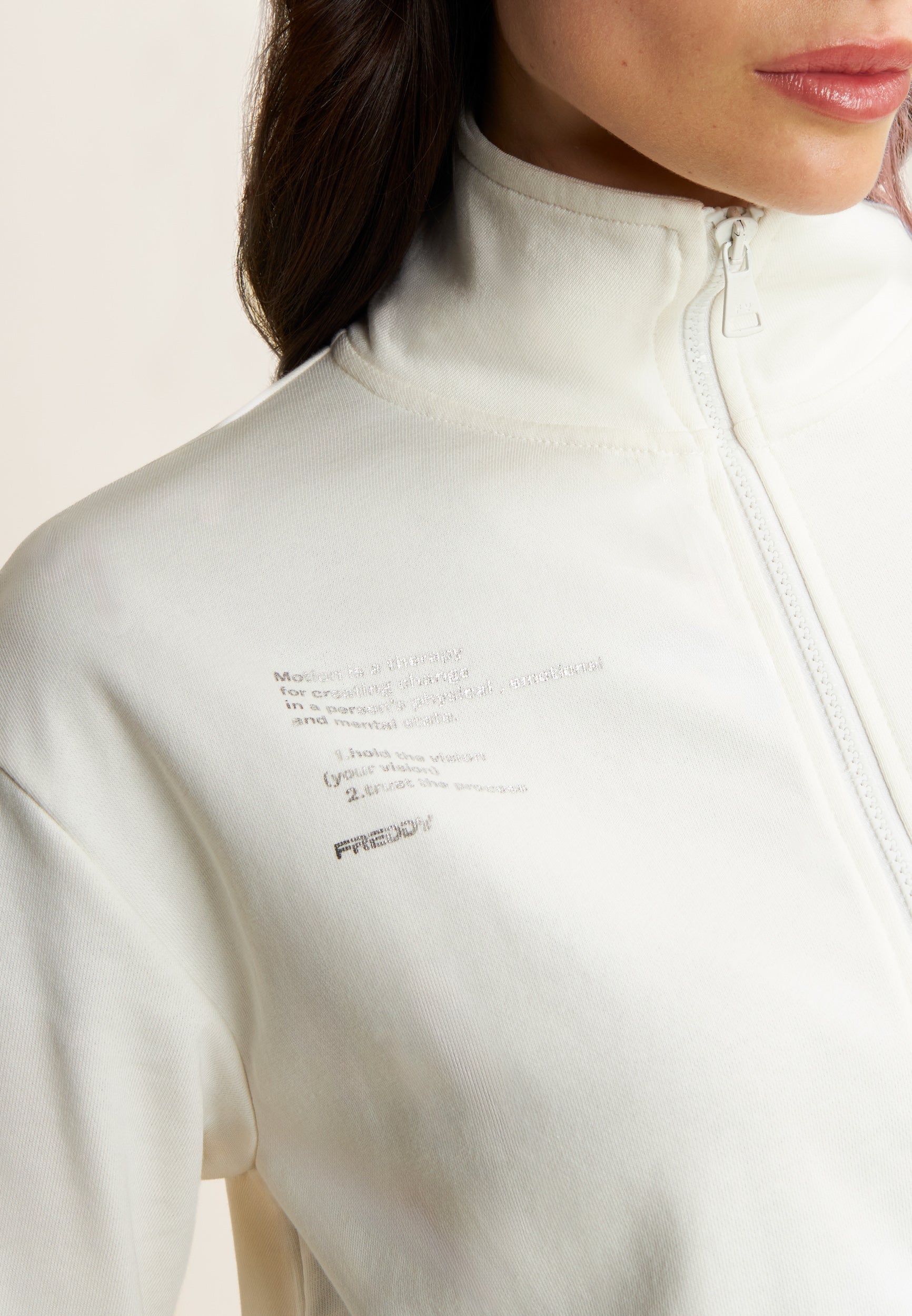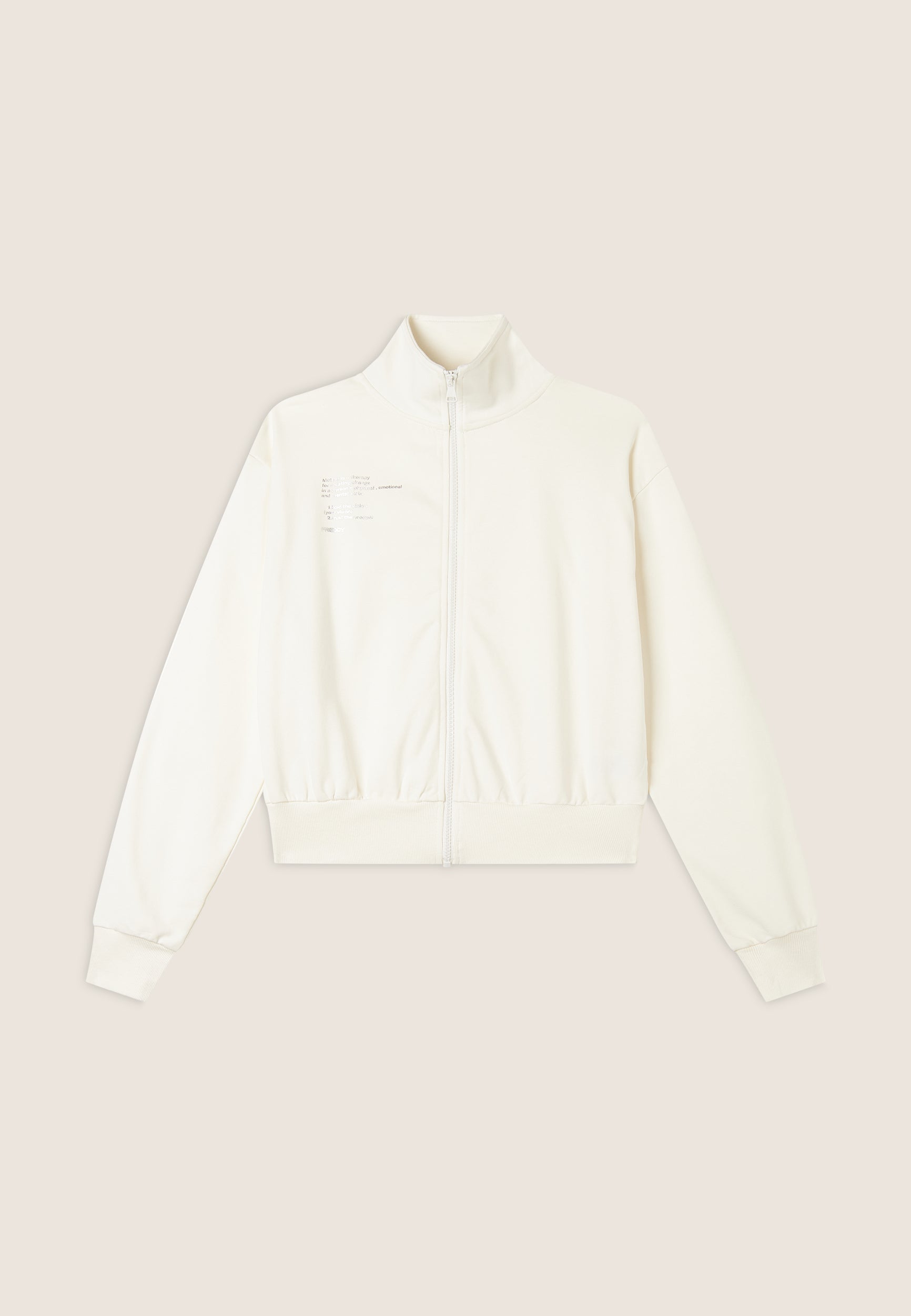 Regular fit sweatshirt in French terry with a contemporary design, cropped length and a high, narrow hem band to give movement to the fabric. The high neck and zip fastening provide a sophisticated look, while the long sleeves with cuffs and the printed graphic on the left side add unique details.