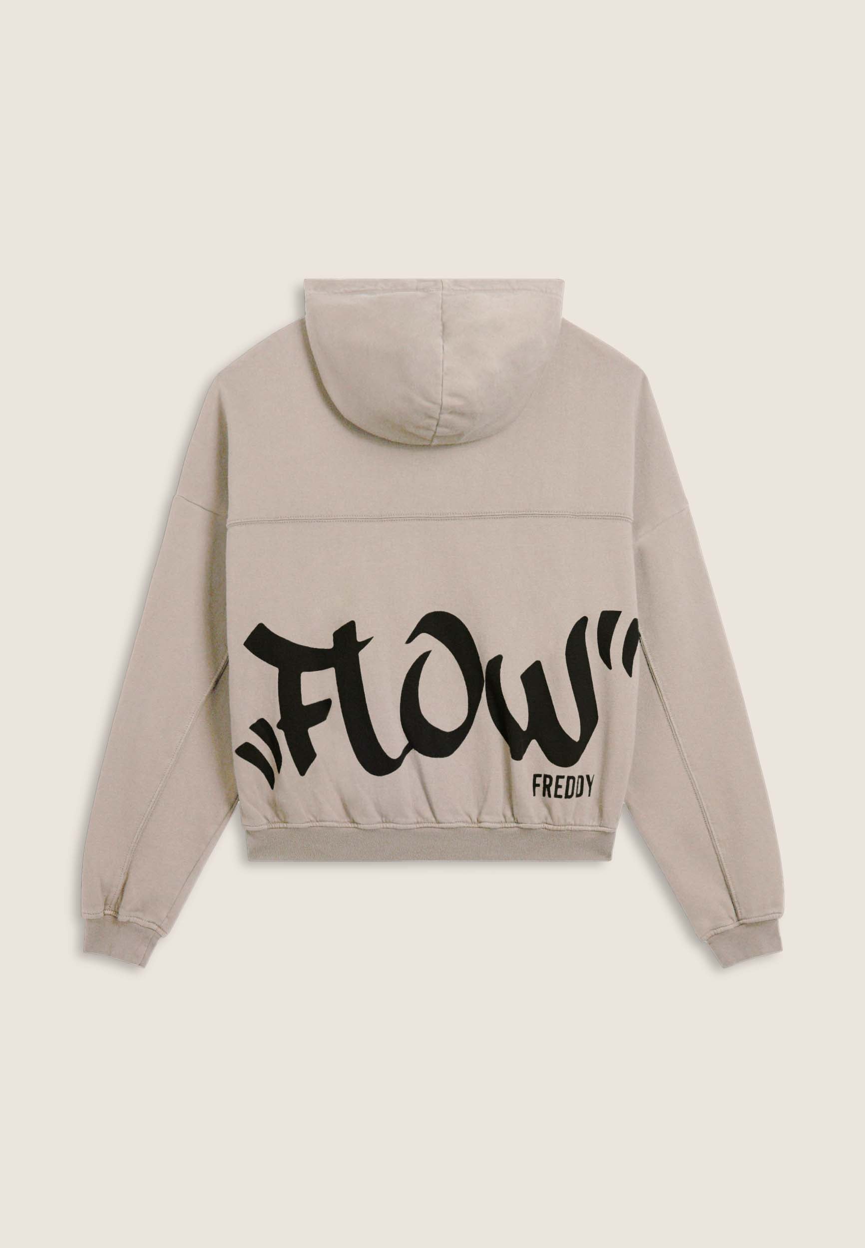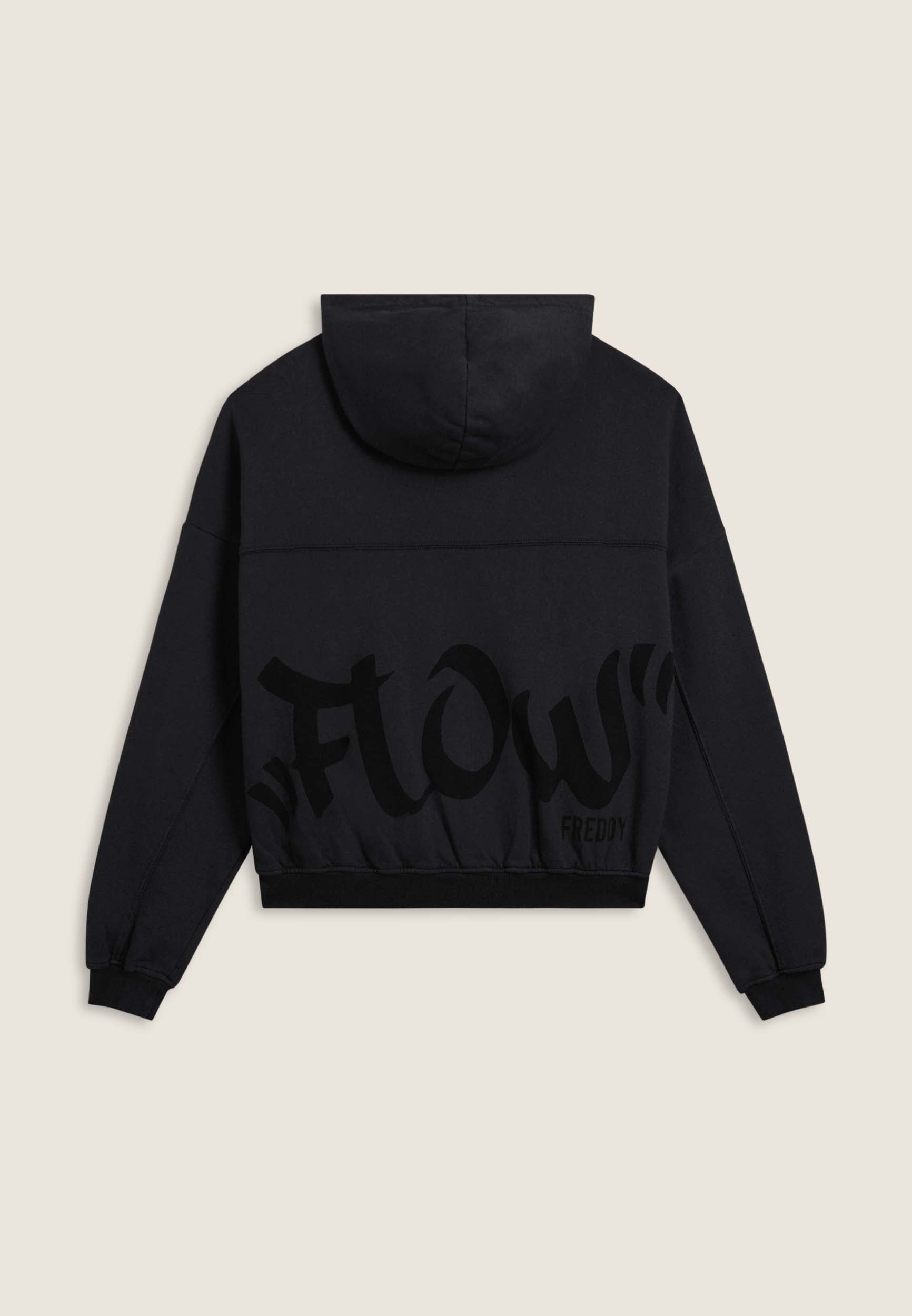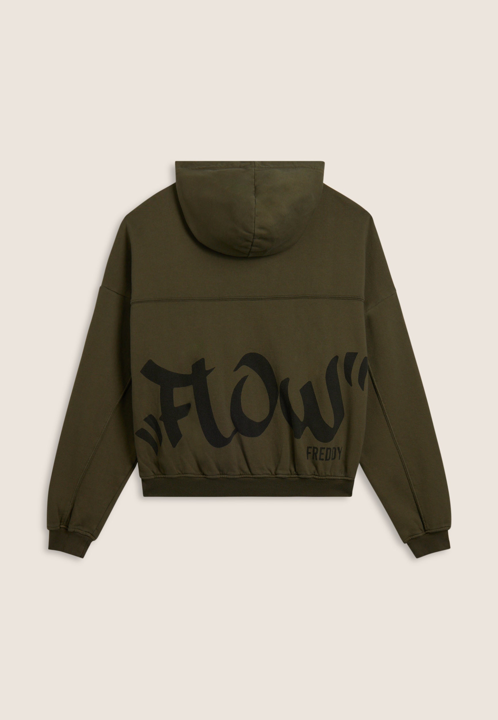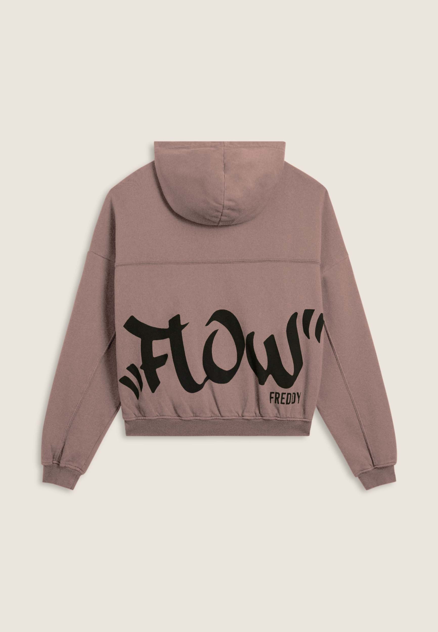 Comfortable, warm and super street: this oversized cropped full-zip sweatshirt mixes urban style with cool details. The large "Flow" print on the back and FREDDY logo on the left shoulder create a look that stands out. The brushed fleece, dyed with enzymes, provides bright colours and crazy comfort. Lined hood, besom pockets and oversized fit for relaxed everyday wear.