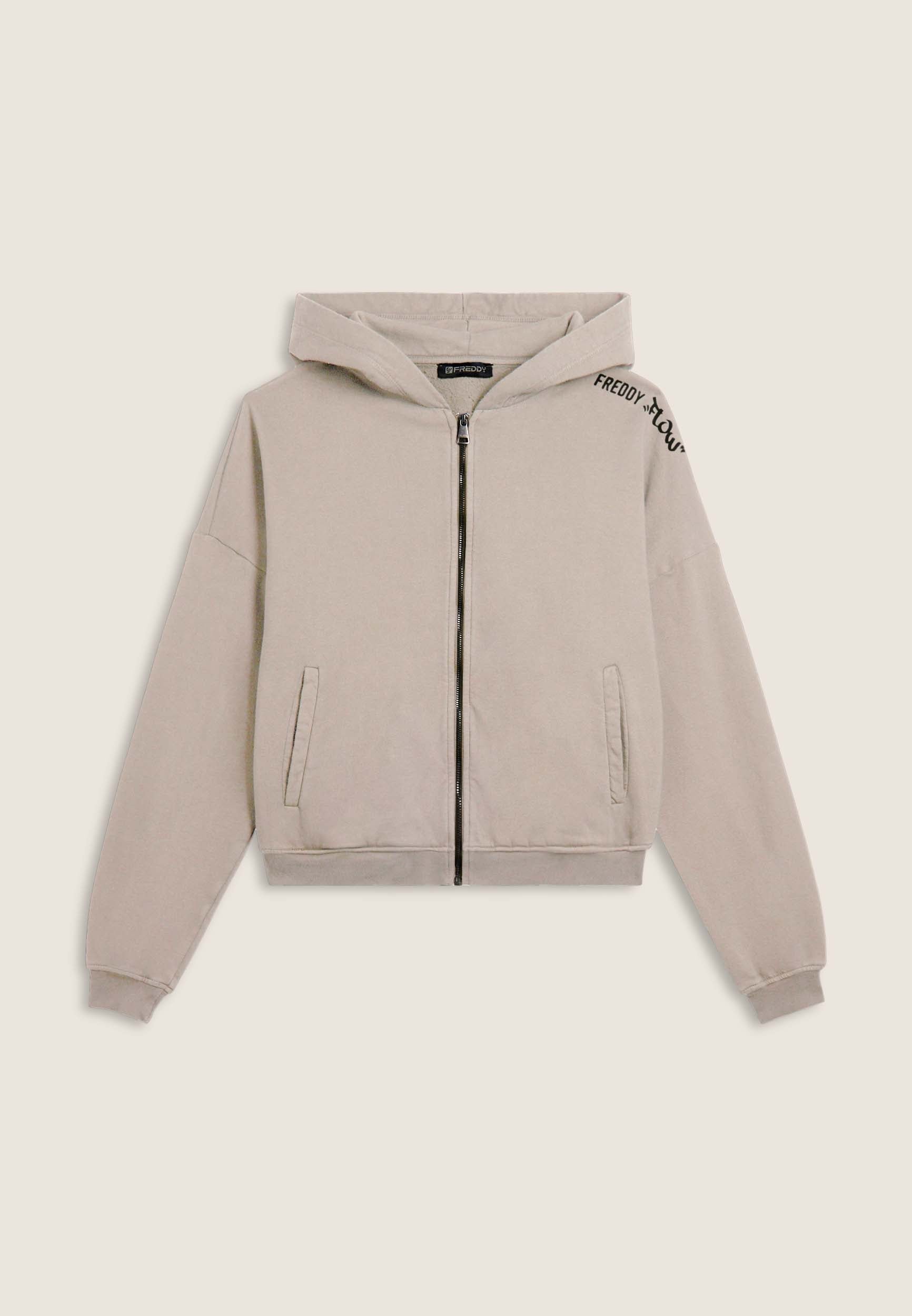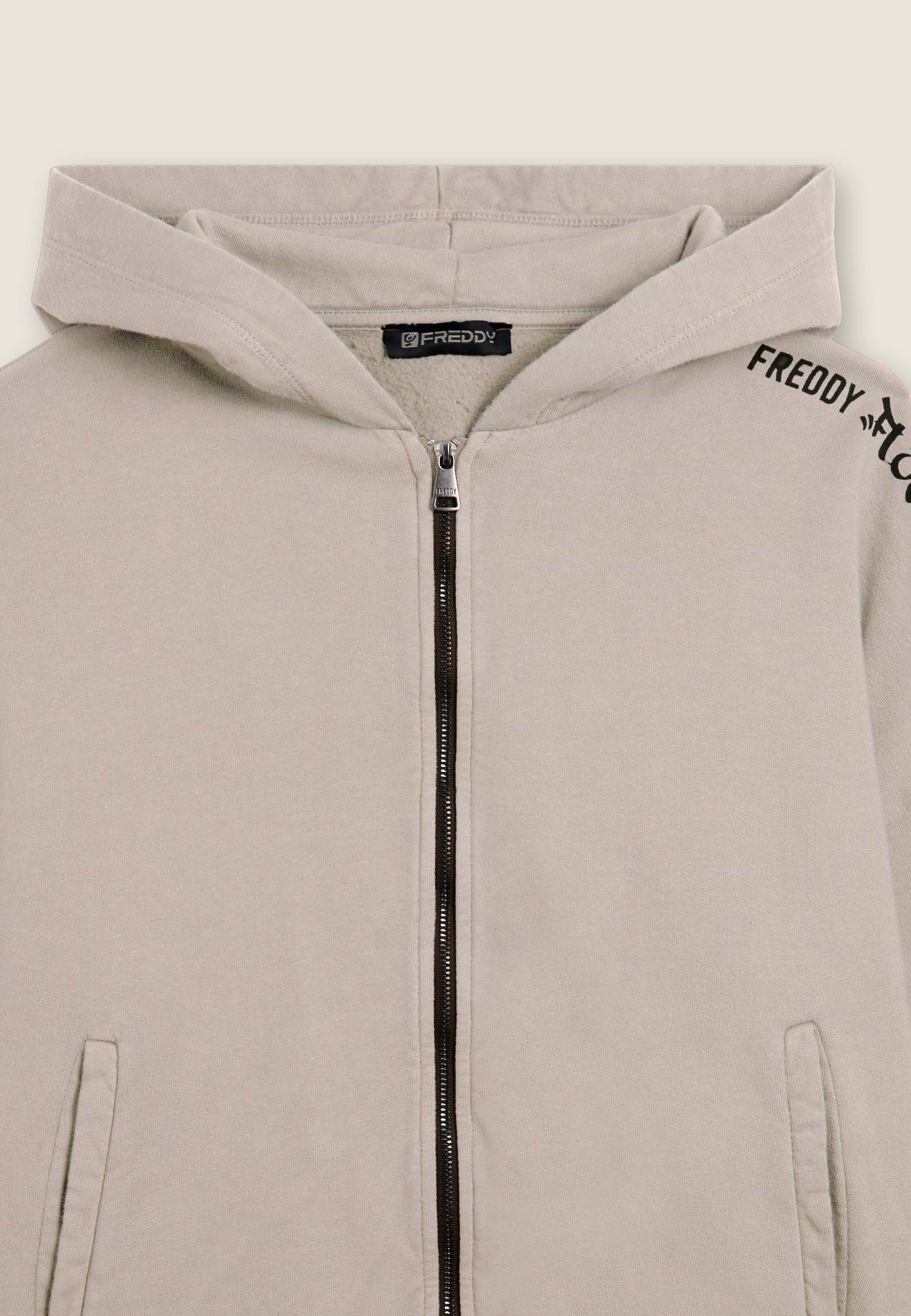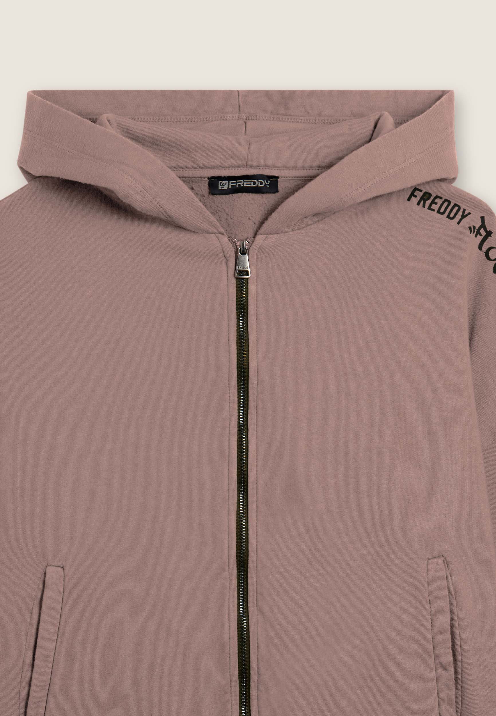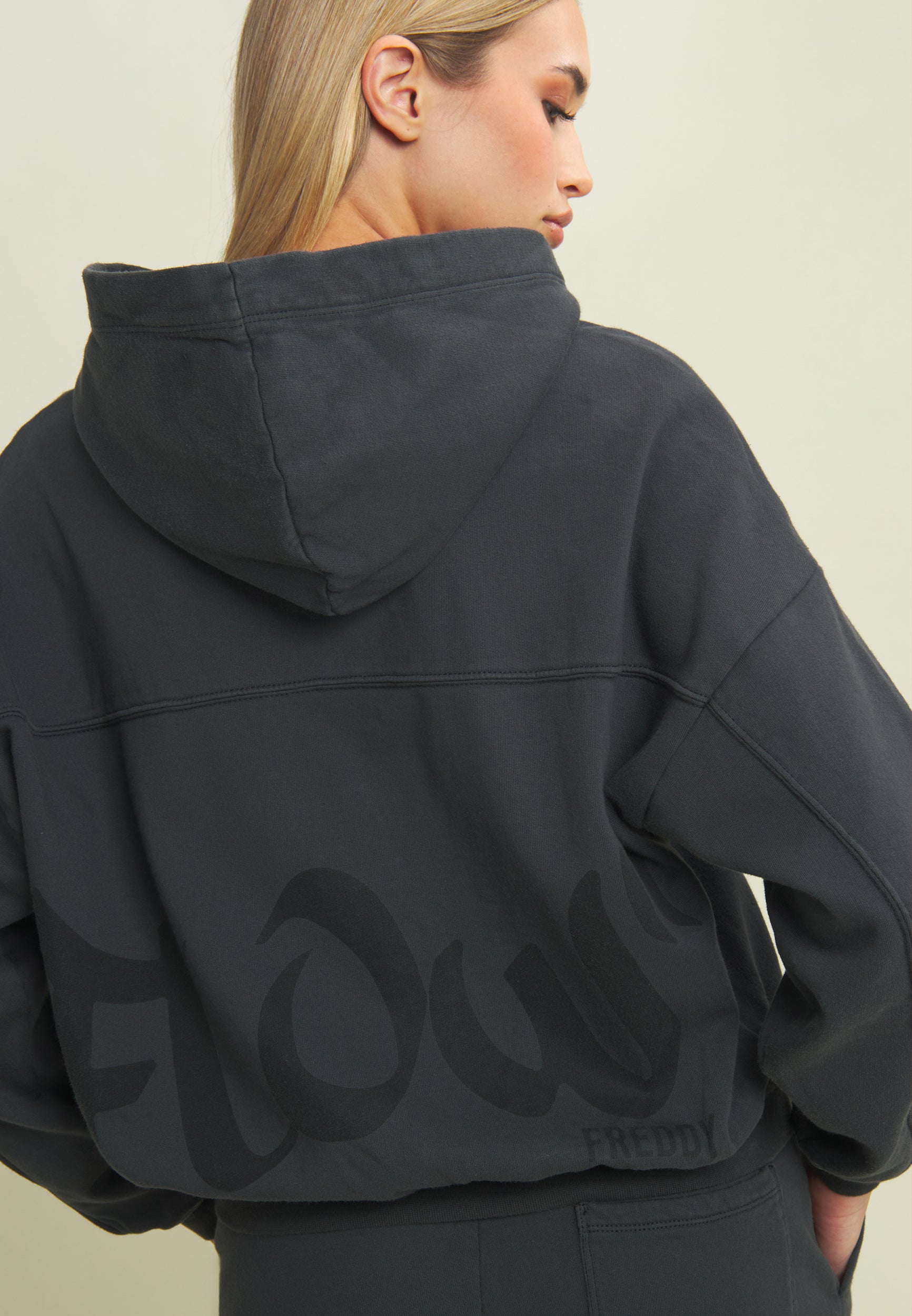 Comfortable, warm and super street: this oversized cropped full-zip sweatshirt mixes urban style with cool details. The large "Flow" print on the back and FREDDY logo on the left shoulder create a look that stands out. The brushed fleece, dyed with enzymes, provides bright colours and crazy comfort. Lined hood, besom pockets and oversized fit for relaxed everyday wear.